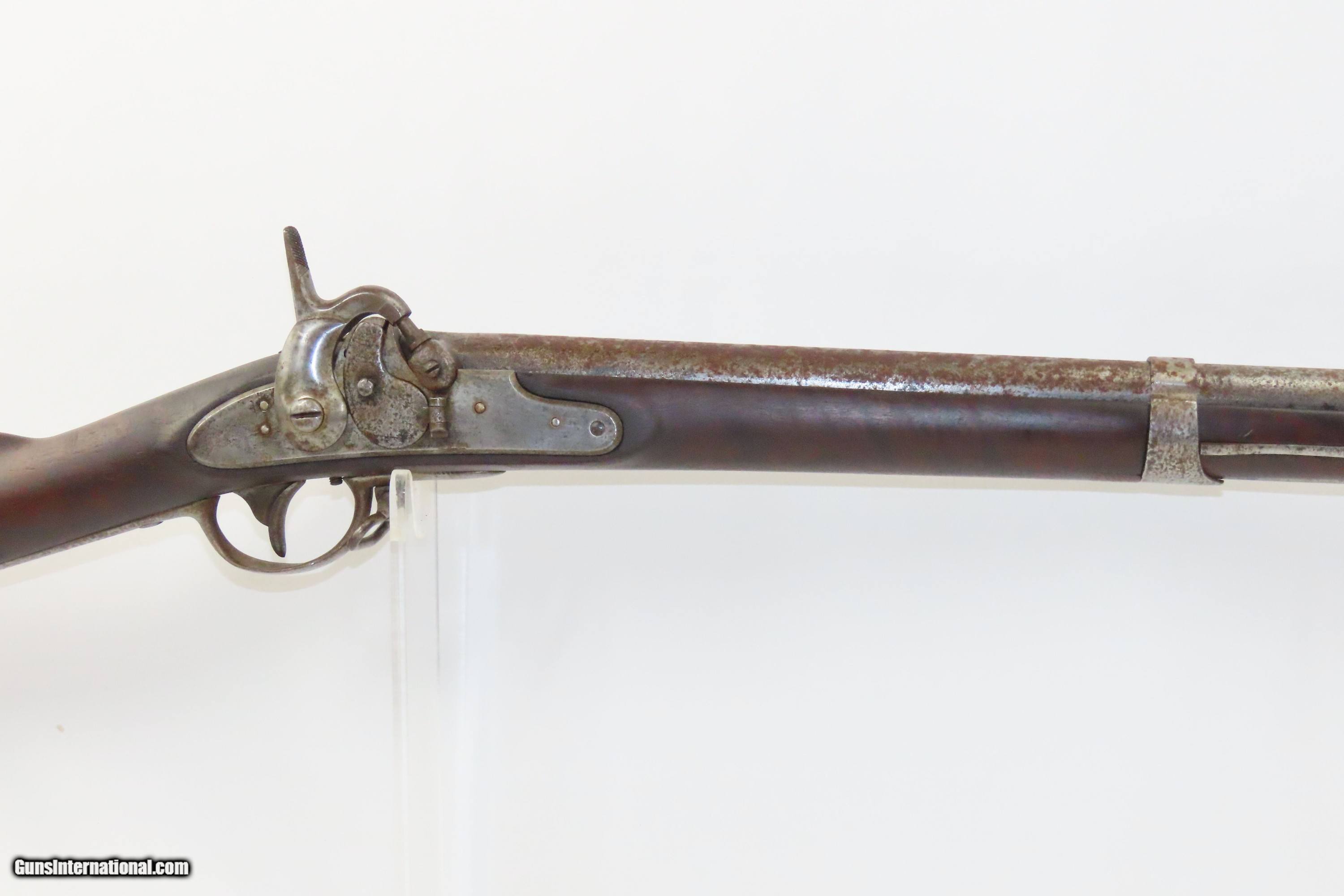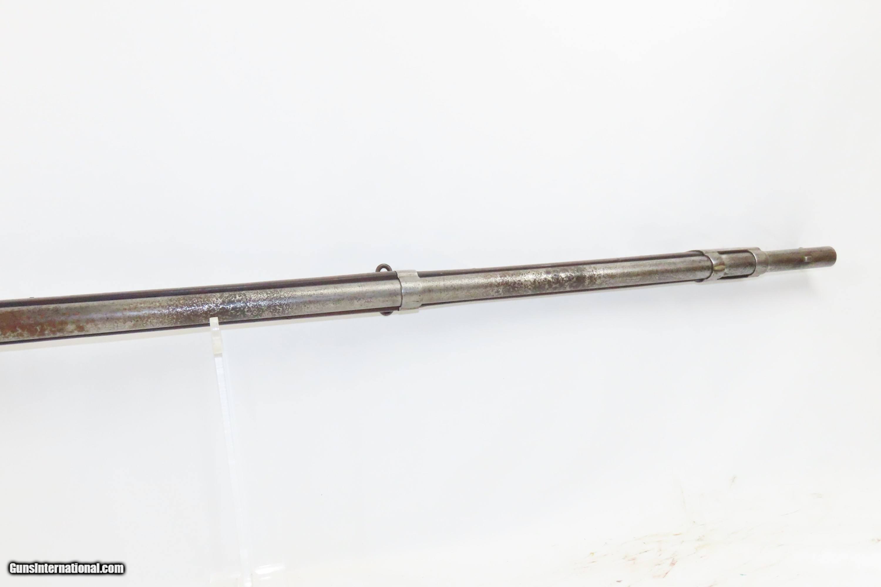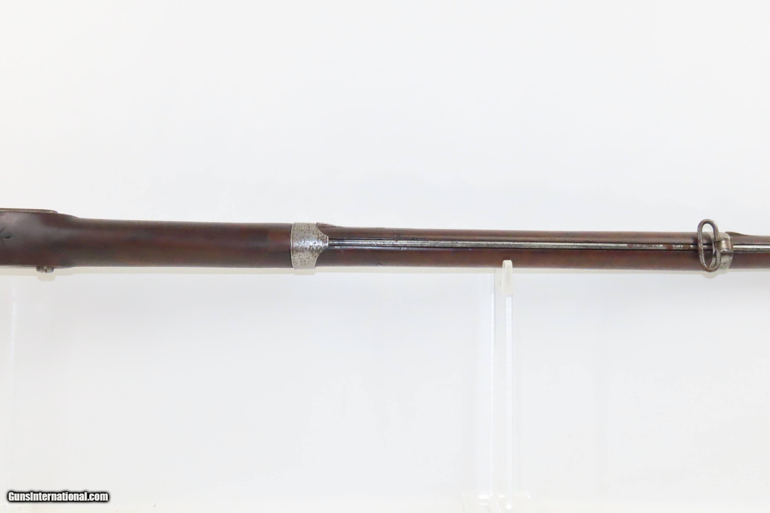 Description: CITY OF PHILADELPHIA MILITIA MUSKET Model 1816 MUSKET Antique Philadelphia Militia; Converted by Andrew Wurfflein Here we present an antique Remington-Frankford Arsenal Maynard Conversion of a U.S. Model 1816 Musket. This example is marked “CITY OF PHILADA” and “A. WURFFLEIN” on the breech, indicating that Andrew Wurfflein of Philadelphia did the Bolster Conversion. He did these circa 1852. His conversion involved cutting out the old breech and vent and joining a new breech with a large nipple bolster. The lock was replaced with one including the Maynard tape primer. Instead of the small fulminate filled metal caps, Maynard Tape was a roll of paper that was impregnated in spots with fulminate. The primary advantage was that the soldier did not have to fumble with tiny caps, because a small wheel inside the lock dispensed primers from the paper roll. This was the system adopted for the Model 1855, and it made sense to update still serviceable flintlocks using this method. However, only about 20,000 of these conversions were done, and the U.S. government eventually chose to go with the cap system when they produced the Model 1861 and 1863 for service during the American Civil War. Most of these various conversions undoubtedly saw combat due to weapons shortages on both sides. The overall condition is good. Heavily weathered exterior. The action is excellent. The bore is smooth and dim. The stock is solid and showing use. Own the original! This is a legitimate antique and not a reproduction. Barrel is 41-1/4 inches. Caliber: .69 Percussion Overall condition as seen in photos. Very Fast. Very Safe. FREE SHIPPING WORLDWIDE. Delivered directly to your door by express mail! Guaranteed AUTHENTIC & Includes CERTIFICATE OF AUTHENTICITY. ancestryguns $1800 #233562 SOLD Antique: Yes |
