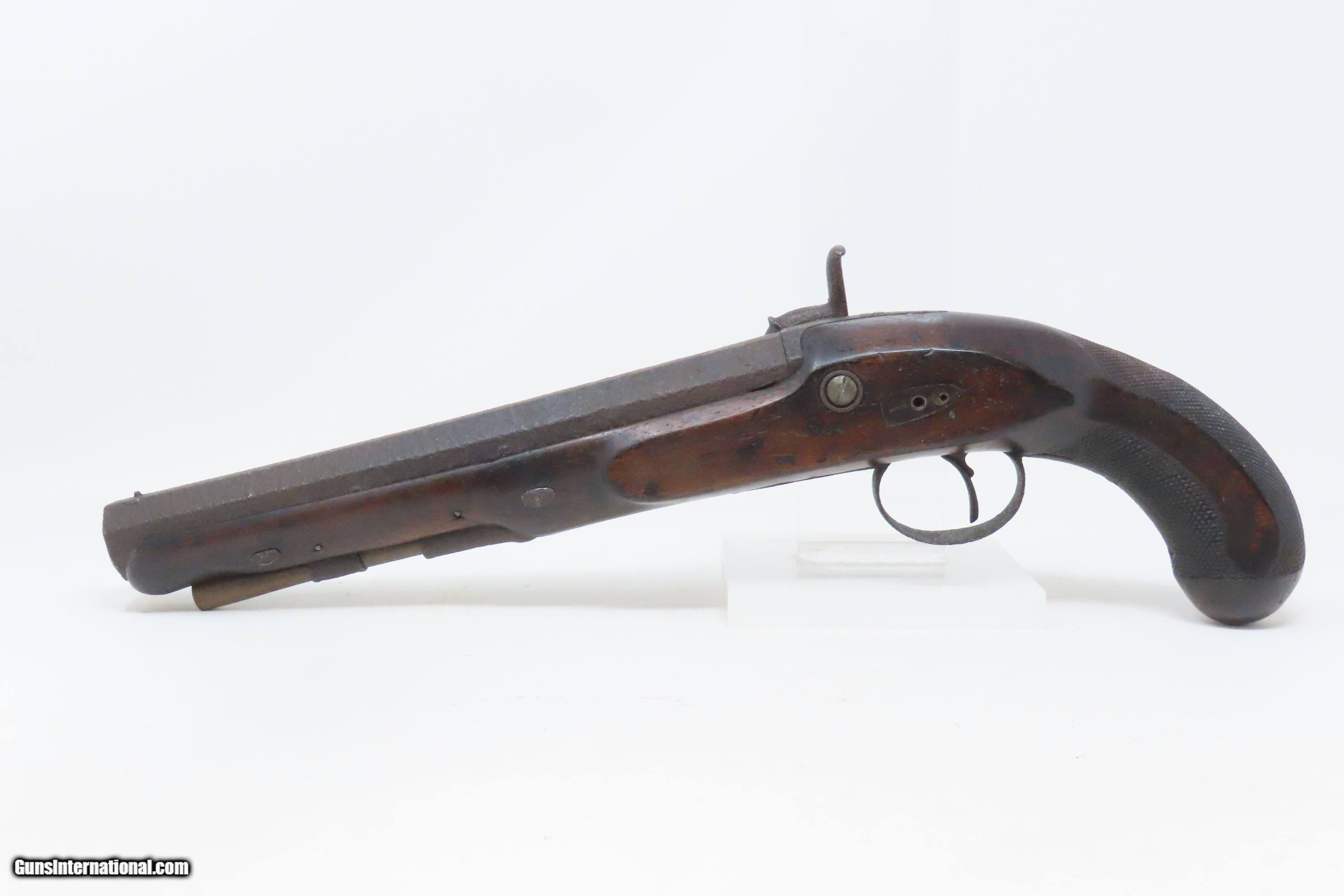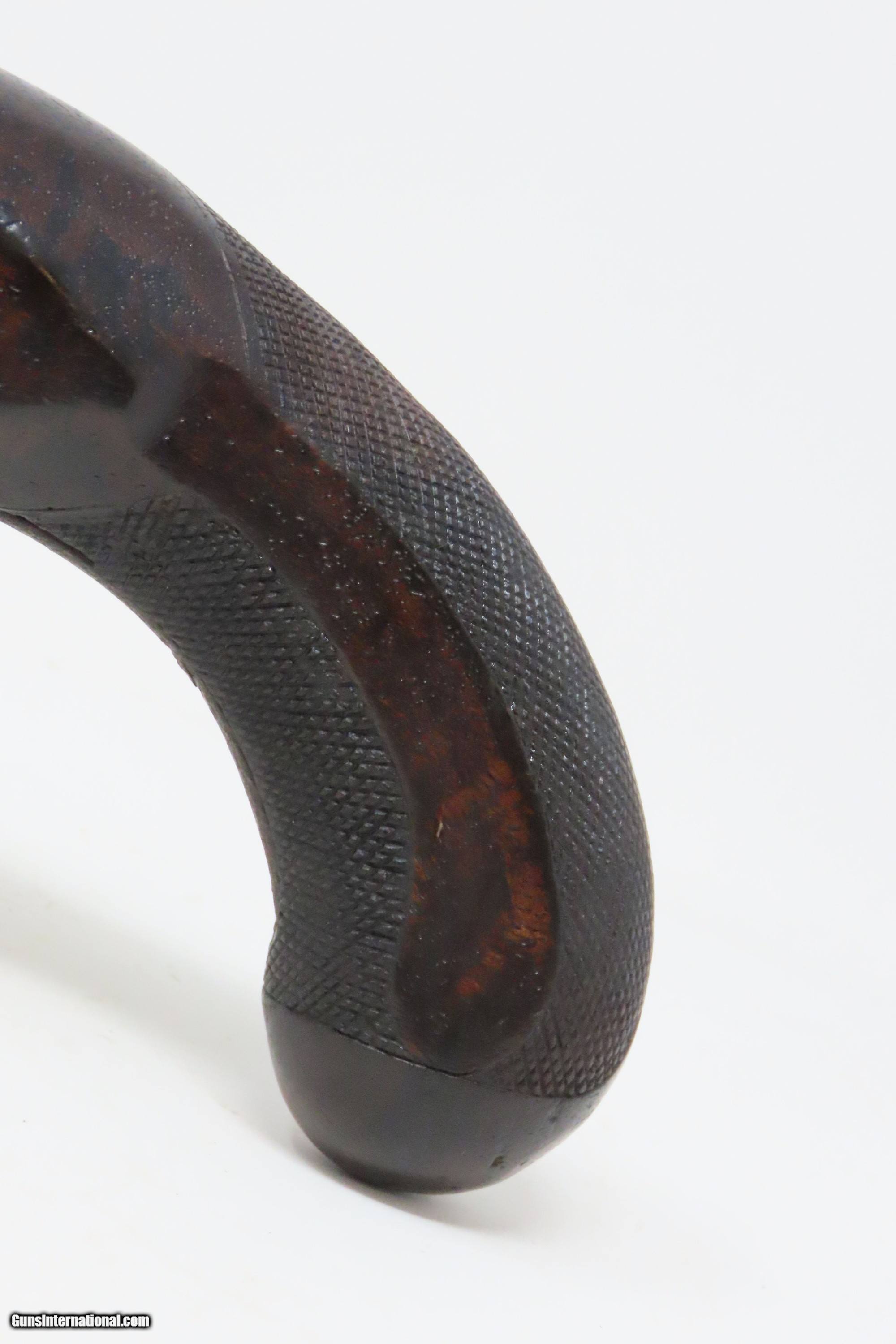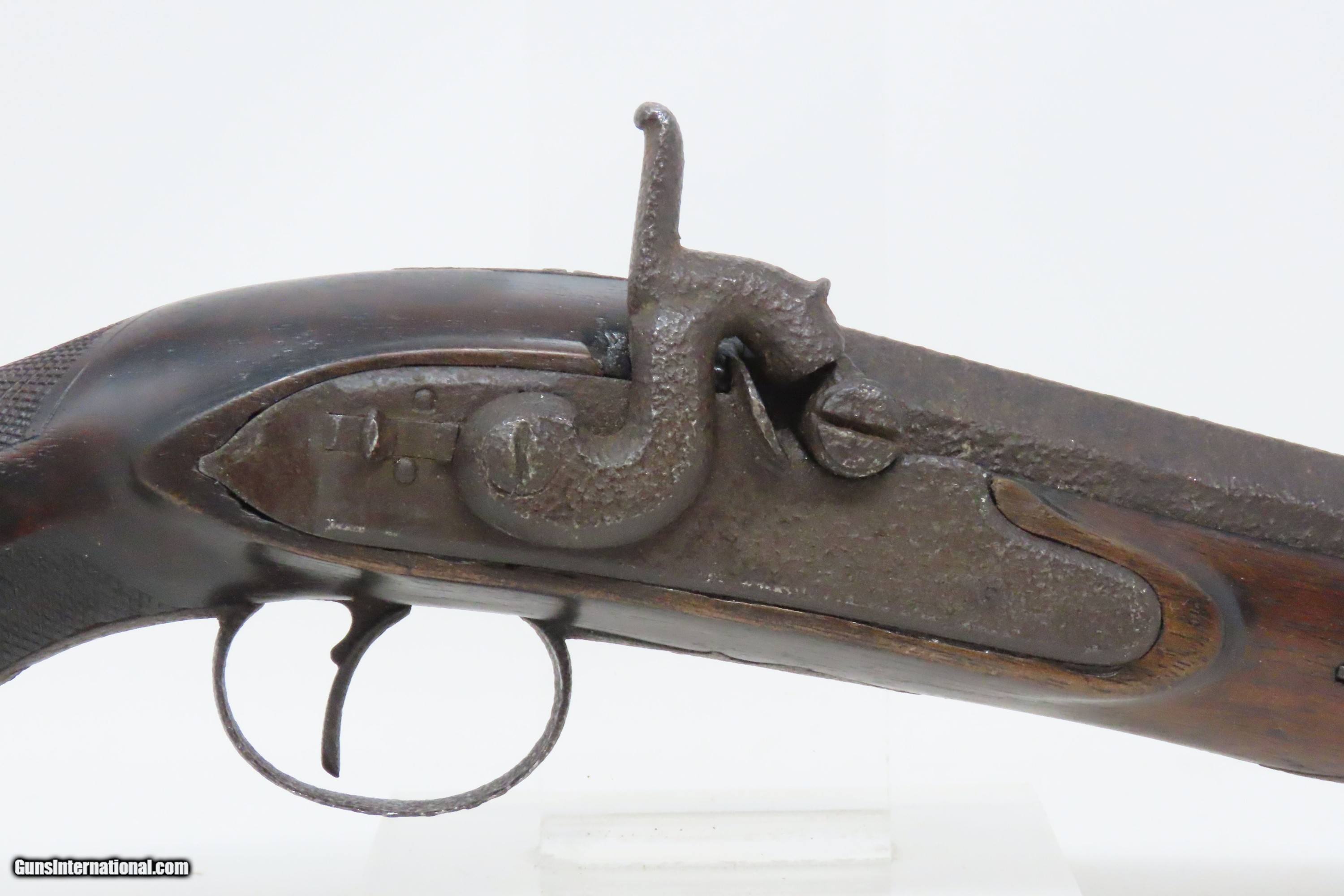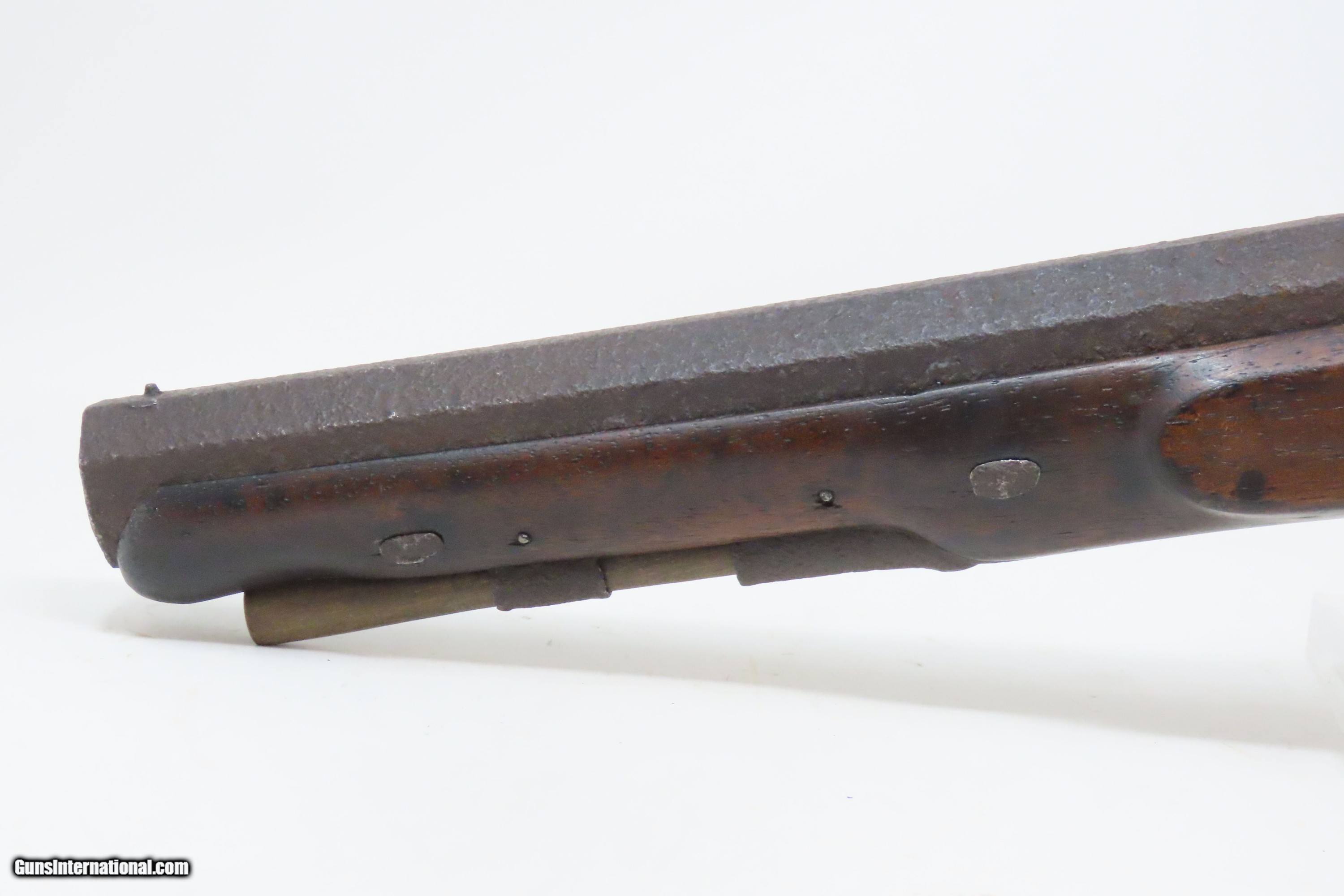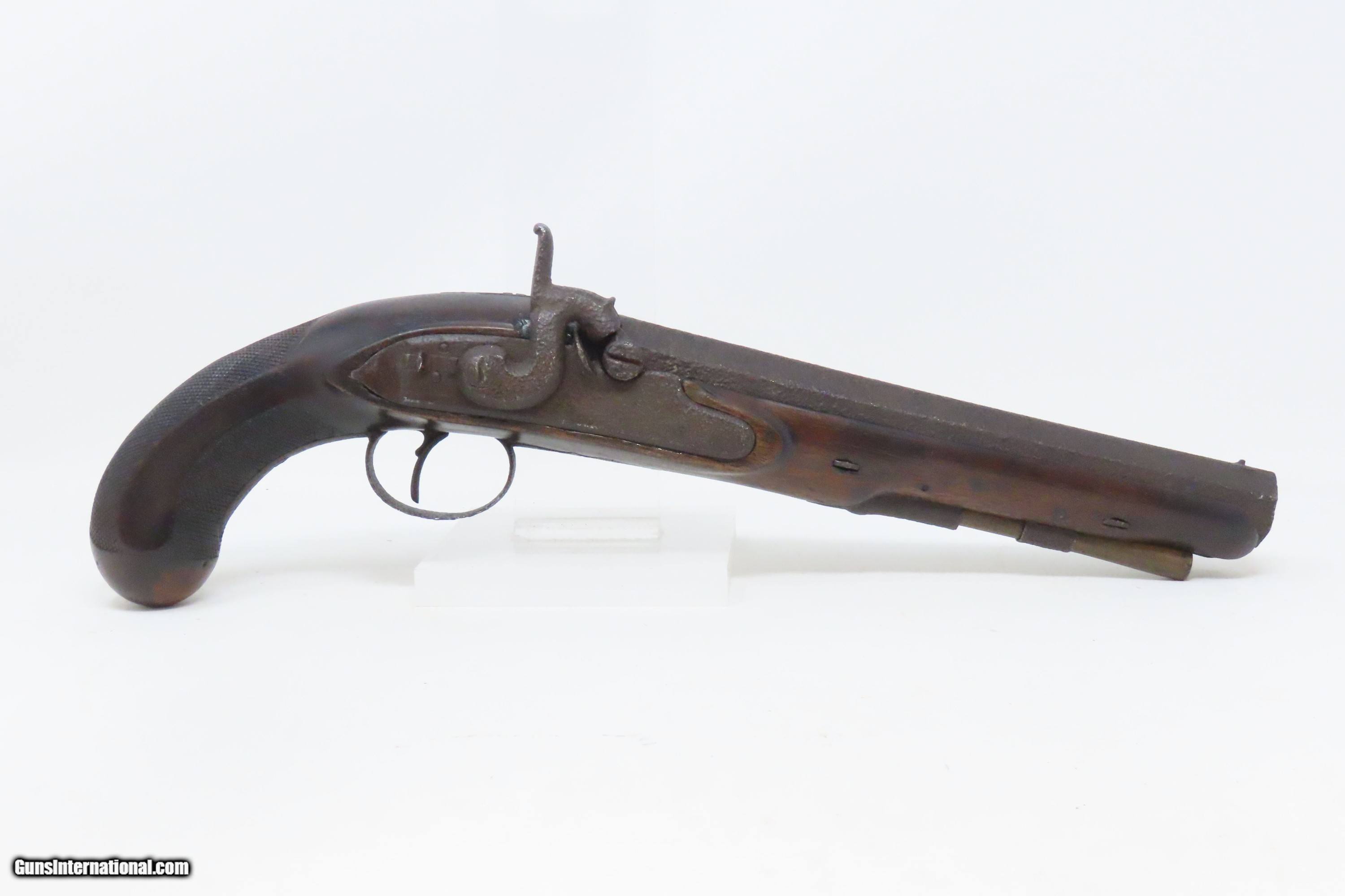 Description: Early 1800s EUROPEAN Antique .79 Percussion Conversion RIFLED “MANSTOPPER” OFFICER’S STYLE Short Range SELF DEFENSE Pistol Here we present an antique European Percussion Conversion Belt/Holster/Coat Pocket Pistol, made circa the early 19th Century likely in mainland Europe. This example would have started out life as a flintlock and converted over when the more reliable percussion firing system was introduced. This large bore flintlock pistol was used primarily as a self-defense weapon. Their effective range was short, and they were frequently used as an adjunct to a sword. Pistols in this era were usually smoothbore, although some rifled pistols were produced. They came in a variety of sizes with the smallest being less than 6 inches and the largest ranging to over 20 inches. The large-sized ones, such as this one, are what would be carried in the busy streets of Paris or London in the pocket of a gentleman’s coat or tucked into his belt during the tumultuous times of the mid-1700s to the early 1800’s in Western Europe. This also could have been privately purchased by a military officer to be carried into battle. This one features a “Manstopping” .79 caliber bore. The overall condition is good. Robust action. The bore is in good shape with rifling. Nicely checkered grip. Soid stock. A screw is missing from the side plate. Own the original! This is a legitimate antique and not a reproduction. Barrel is 9 inches. Caliber: .79 Percussion Overall condition as seen in photos. Very Fast. Very Safe. FREE SHIPPING WORLDWIDE. Delivered directly to your door by express mail! Guaranteed AUTHENTIC & Includes CERTIFICATE OF AUTHENTICITY. ancestryguns $1200 #230954 SOLD Antique: Yes |