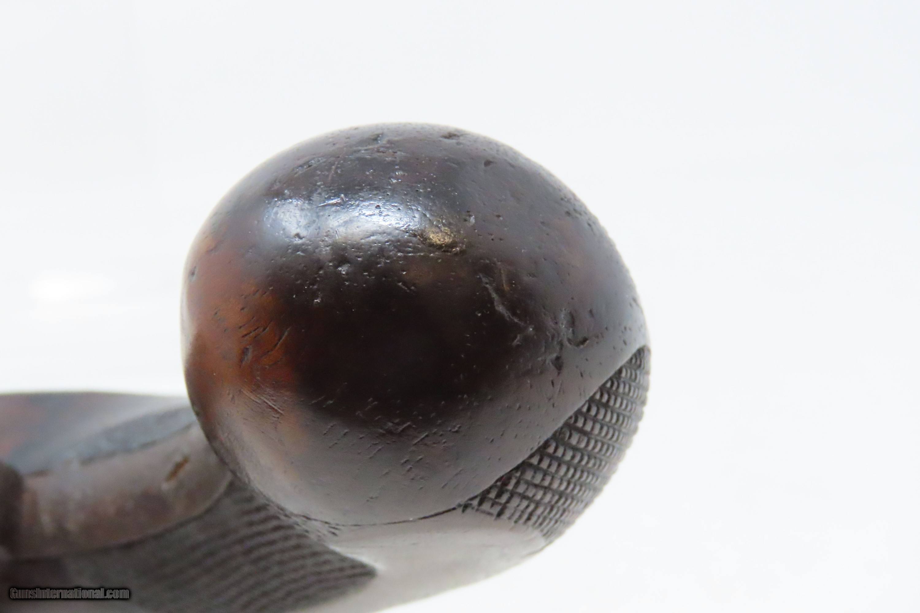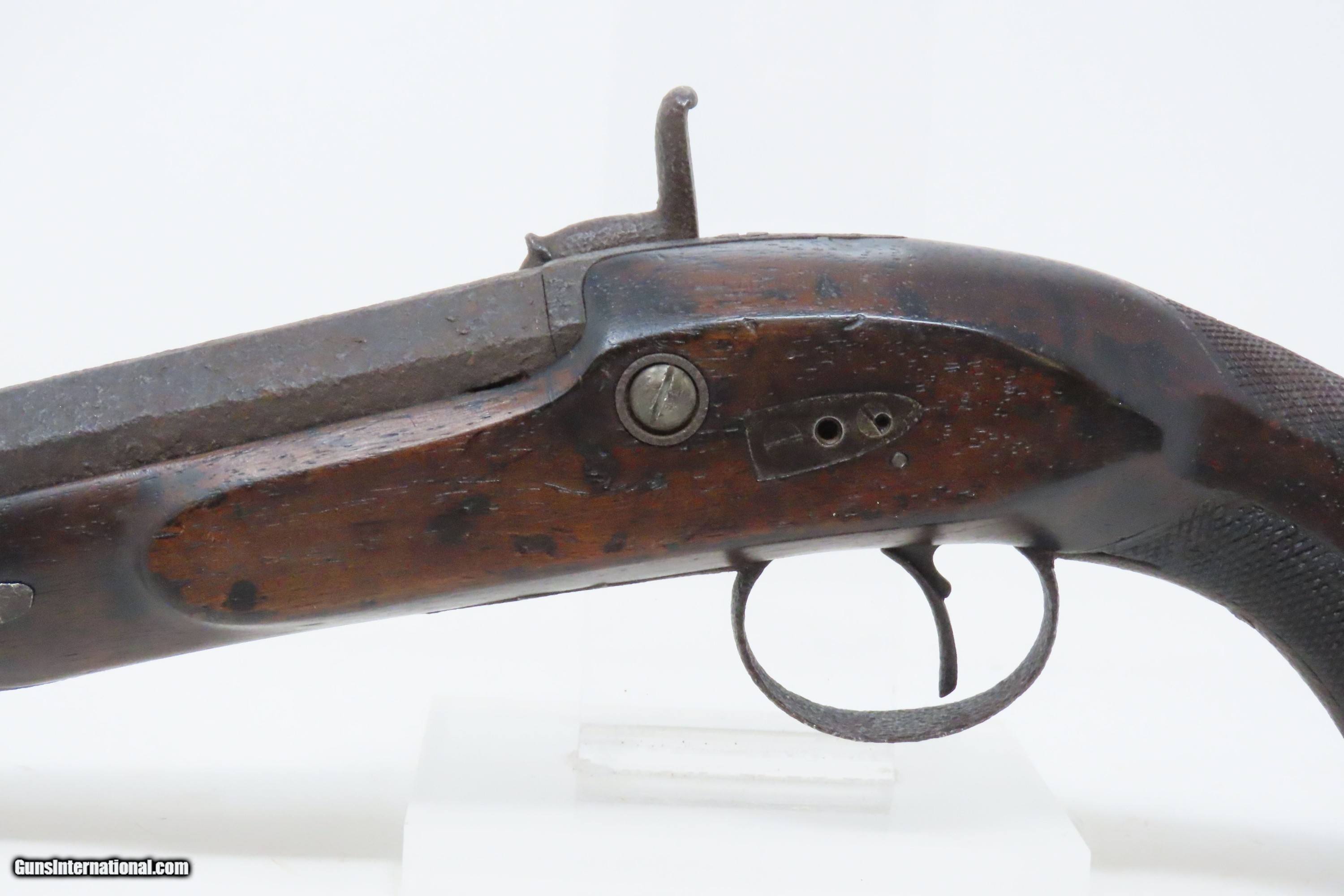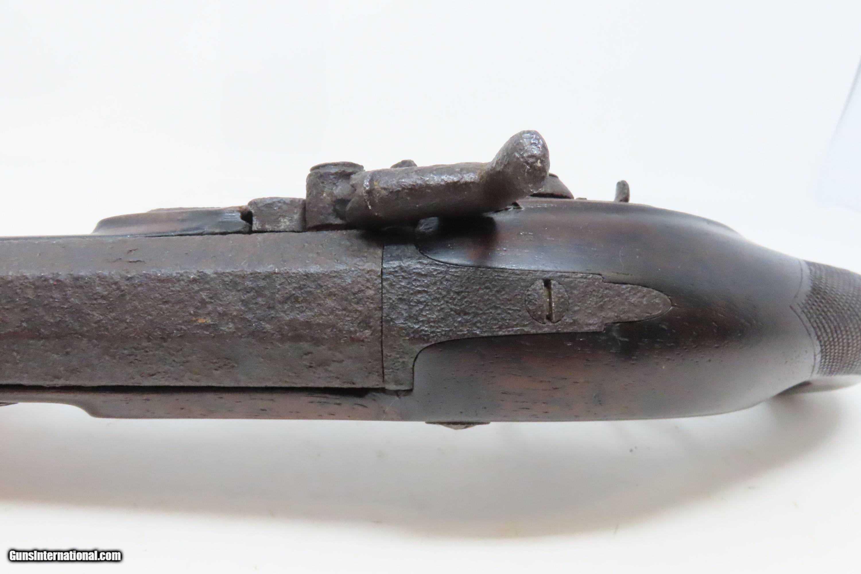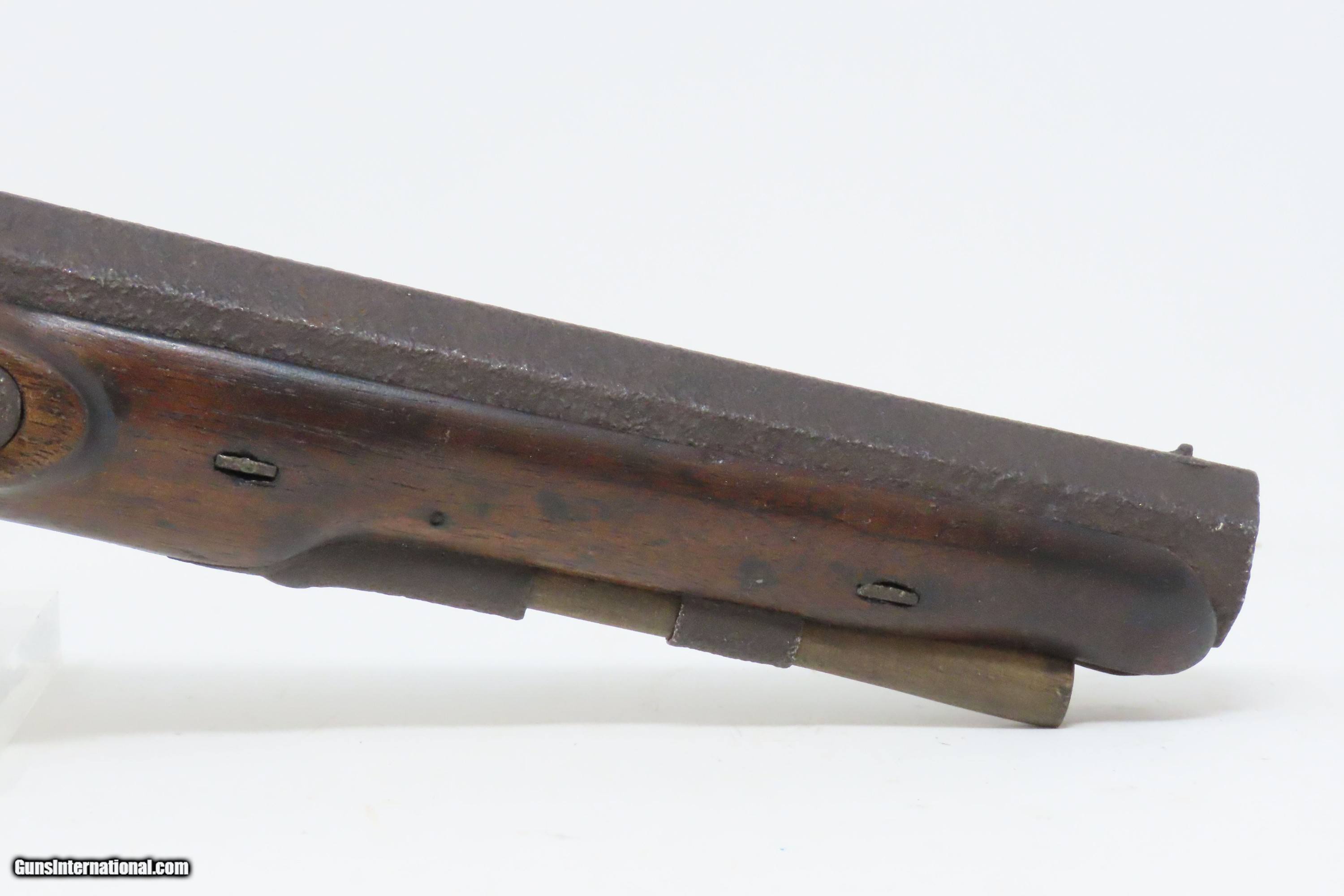 Description: Early 1800s EUROPEAN Antique .79 Percussion Conversion RIFLED “MANSTOPPER” OFFICER’S STYLE Short Range SELF DEFENSE Pistol Here we present an antique European Percussion Conversion Belt/Holster/Coat Pocket Pistol, made circa the early 19th Century likely in mainland Europe. This example would have started out life as a flintlock and converted over when the more reliable percussion firing system was introduced. This large bore flintlock pistol was used primarily as a self-defense weapon. Their effective range was short, and they were frequently used as an adjunct to a sword. Pistols in this era were usually smoothbore, although some rifled pistols were produced. They came in a variety of sizes with the smallest being less than 6 inches and the largest ranging to over 20 inches. The large-sized ones, such as this one, are what would be carried in the busy streets of Paris or London in the pocket of a gentleman’s coat or tucked into his belt during the tumultuous times of the mid-1700s to the early 1800’s in Western Europe. This also could have been privately purchased by a military officer to be carried into battle. This one features a “Manstopping” .79 caliber bore. The overall condition is good. Robust action. The bore is in good shape with rifling. Nicely checkered grip. Soid stock. A screw is missing from the side plate. Own the original! This is a legitimate antique and not a reproduction. Barrel is 9 inches. Caliber: .79 Percussion Overall condition as seen in photos. Very Fast. Very Safe. FREE SHIPPING WORLDWIDE. Delivered directly to your door by express mail! Guaranteed AUTHENTIC & Includes CERTIFICATE OF AUTHENTICITY. ancestryguns $1200 #230954 SOLD Antique: Yes |