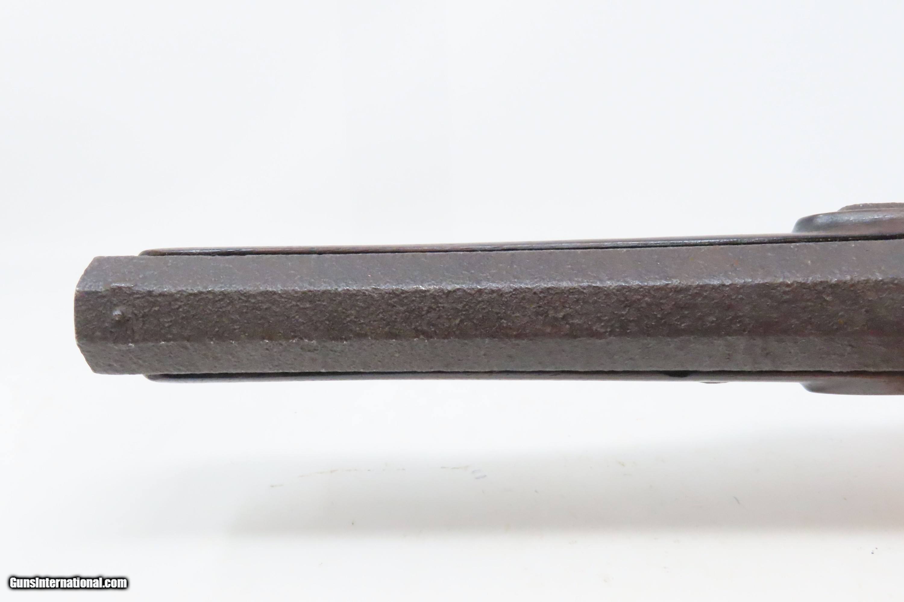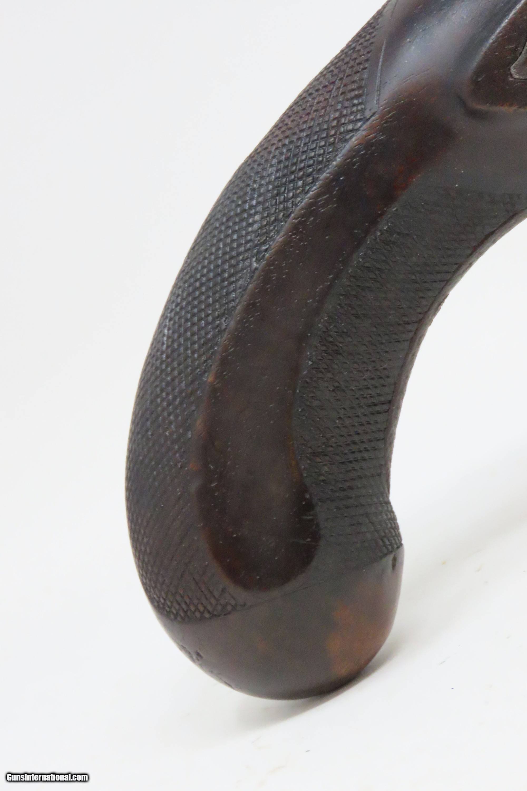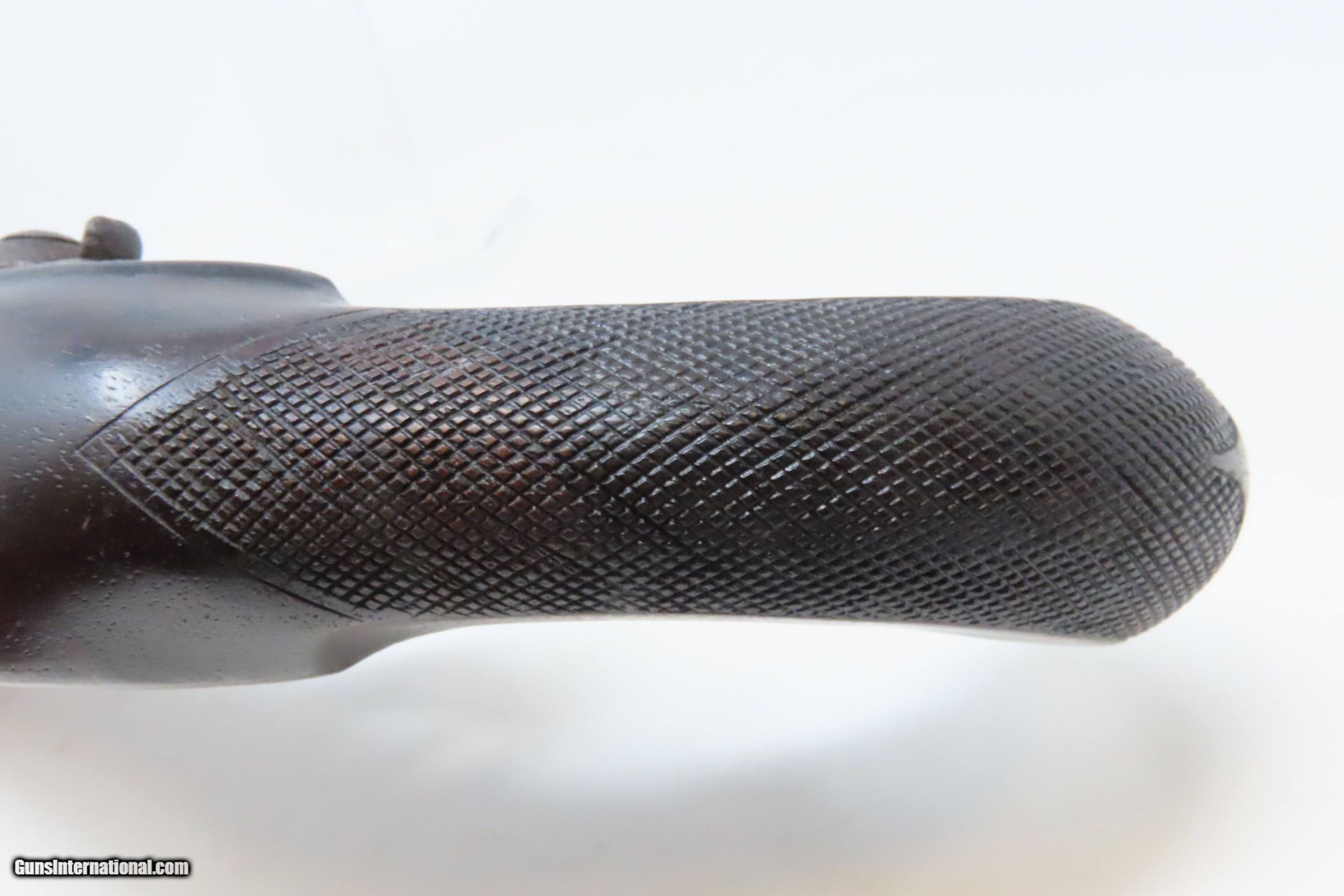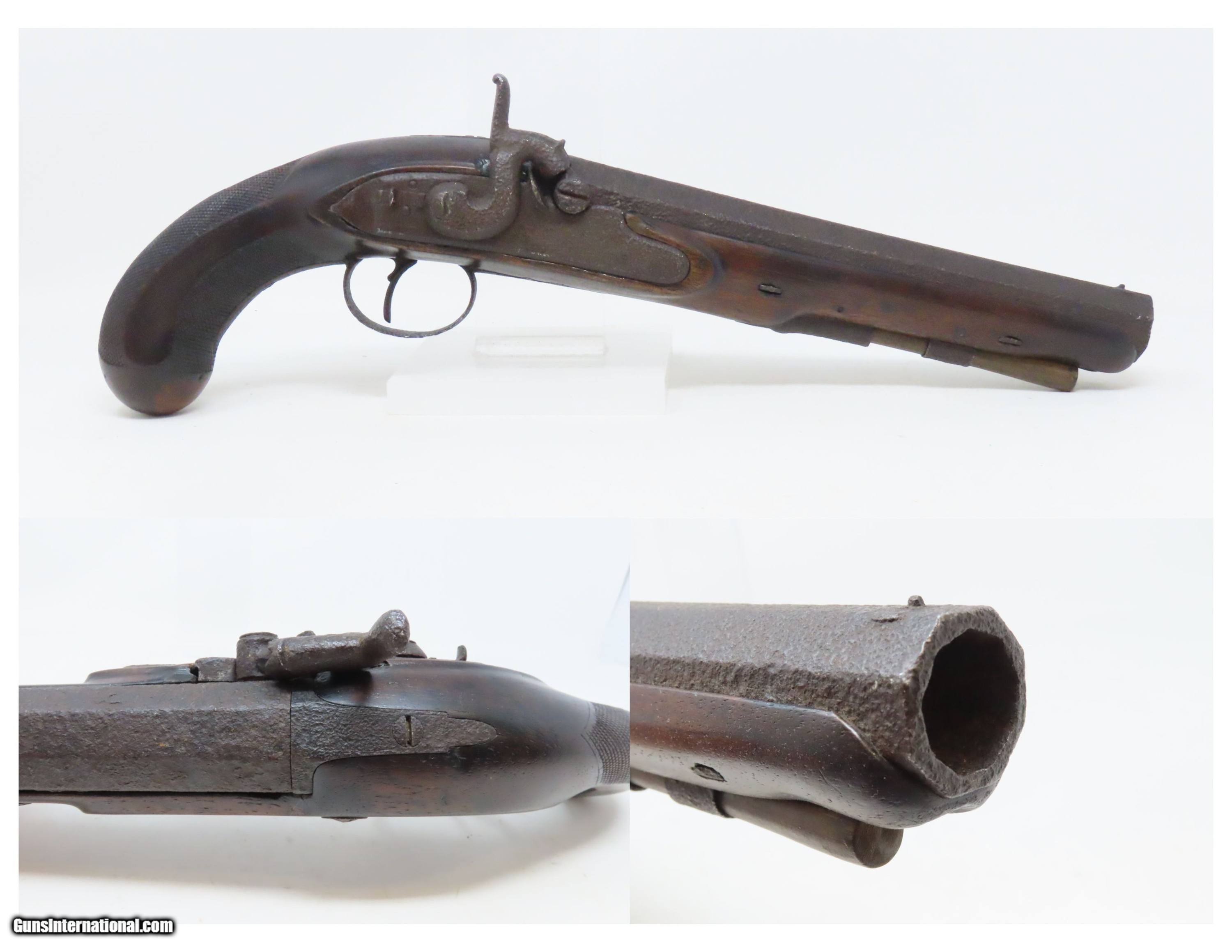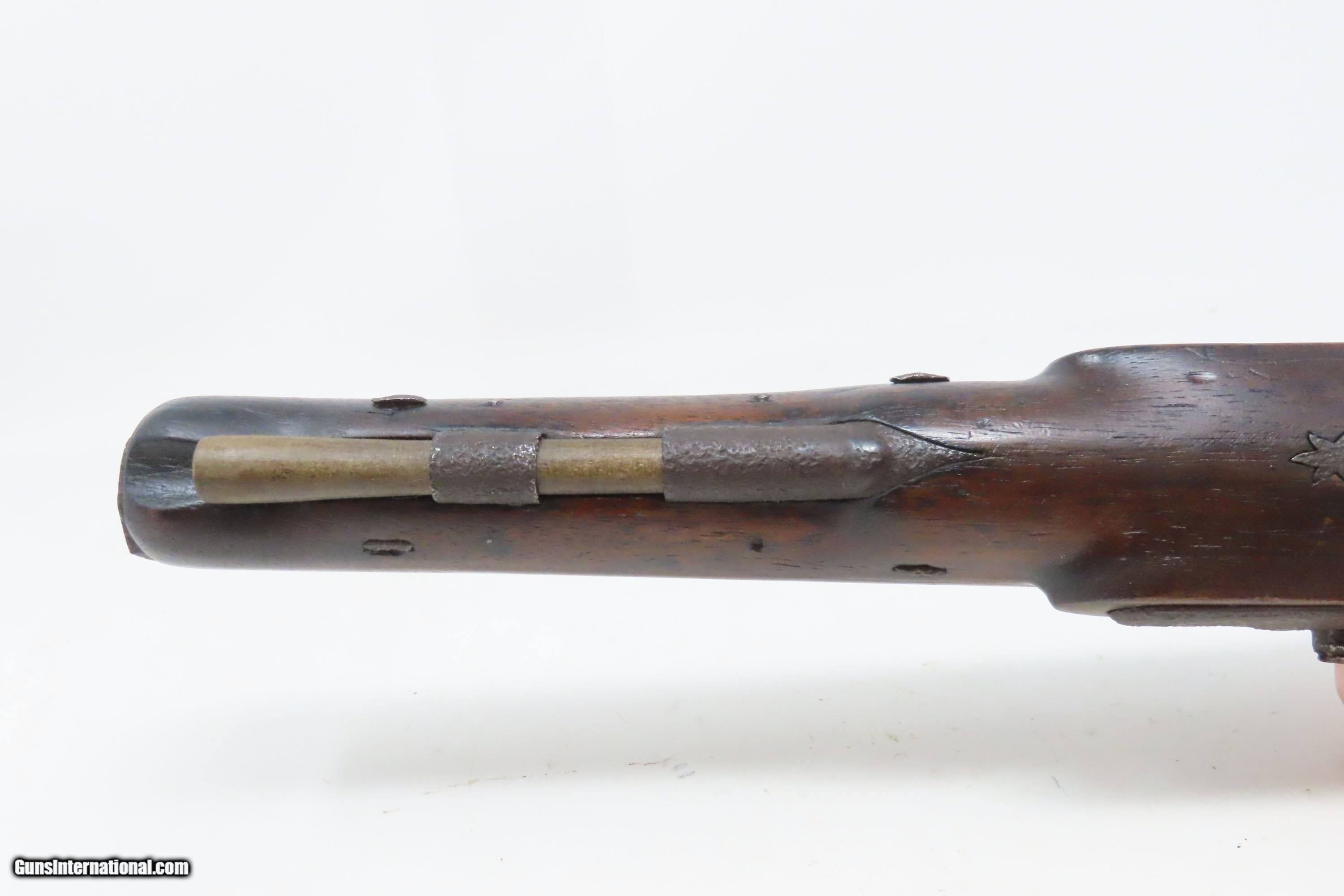 Description: Early 1800s EUROPEAN Antique .79 Percussion Conversion RIFLED “MANSTOPPER” OFFICER’S STYLE Short Range SELF DEFENSE Pistol Here we present an antique European Percussion Conversion Belt/Holster/Coat Pocket Pistol, made circa the early 19th Century likely in mainland Europe. This example would have started out life as a flintlock and converted over when the more reliable percussion firing system was introduced. This large bore flintlock pistol was used primarily as a self-defense weapon. Their effective range was short, and they were frequently used as an adjunct to a sword. Pistols in this era were usually smoothbore, although some rifled pistols were produced. They came in a variety of sizes with the smallest being less than 6 inches and the largest ranging to over 20 inches. The large-sized ones, such as this one, are what would be carried in the busy streets of Paris or London in the pocket of a gentleman’s coat or tucked into his belt during the tumultuous times of the mid-1700s to the early 1800’s in Western Europe. This also could have been privately purchased by a military officer to be carried into battle. This one features a “Manstopping” .79 caliber bore. The overall condition is good. Robust action. The bore is in good shape with rifling. Nicely checkered grip. Soid stock. A screw is missing from the side plate. Own the original! This is a legitimate antique and not a reproduction. Barrel is 9 inches. Caliber: .79 Percussion Overall condition as seen in photos. Very Fast. Very Safe. FREE SHIPPING WORLDWIDE. Delivered directly to your door by express mail! Guaranteed AUTHENTIC & Includes CERTIFICATE OF AUTHENTICITY. ancestryguns $1200 #230954 SOLD Antique: Yes |