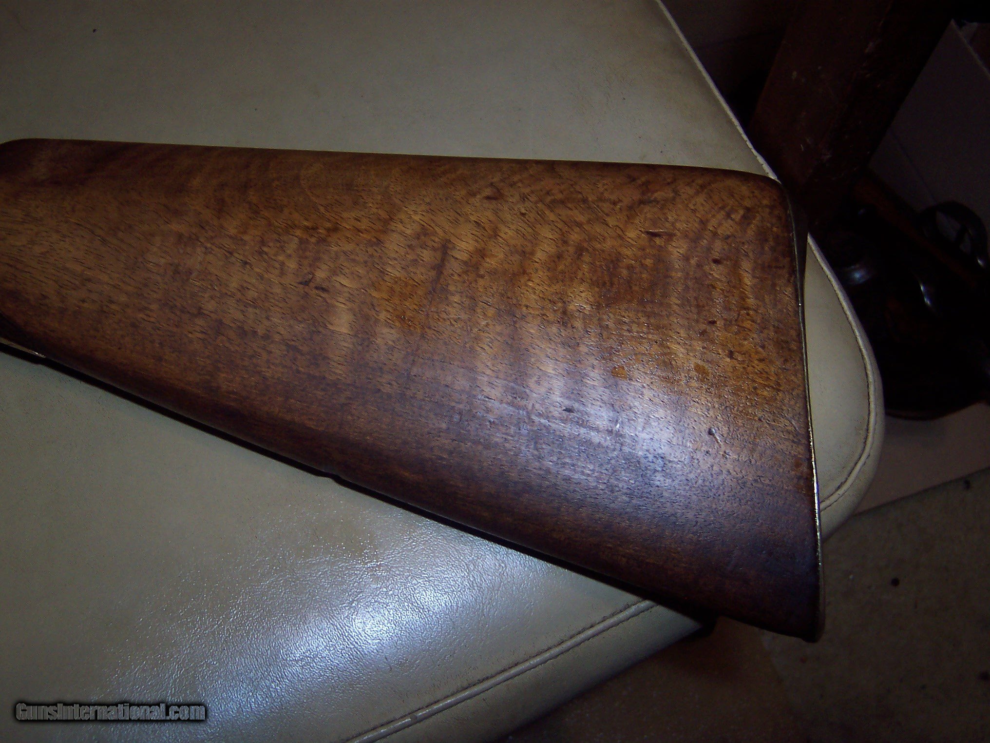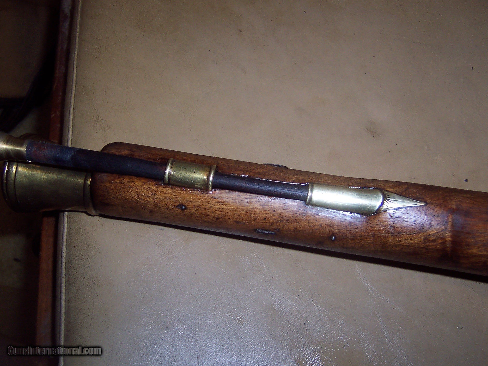 Description: made by barnes & co marked london on barrel / 14 inch barrel 30 inches oa // brass mounted / stock in very good condition all original gun except replaced ramrod/ this gun appears to have had very little use / pins may have been in guns from beginning/ stock very nice for its age // lock and parts lightly engraved // 1 3/8 inch bore at muzzle// locks works strong / nice nipple//// blank silver name plate behind barrel tang////$50 sh SOLD Antique: Yes Manufacturer: english Model: blunderbuss |