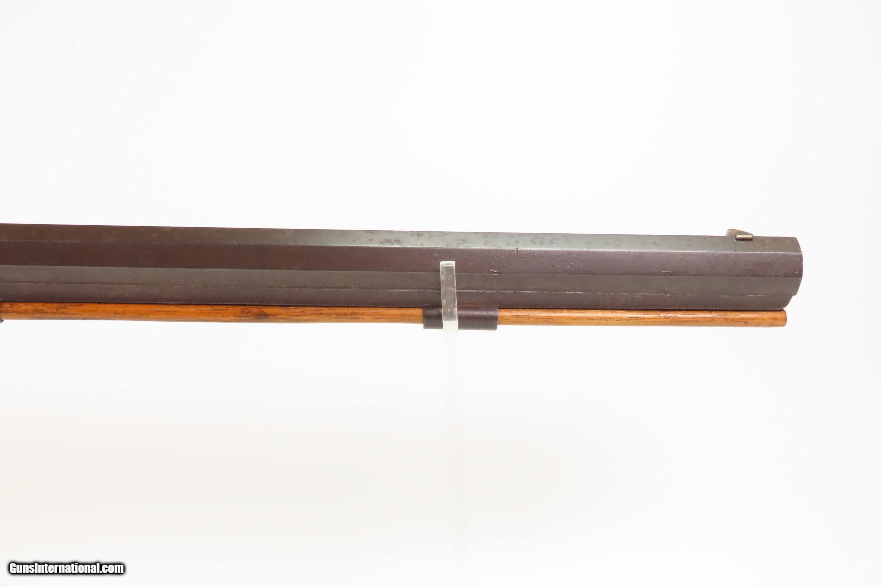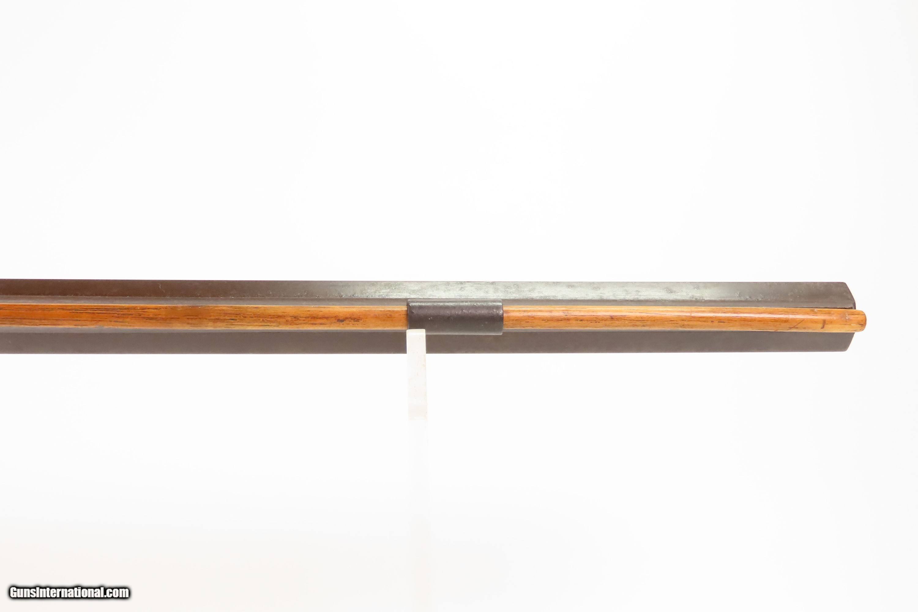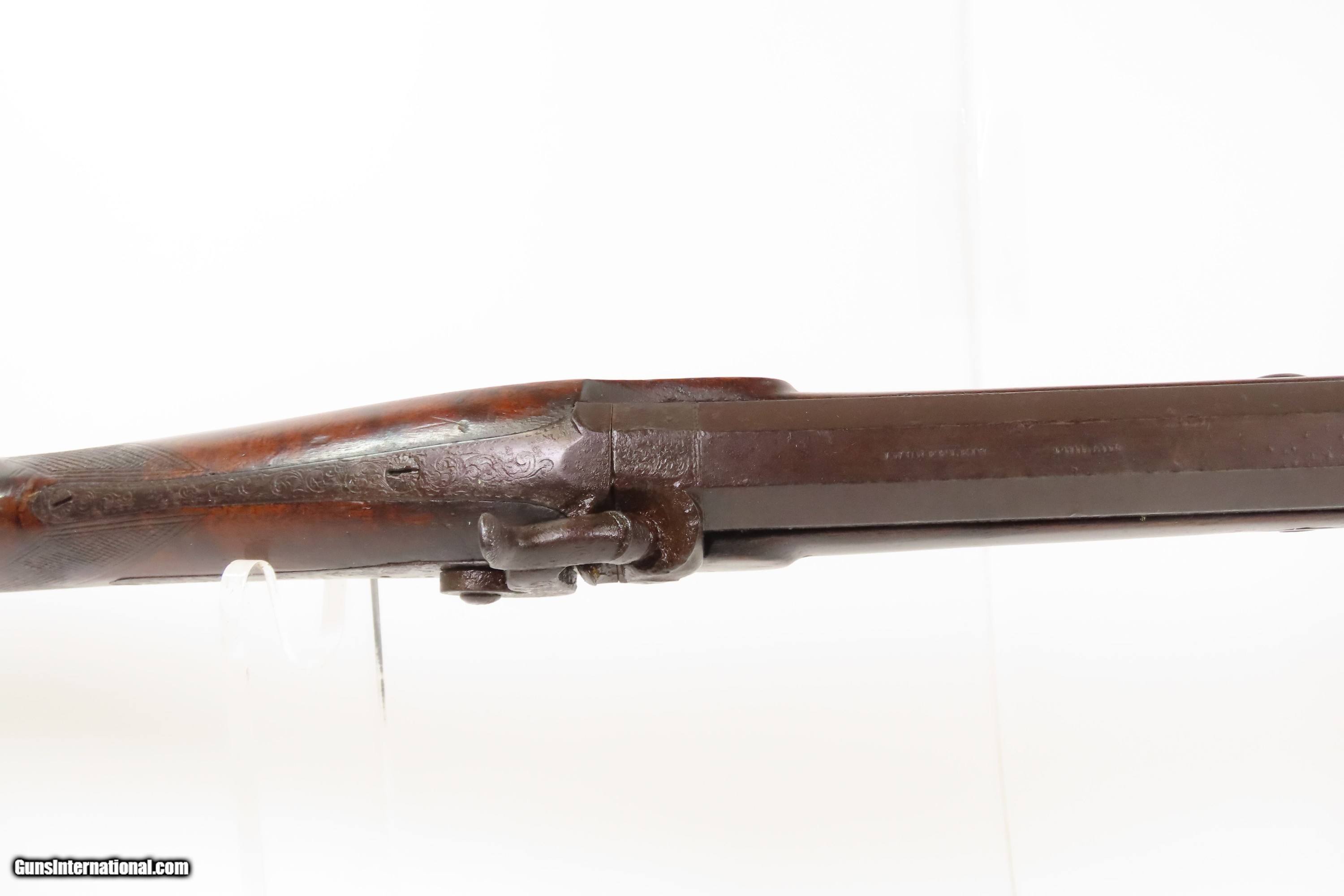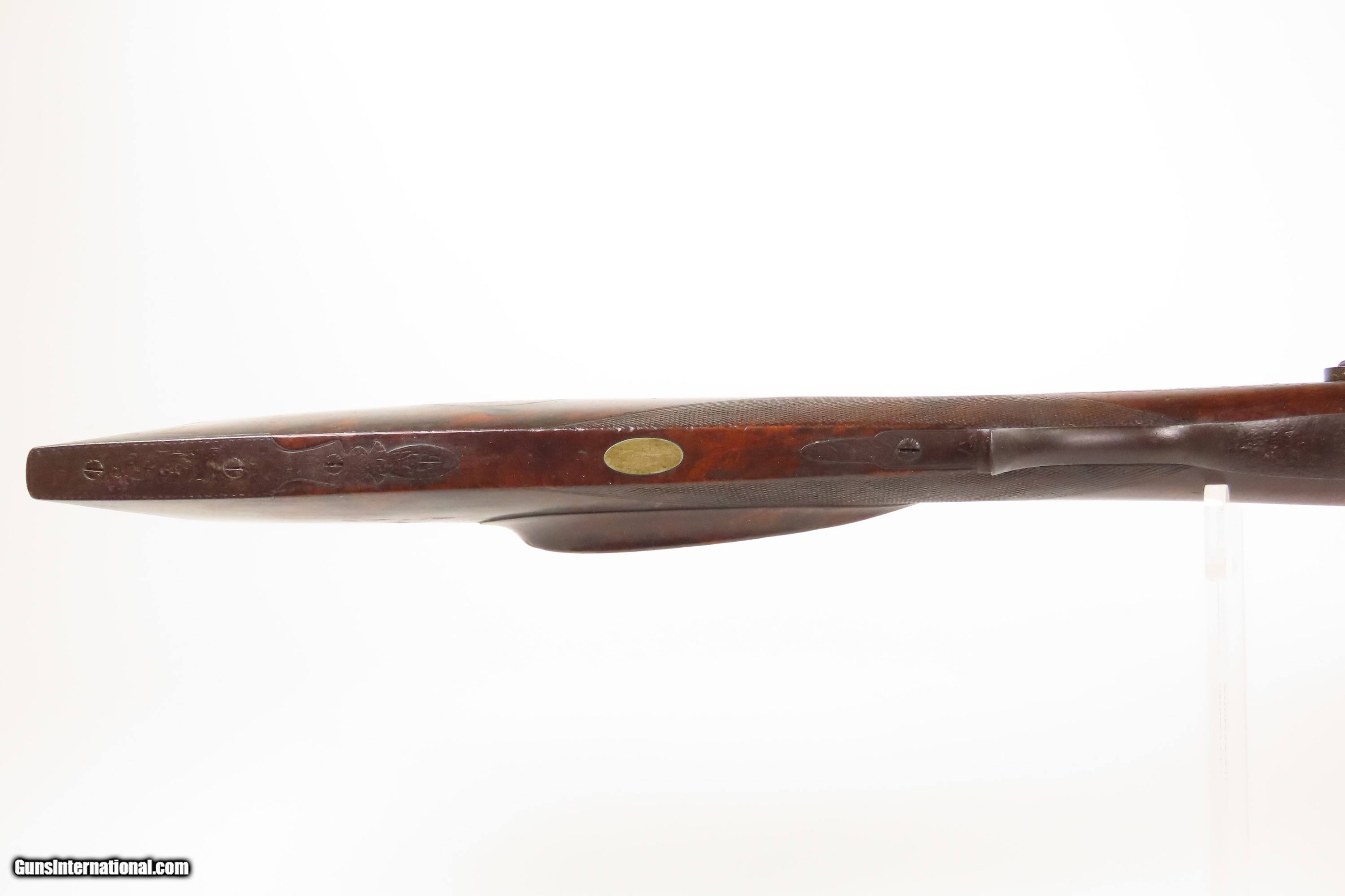 Description: ENGRAVED Antique JOHN WURFFLEIN Half Stock BACK ACTION .40 Percussion Rifle Made by the Founder of the SHUETZEN VEREIN Here we present an antique Engraved John Wurfflein Half Stock Back Action Percussion Rifle, made circa the 1850s. Wurfflein arrived in New York from Germany in 1844 and settled in Philadelphia, Pennsylvania. After applying for U.S. citizenship in 1848, he was granted his citizenship in 1851. He, along with his brother Andrew, also a gunsmith by trade, worked together for some time, and were two of the six that founded the Shuetzen Verein, a prominent German shooting club in Philadelphia, in 1846. Their work included rifles and pistols, including close copies of their Philadelphia neighbor Henry Deringer’s hit pocket pistol. John retired towards the end of the Civil War in 1864 and passed away in Philadelphia in 1884. These locks were called “back action” because the mainspring hangs behind the tumbler. The back action is often used in single and double rifles, and occasionally in single barrel shotguns where the need for strength requires as little steel as possible be removed from the bar of the action. The overall condition is good. Original brown patina. The bore is in good shape for its age. This example sports a solid stock, that has been lightly refinished, with an average amount of wear/repairs. Light engravings are present, albeit thinned. Legible markings. Own the original! This is a legitimate antique and not a reproduction. Barrel is 31-1/4 inches. Caliber: .40 Percussion Overall condition as seen in photos. Very Fast. Very Safe. FREE SHIPPING WORLDWIDE. Delivered directly to your door by express mail! Guaranteed AUTHENTIC & Includes CERTIFICATE OF AUTHENTICITY. ancestryguns $1450 #256043 Antique: Yes Price: $1,450.00 Buy Now Pay with ![]() Contact Seller |