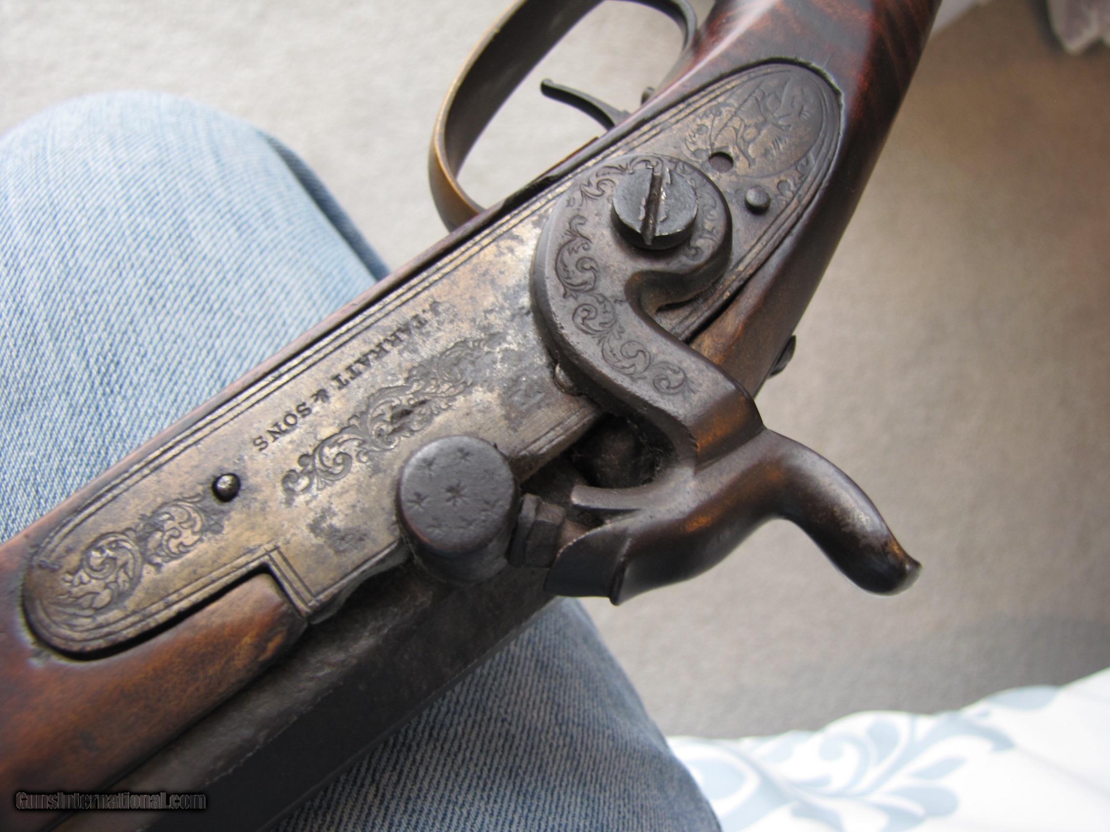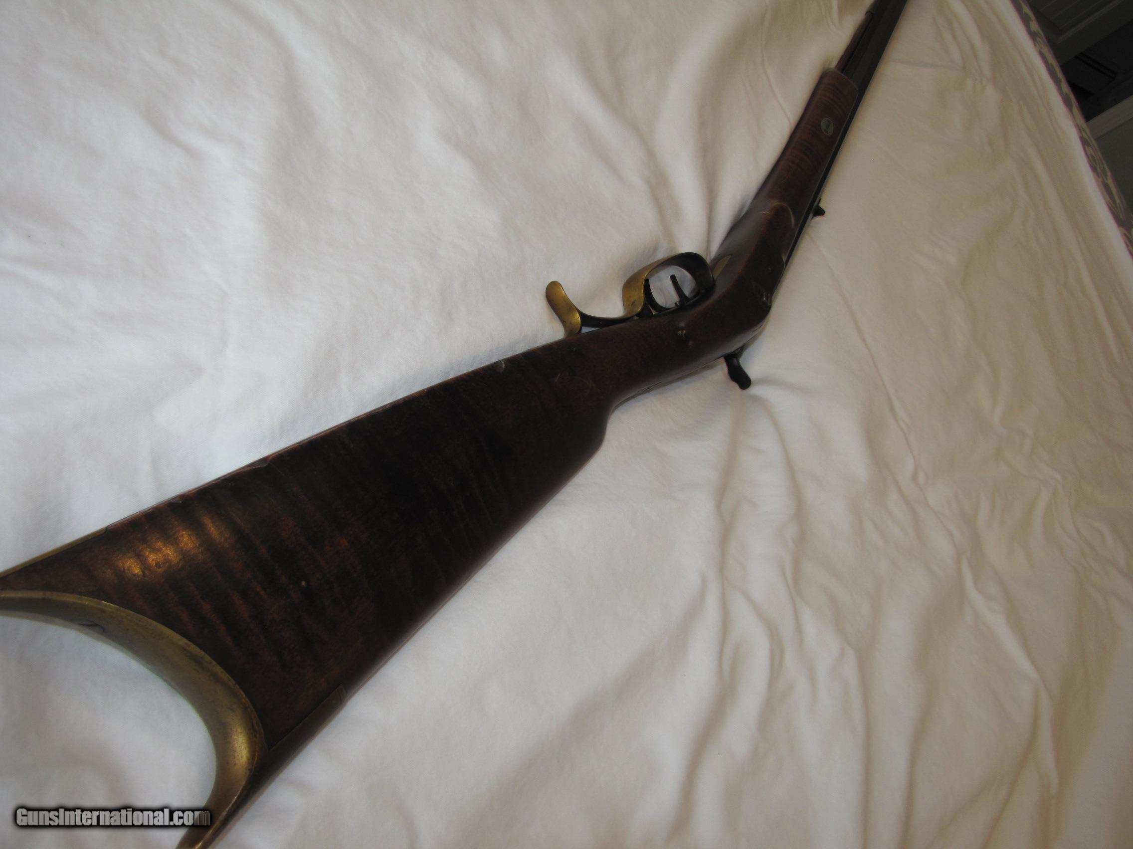 Description: This is an extremely rare Kentucky half stock, extremely well kept, Well marked with M. MOXLEY ,run away slave, stamped three times on the barrel. Moxley story of his escaping from slavery to become a GUN Smith in Ohio, is amazing, they just did a speech on his life in Louisville at the Frazier Museum. The workman ship on the barrel includes stars on the nipple and stars on the barrel muzzle end , and the brass sight that was common to Moxley barrels. The guns trigger is ornately engraved , with the other gun makes name J.TARRATT & sons, and the lock plate has two quail and floral designs on the lock plate & trigger. The tiger maple stock is just beautiful with a nice patina and stripes running through the wood , the pictures do not do this gun justice. The brass work is beyond ornate with the patch box ornately inlayed , and the brass butt plate is amazing. The double trigger holds the gun cocked perfect, and works smoothly.The brass trigger guard is ornate and beautiful. The brass ramrod holders still hold the original strait hickory ramrod, with both end having the original steel ferrels to tamp the powder. The guns patina and I left the green in the patch box to shows the age, 1840's my guess. I have never seen one this good in years. 859-533-5445 SOLD Antique: Yes Manufacturer: J.TARRATT & M MOXLEY Model: KENTUCKY HALF STOCK Serial Number: na Caliber Info: 36? Condition: ABOVE GOOD Metal Condition: TINY BIT OF WEAR AROUND THE NIPPLE Wood Condition: good Bore Condition: GOOD Barrels: HEAVEY Barrel Type: HEAVEY Triggers: DOUBLE Gauge Info: 36 Stock: HALF STOCK Butt Pad: BRASS Sights: FRONT AND BACK Manufacture Date: 1840'S? Engraving: QUAIL & FLORIA |