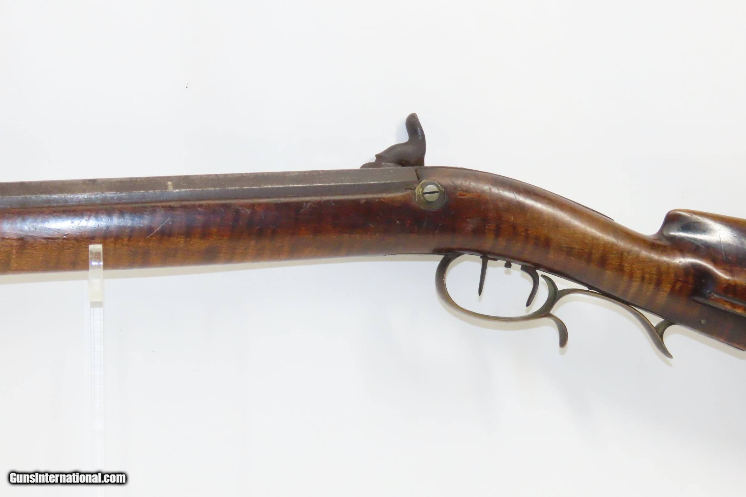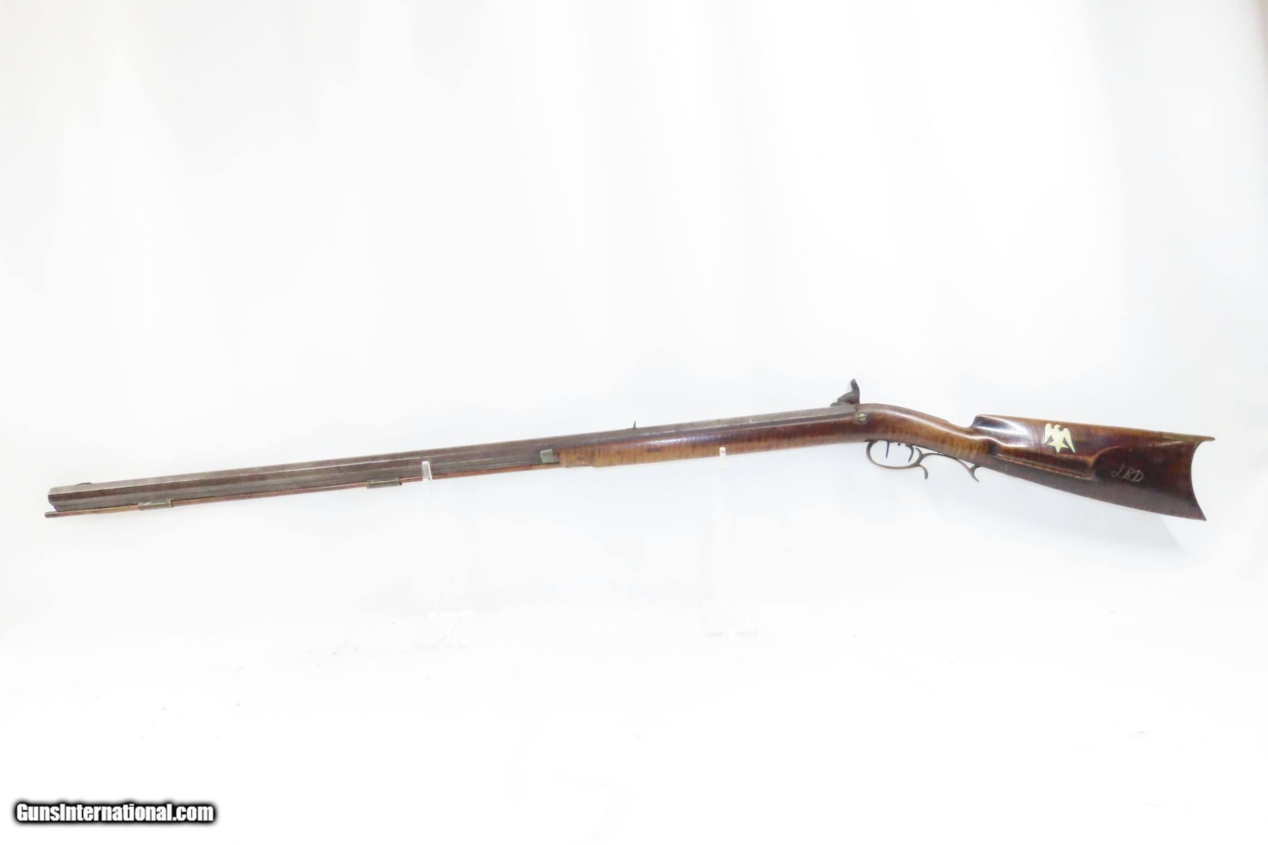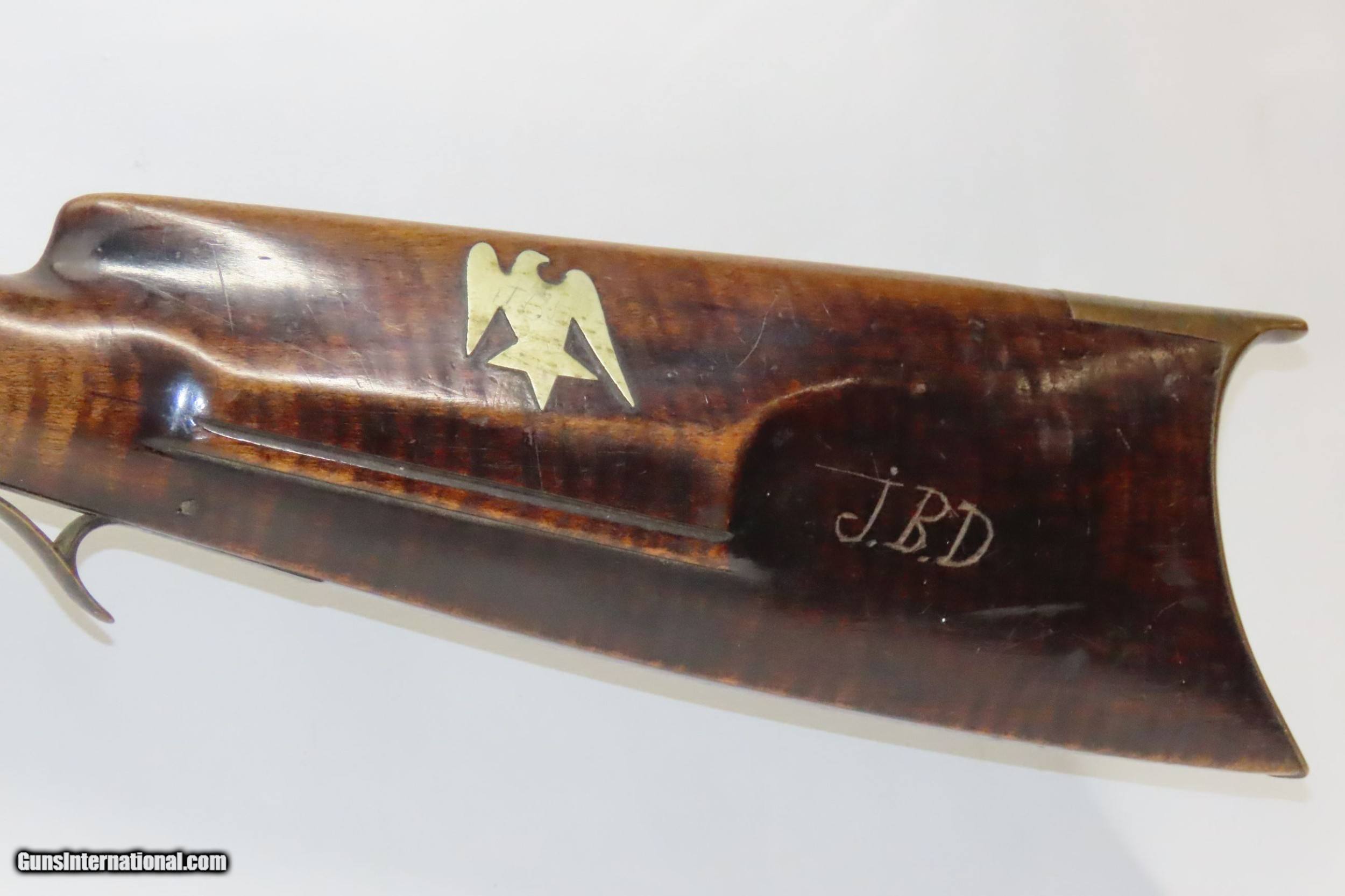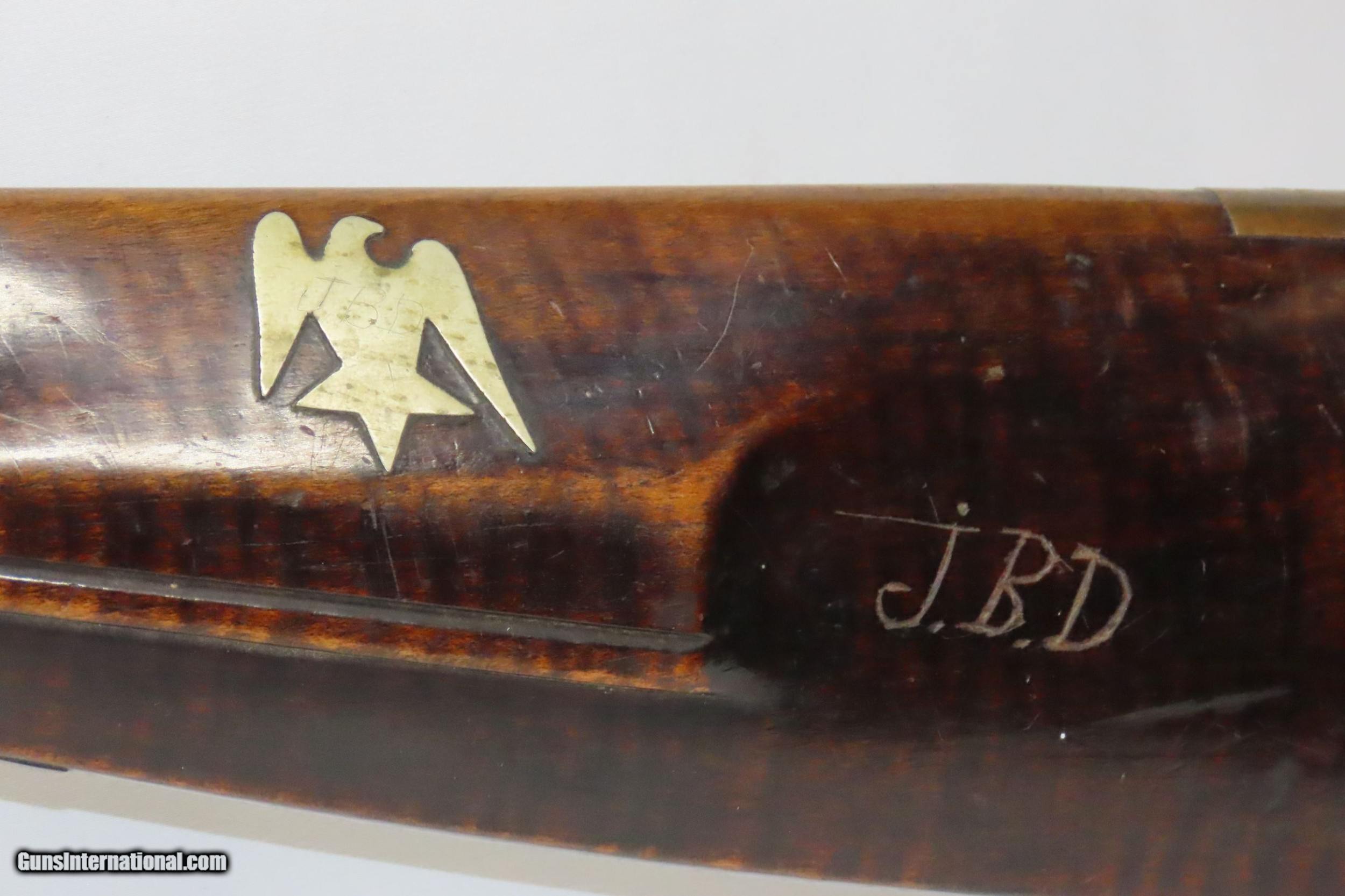 Description: FORD BROTHERS Antique Half-Stock LONG RIFLE .44 Caliber PERCUSSION 1800s Frontier Rifle with Striped Maple Stock! Here we present an Engraved Antique Back Action Half Stock Percussion Rifle with a Ford Brothers Lock, made circa the mid-19th Century. This one features a striped maple stock decorated with German silver accents of a stag and an eagle. The initials “JBD” is scratched into this rifle twice. Double set triggers. Its stout octagonal barrel is in .44 caliber, large enough to take medium to large sized game or to defend the homestead against unwanted aggression. Rifle manufacture in the mid-to-late 19th Century was rapidly changing over from thousands of craftsmen all over the United States and on the Frontier making and selling their wares, to the large factories with standardized assembly lines and modern manufacturing techniques. Many makers’ names of the so-called Kentucky long rifles have been lost over time. This rifle is one such example. The American Long Rifle, more commonly, but less correctly, known as the ‘Kentucky rifle’, was described by Captain John G. W. Dillin in the dedication to his seminal 1924 book, The Kentucky Rifle: “From a flat bar of soft iron, hand forged into a gun barrel; laboriously bored and rifled with crude tools; fitted with a stock hewn from a maple tree in the neighboring forest; and supplied with a lock hammered to shape on the anvil; an unknown smith, in a shop long since silent, fashioned a rifle which changed the whole course of world history; made possible the settlement of a continent; and ultimately freed our country of foreign domination. Light in weight; graceful in line; economical in consumption of powder and lead; fatally precise; distinctly American; it sprang into immediate popularity; and for a hundred years was a model often slightly varied but never radically changed.” The overall condition is good. Original finish and patina. The action remains strong. The nipple is fused to the bolster due to weathering and time. The bore is dirty but strong rifling still shows through. The stock is nicely figured and solid. A great piece of American history! Own the original! This is a legitimate antique and not a reproduction. Barrel is 38-3/4 inches. Caliber: .44 Percussion Overall condition as seen in photos. Very Fast. Very Safe. FREE SHIPPING WORLDWIDE. Delivered directly to your door by express mail! Guaranteed AUTHENTIC & Includes CERTIFICATE OF AUTHENTICITY. ancestryguns $1650 #220087 SOLD Antique: Yes |