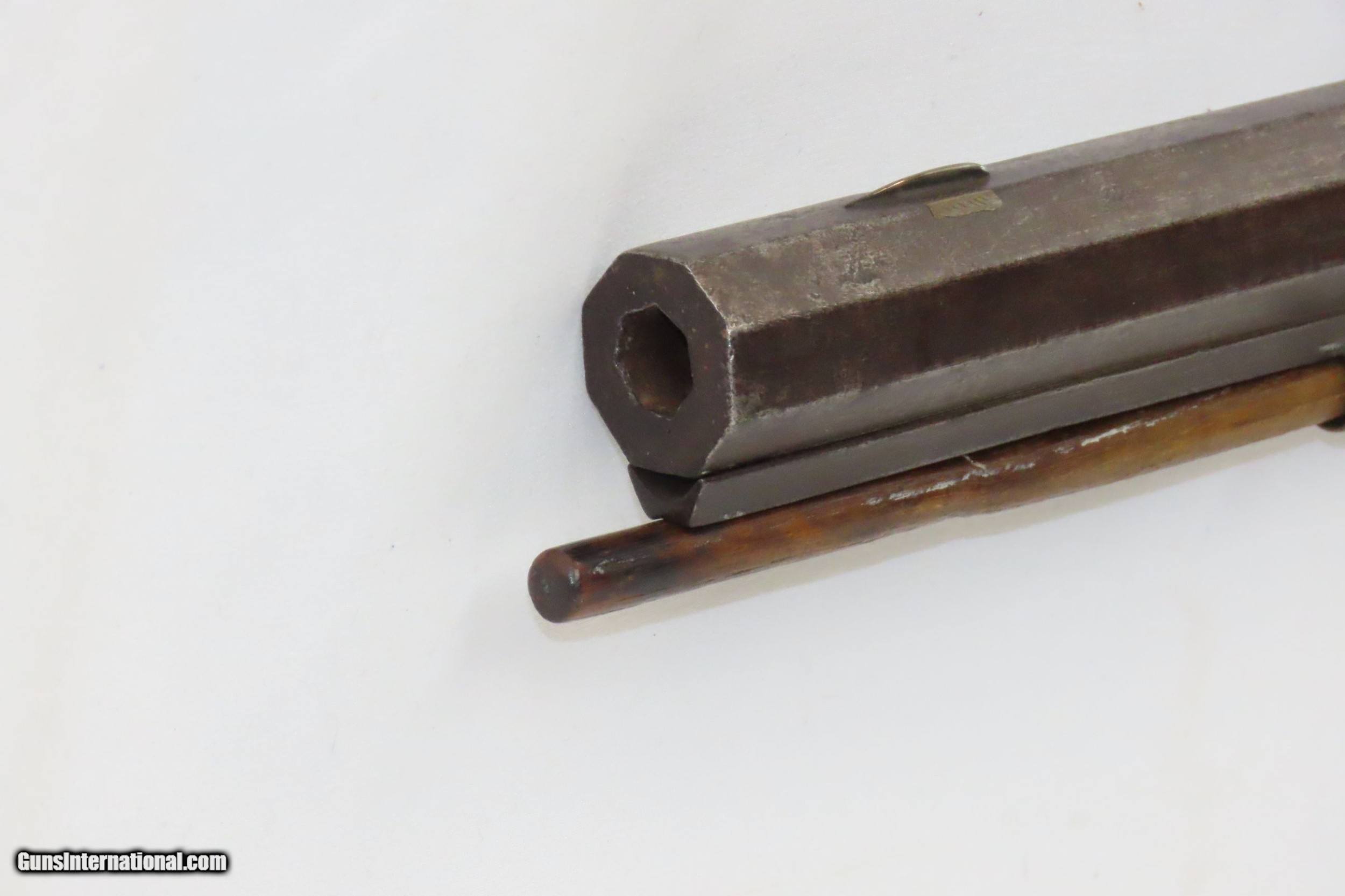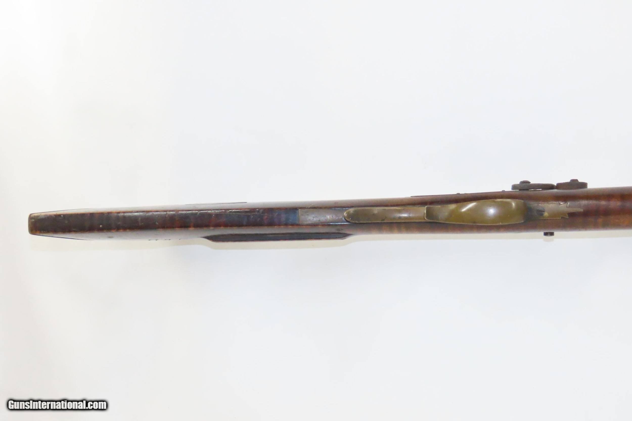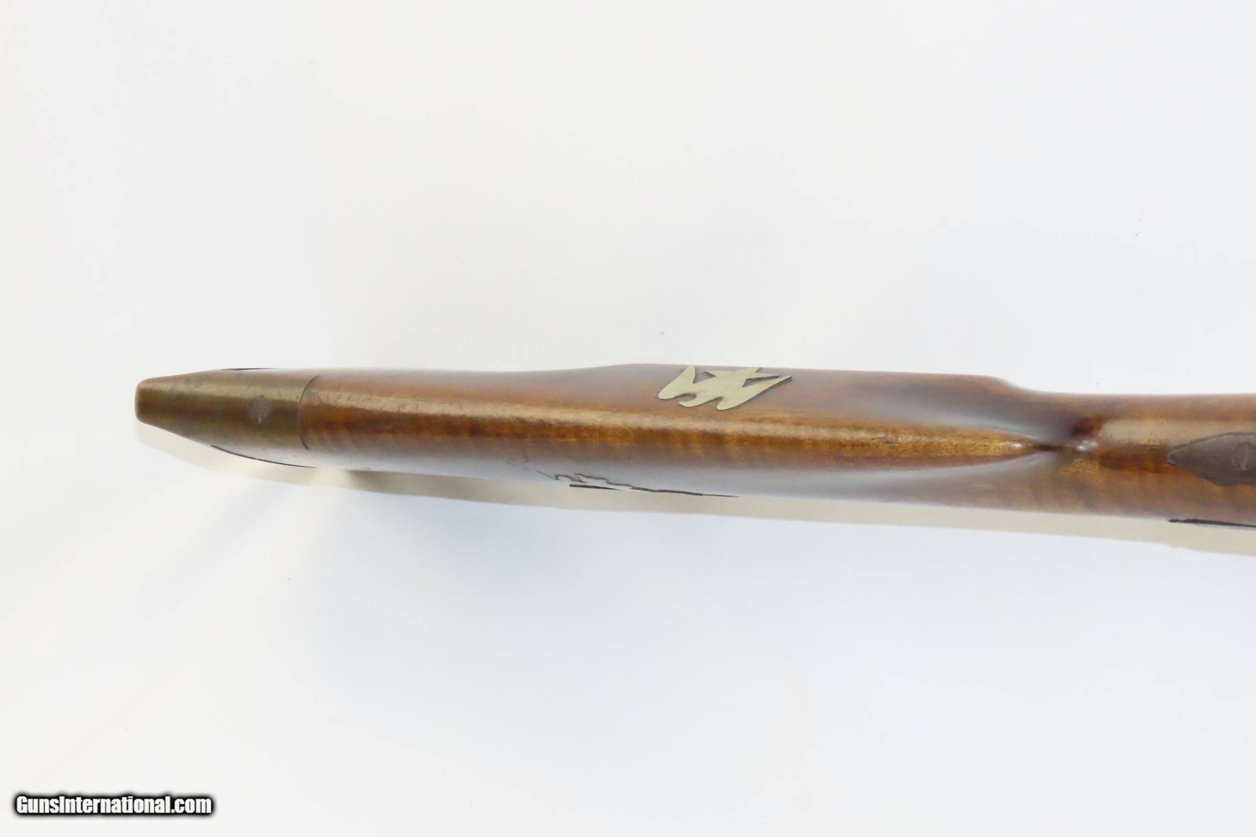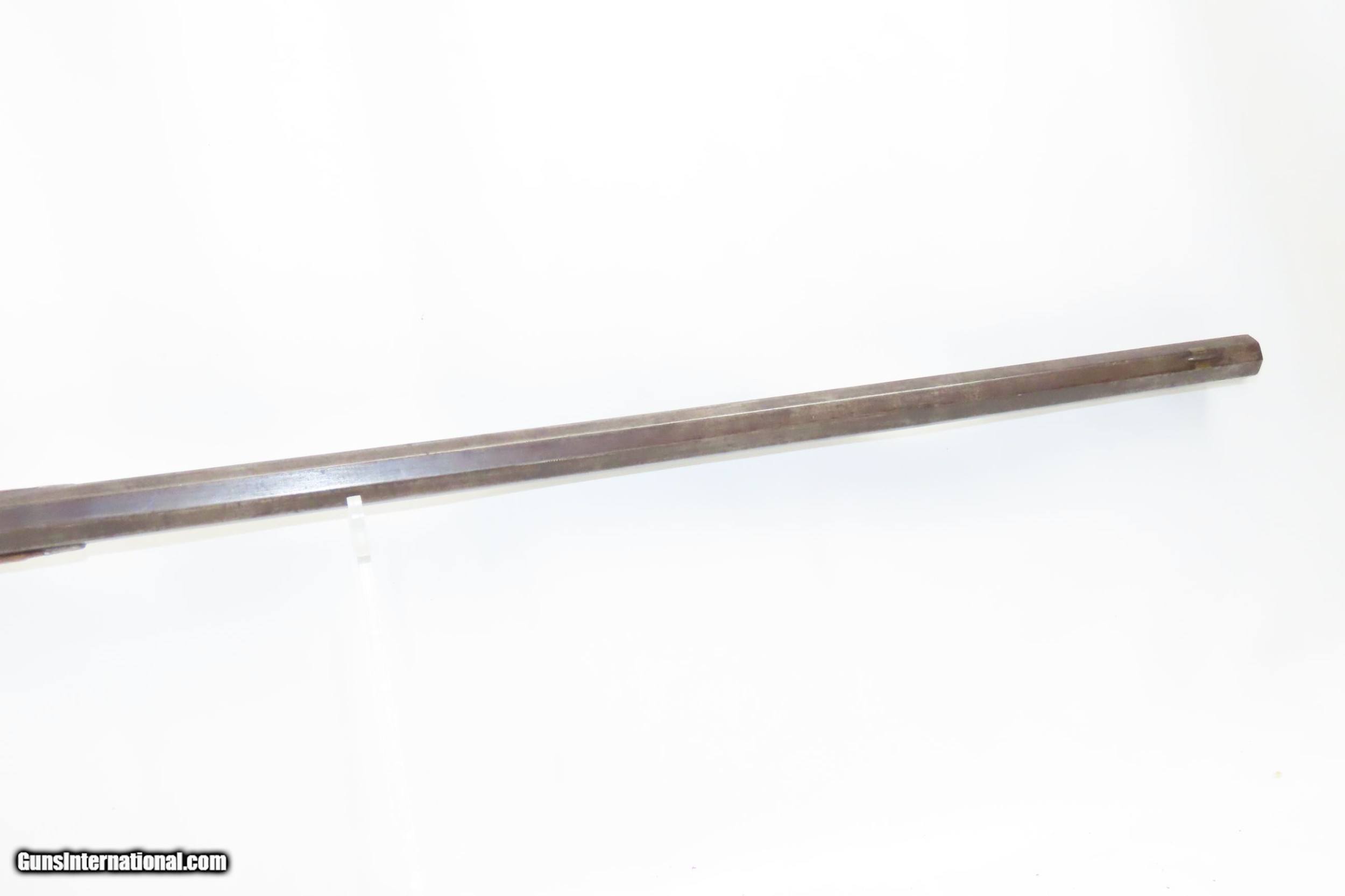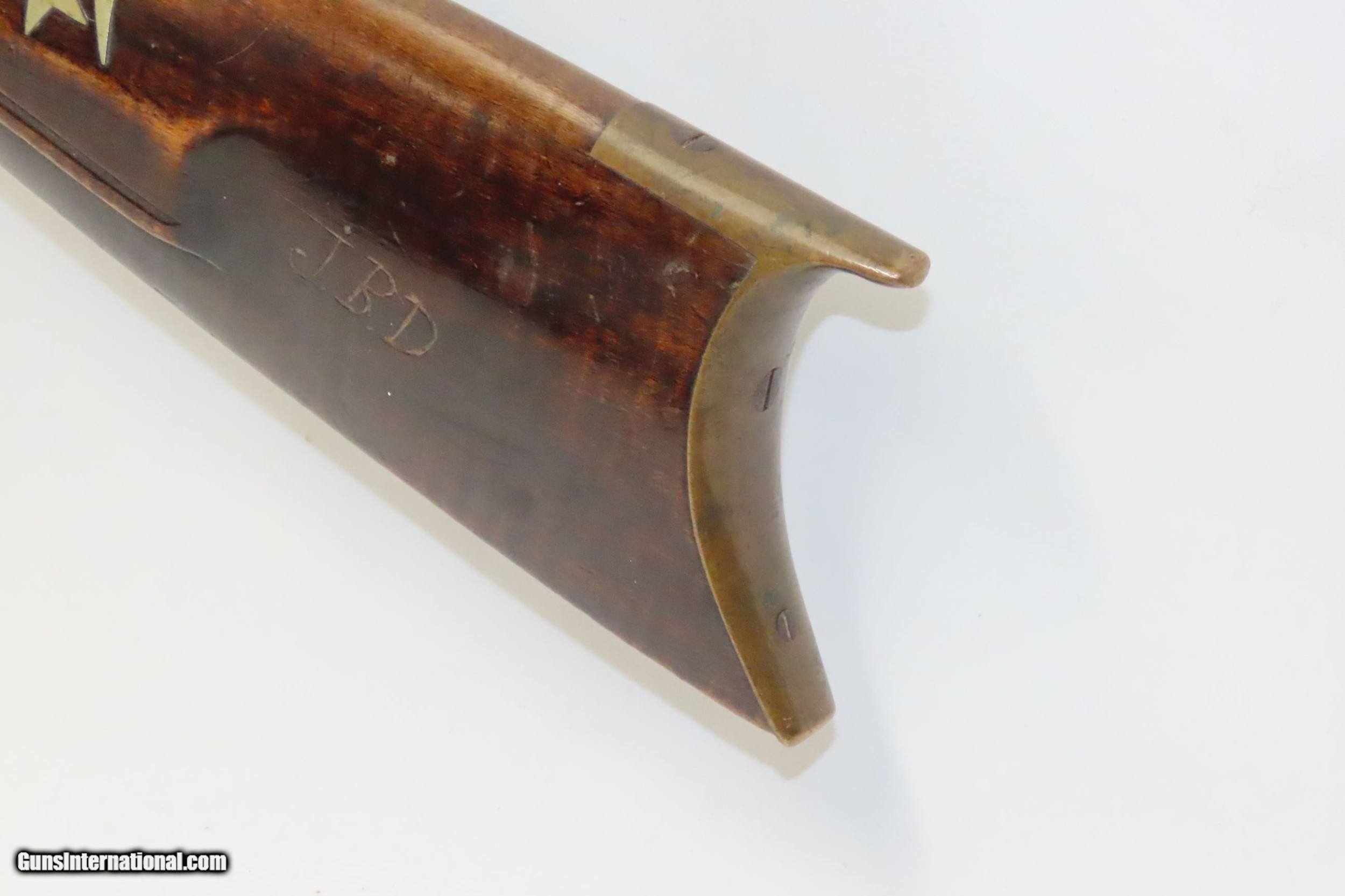 Description: FORD BROTHERS Antique Half-Stock LONG RIFLE .44 Caliber PERCUSSION 1800s Frontier Rifle with Striped Maple Stock! Here we present an Engraved Antique Back Action Half Stock Percussion Rifle with a Ford Brothers Lock, made circa the mid-19th Century. This one features a striped maple stock decorated with German silver accents of a stag and an eagle. The initials “JBD” is scratched into this rifle twice. Double set triggers. Its stout octagonal barrel is in .44 caliber, large enough to take medium to large sized game or to defend the homestead against unwanted aggression. Rifle manufacture in the mid-to-late 19th Century was rapidly changing over from thousands of craftsmen all over the United States and on the Frontier making and selling their wares, to the large factories with standardized assembly lines and modern manufacturing techniques. Many makers’ names of the so-called Kentucky long rifles have been lost over time. This rifle is one such example. The American Long Rifle, more commonly, but less correctly, known as the ‘Kentucky rifle’, was described by Captain John G. W. Dillin in the dedication to his seminal 1924 book, The Kentucky Rifle: “From a flat bar of soft iron, hand forged into a gun barrel; laboriously bored and rifled with crude tools; fitted with a stock hewn from a maple tree in the neighboring forest; and supplied with a lock hammered to shape on the anvil; an unknown smith, in a shop long since silent, fashioned a rifle which changed the whole course of world history; made possible the settlement of a continent; and ultimately freed our country of foreign domination. Light in weight; graceful in line; economical in consumption of powder and lead; fatally precise; distinctly American; it sprang into immediate popularity; and for a hundred years was a model often slightly varied but never radically changed.” The overall condition is good. Original finish and patina. The action remains strong. The nipple is fused to the bolster due to weathering and time. The bore is dirty but strong rifling still shows through. The stock is nicely figured and solid. A great piece of American history! Own the original! This is a legitimate antique and not a reproduction. Barrel is 38-3/4 inches. Caliber: .44 Percussion Overall condition as seen in photos. Very Fast. Very Safe. FREE SHIPPING WORLDWIDE. Delivered directly to your door by express mail! Guaranteed AUTHENTIC & Includes CERTIFICATE OF AUTHENTICITY. ancestryguns $1650 #220087 SOLD Antique: Yes |