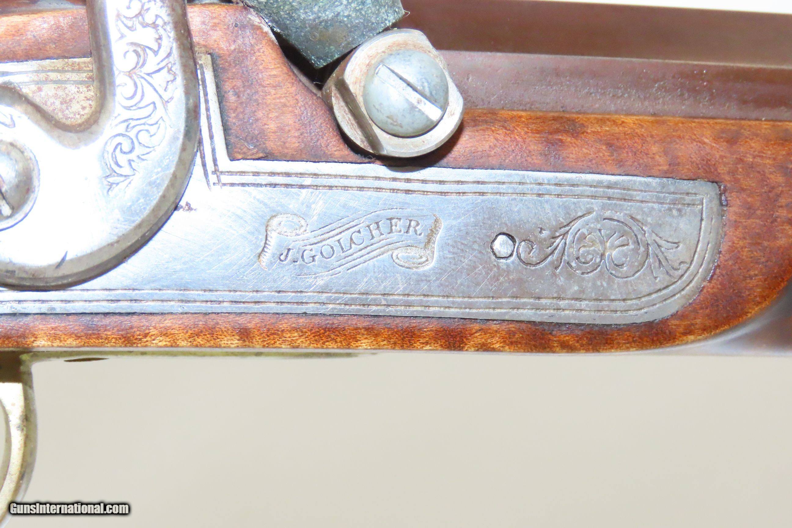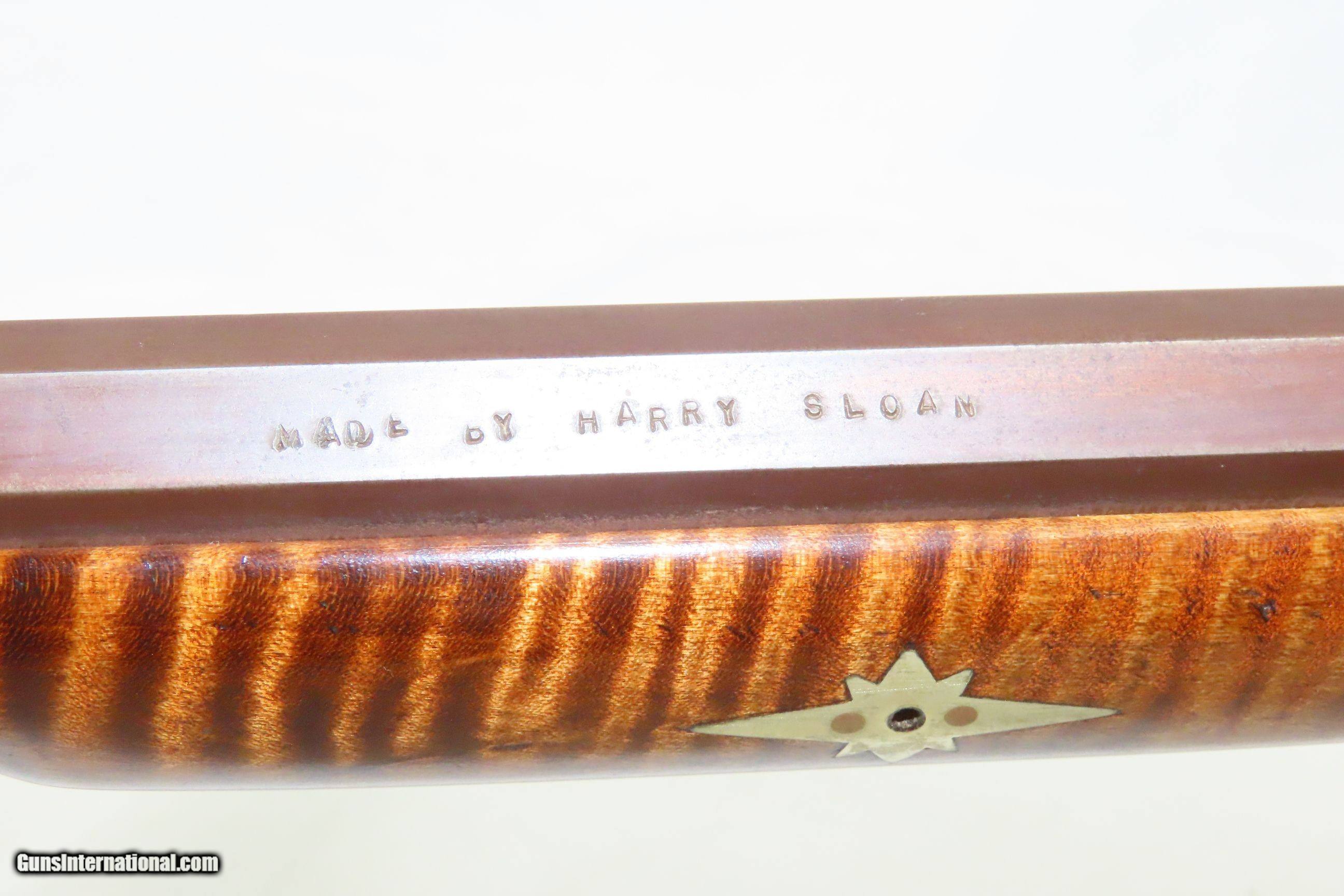 Description: HARRLY SLOAN Full-Stock LONG RIFLE .40 Cal with Golcher Lock, TARGET SIGHTS Striped Maple Full-Length Stock with German Silver Patchbox Here we present a 20th Century Full-Stock Long Rifle by Harry Sloan of Lorain, Ohio. This rifle has a 31-1/2 inch octagonal barrel in .40 caliber. The stock is beautifully grained maple and is adorned with a large patchbox and small medallions throughout of German silver. Double set triggers. The sights are Redfield Olympic Globe target sights. The front sight is missing the rear base screw. J. Golcher 19th century lock. The overall condition is fine. Original finish. The action is excellent with a very light and crisp trigger pull. The bore is shiny bright with sharp rifling. The stock is fine and smooth. Full length solid brass rammer. Very nice, very handsome! Barrel is 31 ½” in length. Caliber: .40 Overall condition as seen in photos. Very Fast. Very Safe. FREE SHIPPING WORLDWIDE. Delivered directly to your door by express mail! ancestryguns $1200 #228291 SOLD Antique: Yes |