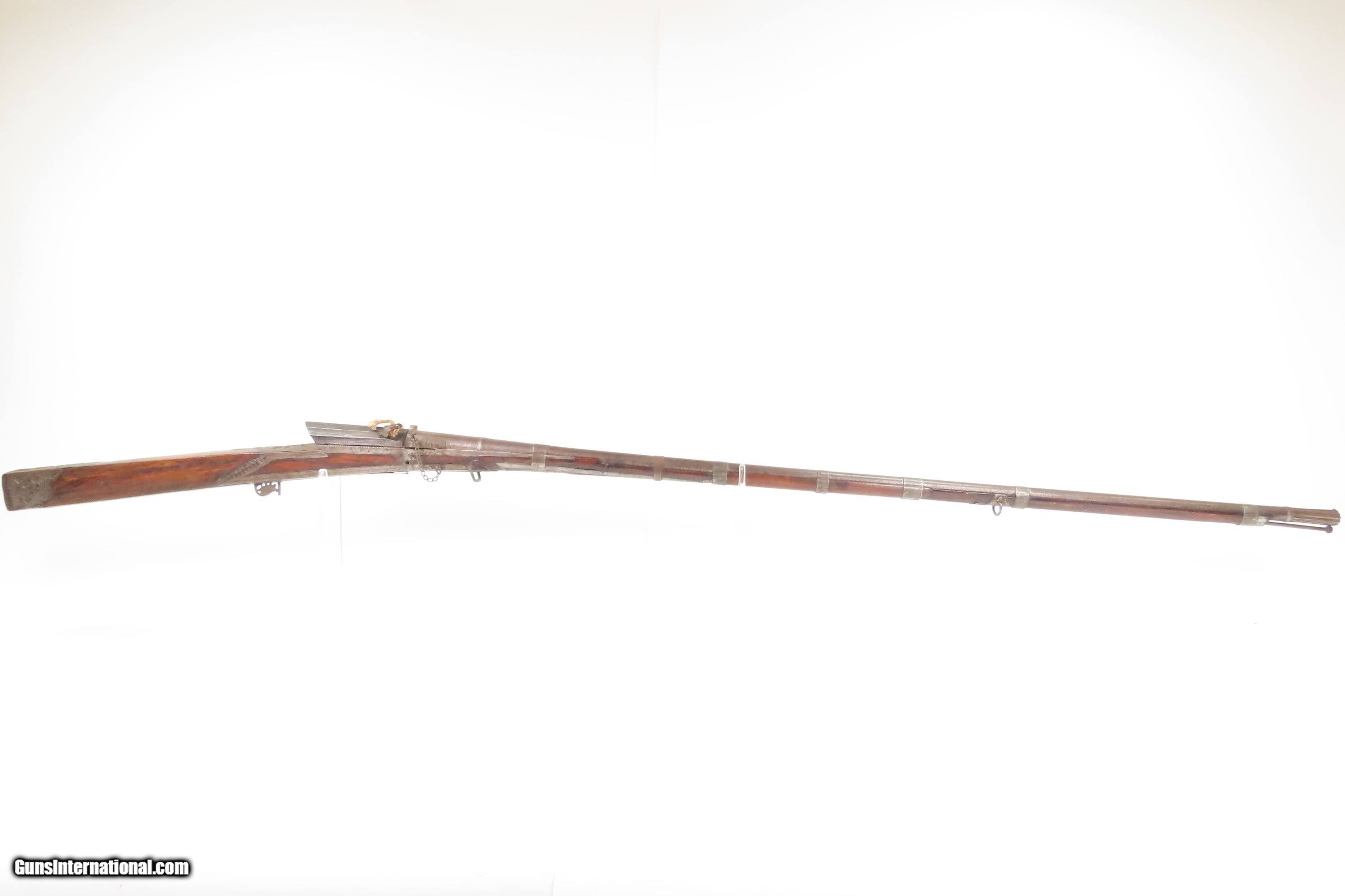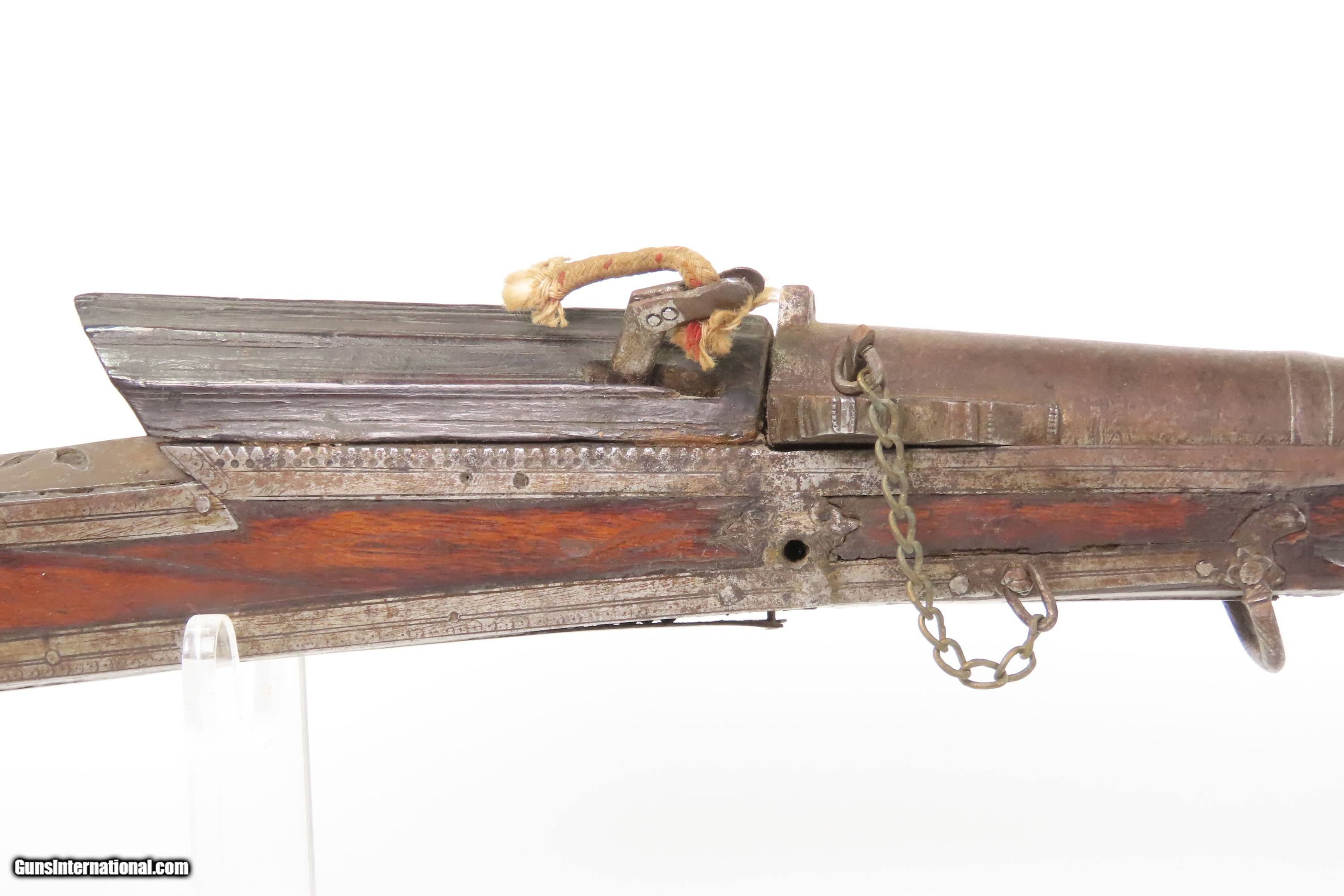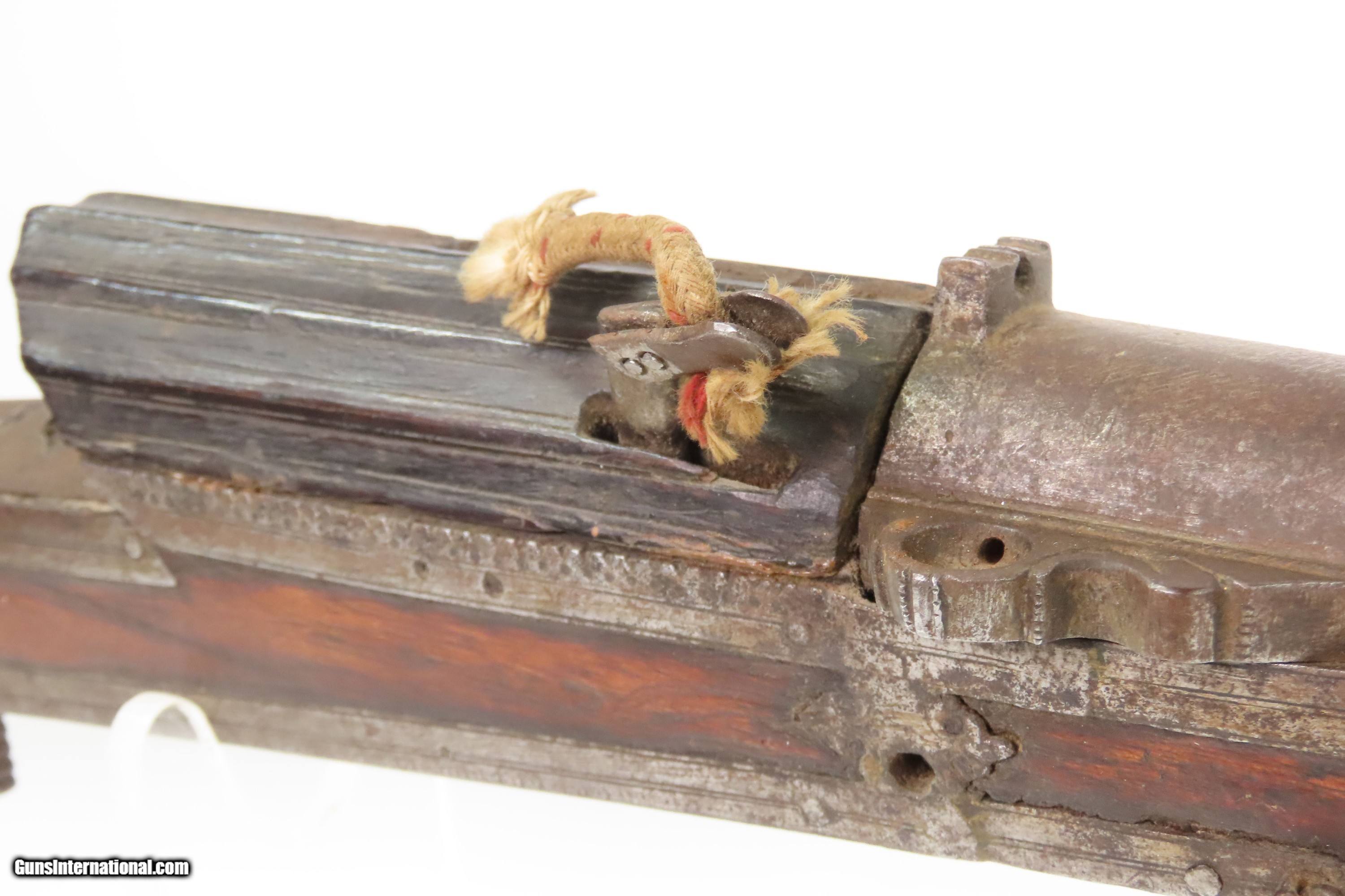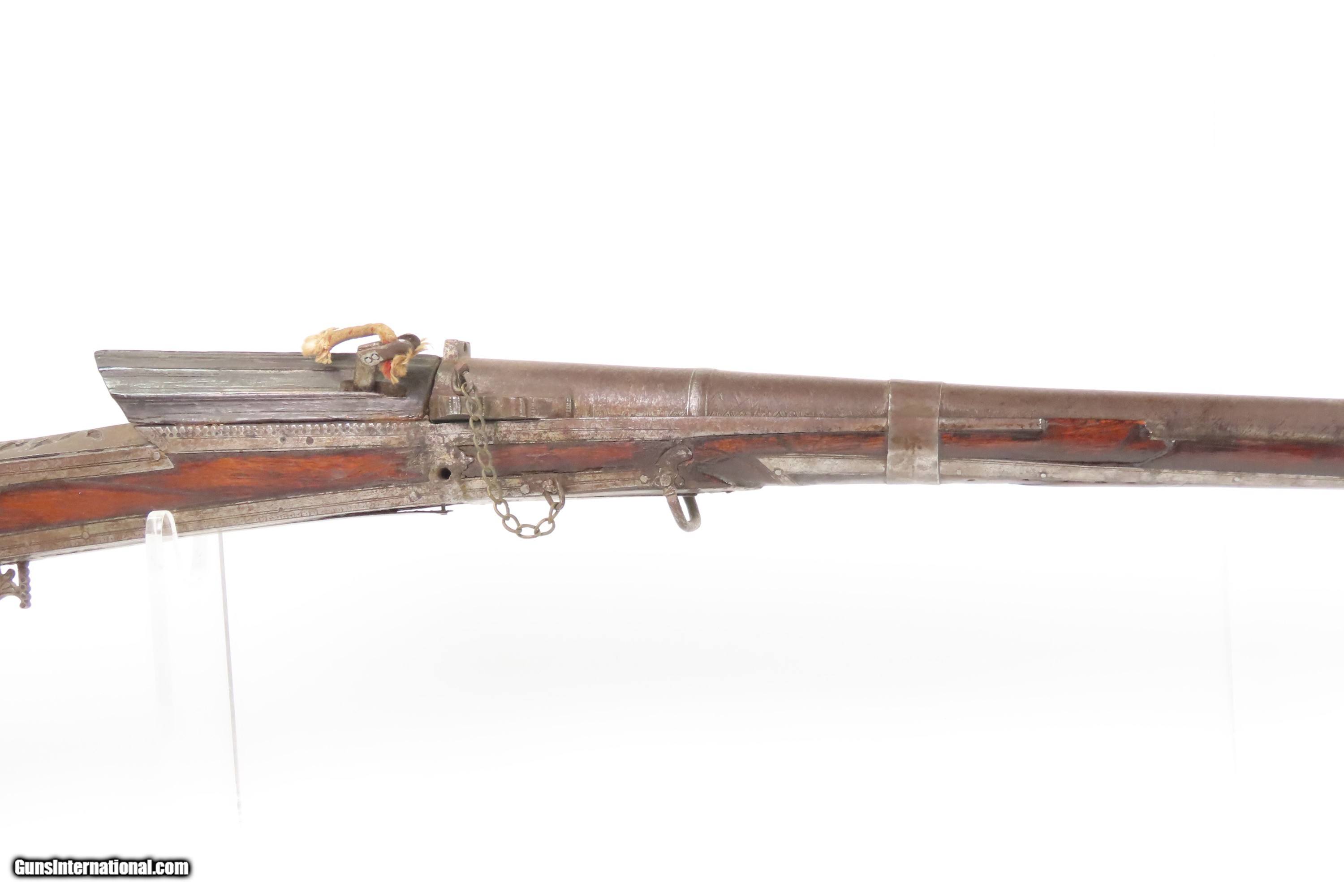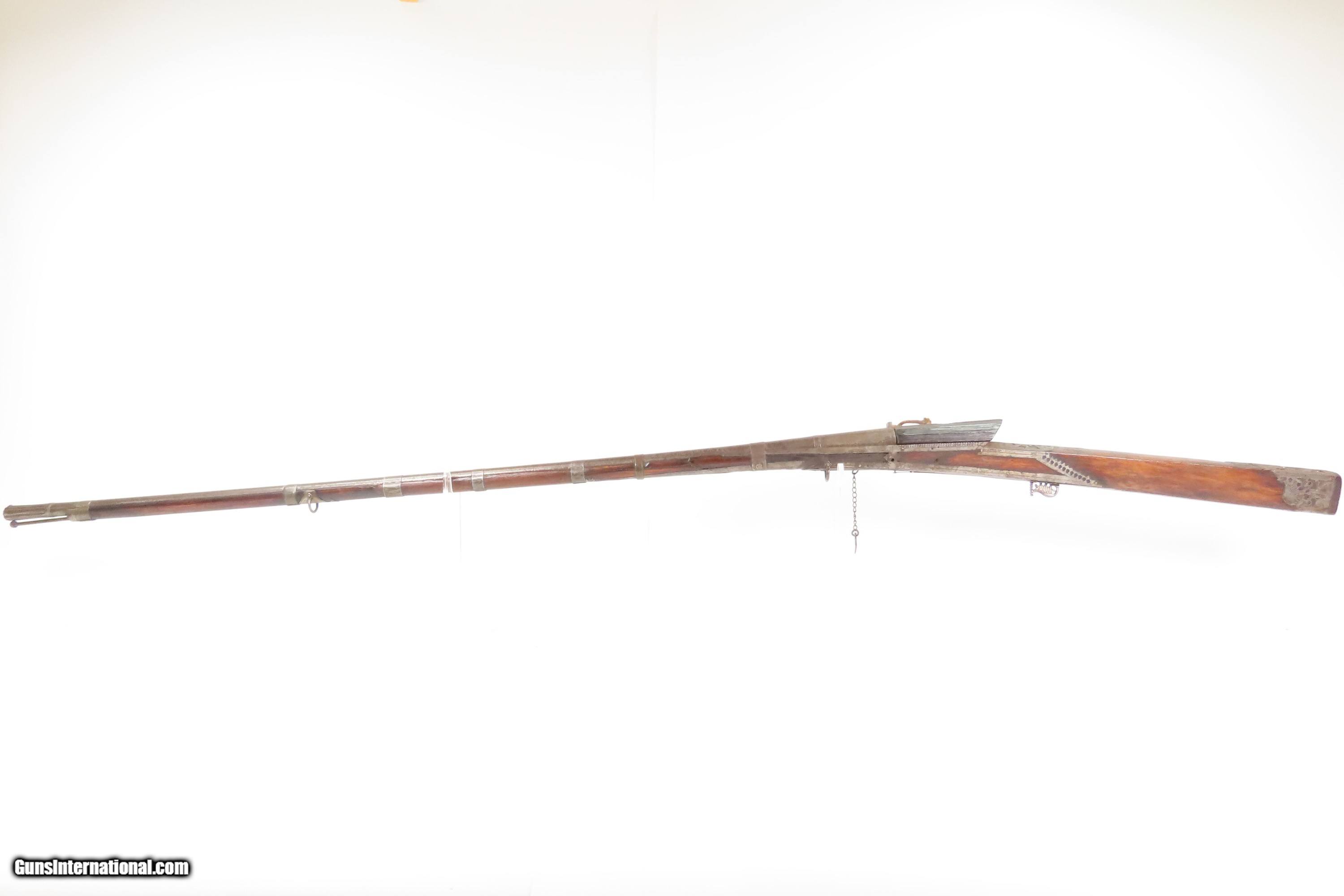 Description: MASSIVE 1700s Antique Northern India TORADAR MATCHLOCK Musket HAND CANNON MUGHAL EMPIRE Indian with LONG 47-3/8 Inch Barrel Here Ancestry Guns presents an antique Indian Toradar Matchlock Musket, made circa the 18th century in India. They were found mostly in the Mughal-influenced Northern and Central India. Emperor Akbar the Great was the Mughal ruler during the late half of the 16th Century. He was known for his many accomplishments, among which was the expansion of his empire. He was a great leader and military commander, but he also benefitted by adopting and developing firearms technology. Production and use of matchlock firearms greatly increased under his guidance, giving him an enormous advantage over those he would conquer. The Mughal Empire would finally succumb to the British in 1858. The matchlock would see its apex from the late 16th Century to about the early 1800s. The gun is a type of smoothbore firearm used in the 16th through 18th centuries by defending forces to break the advance of enemy troops. Essentially, it was a scaled-up version of the army's standard infantry musket, but with a bore of up to one-inch (25.4 mm) caliber. These weapons filled a gap in firepower between the musket and the lightest artillery pieces, such as the swivel gun. This sort of weapon may also be found described as an amusette, rampart gun, or Hackbut, a name originally given to early medieval hand cannon. Original dark patinas. Splitting is present in front of the trigger tang, behind the wrist, a cut at the third barrel band from the front, and a repair in front of the rear barrel band. The action functions. Markings are discernable. Darkened bore, remains good. A barrel band or two are loose. Own the original! This is a legitimate antique and not a reproduction. Barrel is 47-3/8 inches. Caliber: .55 Matchlock Overall condition as seen in photos. Very Fast. Very Safe. FREE SHIPPING WORLDWIDE. Delivered directly to your door by express mail! Guaranteed AUTHENTIC & Includes CERTIFICATE OF AUTHENTICITY. $2200 #259396 Antique: Yes Price: $2,200.00 Buy Now Pay with