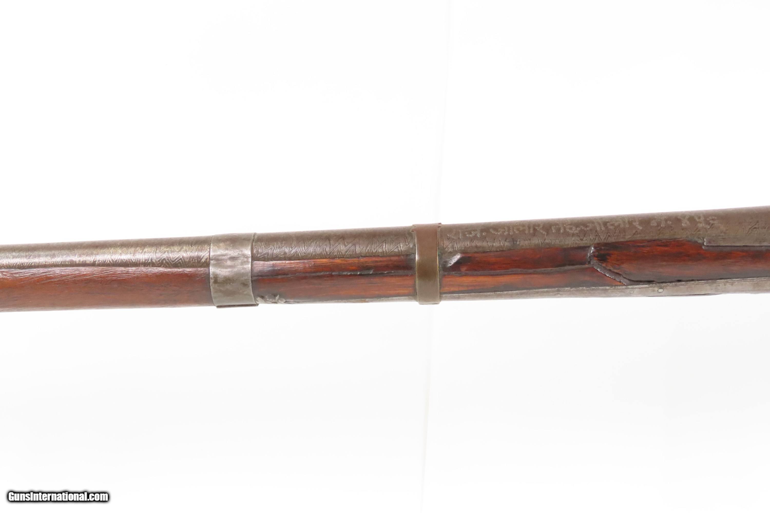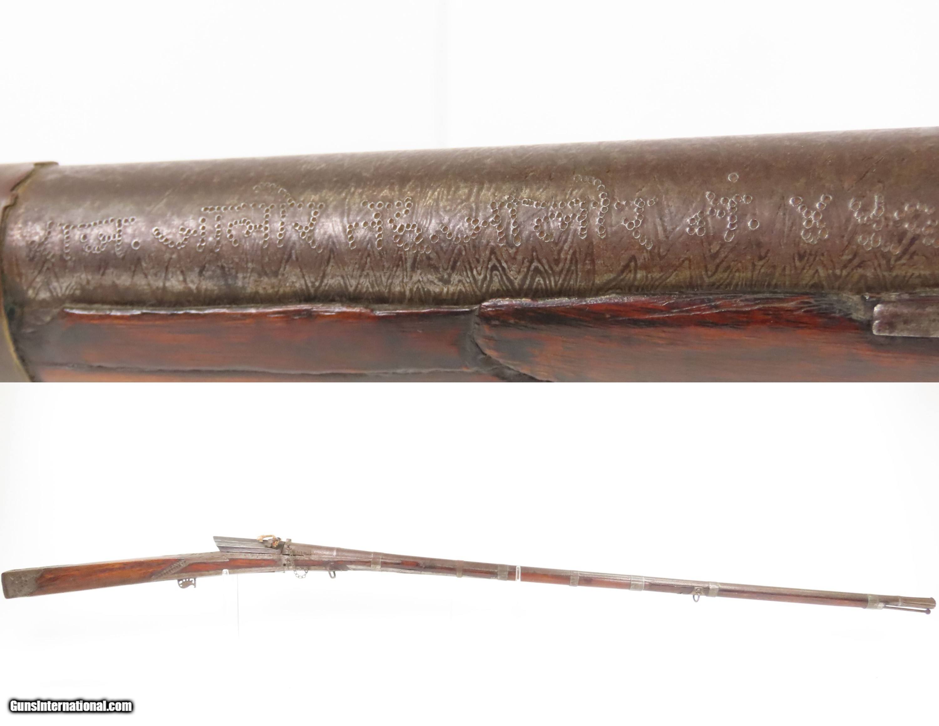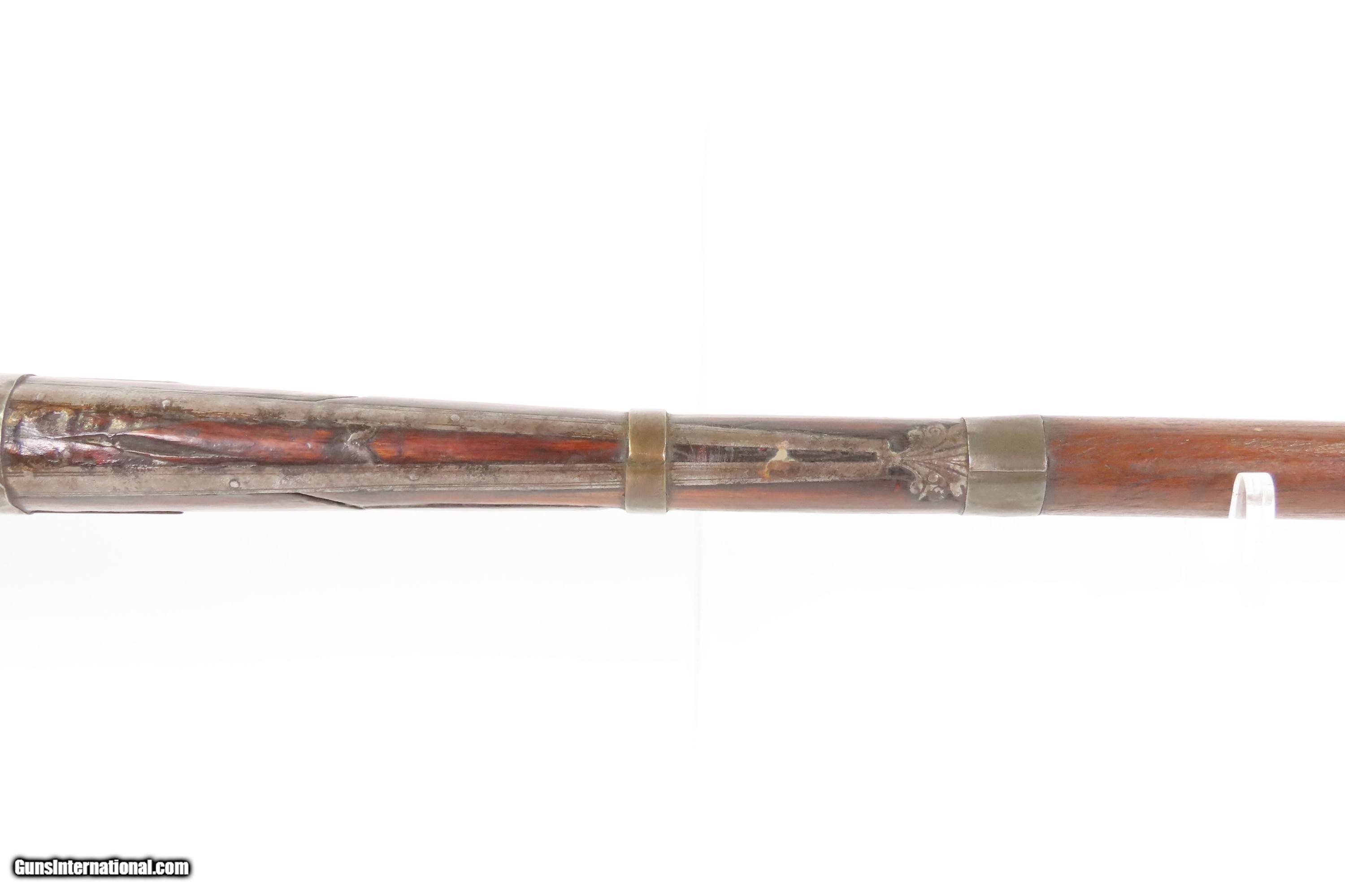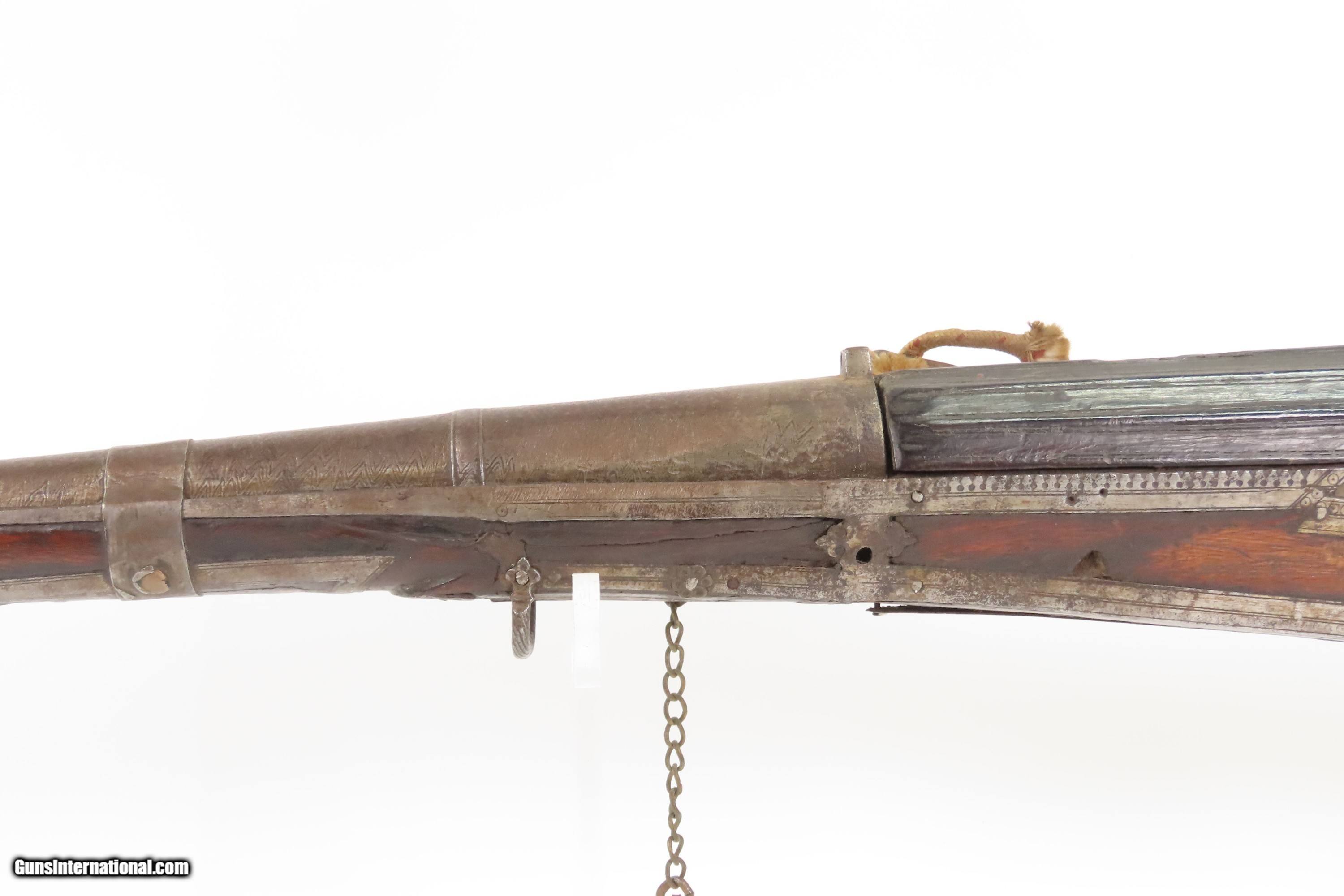 Description: MASSIVE 1700s Antique Northern India TORADAR MATCHLOCK Musket HAND CANNON MUGHAL EMPIRE Indian with LONG 47-3/8 Inch Barrel Here Ancestry Guns presents an antique Indian Toradar Matchlock Musket, made circa the 18th century in India. They were found mostly in the Mughal-influenced Northern and Central India. Emperor Akbar the Great was the Mughal ruler during the late half of the 16th Century. He was known for his many accomplishments, among which was the expansion of his empire. He was a great leader and military commander, but he also benefitted by adopting and developing firearms technology. Production and use of matchlock firearms greatly increased under his guidance, giving him an enormous advantage over those he would conquer. The Mughal Empire would finally succumb to the British in 1858. The matchlock would see its apex from the late 16th Century to about the early 1800s. The gun is a type of smoothbore firearm used in the 16th through 18th centuries by defending forces to break the advance of enemy troops. Essentially, it was a scaled-up version of the army's standard infantry musket, but with a bore of up to one-inch (25.4 mm) caliber. These weapons filled a gap in firepower between the musket and the lightest artillery pieces, such as the swivel gun. This sort of weapon may also be found described as an amusette, rampart gun, or Hackbut, a name originally given to early medieval hand cannon. Original dark patinas. Splitting is present in front of the trigger tang, behind the wrist, a cut at the third barrel band from the front, and a repair in front of the rear barrel band. The action functions. Markings are discernable. Darkened bore, remains good. A barrel band or two are loose. Own the original! This is a legitimate antique and not a reproduction. Barrel is 47-3/8 inches. Caliber: .55 Matchlock Overall condition as seen in photos. Very Fast. Very Safe. FREE SHIPPING WORLDWIDE. Delivered directly to your door by express mail! Guaranteed AUTHENTIC & Includes CERTIFICATE OF AUTHENTICITY. $2200 #259396 Antique: Yes Price: $2,200.00 Buy Now Pay with