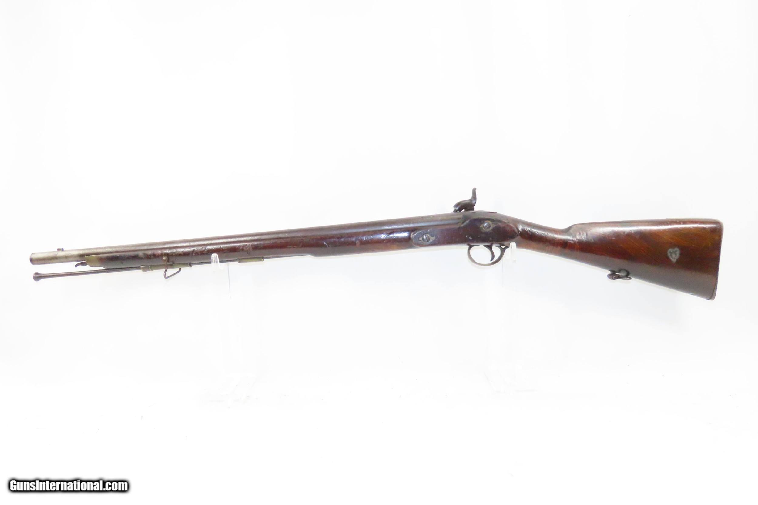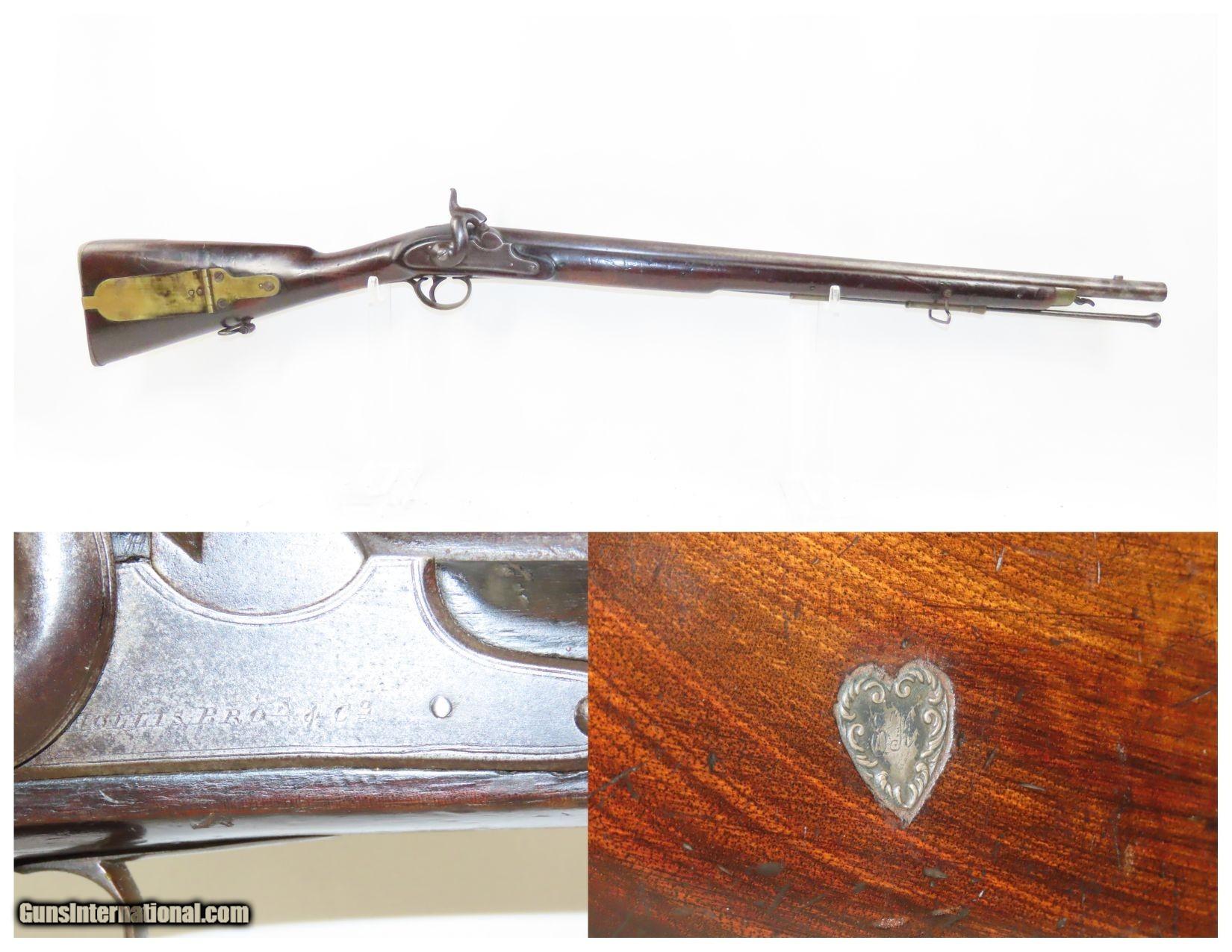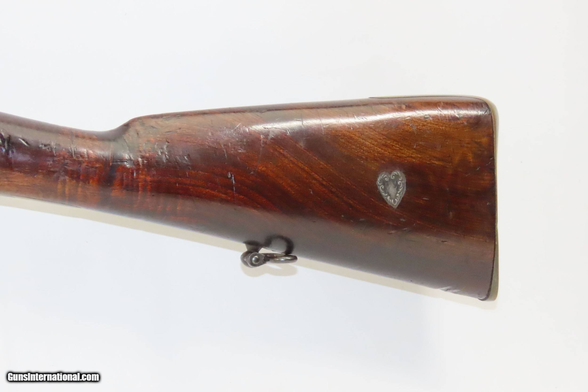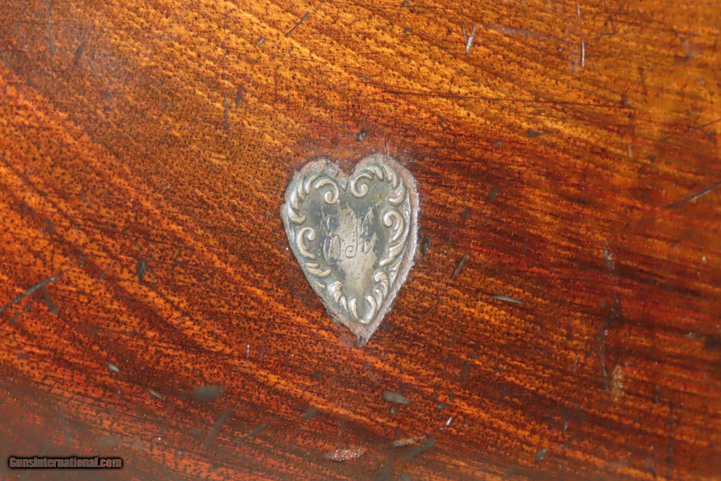Description: Mid-1800s Antique HOLLIS BROS. & CO. British .65 Caliber PERCUSSION Carbine London Made Rifle from the mid-19th Century Here we present an antique Hollis Bros. & Co. Percussion Carbine made between 1845 to 1848 in London, England. Hollis Brothers & Company started out in the first half of the 19th century in London, England with the name “Hollis Brothers”. The brothers were Isaac Hollis and Frederick Hollis, with Frederick passing away in 1839. It continued under that trade name until 1845 when it was re-named “Hollis Brothers & Co. which continued until 1848, when it became “Hollis & Sons”. The latter became known as a supplier of pistols and shotguns, and also produced muskets for the North American Indian trade. The overall condition is very good. Nice patina. Strong action. Good bore for its age. The stock is solid with and average amount of wear. A unique heart-shaped medallion is embedded on the left buttstock and is hand marked, appearing to read “EK”. Birmingham proofs. Own the original! This is a legitimate antique and not a reproduction. Barrel is 26-3/4 inches. Caliber: .64 percussion Overall condition as seen in photos. Very Fast. Very Safe. FREE SHIPPING WORLDWIDE. Delivered directly to your door by express mail! Guaranteed AUTHENTIC & Includes CERTIFICATE OF AUTHENTICITY. ancestryguns $1900 #220336 SOLD Antique: Yes |
