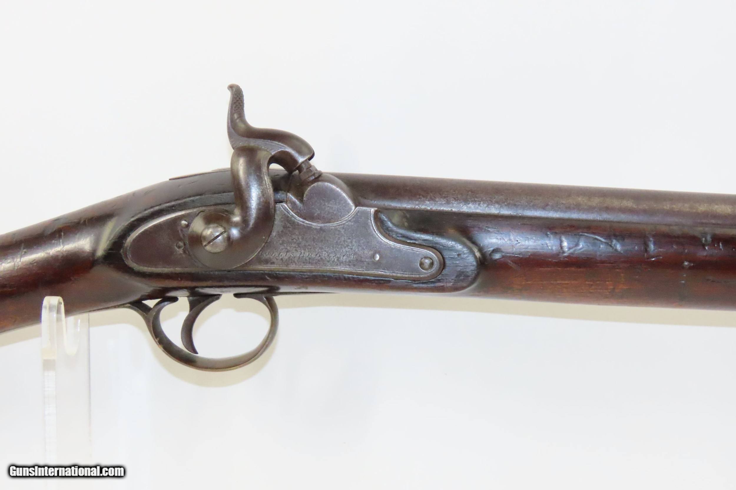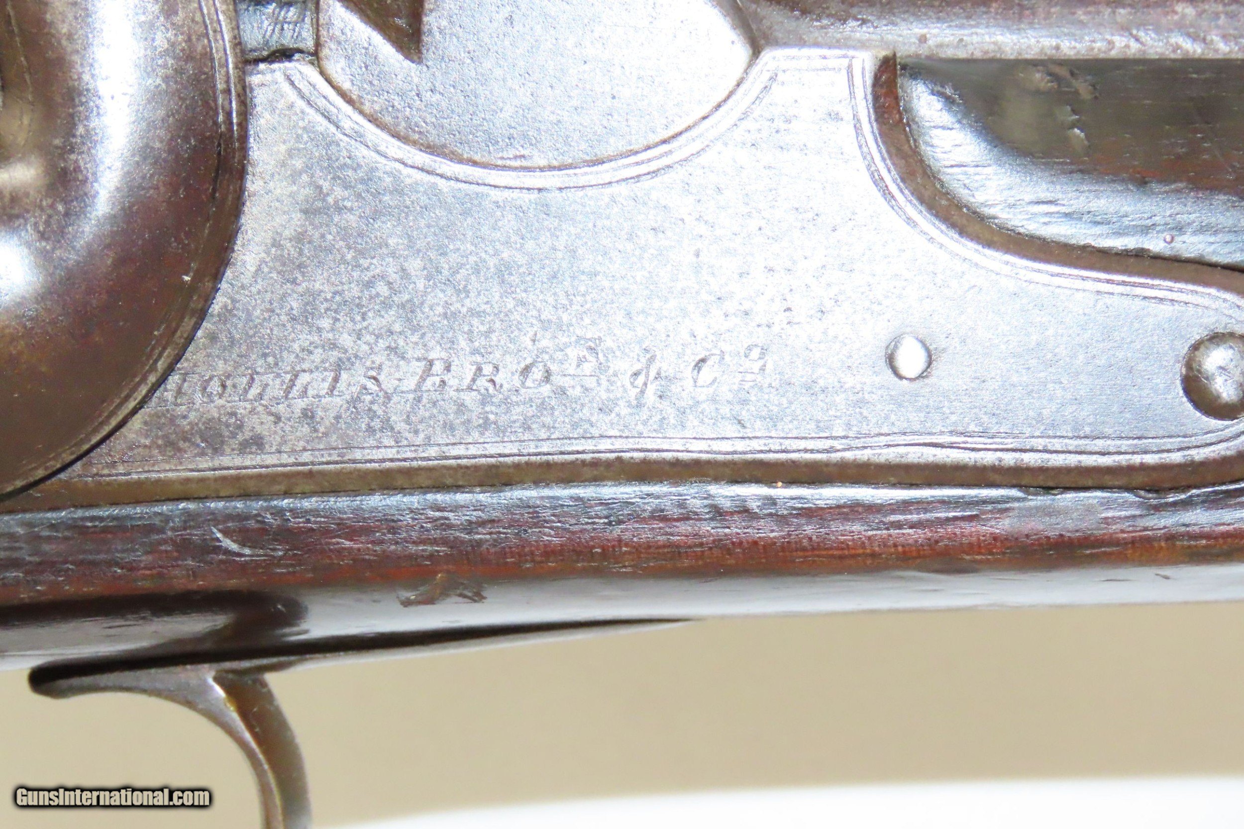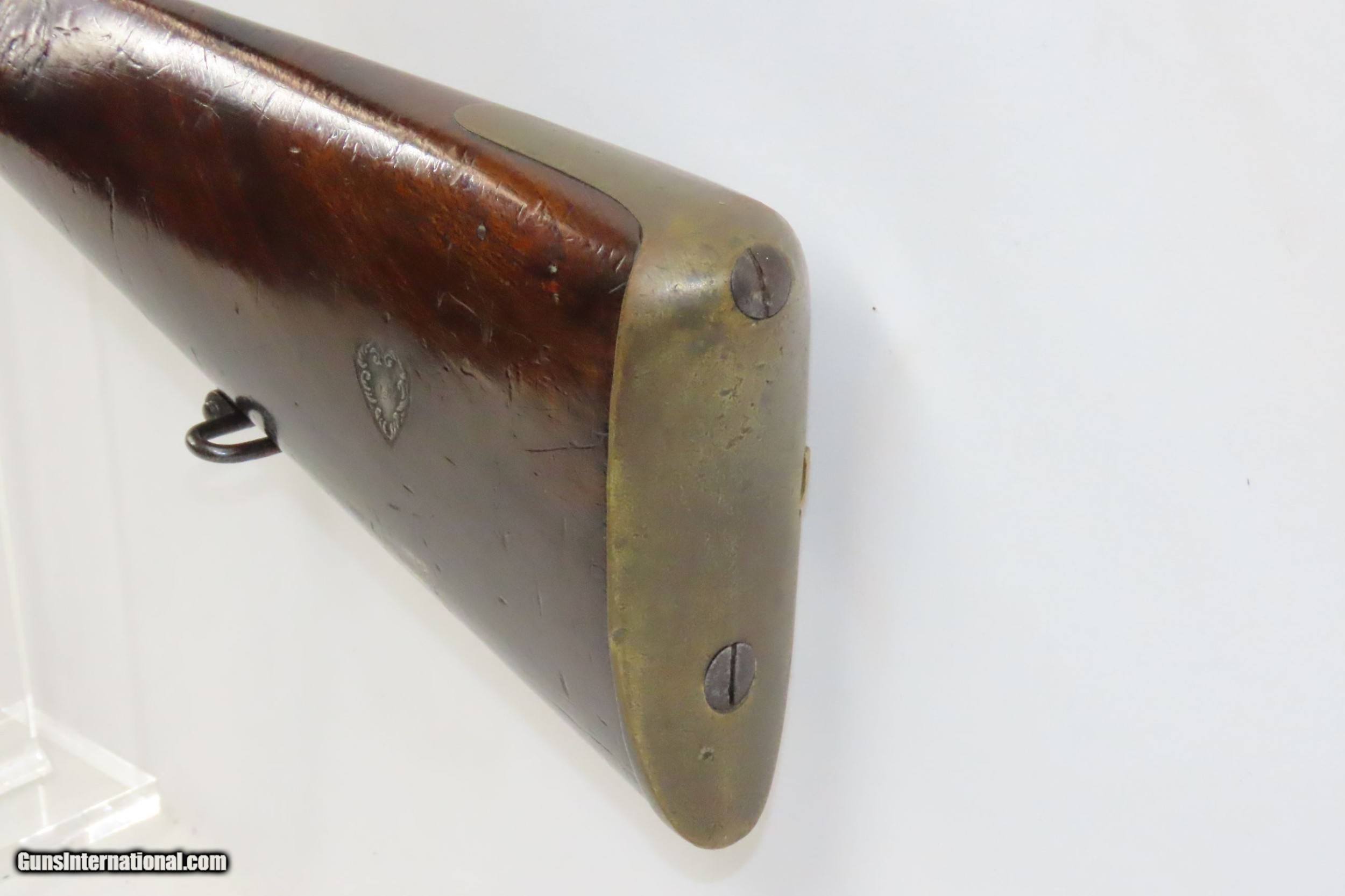 Description: Mid-1800s Antique HOLLIS BROS. & CO. British .65 Caliber PERCUSSION Carbine London Made Rifle from the mid-19th Century Here we present an antique Hollis Bros. & Co. Percussion Carbine made between 1845 to 1848 in London, England. Hollis Brothers & Company started out in the first half of the 19th century in London, England with the name “Hollis Brothers”. The brothers were Isaac Hollis and Frederick Hollis, with Frederick passing away in 1839. It continued under that trade name until 1845 when it was re-named “Hollis Brothers & Co. which continued until 1848, when it became “Hollis & Sons”. The latter became known as a supplier of pistols and shotguns, and also produced muskets for the North American Indian trade. The overall condition is very good. Nice patina. Strong action. Good bore for its age. The stock is solid with and average amount of wear. A unique heart-shaped medallion is embedded on the left buttstock and is hand marked, appearing to read “EK”. Birmingham proofs. Own the original! This is a legitimate antique and not a reproduction. Barrel is 26-3/4 inches. Caliber: .64 percussion Overall condition as seen in photos. Very Fast. Very Safe. FREE SHIPPING WORLDWIDE. Delivered directly to your door by express mail! Guaranteed AUTHENTIC & Includes CERTIFICATE OF AUTHENTICITY. ancestryguns $1900 #220336 SOLD Antique: Yes |