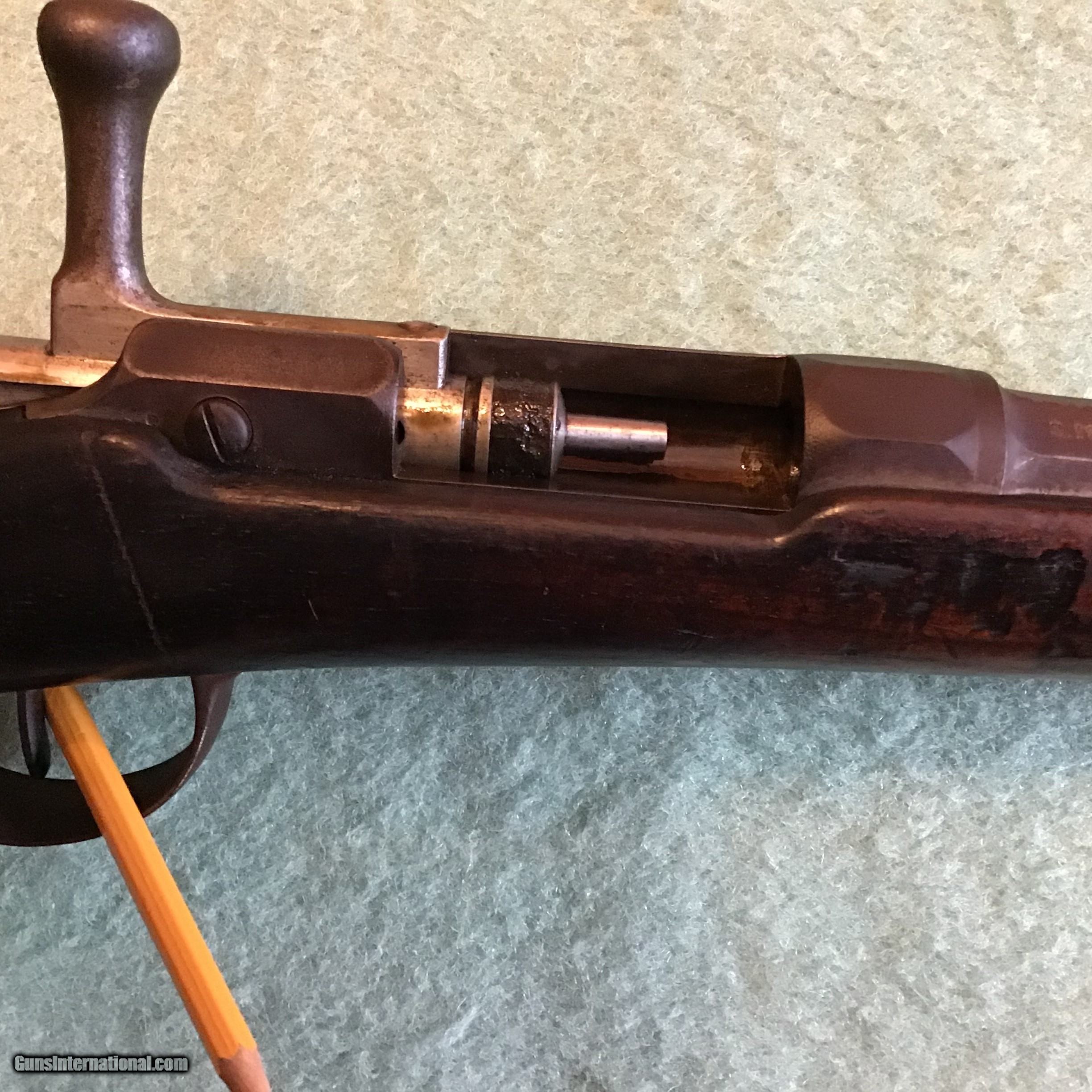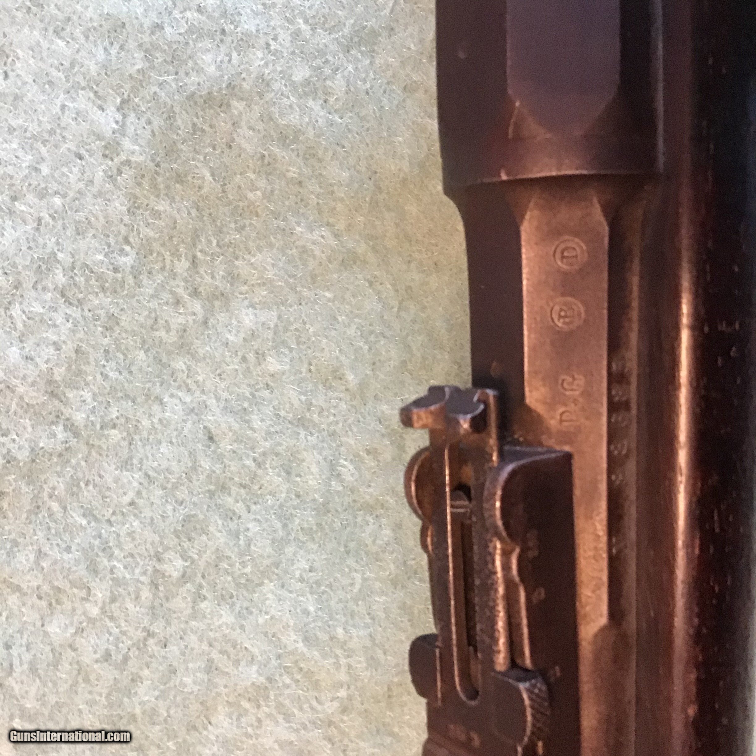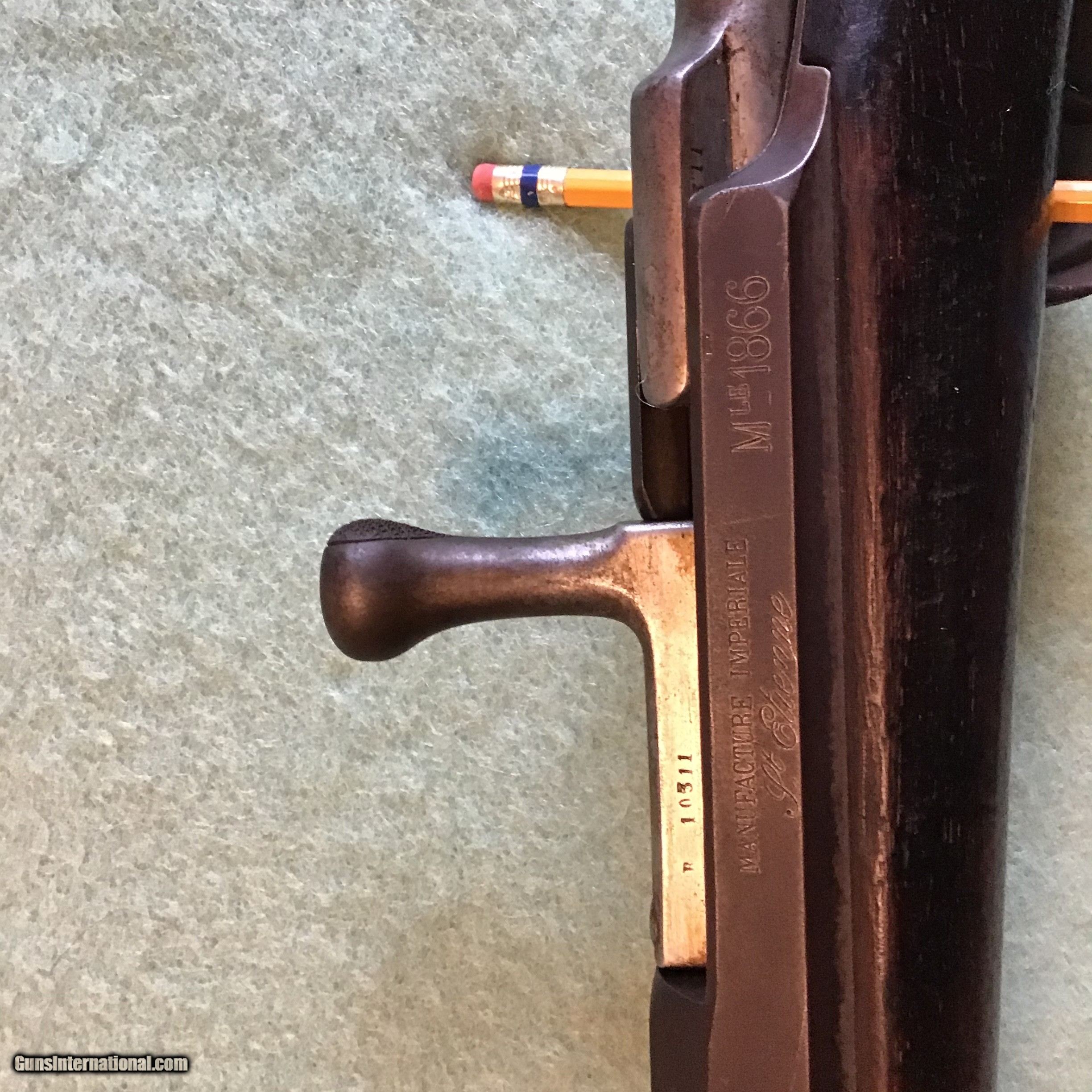 Description: French 11 mm 1866 chassepote bolt action needle gun, paper cartridge as used in the Franco Prussian war. Stock is un sanded and dark with some dings as would be expected and correct cartoches and other military markings. Barrel date 1869 as well as cartouche. Metal parts have turned brown. Bore has good rifeling and some pitting. Bolt number doesn't match the other numbers. Action functions as it should. Feel free to call with any questions 218 839 9272. ON HOLD Sale pending SOLD Antique: Yes Manufacturer: chassepot manufacturer St. Etienne Model: MLE 1866 Serial Number: 88683 Caliber Info: 11 mm Bore: Fair Condition: Good Metal Condition: Good Wood Condition: Good Bore Condition: Fair |