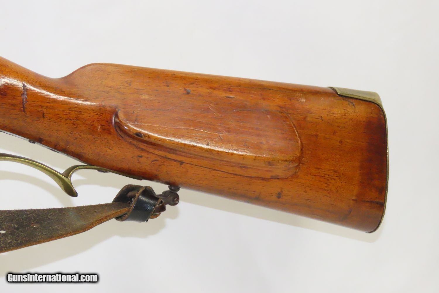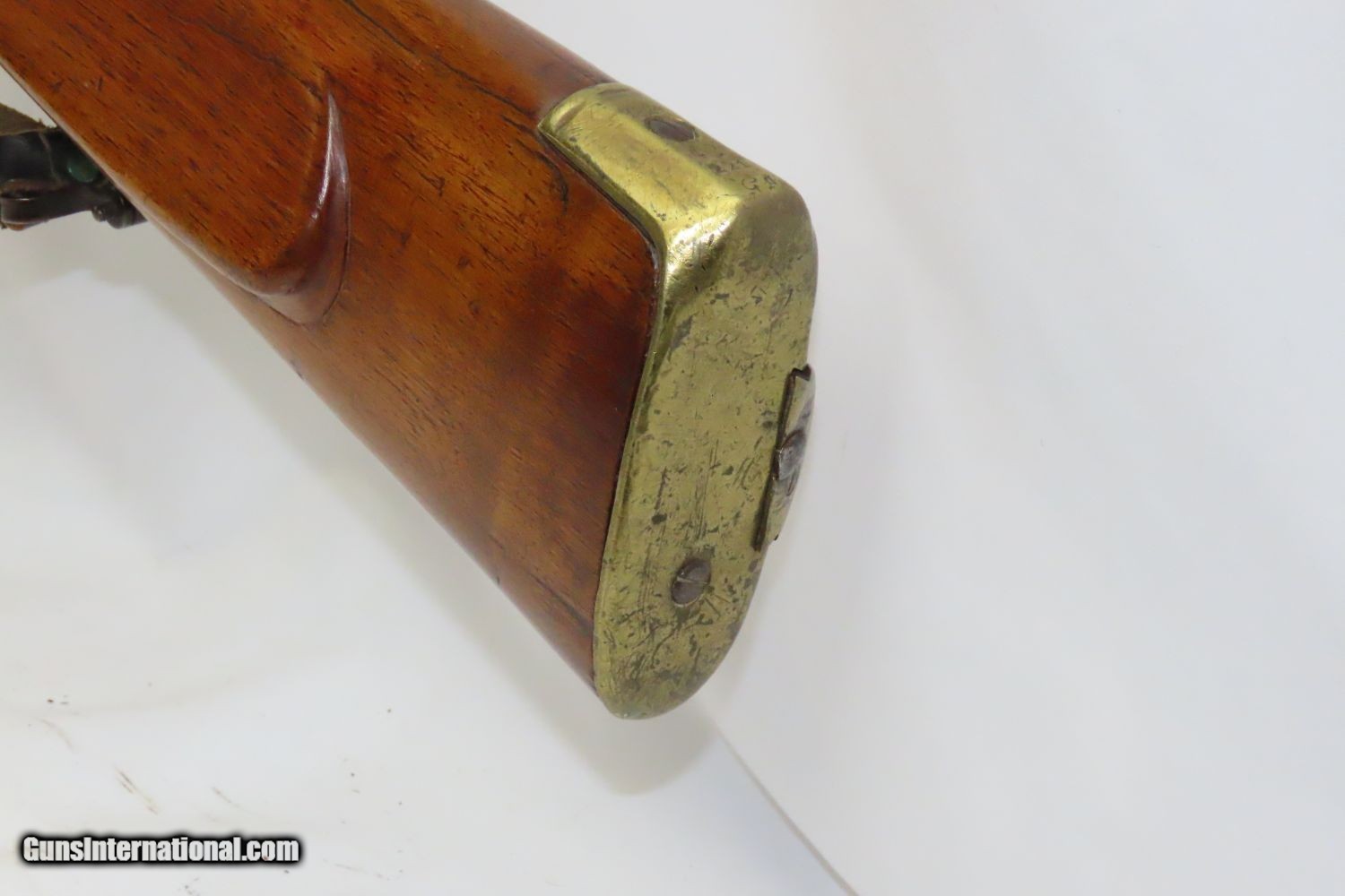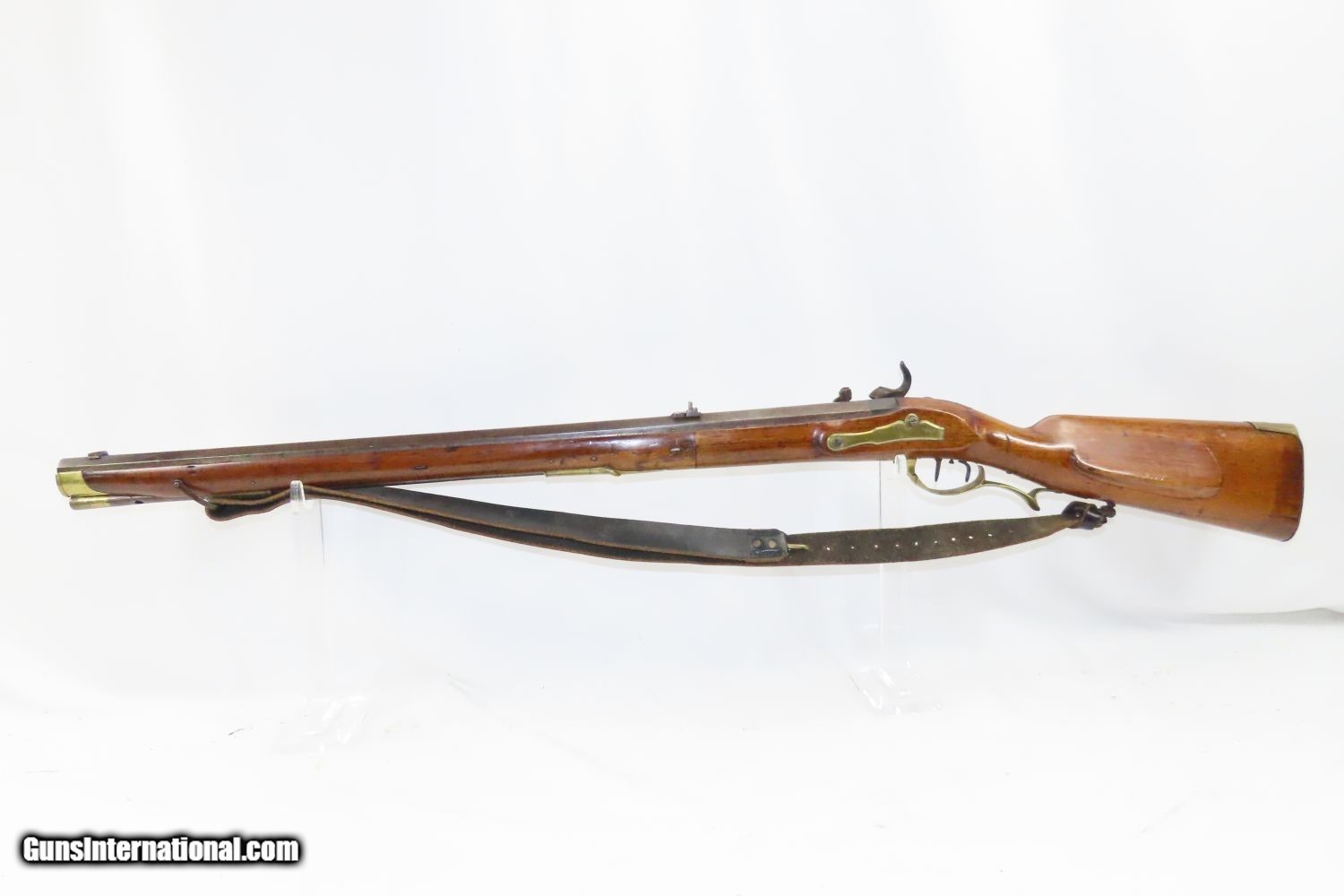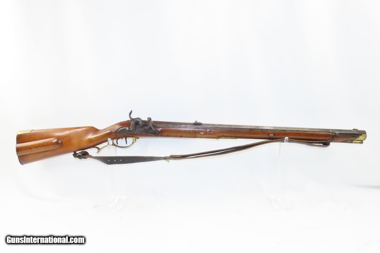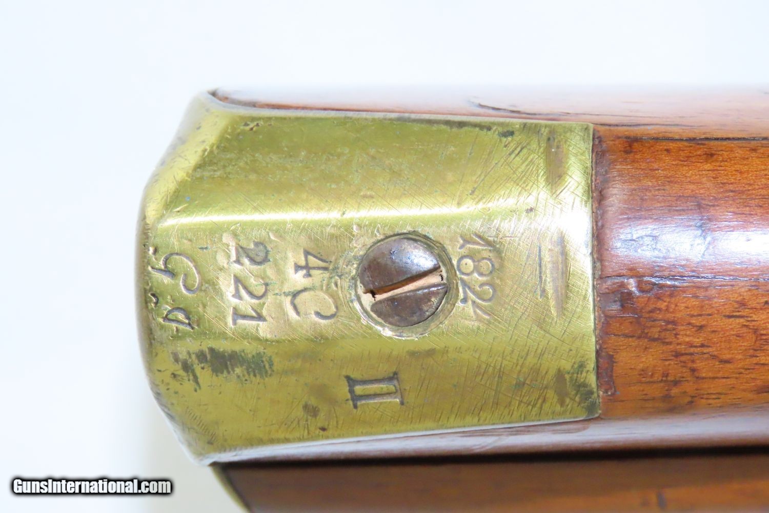 Description: PRUSSIAN JAGERBUSCHSE GERMANIC INFANTRY JAEGER RIFLE .58 Percussion Antique 1810/1835 Flintlock/Percussion Conversion Here we present an antique Prussian Jaeger Rifle 1810/1835, manufactured circa the 1820s in flintlock, then converted to percussion. This scarce Prussian Model 1835 Jäegerbüchse held the distinction of the being the first percussion ignition long arm adopted by the Prussian military. The Prussians began to experiment with the percussion ignition systems for military arms in 1831, and officially adopted the percussion system for all arms in 1839. During that time, experimental and trial arms were issued to specialized regiments and battalions, while the feasibility and the reliability of the new ignition system was tested. The first widespread issue of percussion arms came with the Model 1835 Rifle, which was issued to the “Jäeger” or “Rifle” battalions. The Prussian Model 1835 Percussion Rifle was adapted from the earlier Prussian Model 1810 Flintlock Rifle. The Model 1810 was one of the first, fairly standardized rifles to see widespread issue to any military force in Europe. These guns were fully stocked to the muzzle, incorporated a sliding wooden patch box in the obverse buttstock for the storage of lubricated patches and a raised cheek piece on the reverse buttstock. The rifles were brass mounted with a buttplate, nose cap and two ramrod pipes made of that material. Sling swivels were installed on the upper stock, below the bayonet bar, and screwed into the toe of the stock. The rifles were equipped with adjustable double-set triggers to enhance accurate shooting. This musket would have been used in Prussian conflicts during the 1840s and 50s, including the Egyptian-Ottoman War, the Greater Poland Uprising, the Revolutions of 1848, and the First Schleswig War. This one has matching unit markings on both the breech of the barrel and the butt plate: “4C/221”. There is also a date of “1824” on the butt plate, the numeral “II”, and initials that may be a “GS” (possibly for Gebruder Schlickler of the Potsdam Arnsenal). There is also a date of “1834” on the right side of the barrel just forward of the lock. The overall condition is good. The action is functional, though the half-cock notch is too worn to hold. The lock screws are replacements that do hold the lock on but they could be better. Nicely rifled bore. The stock is solid, though there is a joint about midway where the two parts were spliced together. The leather sling is in good shape. Own the original! This is a legitimate antique and not a reproduction. Barrel is 27-3/4 inches. Caliber: .58 Percussion Overall condition as seen in photos. Very Fast. Very Safe. FREE SHIPPING WORLDWIDE. Delivered directly to your door by express mail! Guaranteed AUTHENTIC & Includes CERTIFICATE OF AUTHENTICITY. ancestryguns $1835 #210169 SOLD Antique: Yes |
