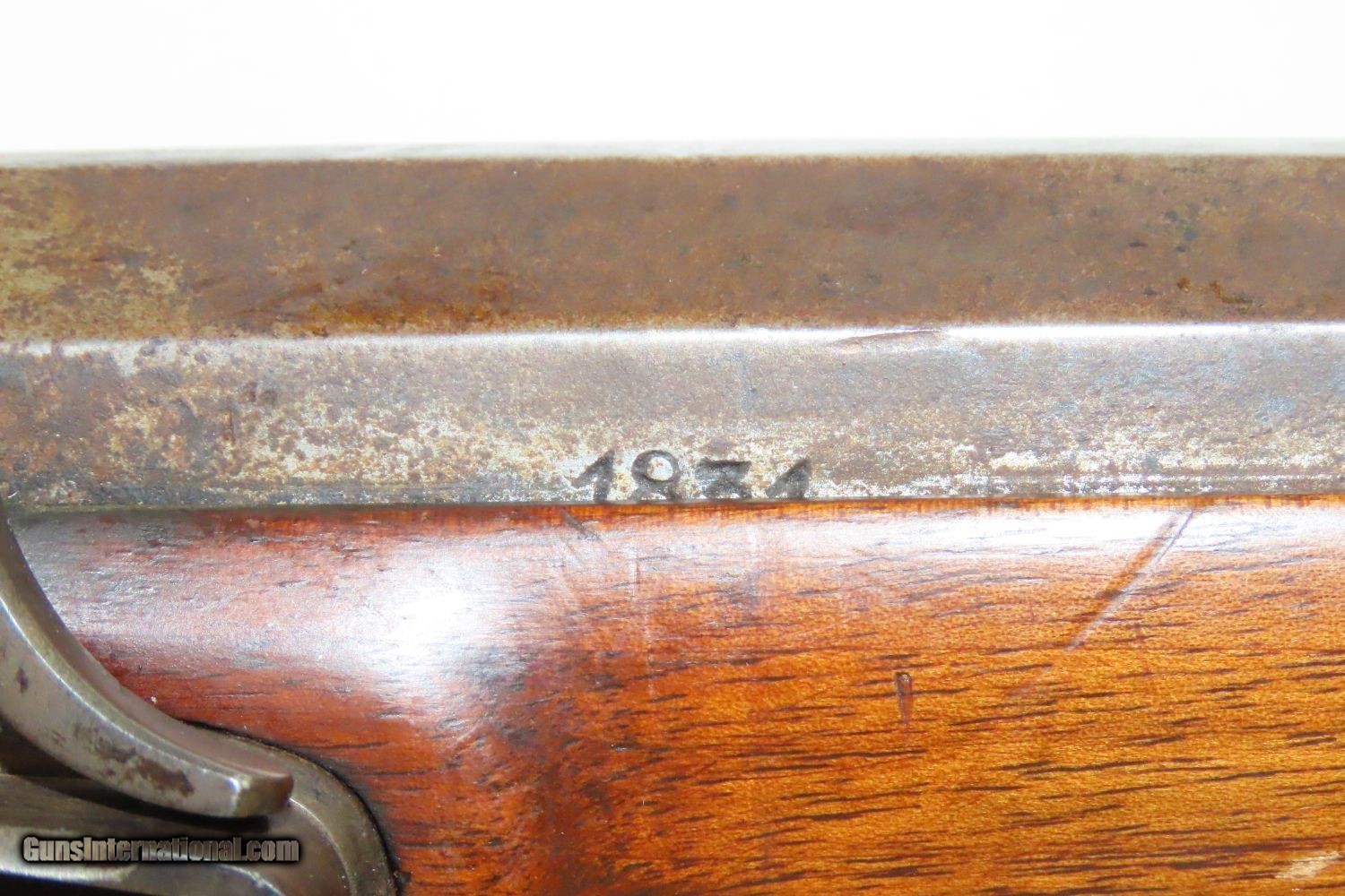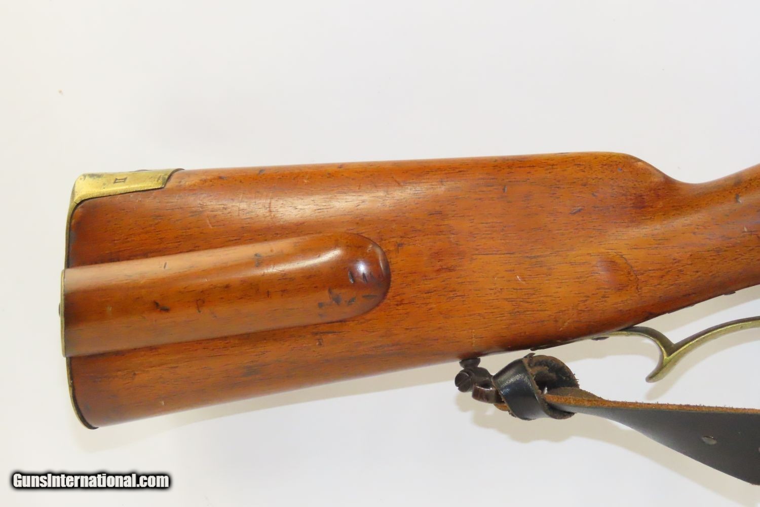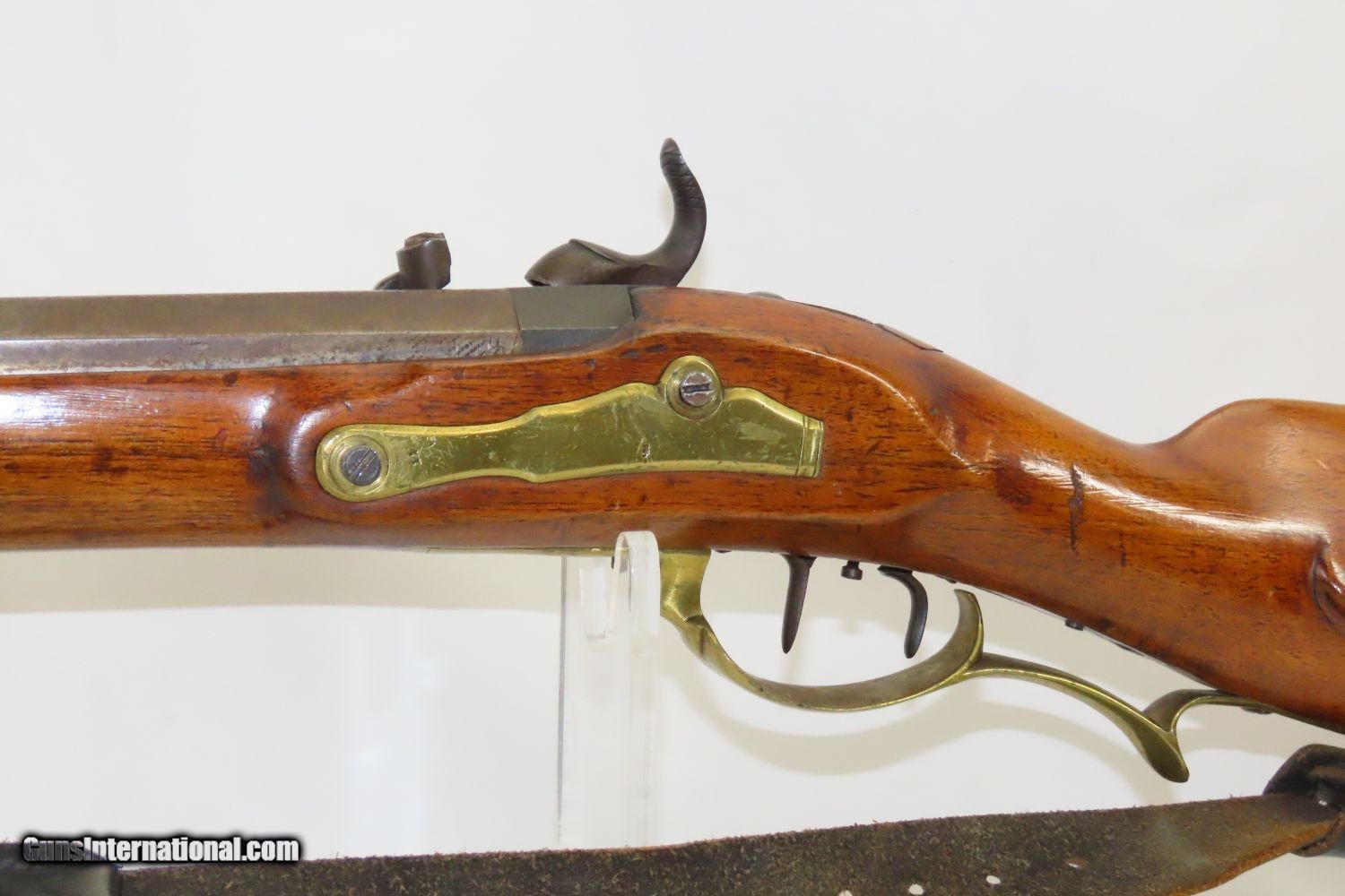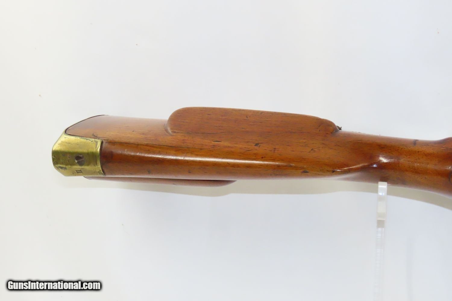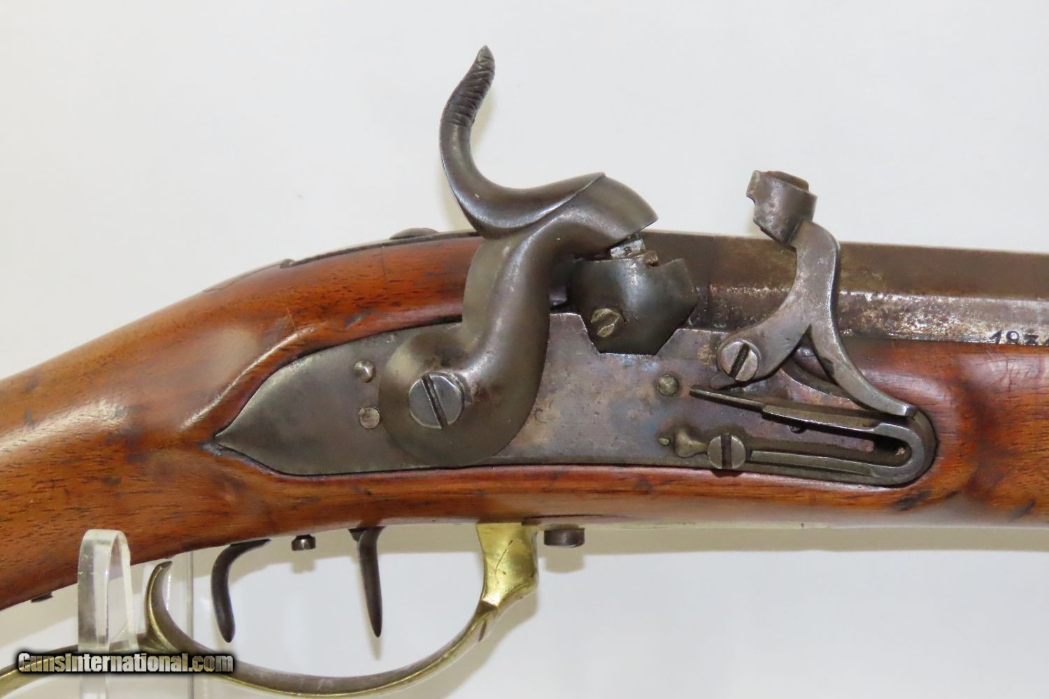 Description: PRUSSIAN JAGERBUSCHSE GERMANIC INFANTRY JAEGER RIFLE .58 Percussion Antique 1810/1835 Flintlock/Percussion Conversion Here we present an antique Prussian Jaeger Rifle 1810/1835, manufactured circa the 1820s in flintlock, then converted to percussion. This scarce Prussian Model 1835 Jäegerbüchse held the distinction of the being the first percussion ignition long arm adopted by the Prussian military. The Prussians began to experiment with the percussion ignition systems for military arms in 1831, and officially adopted the percussion system for all arms in 1839. During that time, experimental and trial arms were issued to specialized regiments and battalions, while the feasibility and the reliability of the new ignition system was tested. The first widespread issue of percussion arms came with the Model 1835 Rifle, which was issued to the “Jäeger” or “Rifle” battalions. The Prussian Model 1835 Percussion Rifle was adapted from the earlier Prussian Model 1810 Flintlock Rifle. The Model 1810 was one of the first, fairly standardized rifles to see widespread issue to any military force in Europe. These guns were fully stocked to the muzzle, incorporated a sliding wooden patch box in the obverse buttstock for the storage of lubricated patches and a raised cheek piece on the reverse buttstock. The rifles were brass mounted with a buttplate, nose cap and two ramrod pipes made of that material. Sling swivels were installed on the upper stock, below the bayonet bar, and screwed into the toe of the stock. The rifles were equipped with adjustable double-set triggers to enhance accurate shooting. This musket would have been used in Prussian conflicts during the 1840s and 50s, including the Egyptian-Ottoman War, the Greater Poland Uprising, the Revolutions of 1848, and the First Schleswig War. This one has matching unit markings on both the breech of the barrel and the butt plate: “4C/221”. There is also a date of “1824” on the butt plate, the numeral “II”, and initials that may be a “GS” (possibly for Gebruder Schlickler of the Potsdam Arnsenal). There is also a date of “1834” on the right side of the barrel just forward of the lock. The overall condition is good. The action is functional, though the half-cock notch is too worn to hold. The lock screws are replacements that do hold the lock on but they could be better. Nicely rifled bore. The stock is solid, though there is a joint about midway where the two parts were spliced together. The leather sling is in good shape. Own the original! This is a legitimate antique and not a reproduction. Barrel is 27-3/4 inches. Caliber: .58 Percussion Overall condition as seen in photos. Very Fast. Very Safe. FREE SHIPPING WORLDWIDE. Delivered directly to your door by express mail! Guaranteed AUTHENTIC & Includes CERTIFICATE OF AUTHENTICITY. ancestryguns $1835 #210169 SOLD Antique: Yes |