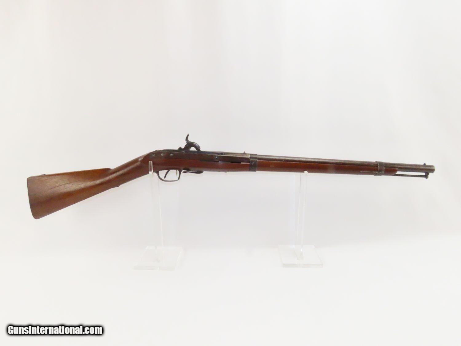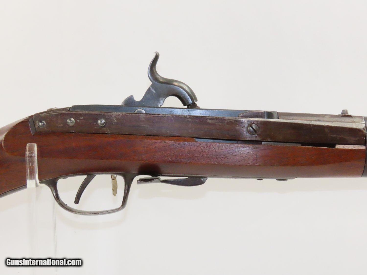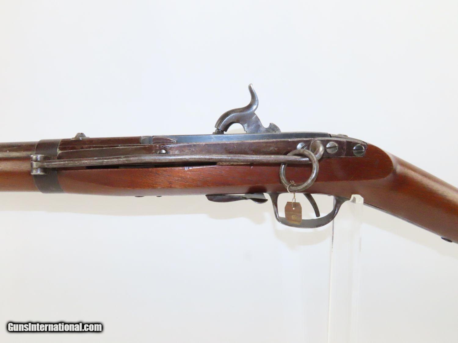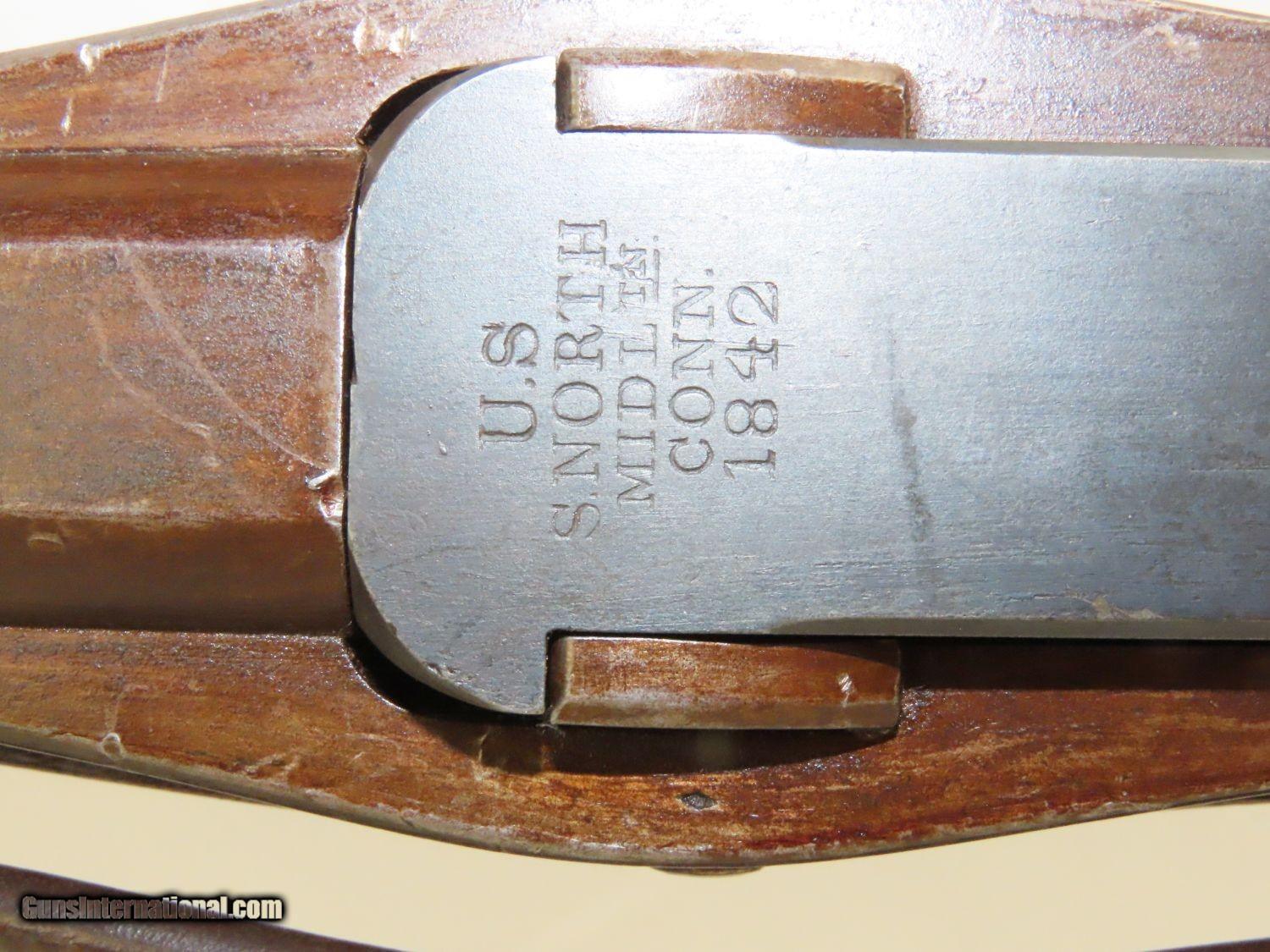 Description: RARE Antique SIMEON NORTH US Model 1840 HALL Breech Loading CAVALRY CARBINE 1 of 6,001! Fantastic Condition! Here we present an antique U.S. Model 1840 Side Lever Breech Loading Carbine from the Simeon North Contract, made circa 1842 in Middletown, Connecticut. A native of Berlin, Connecticut, Simeon North was one of the most influential arms makers of the early republic beginning with manufacturing the first U.S. martial pistols in 1799 (the North-& Cheney Model 1799s) and finally ending with the Model 1843 Hall carbines right up to his death in 1852. He was influential in developing the first milling machines and also helped establish truly interchangeable parts on U.S. martial arms. He manufactured 6,501 of these Model 1840 Hall carbines in 1840 through 1843. 6,001 of them, including this one, were the standard Type II with the distinctive "fishtail" shaped breech lever. It is dated "1842" on the breech and has standard sights and markings. North was better known for the rifles that he produced. In 1823, he won a government contract in which he supplied the army with standard breech-loading rifles. These initially were flintlock arms, but in 1843 North submitted a new design for governmental approval. His revamped model was christened "North's Improvement" for its improved method of working the breech mechanism. Until then, breech-loading rifles were flawed with loose seams between the chamber and the barrel, causing flames to spurt out the back and losing some velocity because of this gas leakage. North's design made the breech mechanism fit more closely to the barrel, thus reducing the loss of velocity. His adaptation of the Hall percussion breechloader was a success with the army, and he continued filling orders until his death in 1852. This carbine was made in 1842 and would have been in use during the Mexican-American War and throughout the American Civil War. This one features the “fish-tail” breech lever, the sling ring bar on the left side, and a .52 caliber rifled bore. “JCB” is stamped on the left side of the stock and on the barrel. The breech is marked “U.S/S.NORTH/MIDLTN/CONN./1842”. The overall condition is near fine. Original brown lacquer finish on the steel parts. Smooth stock with clear markings. The action is excellent. The bore is in great shape with sharp rifling and still reflective surfaces. A fantastic example of a scarce US cavalry carbine! Own the original! This is a legitimate antique and not a reproduction. Barrel is 21-1/8 inches. Caliber: .52 Percussion Overall condition as seen in photos. Very Fast. Very Safe. FREE SHIPPING WORLDWIDE. Delivered directly to your door by express mail! Guaranteed AUTHENTIC & Includes CERTIFICATE OF AUTHENTICITY. ancestryguns $3650 #20169 SOLD Antique: Yes |