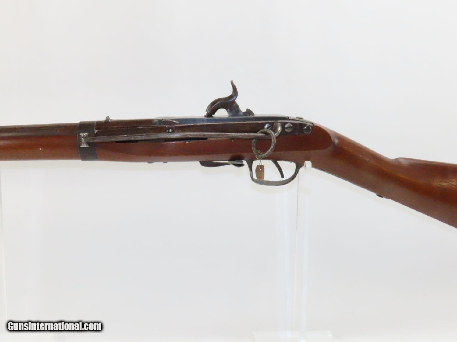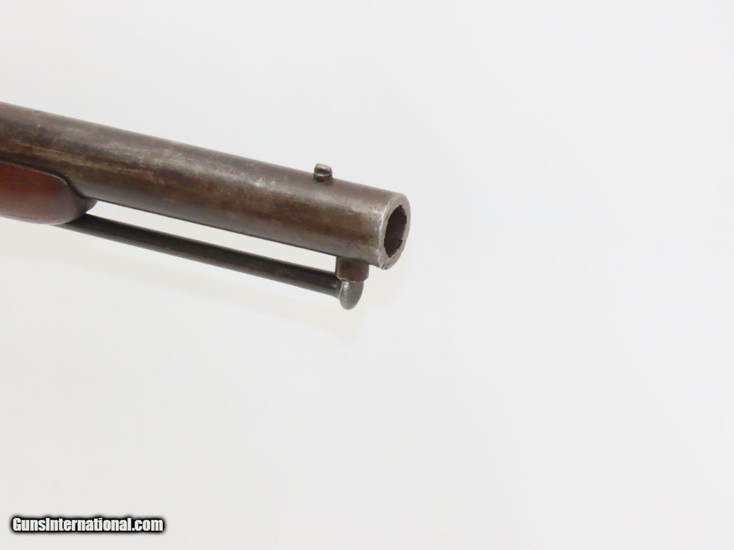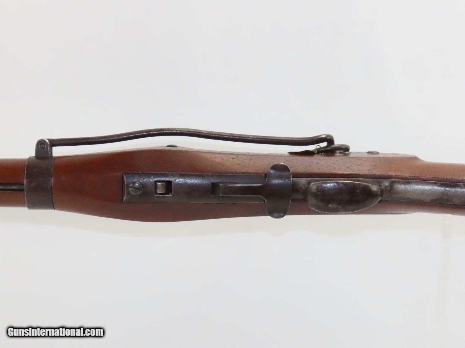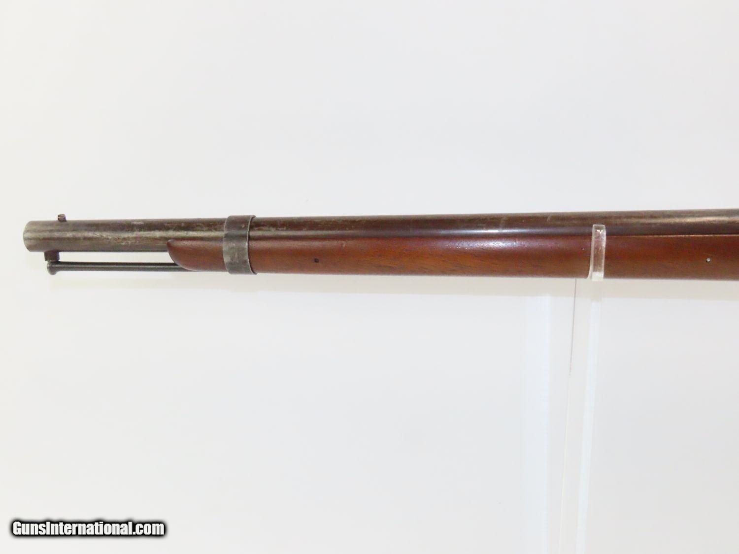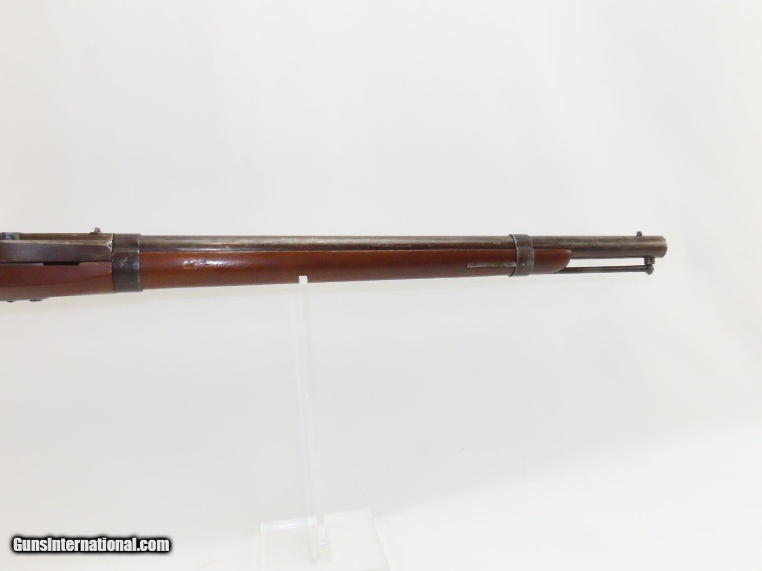 Description: RARE Antique SIMEON NORTH US Model 1840 HALL Breech Loading CAVALRY CARBINE 1 of 6,001! Fantastic Condition! Here we present an antique U.S. Model 1840 Side Lever Breech Loading Carbine from the Simeon North Contract, made circa 1842 in Middletown, Connecticut. A native of Berlin, Connecticut, Simeon North was one of the most influential arms makers of the early republic beginning with manufacturing the first U.S. martial pistols in 1799 (the North-& Cheney Model 1799s) and finally ending with the Model 1843 Hall carbines right up to his death in 1852. He was influential in developing the first milling machines and also helped establish truly interchangeable parts on U.S. martial arms. He manufactured 6,501 of these Model 1840 Hall carbines in 1840 through 1843. 6,001 of them, including this one, were the standard Type II with the distinctive "fishtail" shaped breech lever. It is dated "1842" on the breech and has standard sights and markings. North was better known for the rifles that he produced. In 1823, he won a government contract in which he supplied the army with standard breech-loading rifles. These initially were flintlock arms, but in 1843 North submitted a new design for governmental approval. His revamped model was christened "North's Improvement" for its improved method of working the breech mechanism. Until then, breech-loading rifles were flawed with loose seams between the chamber and the barrel, causing flames to spurt out the back and losing some velocity because of this gas leakage. North's design made the breech mechanism fit more closely to the barrel, thus reducing the loss of velocity. His adaptation of the Hall percussion breechloader was a success with the army, and he continued filling orders until his death in 1852. This carbine was made in 1842 and would have been in use during the Mexican-American War and throughout the American Civil War. This one features the “fish-tail” breech lever, the sling ring bar on the left side, and a .52 caliber rifled bore. “JCB” is stamped on the left side of the stock and on the barrel. The breech is marked “U.S/S.NORTH/MIDLTN/CONN./1842”. The overall condition is near fine. Original brown lacquer finish on the steel parts. Smooth stock with clear markings. The action is excellent. The bore is in great shape with sharp rifling and still reflective surfaces. A fantastic example of a scarce US cavalry carbine! Own the original! This is a legitimate antique and not a reproduction. Barrel is 21-1/8 inches. Caliber: .52 Percussion Overall condition as seen in photos. Very Fast. Very Safe. FREE SHIPPING WORLDWIDE. Delivered directly to your door by express mail! Guaranteed AUTHENTIC & Includes CERTIFICATE OF AUTHENTICITY. ancestryguns $3650 #20169 SOLD Antique: Yes |