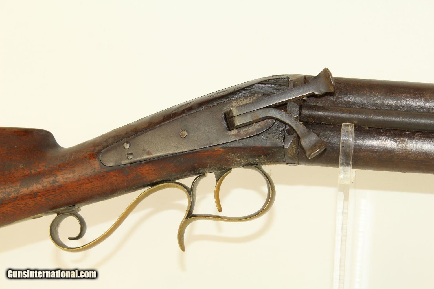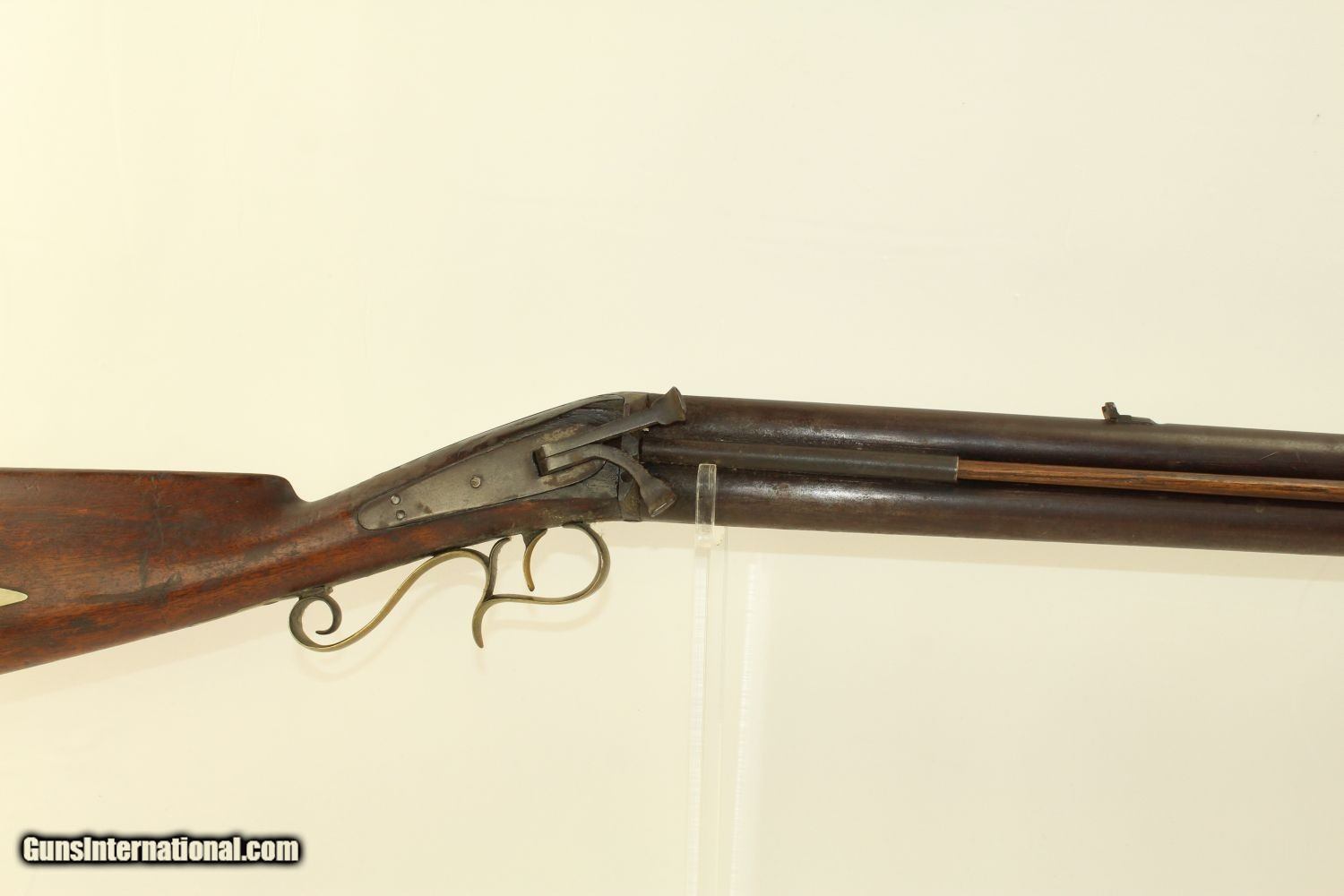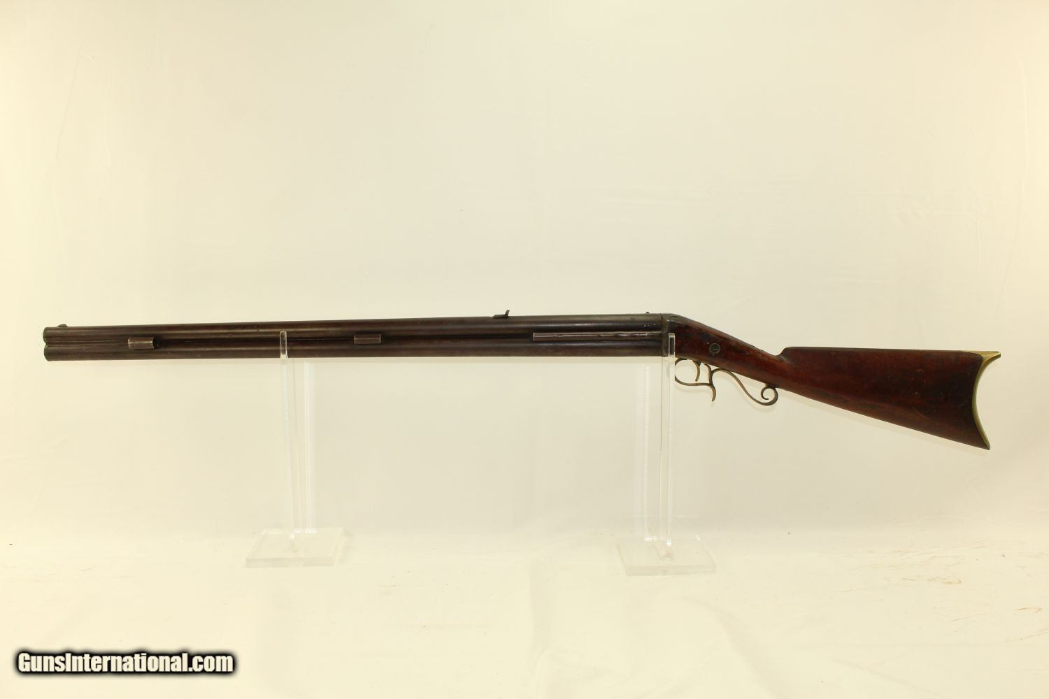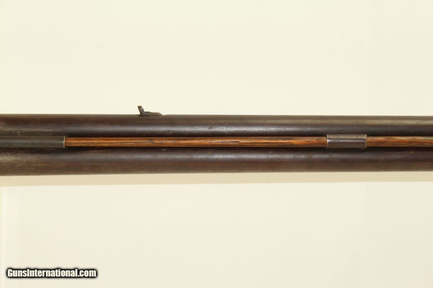 Description: RARE Mule Ear Percussion COMBINATION RIFLE/SHOTGUN Scarce Early 1800s American Design Here we present an antique Mule Ear percussion combination rifle/shotgun made circa the mid-1830s. This is a very interesting American design that originated in the 1820s and continued through the mid-1800s. This is a percussion rifle and shotgun combination that is fired by the two independent percussion hammers on the right side of the firearm. These were very popular in the northeast and upper New York. It was great for the field when hunting, offering the hunter an appropriate load for whatever game he might come across, whether feathered or furry, and a fast follow up shot never hurts. This combination gun is relatively short and handy. The top bore is rifled and .41 caliber while the lower bore is smooth and .69 caliber. Rifle sights. One trigger works both hammers. German silver patchbox with brass trigger guard and butt plate. The overall condition is very good. The bores are in great shape, the bottom smooth and the top well-rifled. The action is strong. The trigger return spring is a little weak but overcome with by simply helping the trigger forward. Own the original! This is a legitimate antique and not a reproduction. Barrels are 29 inches. Caliber: .41 Percussion Rifle, .69 Percussion Shotgun Overall condition as seen in photos. Very Fast. Very Safe. FREE SHIPPING WORLDWIDE. Delivered directly to your door by express mail! Guaranteed AUTHENTIC & Includes CERTIFICATE OF AUTHENTICITY. ancestryguns $1650 #190205 SOLD Antique: Yes |