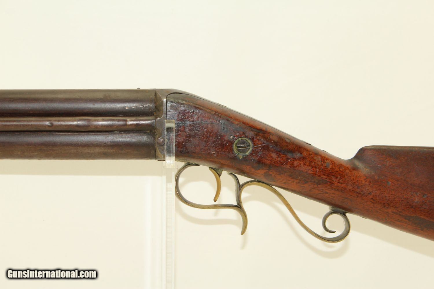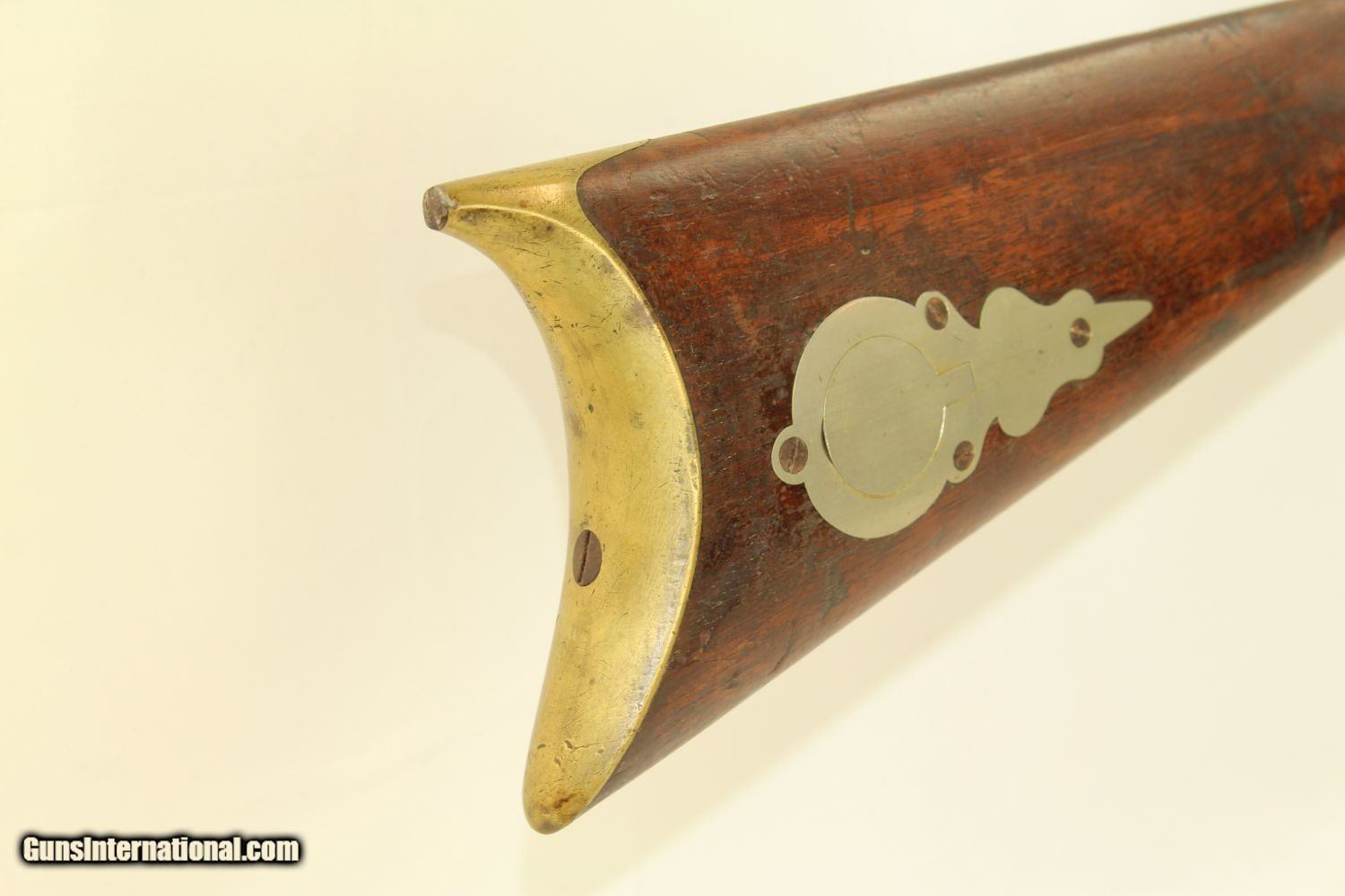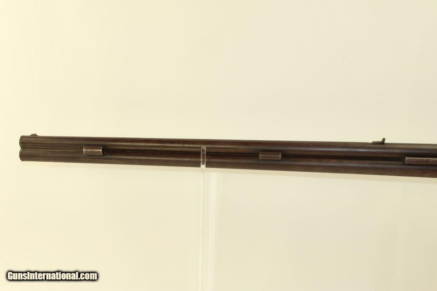 Description: RARE Mule Ear Percussion COMBINATION RIFLE/SHOTGUN Scarce Early 1800s American Design Here we present an antique Mule Ear percussion combination rifle/shotgun made circa the mid-1830s. This is a very interesting American design that originated in the 1820s and continued through the mid-1800s. This is a percussion rifle and shotgun combination that is fired by the two independent percussion hammers on the right side of the firearm. These were very popular in the northeast and upper New York. It was great for the field when hunting, offering the hunter an appropriate load for whatever game he might come across, whether feathered or furry, and a fast follow up shot never hurts. This combination gun is relatively short and handy. The top bore is rifled and .41 caliber while the lower bore is smooth and .69 caliber. Rifle sights. One trigger works both hammers. German silver patchbox with brass trigger guard and butt plate. The overall condition is very good. The bores are in great shape, the bottom smooth and the top well-rifled. The action is strong. The trigger return spring is a little weak but overcome with by simply helping the trigger forward. Own the original! This is a legitimate antique and not a reproduction. Barrels are 29 inches. Caliber: .41 Percussion Rifle, .69 Percussion Shotgun Overall condition as seen in photos. Very Fast. Very Safe. FREE SHIPPING WORLDWIDE. Delivered directly to your door by express mail! Guaranteed AUTHENTIC & Includes CERTIFICATE OF AUTHENTICITY. ancestryguns $1650 #190205 SOLD Antique: Yes |