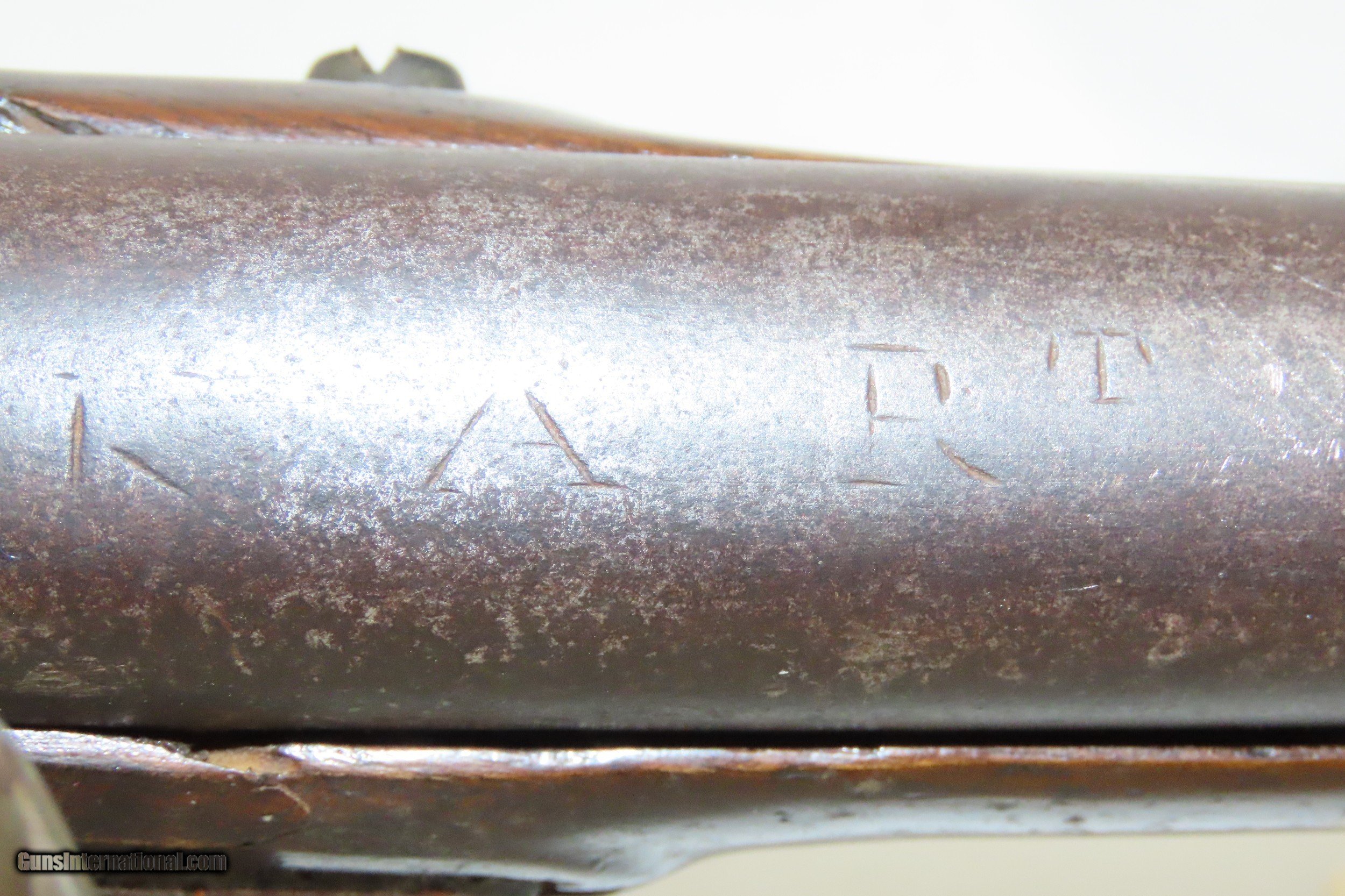 Description: Rev War KING’S AMERICAN REGT British BROWN BESS Flintlock Musket Antique With REVOLUTIONARY WAR Dated INSCRIPTION Here we present an antique Short Land Pattern Brown Bess Flintlock Musket. It is inscribed by hand “JOHN POTTES/NOVEMR 23, 1778/NT (probably NJ for New Jersey)” on the stock and “KA RT” for King’s American Regiment of Foot is marked atop the barrel. The King’s American Regiment was a British Loyalist fighting force raised in Staten Island in December of 1776. The KA Regt. fought the Battle of Forts Clinton & Montgomery on the Hudson River (6 October 1777) under General Sir Henry Clinton, capturing and burning the forts in an effort to control the Hudson. On 29 August 1778 the KA Regt fought the Battle of Quaker Hill (The Battle of Rhode Island). The unit also participated in the Siege of Charleston, Virginia (29 March-12 May 1780) the result of which was one of the largest losses for the American rebels with over 5,250 captured personnel along with much materiel. They continued on to Richmond, Virginia (January 1781) where the British would take the city, sack and torch it under the command of the infamous Benedict Arnold—another major defeat for the Patriots. In March, the regiment became the 4th American Regiment of Foot and was folded into the so-called “American Establishment”, which increased the status of the unit to what was essentially considered equal with British Regulars and was aimed at increasing Loyalist enlistment. 25 December 1782 saw the regiment folded into the British Establishment. The regiment would fight til the end of the war, evacuated from New York in September of 1783, and disband in October of that year in New Brunswick, in British Canada. As for the carvings on the stock, the date of November 23, 1778, no doubt was significant to the inscriber, who was likely John Pottes. Pottes enlisted as a Private in the 4th New Jersey Regiment. The 4th NJ originated at Elizabethtown, New Jersey for the Patriot cause 16 September 1776. Notable actions were at the Battle of Brandywine (11 September 1777) which saw a British victory and subsequent capture of Philadelphia, Battle of Germantown (4 October 1777) which saw another British victory, and the Battle of Monmouth (28 June 1778). The 4th disbanded shortly after in February 1779. Certainly, the worse for the wear, this musket started life in British hands and appears to have fallen into American hands at some point. Functioning action. The smooth bore is in good shape (aged). Walnut stock contains above average wear (significant wear around the barrel pins, stable cracking at side plate and under the trigger guard). Replacement ramrod. A very neat piece of history! Own the original! This is a legitimate antique and not a reproduction. Barrel is 42 inches. Caliber: .75 Flintlock Overall condition as seen in photos. Very Fast. Very Safe. FREE SHIPPING WORLDWIDE. Delivered directly to your door by express mail! Guaranteed AUTHENTIC & Includes CERTIFICATE OF AUTHENTICITY. ancestryguns $8745 #215324 SOLD Antique: Yes |