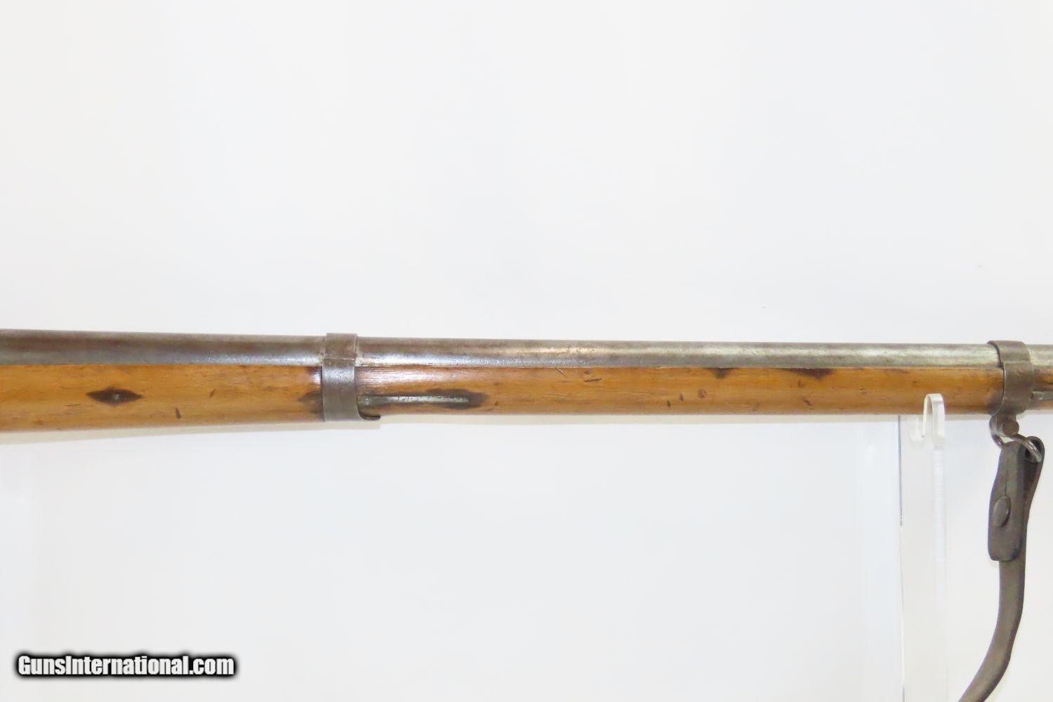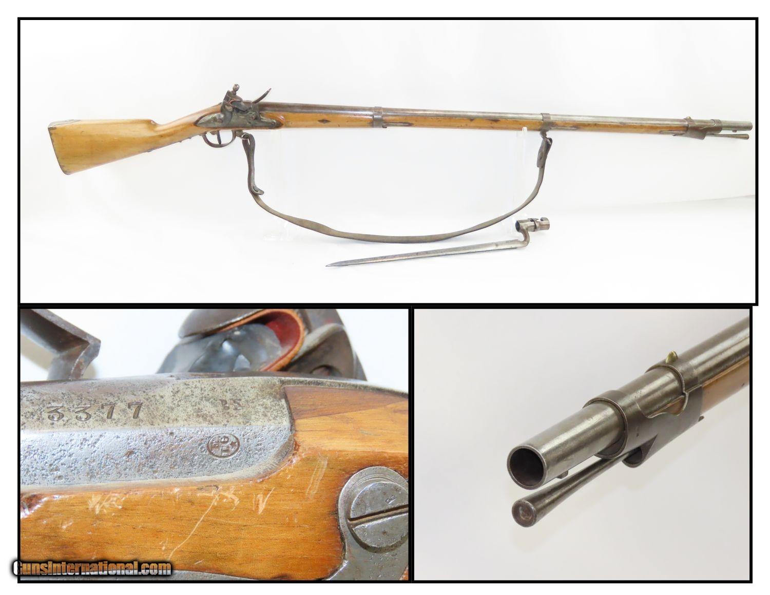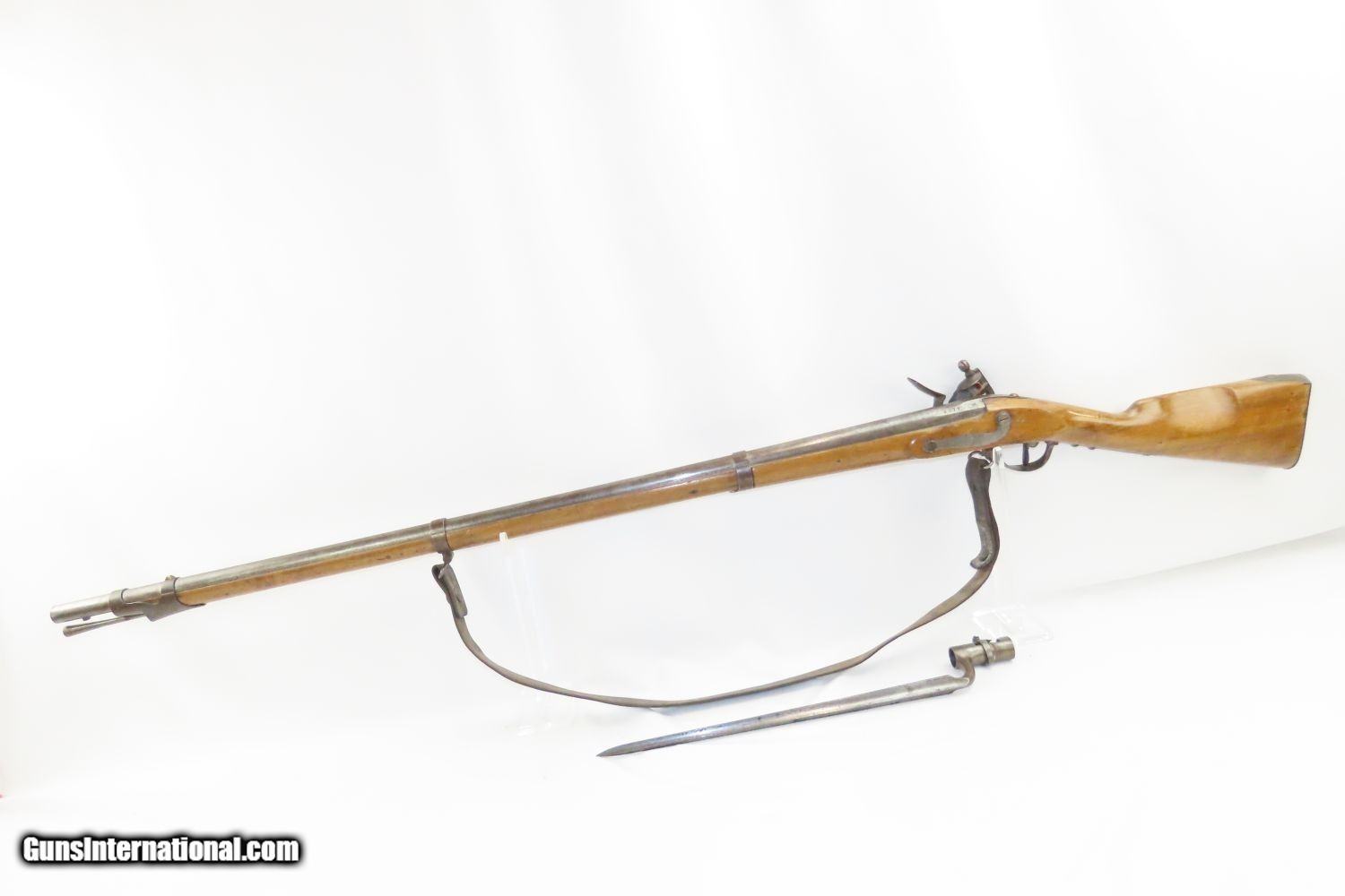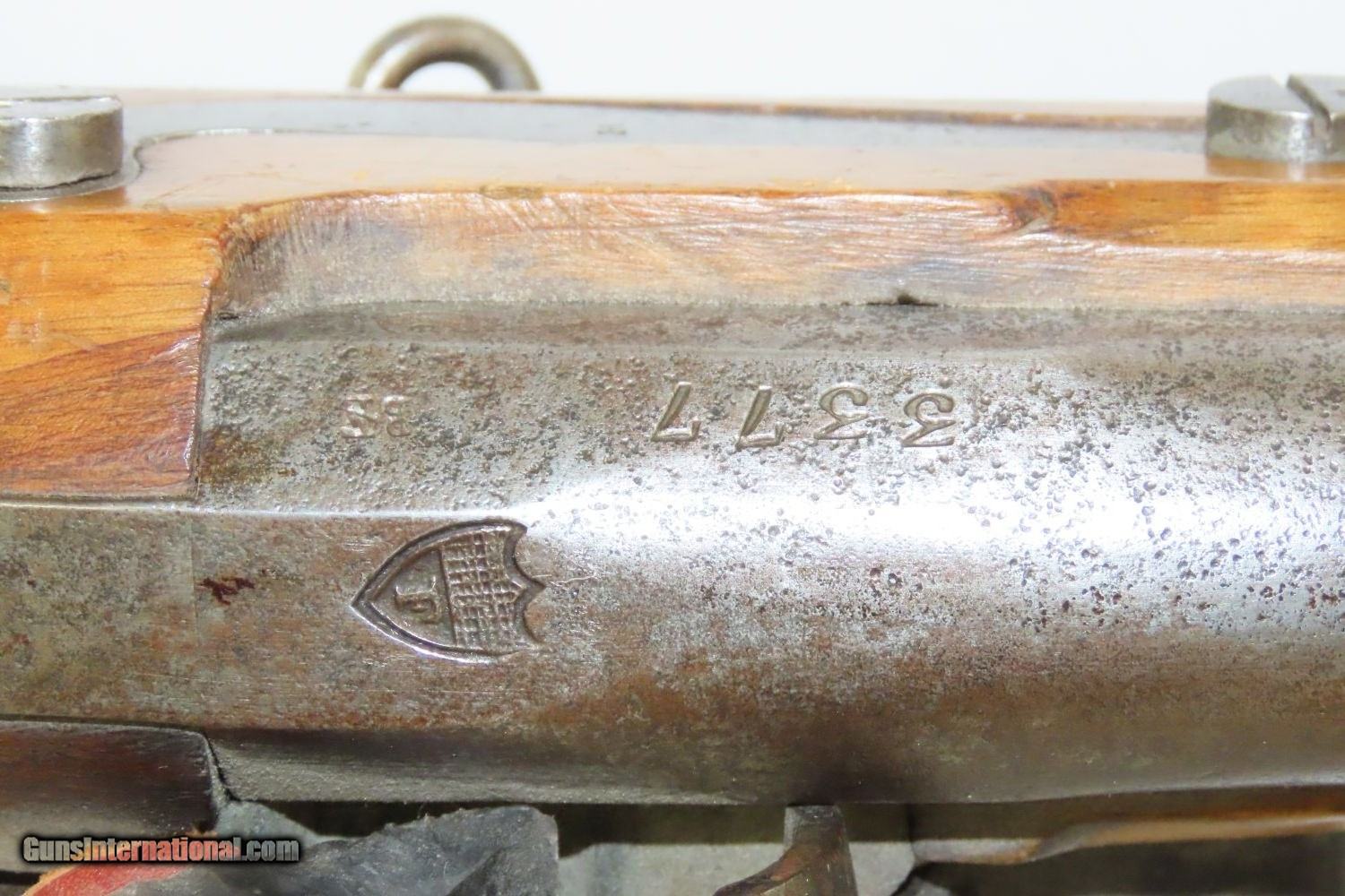 Description: SWISS Antique CHARLEVILLE 1777 FLINTLOCK .69 Caliber MILITARY Musket Based on the French Model 1777! Here we present an antique Swiss Flintlock Charleville 1777 Military Musket, manufactured circa the early to mid-1800s likely in Liege, Belgium. This .69 caliber musket is very similar to the French Charleville Model 1777 in both barrel length and caliber. The barrel has several hallmarks and stamps attributing to its Belgian craftsmanship. The Charleville musket was a .69 caliber standard French infantry musket used in the 18th and 19th centuries. It was made in 1717 and was last produced during the 1840s. However, it still saw limited use in conflicts through the mid-19th century. The overall condition is very good. This example includes a socket bayonet and sling, all in good shape. The action is strong, it will spark, and the bore is in good shape. The numbers match. The stock has a repaired cut under the middle barrel band. An “F” in a shield can be seen at the breech, the Swiss cantonal marking, and “BF” markings are engraved on the lock, the mark of the maker of the musket. This is a great example of a scarce musket! Own the original! This is a legitimate antique and not a reproduction. Barrel is 42-3/4 inches. Caliber: .69 Flintlock Overall condition as seen in photos. Very Fast. Very Safe. FREE SHIPPING WORLDWIDE. Delivered directly to your door by express mail! Guaranteed AUTHENTIC & Includes CERTIFICATE OF AUTHENTICITY. ancestryguns $2345 #201281 SOLD Antique: Yes |