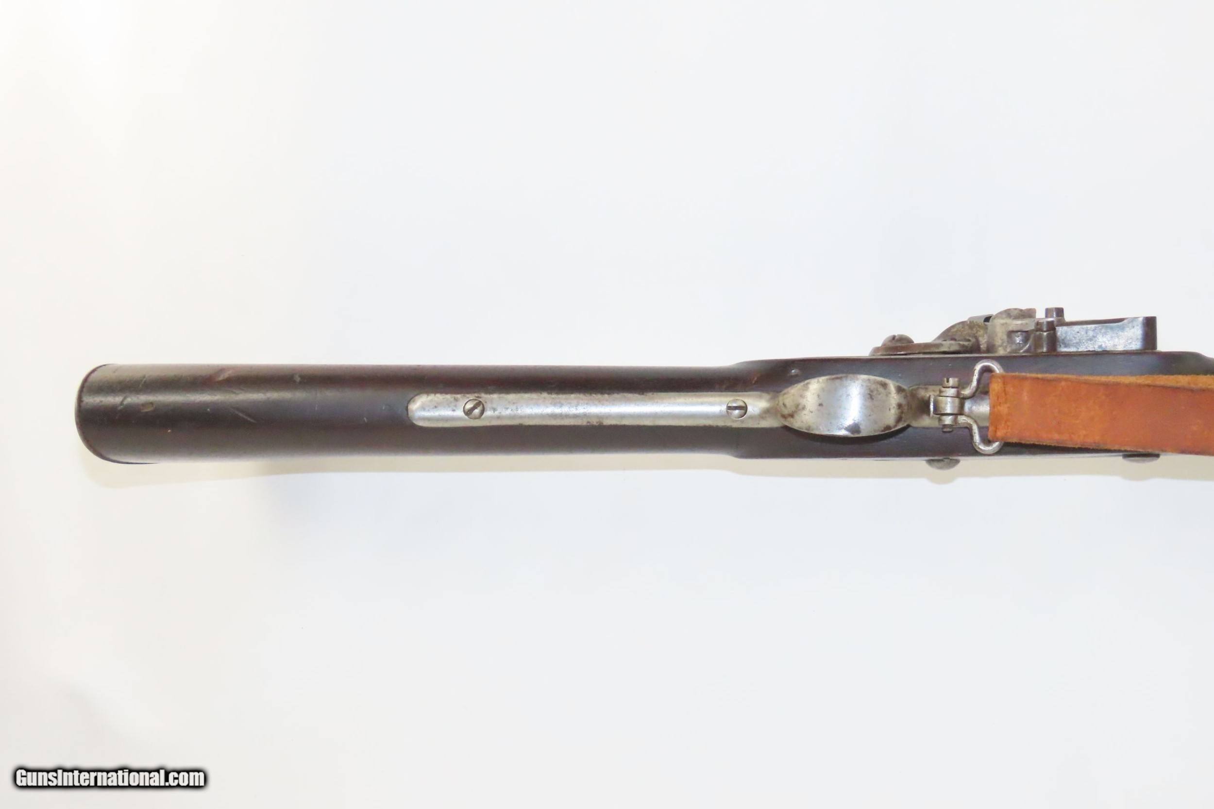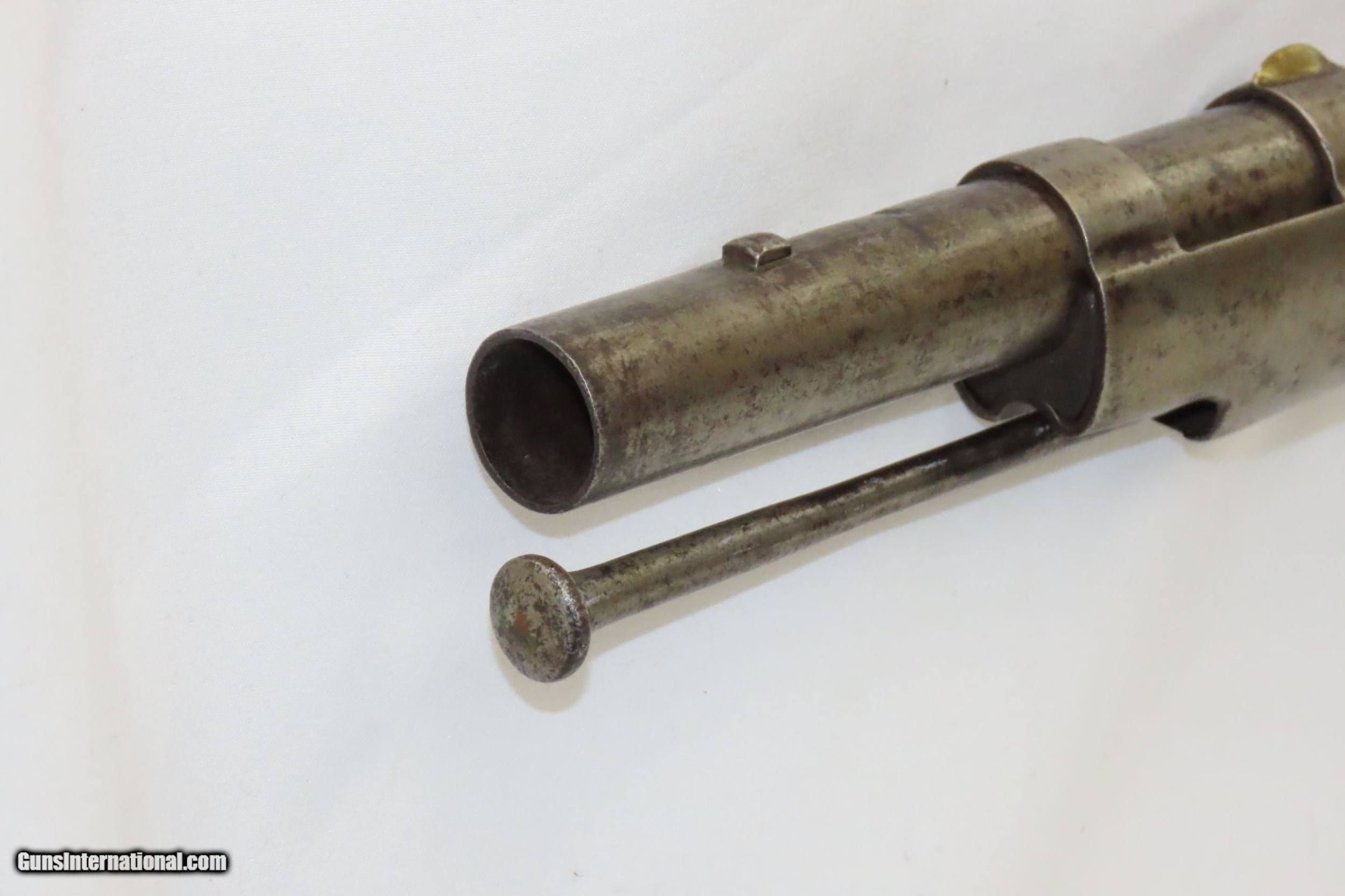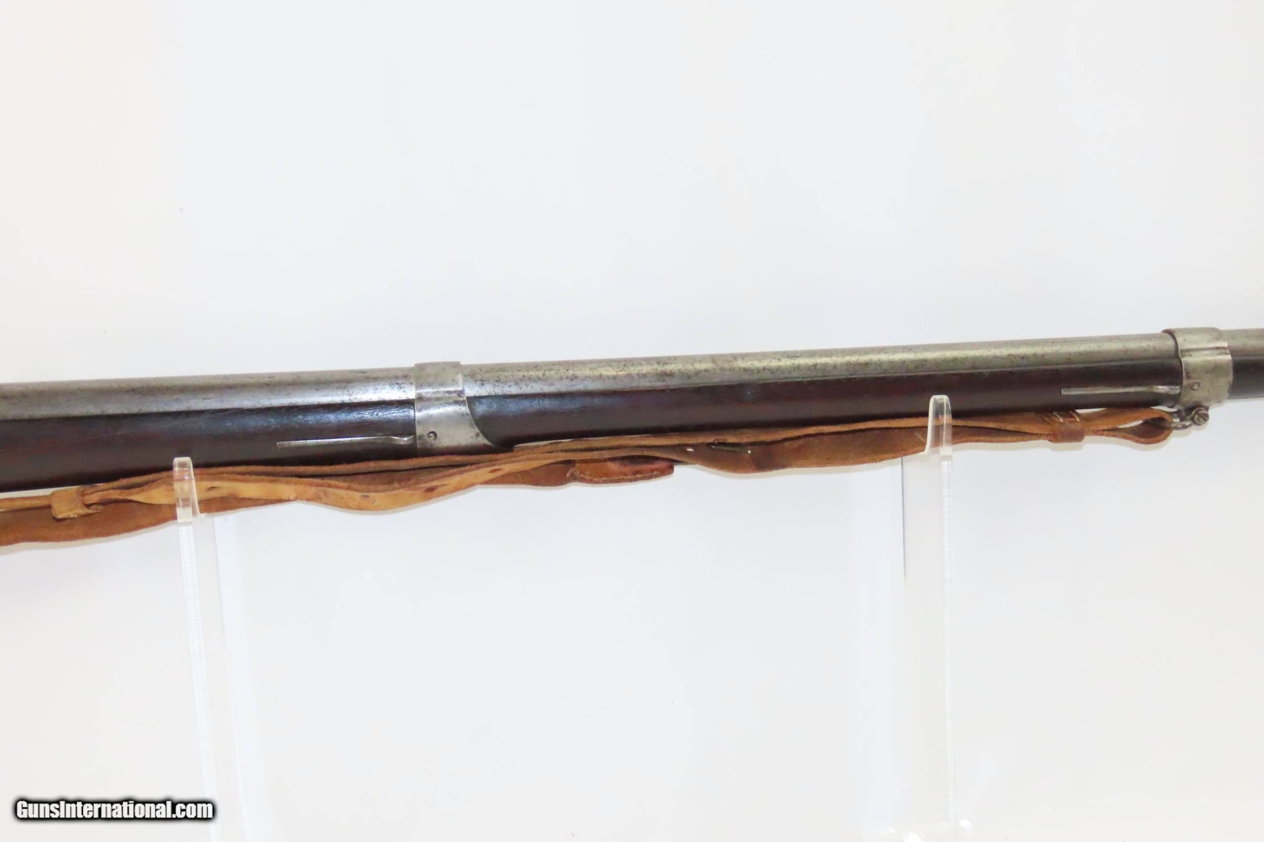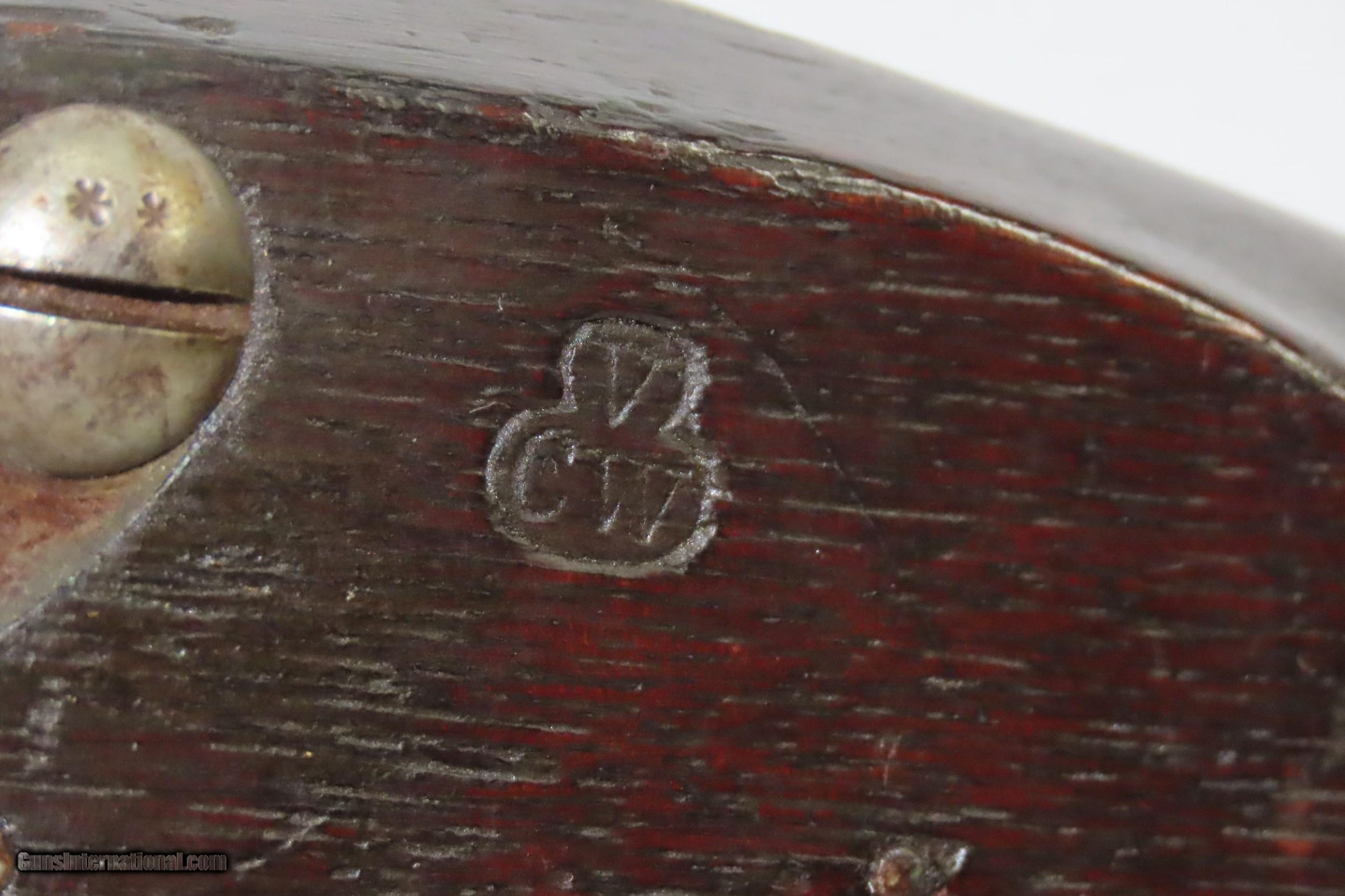 Description: WAR of 1812 Era U.S. Contract WATERS Model 1808 FLINTLOCK Musket Musket Made in Sutton, Massachusetts Circa 1812 Here we present an antique Waters & Co. Model 1808 Flintlock Musket, manufactured circa 1812 in Sutton, Massachusetts from the lot of 4,270 Springfield Armory pattern muskets manufactured by Elijah and Asa Waters. Waters was one of 19 gunmakers contracted to manufacture the Model 1808. They were contracted to manufacture 5,000 muskets based on the Springfield Armory version (rather than the Harpers Ferry version) in total but fell short of the complete order. The barrel, lock and iron furniture were finished bright. There is a bayonet lug mounted on the underside of the barrel. The lower sling swivel is mounted on a stud ahead of the trigger guard and the trigger guard has pointed finials. The barrel bands are secured by springs behind the bands. Mounted with a full one-piece black walnut stock. This exact musket is featured on page 170 of American Military Shoulder Arms, Vol. 2 by George Moller. It would have been made at the beginning of the War of 1812, a war the young United States fought against Great Britain until 1815. The overall condition is near fine. Strong action. The bore is in good shape and remains clear and smooth. Solid stock (stable crack forward of the lock). “1812” and “SUTTON” are engraved on the lock. Clear cartouche on the left wrist. The initials “TC” are stamped throughout. “US” stamped barrel with view and proof marks. The leather sling is in good shape. Own the original! This is a legitimate antique and not a reproduction. Barrel is 44-1/2 inches. Caliber: .69 Flintlock Overall condition as seen in photos. Very Fast. Very Safe. FREE SHIPPING WORLDWIDE. Delivered directly to your door by express mail! Guaranteed AUTHENTIC & Includes CERTIFICATE OF AUTHENTICITY. ancestryguns $4815 #217028 SOLD Antique: Yes |