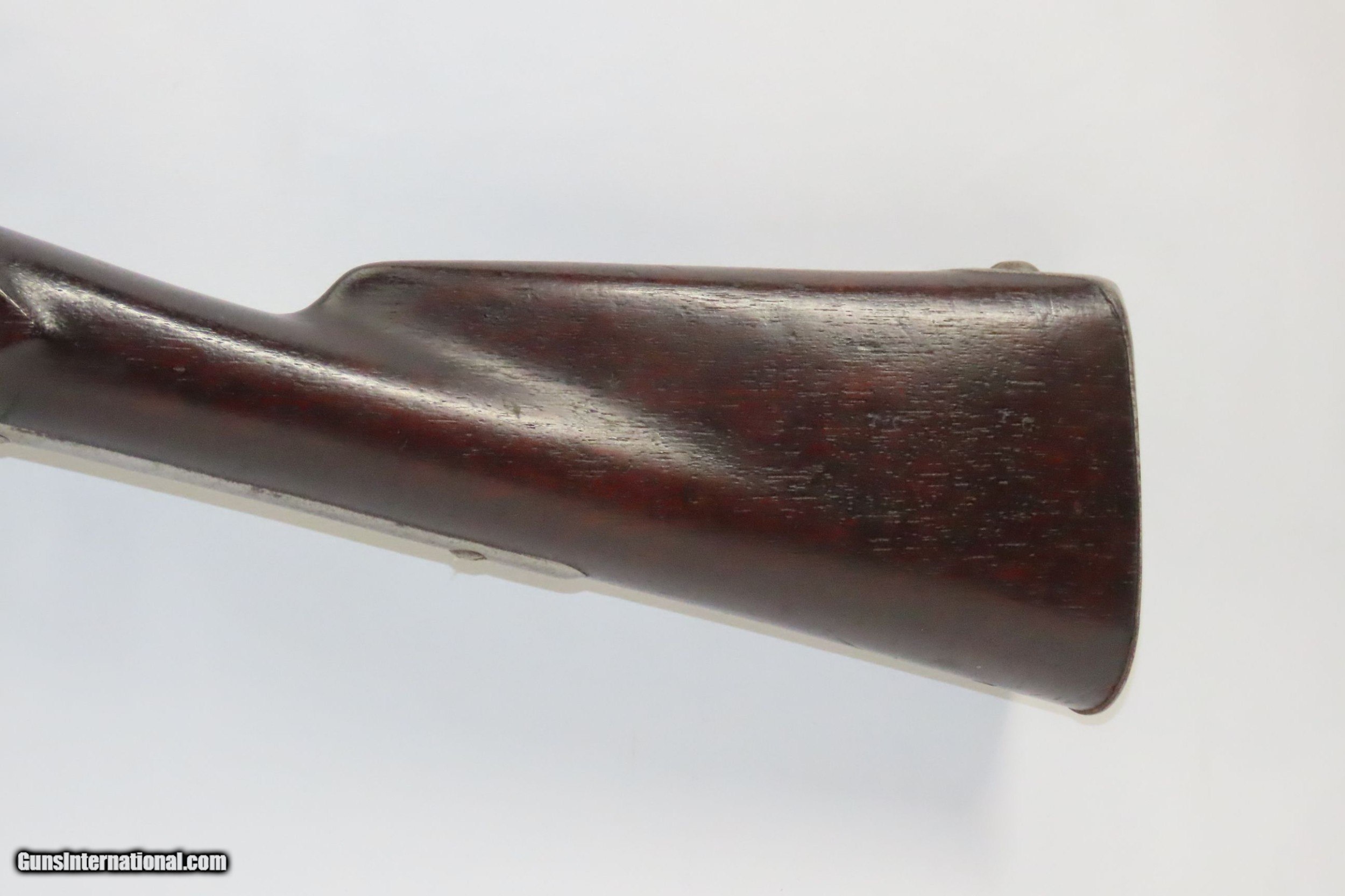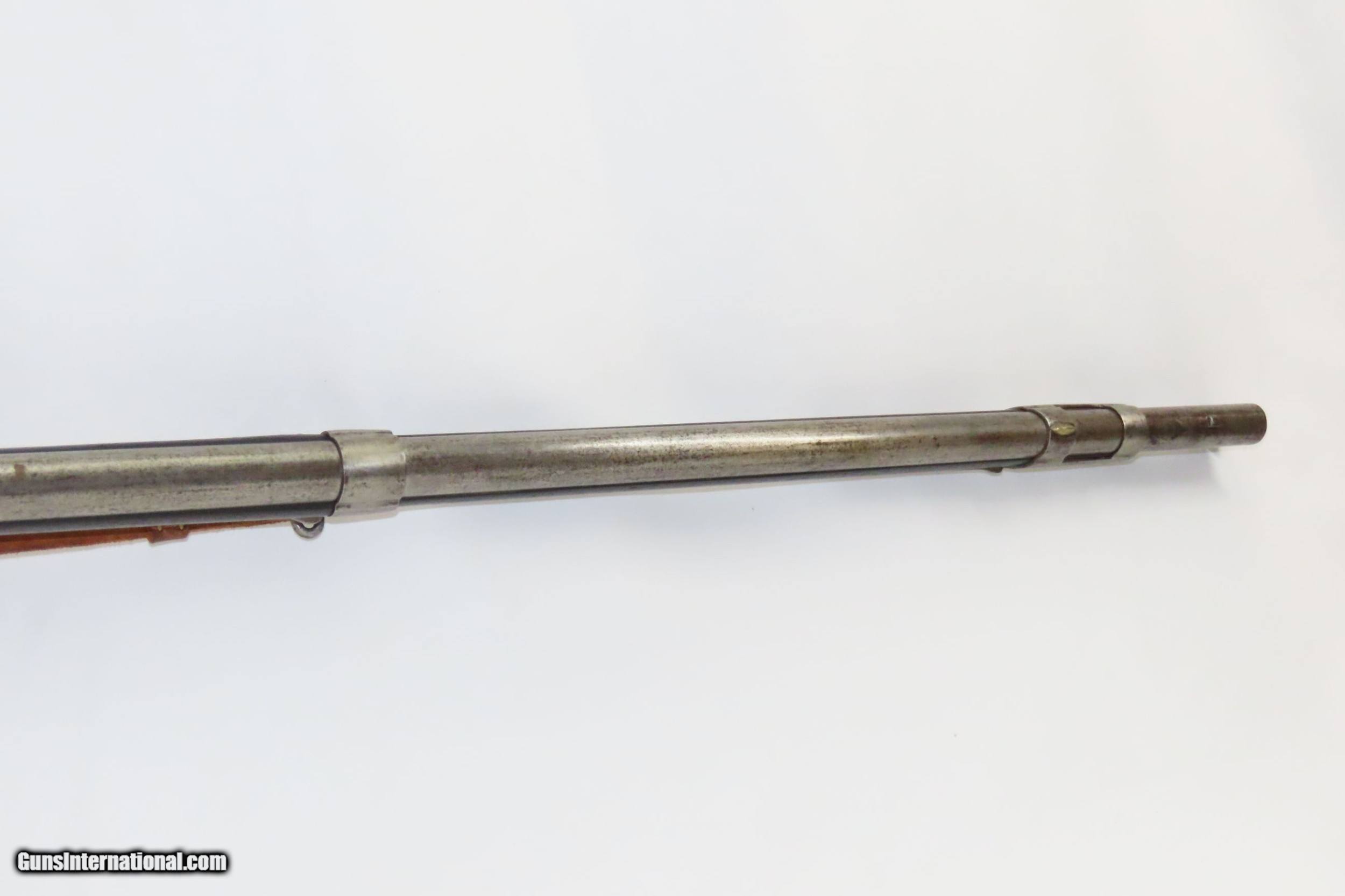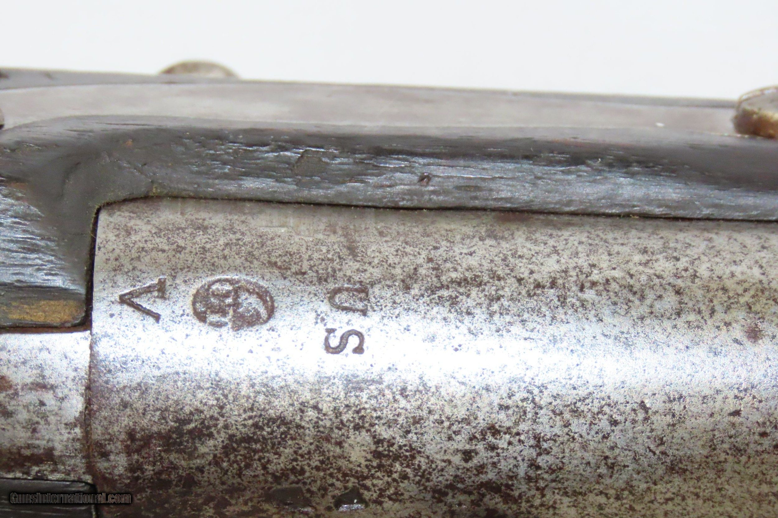 Description: WAR of 1812 Era U.S. Contract WATERS Model 1808 FLINTLOCK Musket Musket Made in Sutton, Massachusetts Circa 1812 Here we present an antique Waters & Co. Model 1808 Flintlock Musket, manufactured circa 1812 in Sutton, Massachusetts from the lot of 4,270 Springfield Armory pattern muskets manufactured by Elijah and Asa Waters. Waters was one of 19 gunmakers contracted to manufacture the Model 1808. They were contracted to manufacture 5,000 muskets based on the Springfield Armory version (rather than the Harpers Ferry version) in total but fell short of the complete order. The barrel, lock and iron furniture were finished bright. There is a bayonet lug mounted on the underside of the barrel. The lower sling swivel is mounted on a stud ahead of the trigger guard and the trigger guard has pointed finials. The barrel bands are secured by springs behind the bands. Mounted with a full one-piece black walnut stock. This exact musket is featured on page 170 of American Military Shoulder Arms, Vol. 2 by George Moller. It would have been made at the beginning of the War of 1812, a war the young United States fought against Great Britain until 1815. The overall condition is near fine. Strong action. The bore is in good shape and remains clear and smooth. Solid stock (stable crack forward of the lock). “1812” and “SUTTON” are engraved on the lock. Clear cartouche on the left wrist. The initials “TC” are stamped throughout. “US” stamped barrel with view and proof marks. The leather sling is in good shape. Own the original! This is a legitimate antique and not a reproduction. Barrel is 44-1/2 inches. Caliber: .69 Flintlock Overall condition as seen in photos. Very Fast. Very Safe. FREE SHIPPING WORLDWIDE. Delivered directly to your door by express mail! Guaranteed AUTHENTIC & Includes CERTIFICATE OF AUTHENTICITY. ancestryguns $4815 #217028 SOLD Antique: Yes |