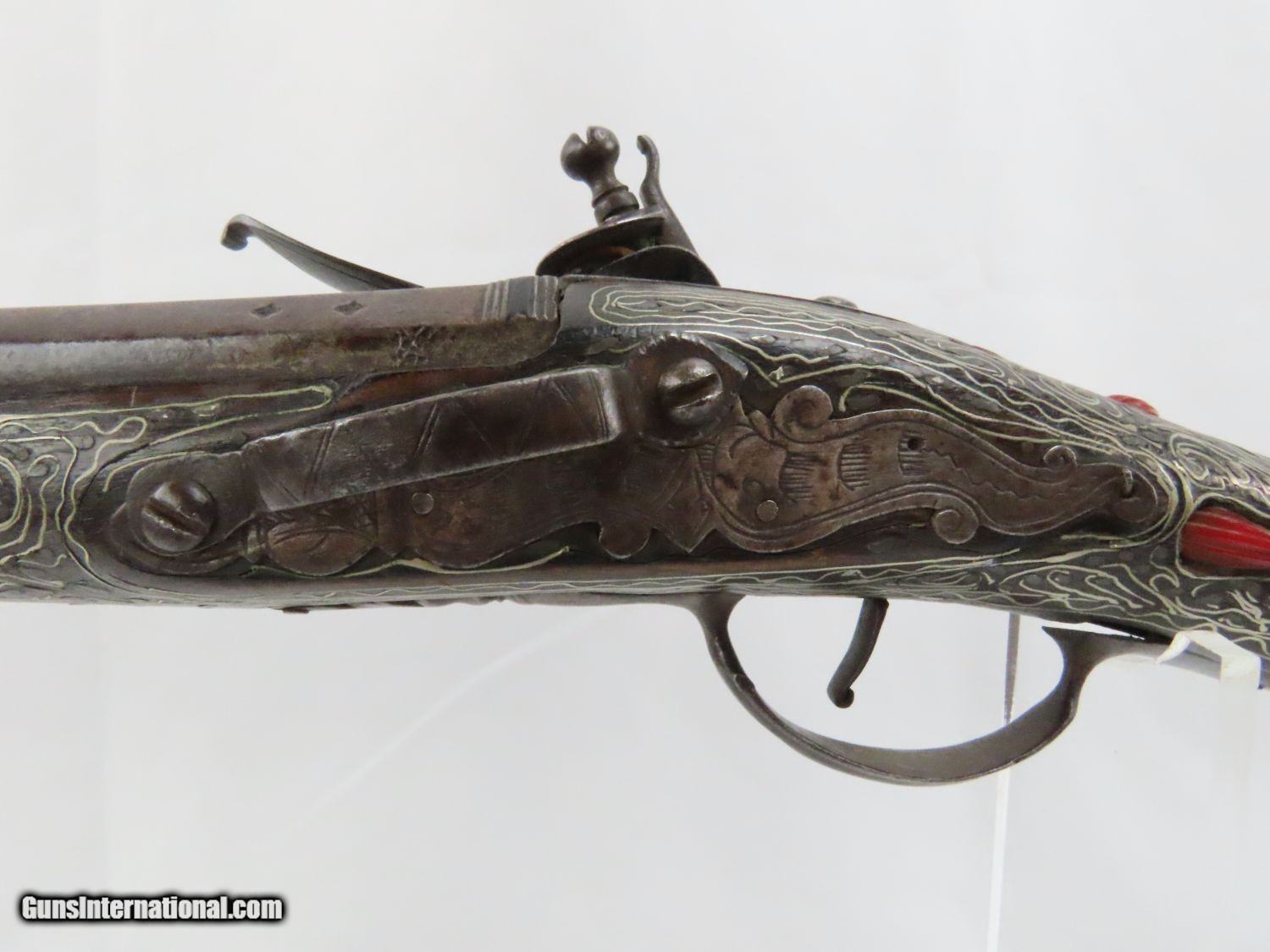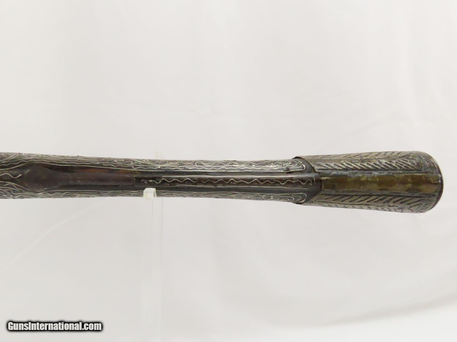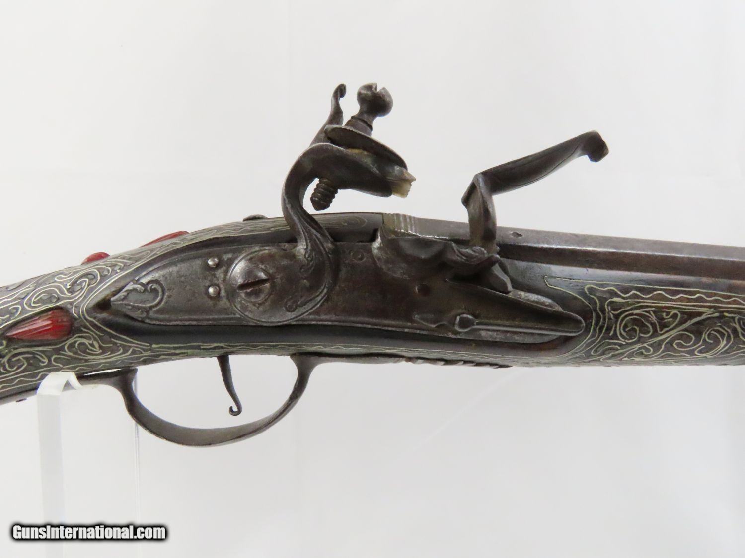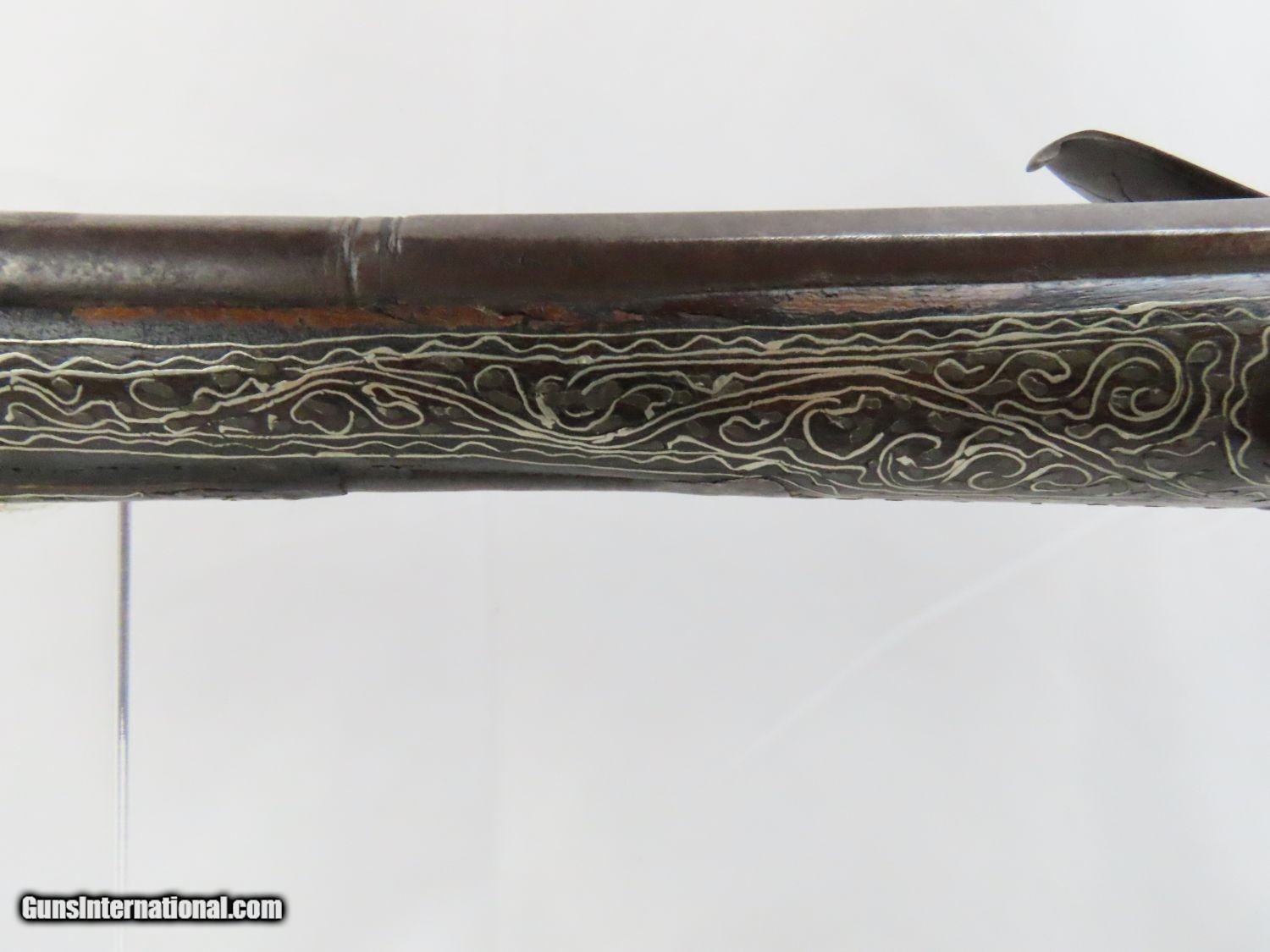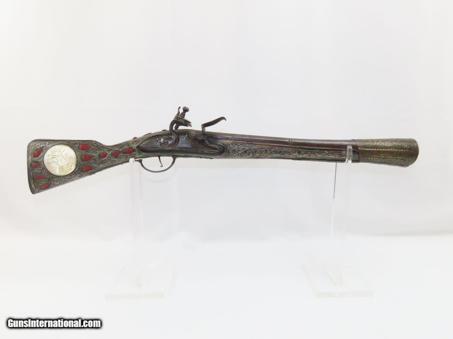 Description: Antique Ornate MEDITERRANEAN “DRAGON” Flintlock BLUNDERBUSS Naval Pirate Used by Navies & Pirates for Boarding and Repelling! Here we present an antique Ornate Ottoman Style Flintlock Blunderbuss, made circa the 1700s. The blunderbuss is a firearm with a short, large caliber barrel flared at the muzzle and frequently throughout the entire bore and used with shot and other projectiles. The blunderbuss is commonly considered to be an early predecessor of the modern day shotgun, with similar military and defensive use. It was effective only at short range, lacking accuracy at long range. A blunderbuss in handgun form was called a Dragon, and it is from this that the term “Dragoon” evolved. The flintlock blunderbuss was the original coach gun, being a short, handy and devastating weapon at close range. It was used in many capacities, not the least of which were for naval boarding or defending by pirates and navies alike! This specimen features beautiful inlays on the stock. The single barrel band is hammered silver with engravings. The barrel end cap is beautifully engraved, along with all of the stock. There is an interesting two headed eagle embellished into the stock. The overall condition is very good. The action is quite strong. The bore is dark and dusty with age. The entire stock is ornately inlaid with silver designs. Overall, this is a fantastic example of old world craftsmanship that will be the most talked about piece in your collection. Own the original! This is a legitimate antique and not a reproduction. Barrel is 15-7/8 inches. Muzzle Diameter: 1-3/4 inches Overall condition as seen in photos. Very Fast. Very Safe. FREE SHIPPING WORLDWIDE. Delivered directly to your door by express mail! Guaranteed AUTHENTIC & Includes CERTIFICATE OF AUTHENTICITY. ancestryguns $1975 #20715 SOLD Antique: Yes |