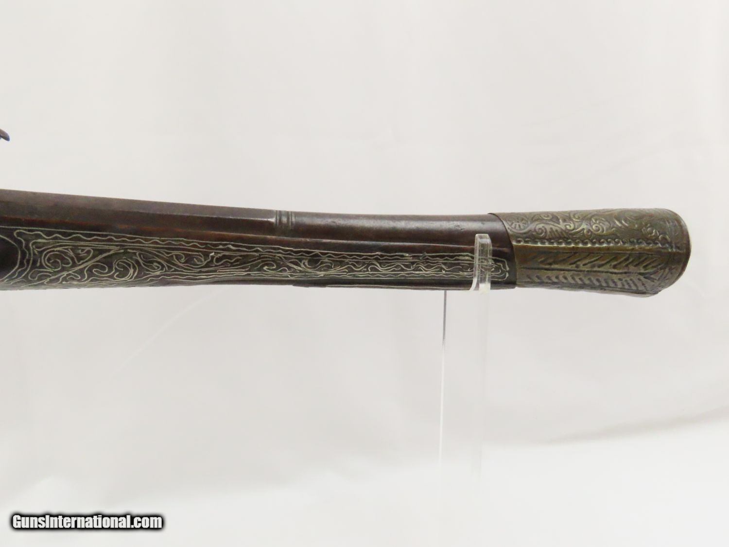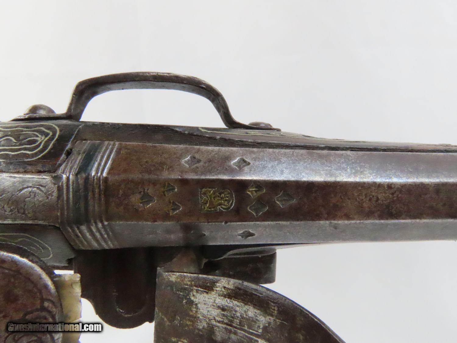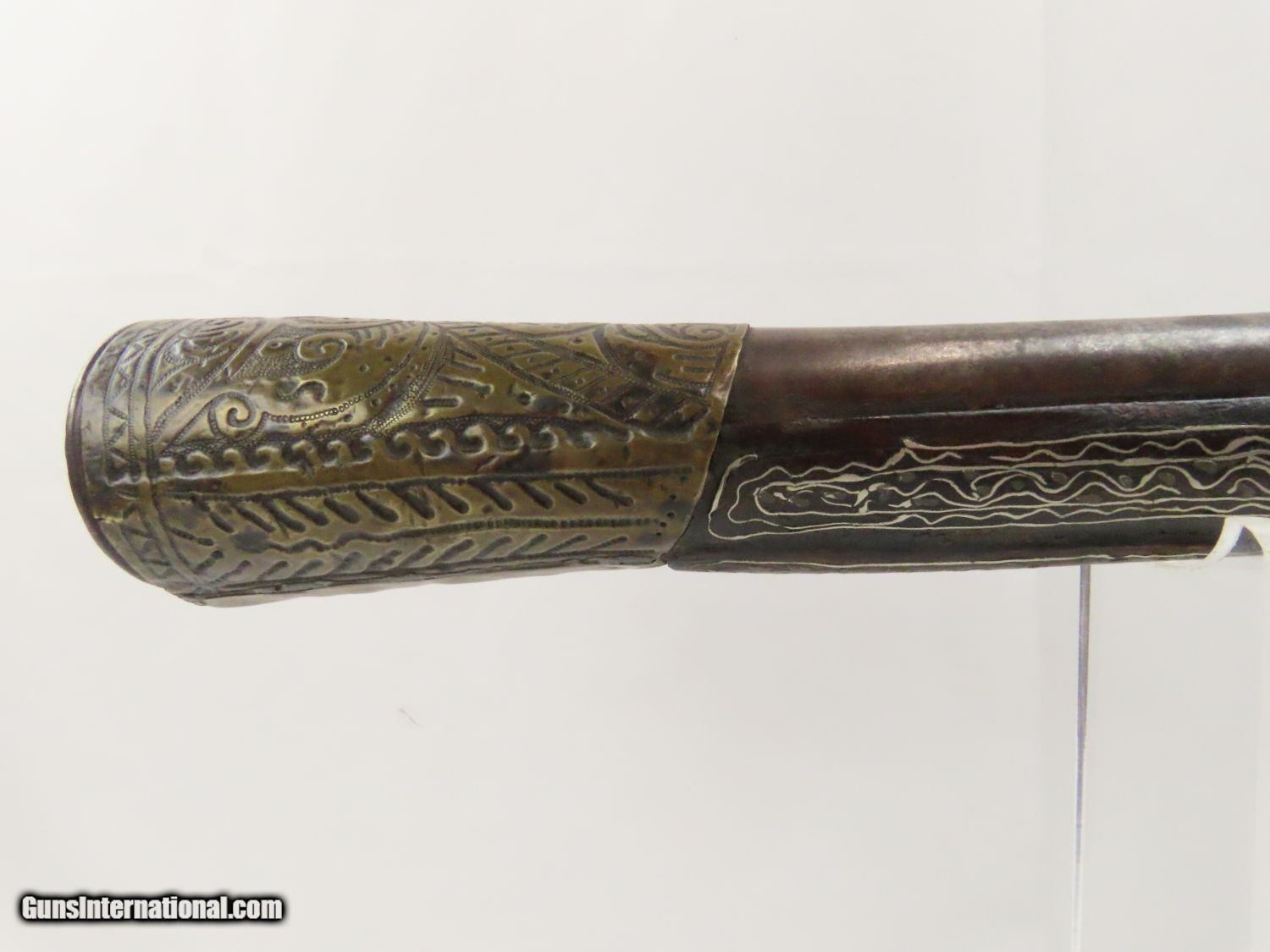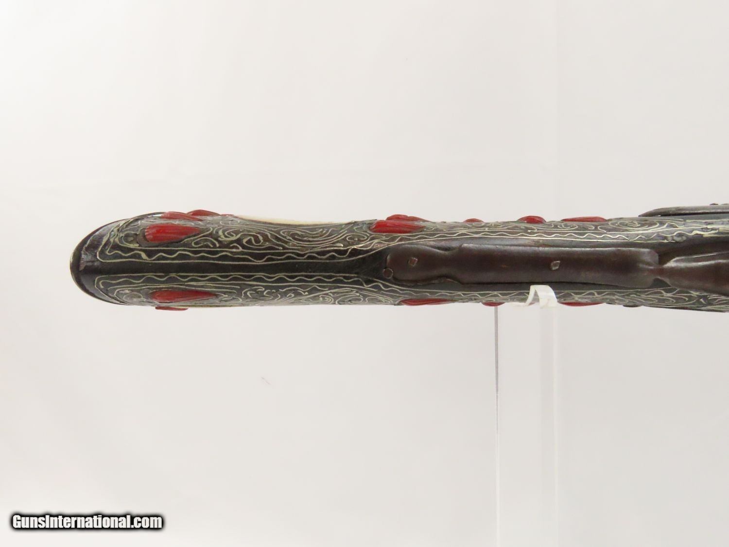 Description: Antique Ornate MEDITERRANEAN “DRAGON” Flintlock BLUNDERBUSS Naval Pirate Used by Navies & Pirates for Boarding and Repelling! Here we present an antique Ornate Ottoman Style Flintlock Blunderbuss, made circa the 1700s. The blunderbuss is a firearm with a short, large caliber barrel flared at the muzzle and frequently throughout the entire bore and used with shot and other projectiles. The blunderbuss is commonly considered to be an early predecessor of the modern day shotgun, with similar military and defensive use. It was effective only at short range, lacking accuracy at long range. A blunderbuss in handgun form was called a Dragon, and it is from this that the term “Dragoon” evolved. The flintlock blunderbuss was the original coach gun, being a short, handy and devastating weapon at close range. It was used in many capacities, not the least of which were for naval boarding or defending by pirates and navies alike! This specimen features beautiful inlays on the stock. The single barrel band is hammered silver with engravings. The barrel end cap is beautifully engraved, along with all of the stock. There is an interesting two headed eagle embellished into the stock. The overall condition is very good. The action is quite strong. The bore is dark and dusty with age. The entire stock is ornately inlaid with silver designs. Overall, this is a fantastic example of old world craftsmanship that will be the most talked about piece in your collection. Own the original! This is a legitimate antique and not a reproduction. Barrel is 15-7/8 inches. Muzzle Diameter: 1-3/4 inches Overall condition as seen in photos. Very Fast. Very Safe. FREE SHIPPING WORLDWIDE. Delivered directly to your door by express mail! Guaranteed AUTHENTIC & Includes CERTIFICATE OF AUTHENTICITY. ancestryguns $1975 #20715 SOLD Antique: Yes |