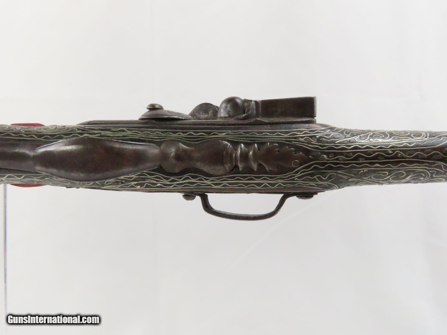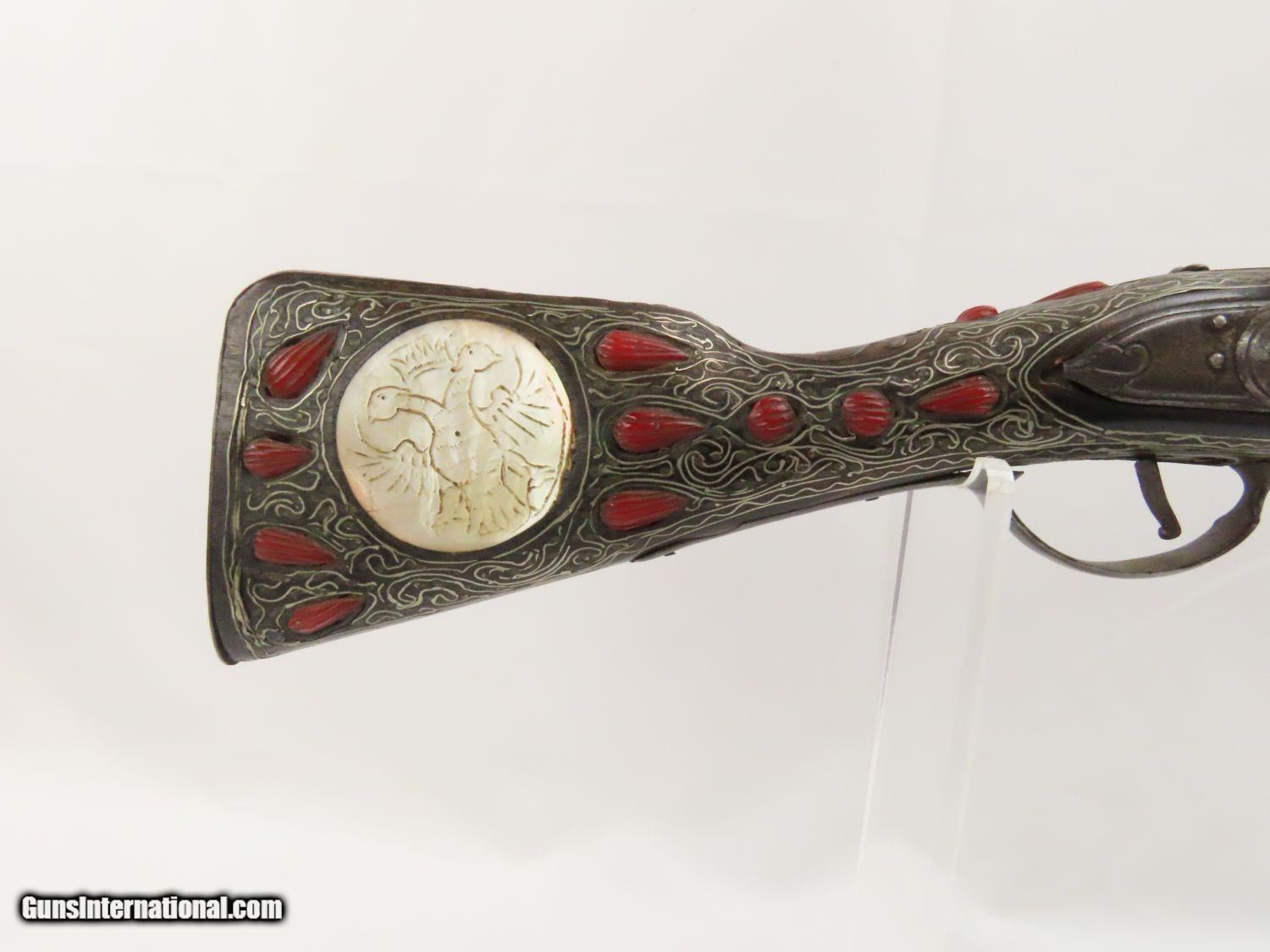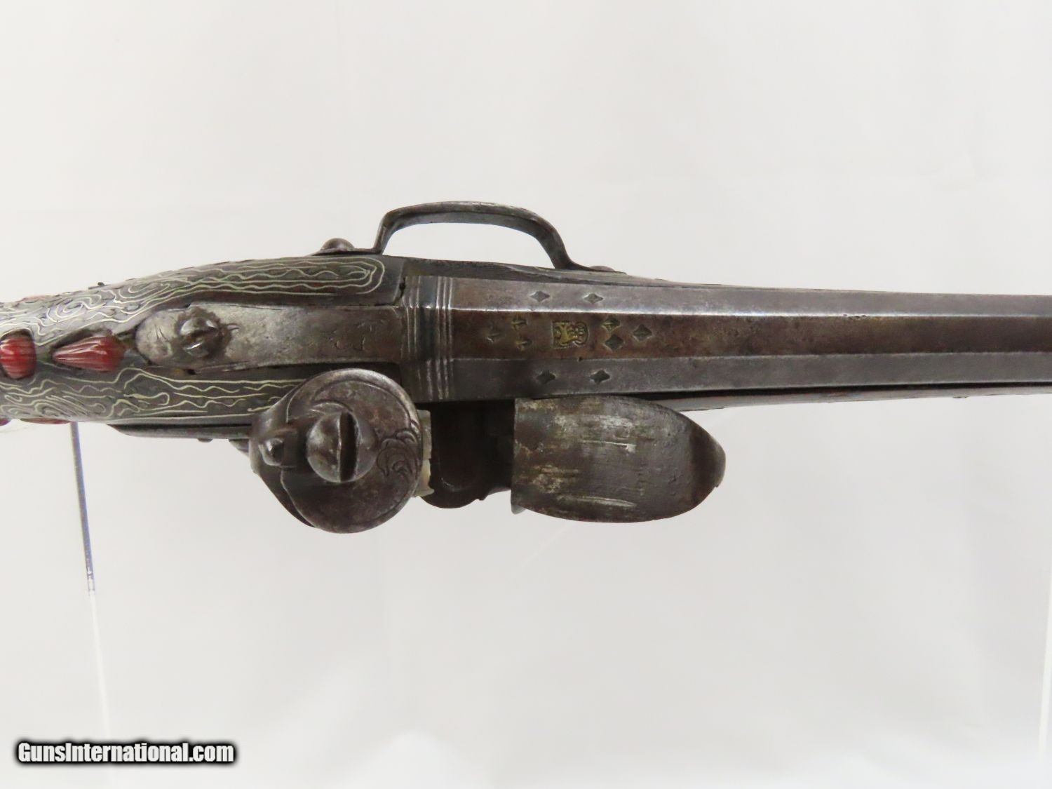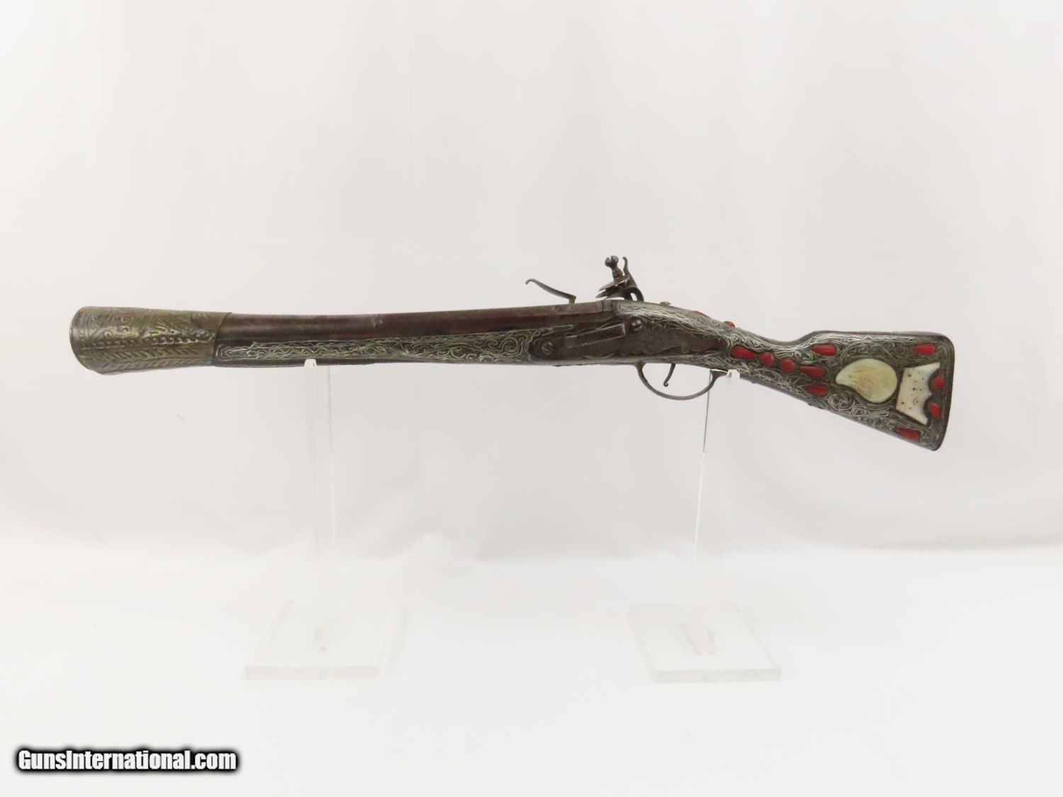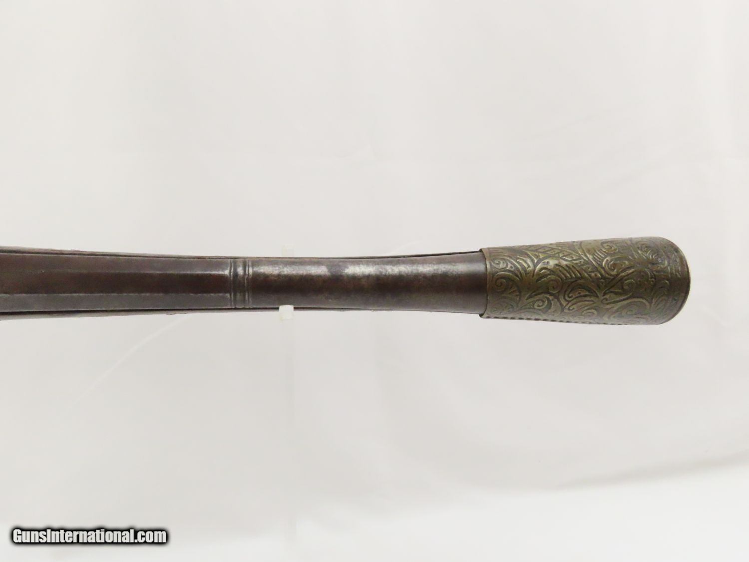 Description: Antique Ornate MEDITERRANEAN “DRAGON” Flintlock BLUNDERBUSS Naval Pirate Used by Navies & Pirates for Boarding and Repelling! Here we present an antique Ornate Ottoman Style Flintlock Blunderbuss, made circa the 1700s. The blunderbuss is a firearm with a short, large caliber barrel flared at the muzzle and frequently throughout the entire bore and used with shot and other projectiles. The blunderbuss is commonly considered to be an early predecessor of the modern day shotgun, with similar military and defensive use. It was effective only at short range, lacking accuracy at long range. A blunderbuss in handgun form was called a Dragon, and it is from this that the term “Dragoon” evolved. The flintlock blunderbuss was the original coach gun, being a short, handy and devastating weapon at close range. It was used in many capacities, not the least of which were for naval boarding or defending by pirates and navies alike! This specimen features beautiful inlays on the stock. The single barrel band is hammered silver with engravings. The barrel end cap is beautifully engraved, along with all of the stock. There is an interesting two headed eagle embellished into the stock. The overall condition is very good. The action is quite strong. The bore is dark and dusty with age. The entire stock is ornately inlaid with silver designs. Overall, this is a fantastic example of old world craftsmanship that will be the most talked about piece in your collection. Own the original! This is a legitimate antique and not a reproduction. Barrel is 15-7/8 inches. Muzzle Diameter: 1-3/4 inches Overall condition as seen in photos. Very Fast. Very Safe. FREE SHIPPING WORLDWIDE. Delivered directly to your door by express mail! Guaranteed AUTHENTIC & Includes CERTIFICATE OF AUTHENTICITY. ancestryguns $1975 #20715 SOLD Antique: Yes |