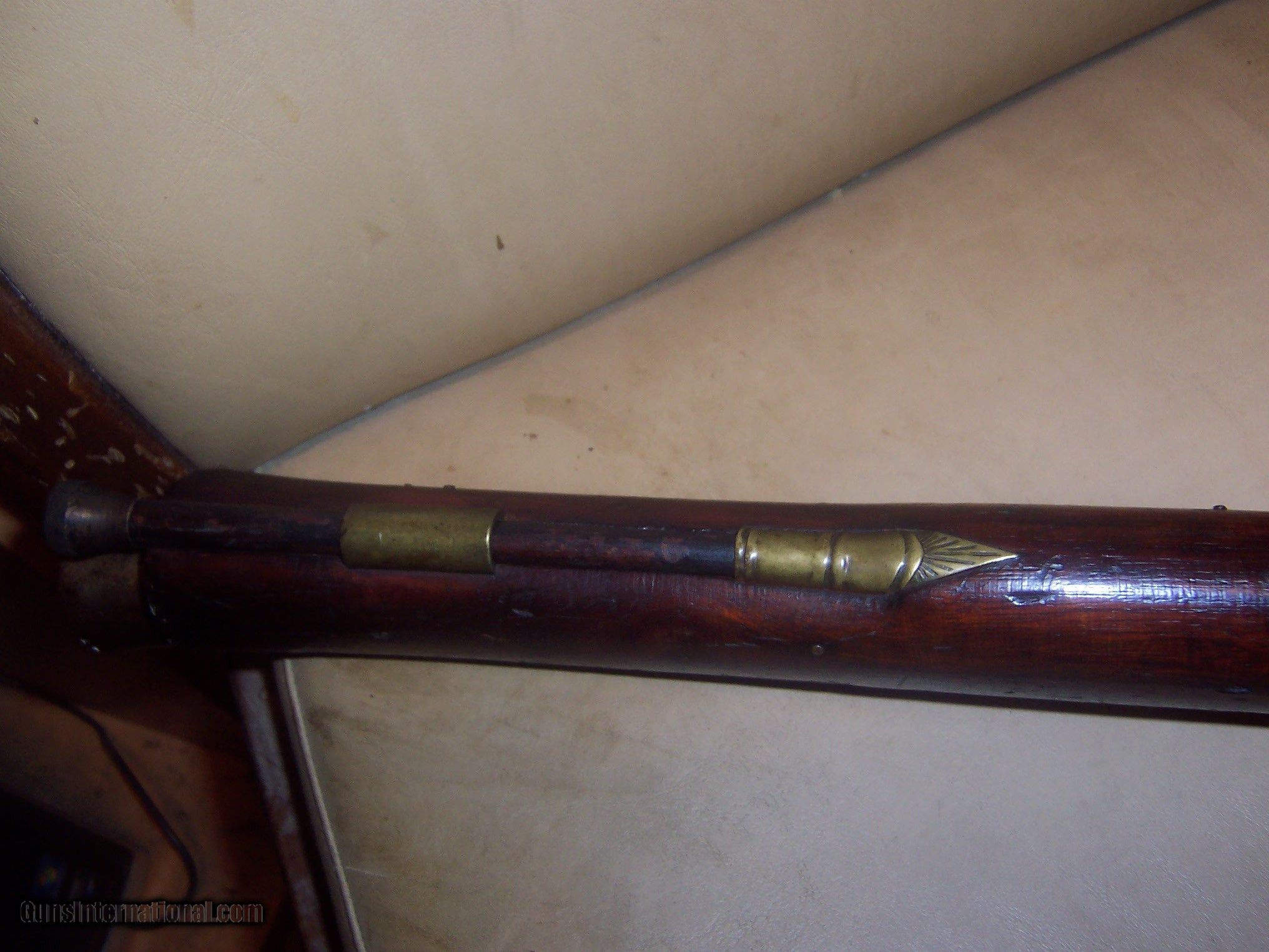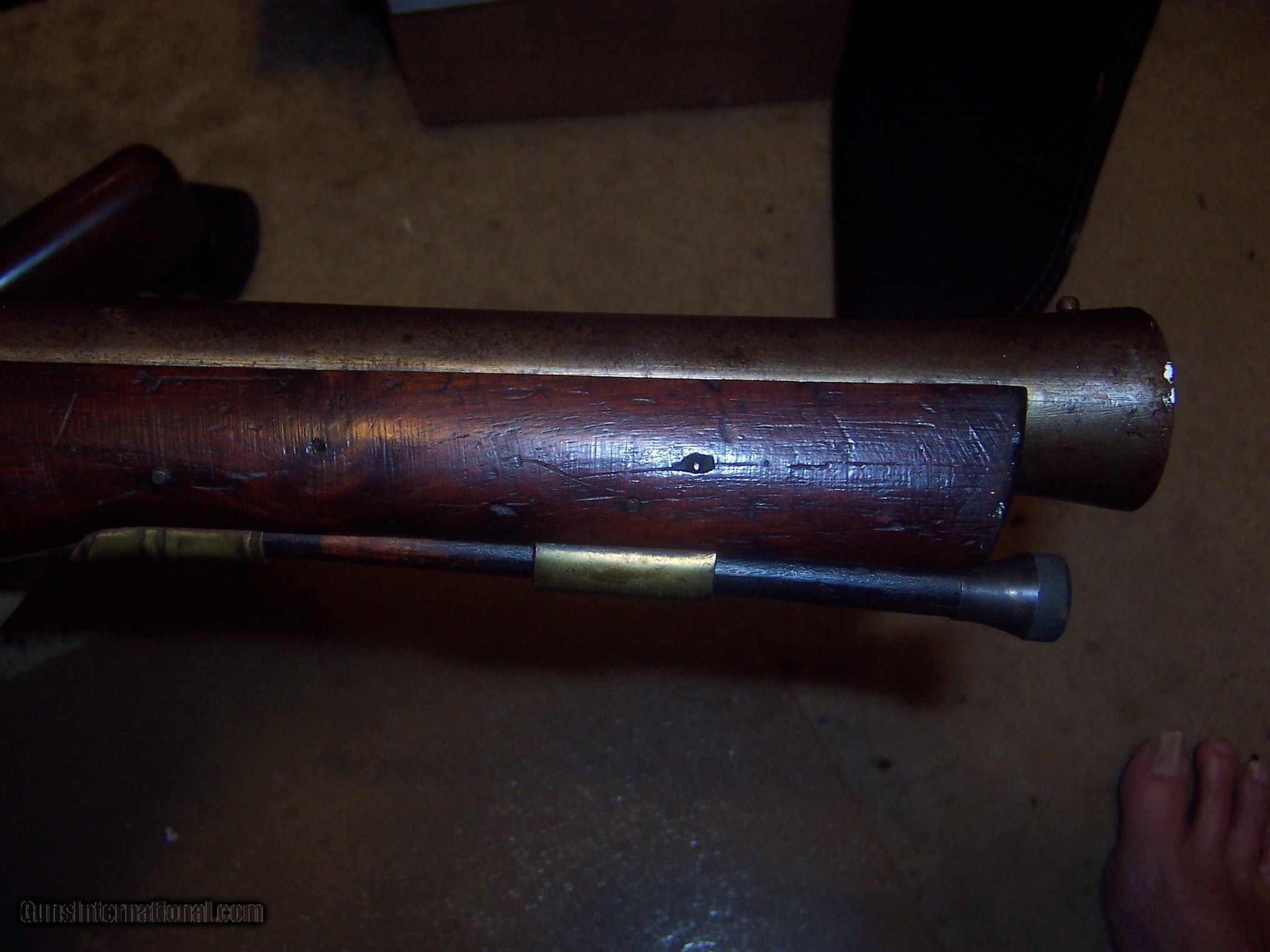 Description: works fine in dry fire 1 1/4 inch bore barrel is 16 inches long appx 31 inches oa british proofs ,, no makers mark ,,, lightly engraved, iron barrel , brass mounts strong action missing MINOR piece of trigger guard see photo barrel marked THE ROYAL HOUSE PROTECTOR on top of barrel , nice solid stock with normal wear patina finish on paarrel ,, ramrod looks original with replaced brass tip , looks original pre us civil war 5his is an antique i have 3 blunderbusses for sale buy all 3 for $4000 shipped SOLD Antique: Yes Manufacturer: british Condition: vg Metal Condition: vg Wood Condition: vg |