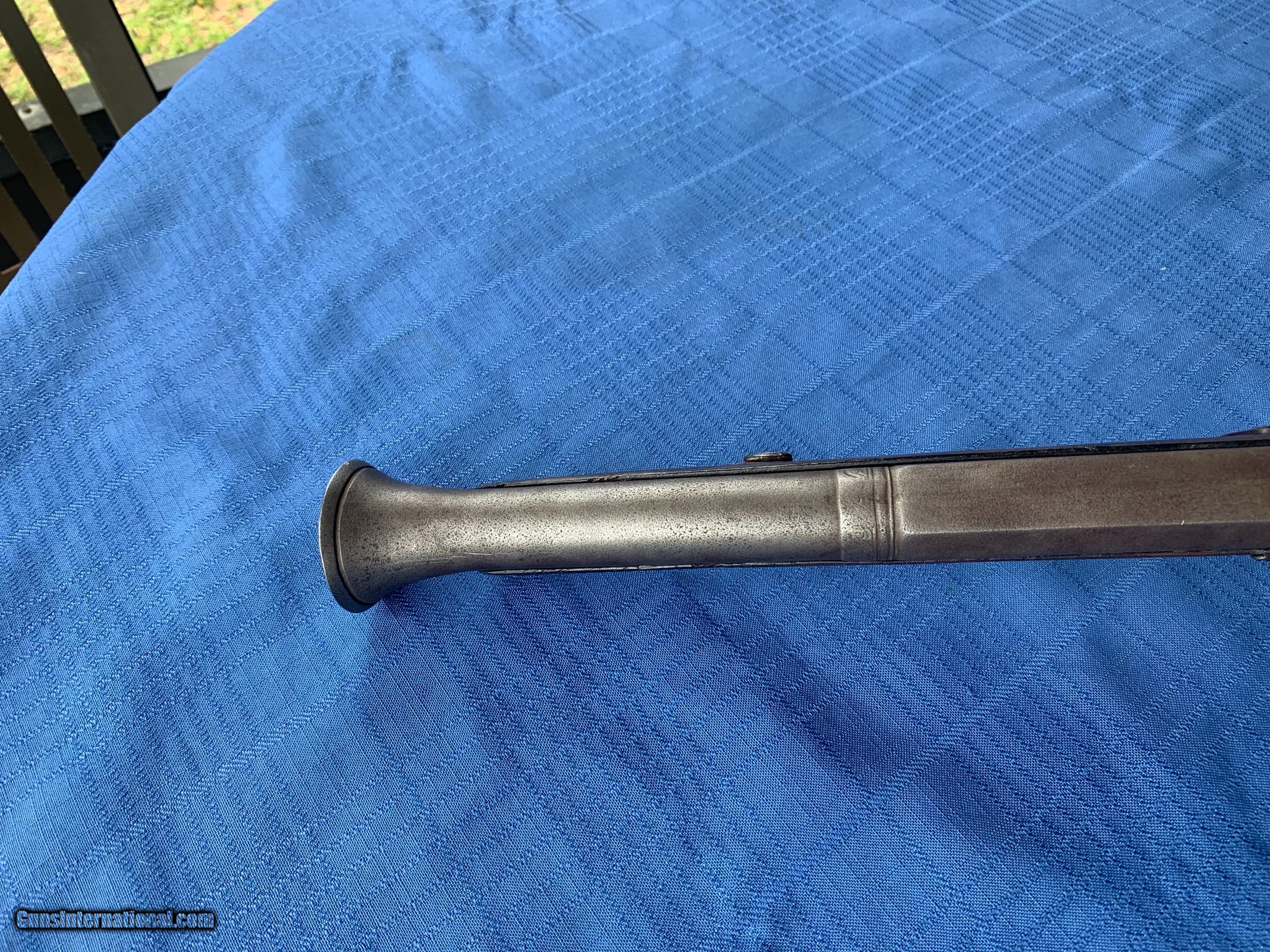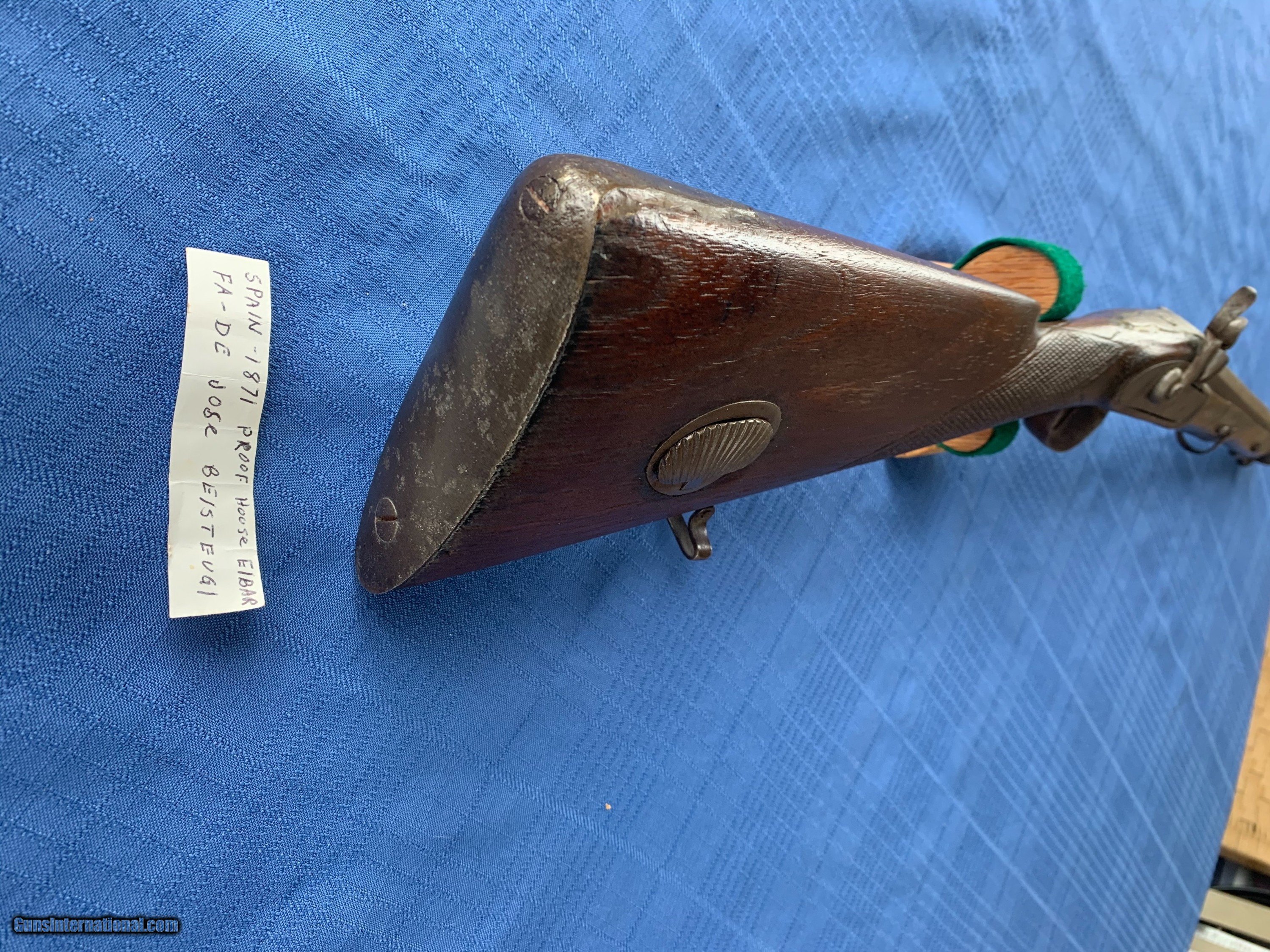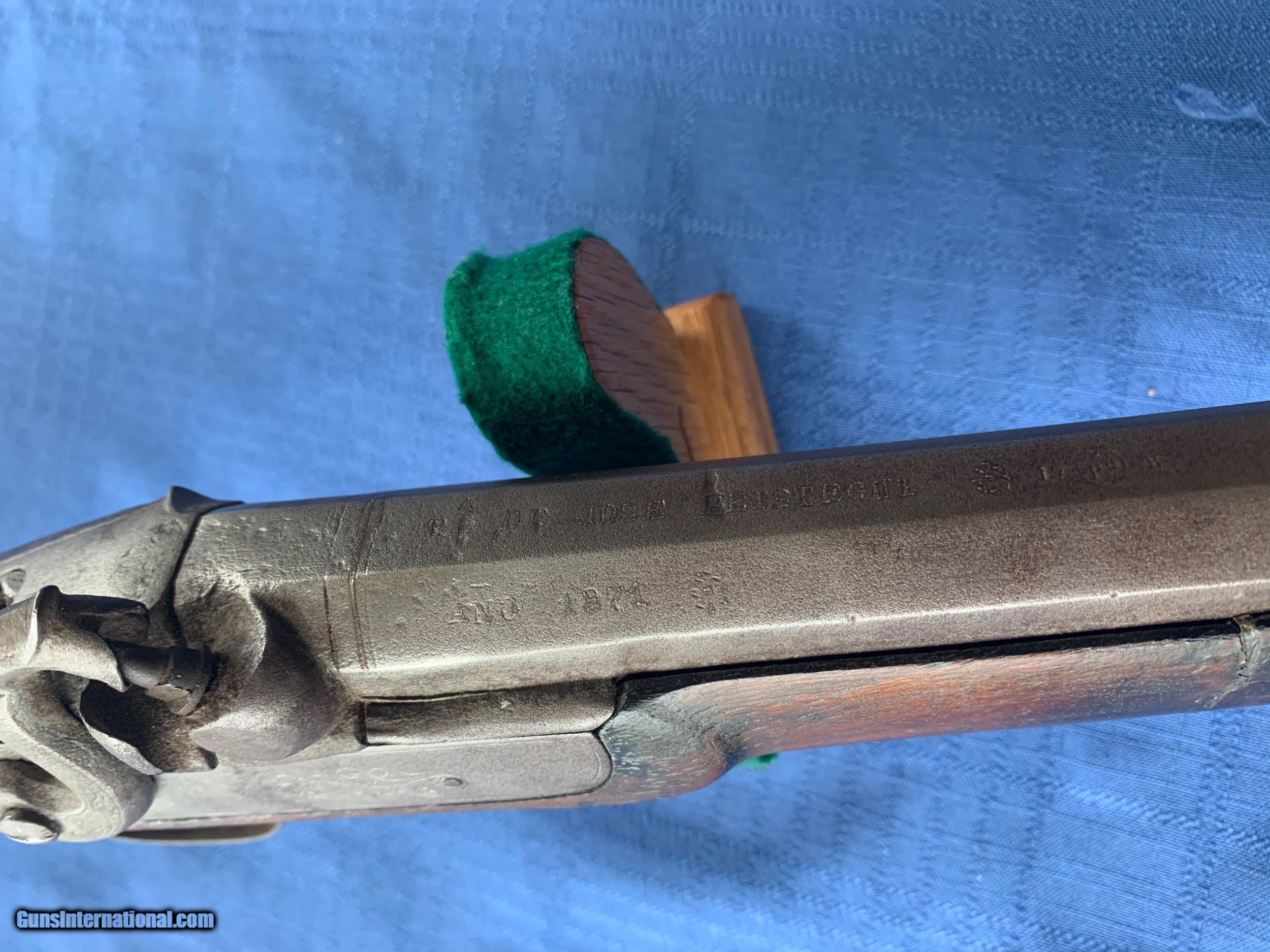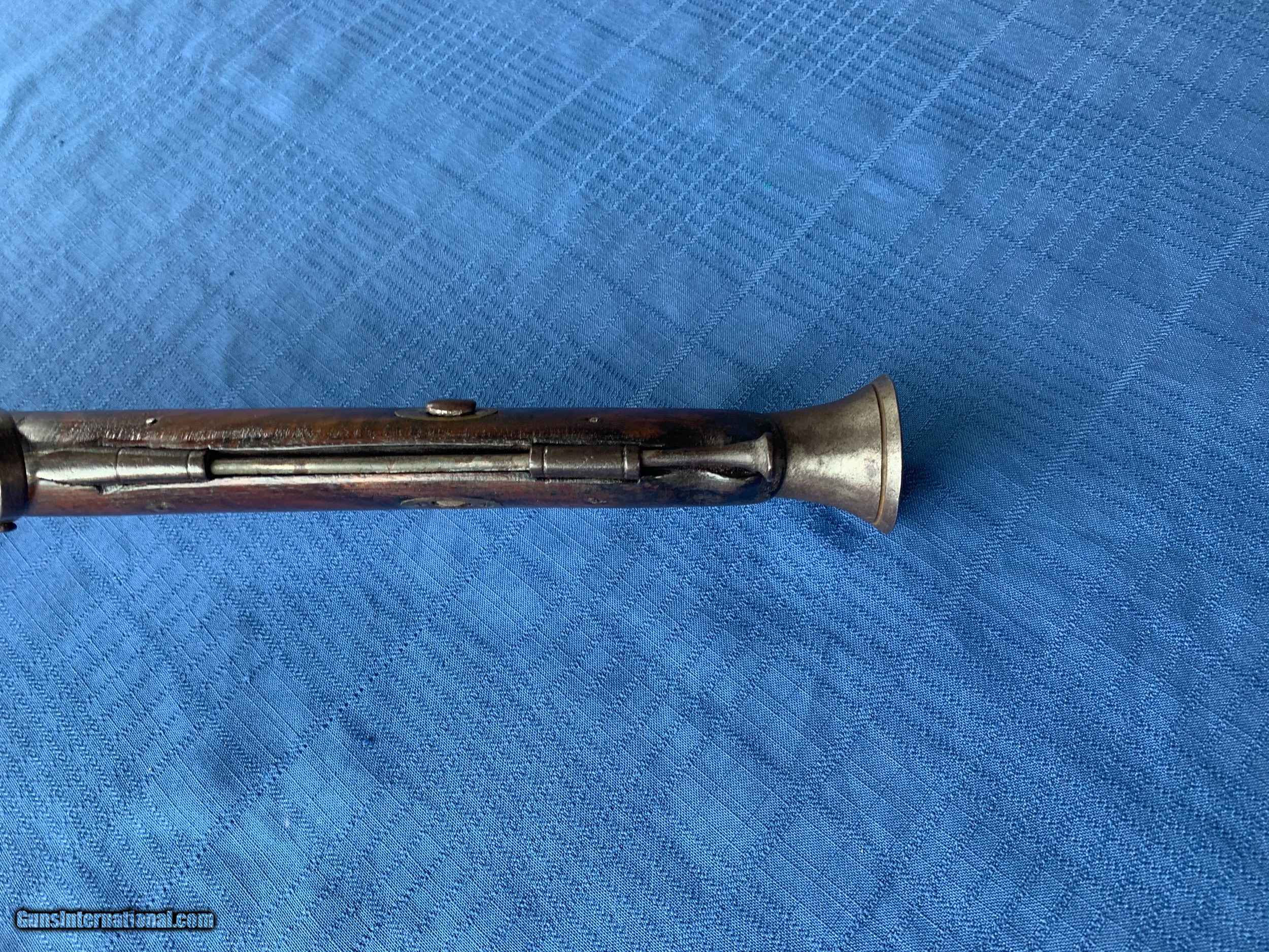 Description: Blunderbuss made in 1871 . Platinum inlays on top of Barrel . Spain . Gun was made in the White with no finish applied. Bore and mechanics are in very good original condition . Metal is sharp . Metal has become lightly porous but still sharp . Wood has been repaired in a few spots thru the years . Overall very good original walnut wood . Gun is a correct and original Blunderbuss! Very Good Example of a Very Rere gun made in 1871 . Please review my photos and email me with any questions ? 3 day inspection as allways . Thank you for looking Little Jo SOLD Antique: Yes |