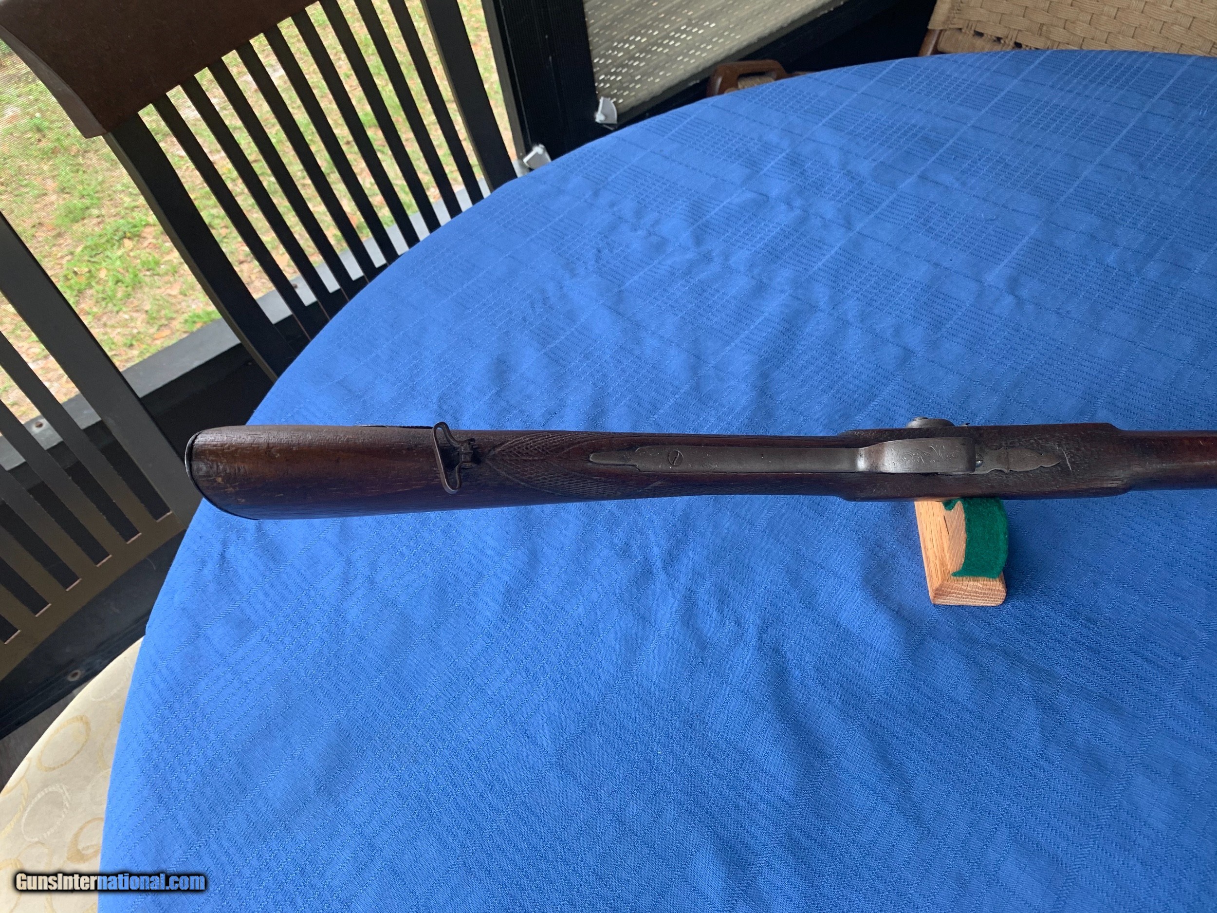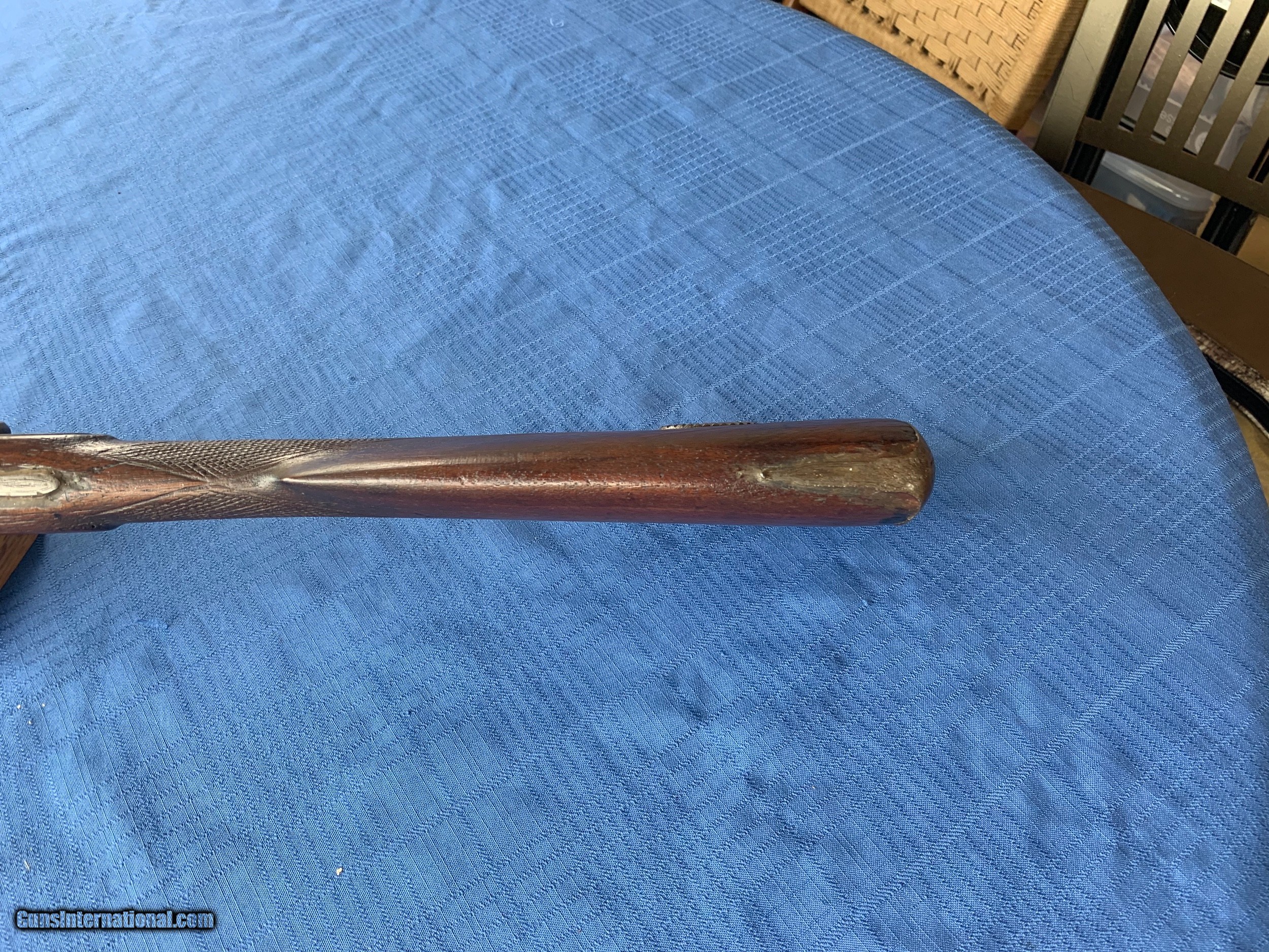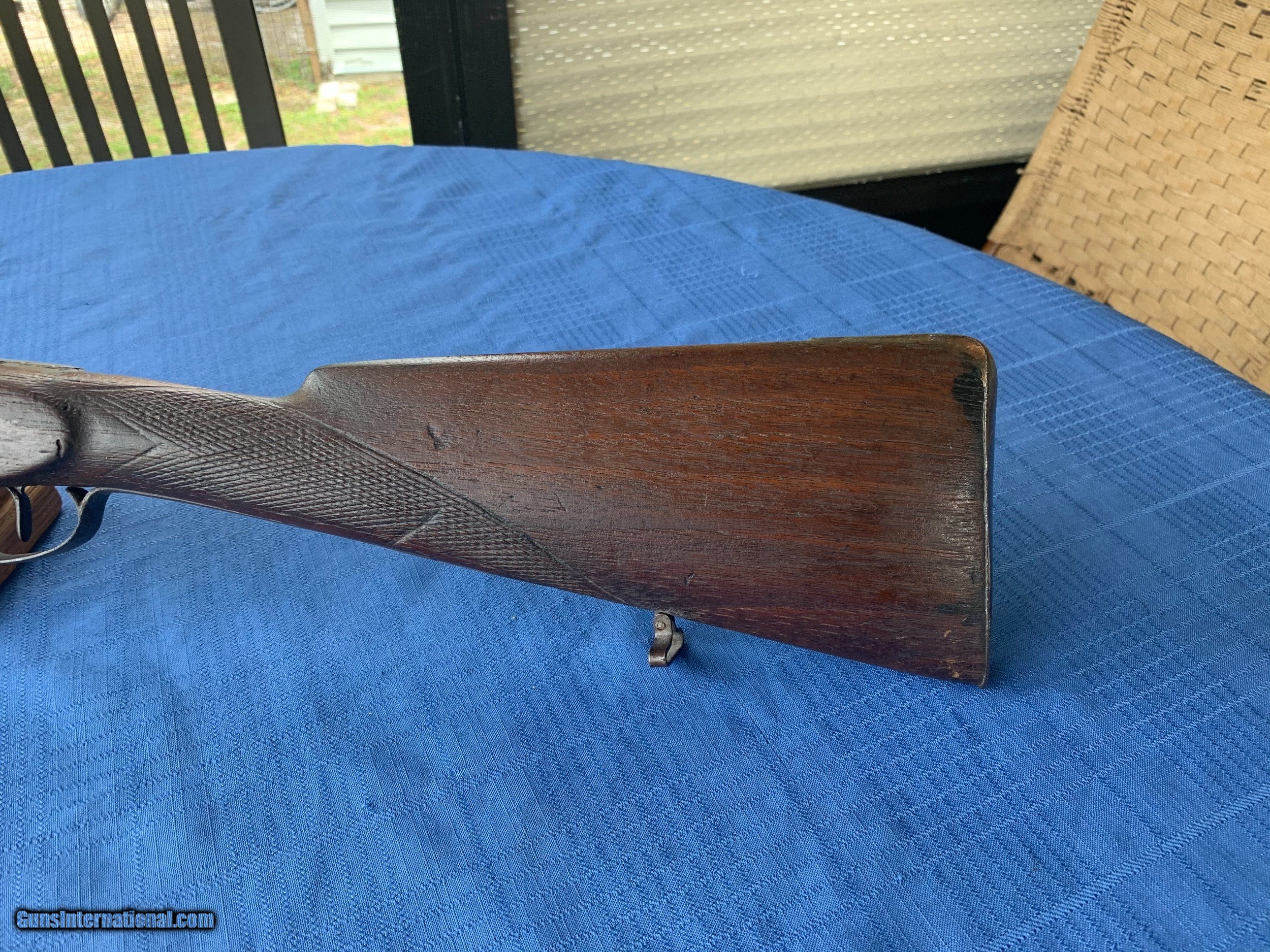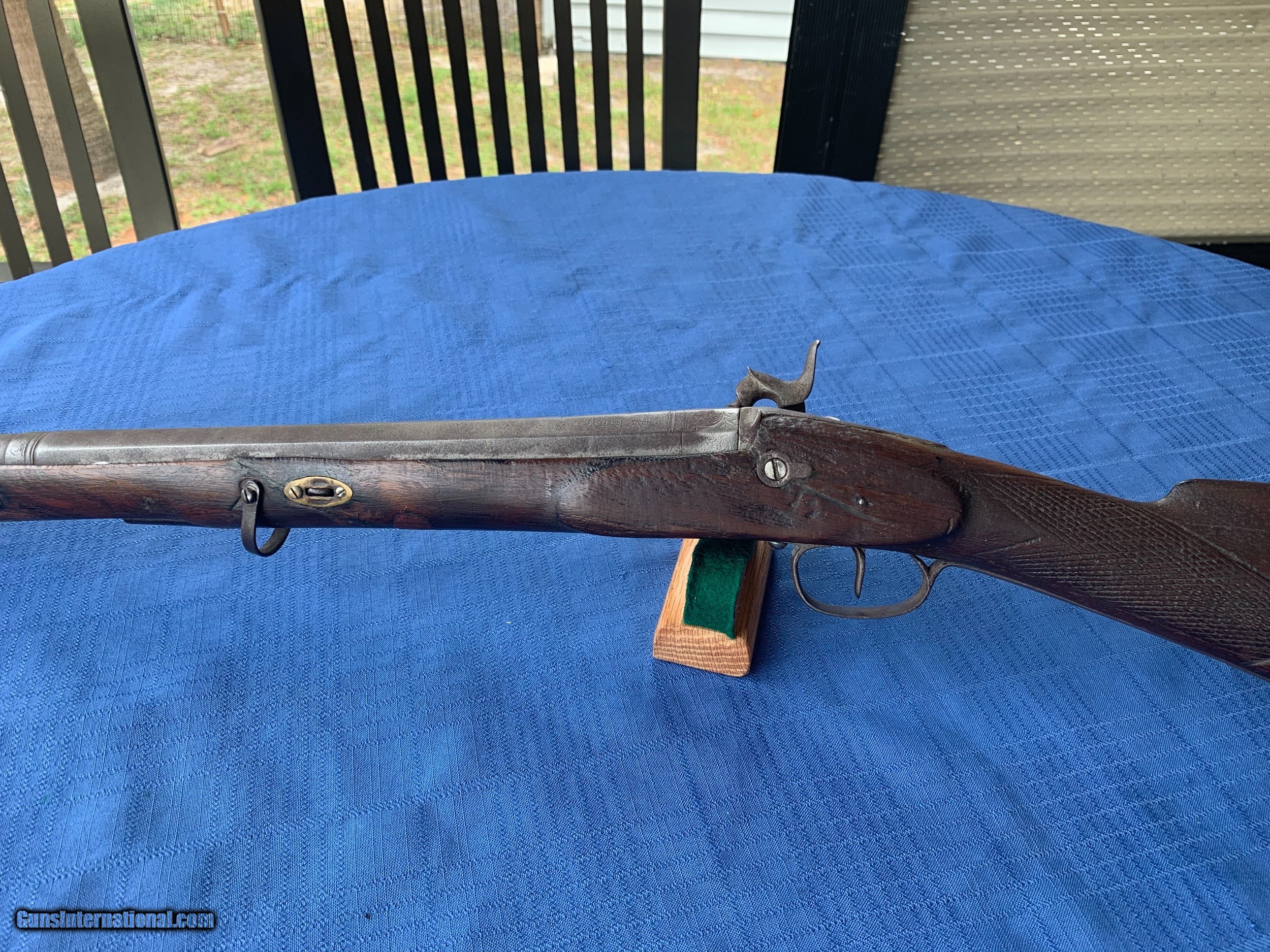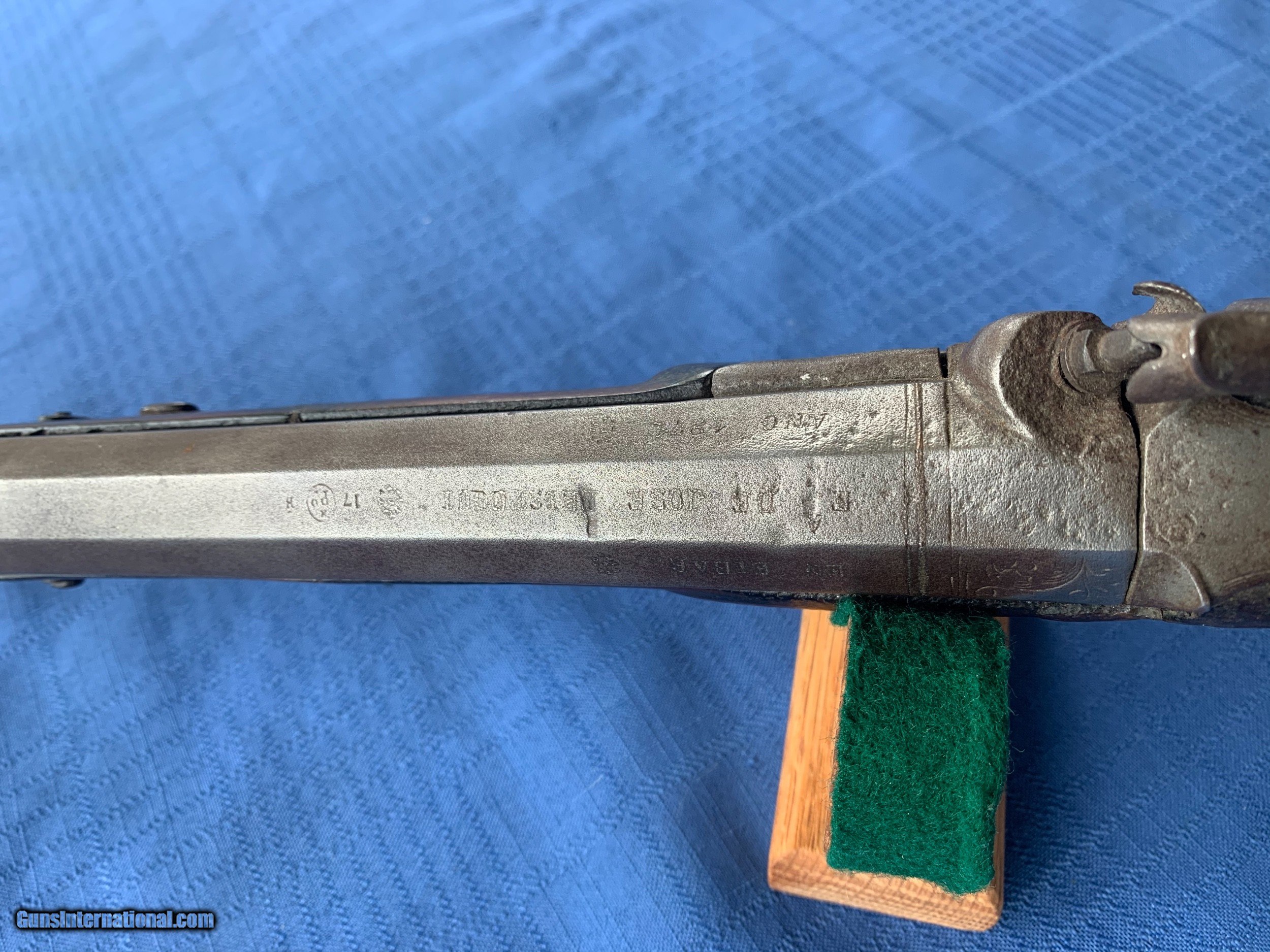 Description: Blunderbuss made in 1871 . Platinum inlays on top of Barrel . Spain . Gun was made in the White with no finish applied. Bore and mechanics are in very good original condition . Metal is sharp . Metal has become lightly porous but still sharp . Wood has been repaired in a few spots thru the years . Overall very good original walnut wood . Gun is a correct and original Blunderbuss! Very Good Example of a Very Rere gun made in 1871 . Please review my photos and email me with any questions ? 3 day inspection as allways . Thank you for looking Little Jo SOLD Antique: Yes |