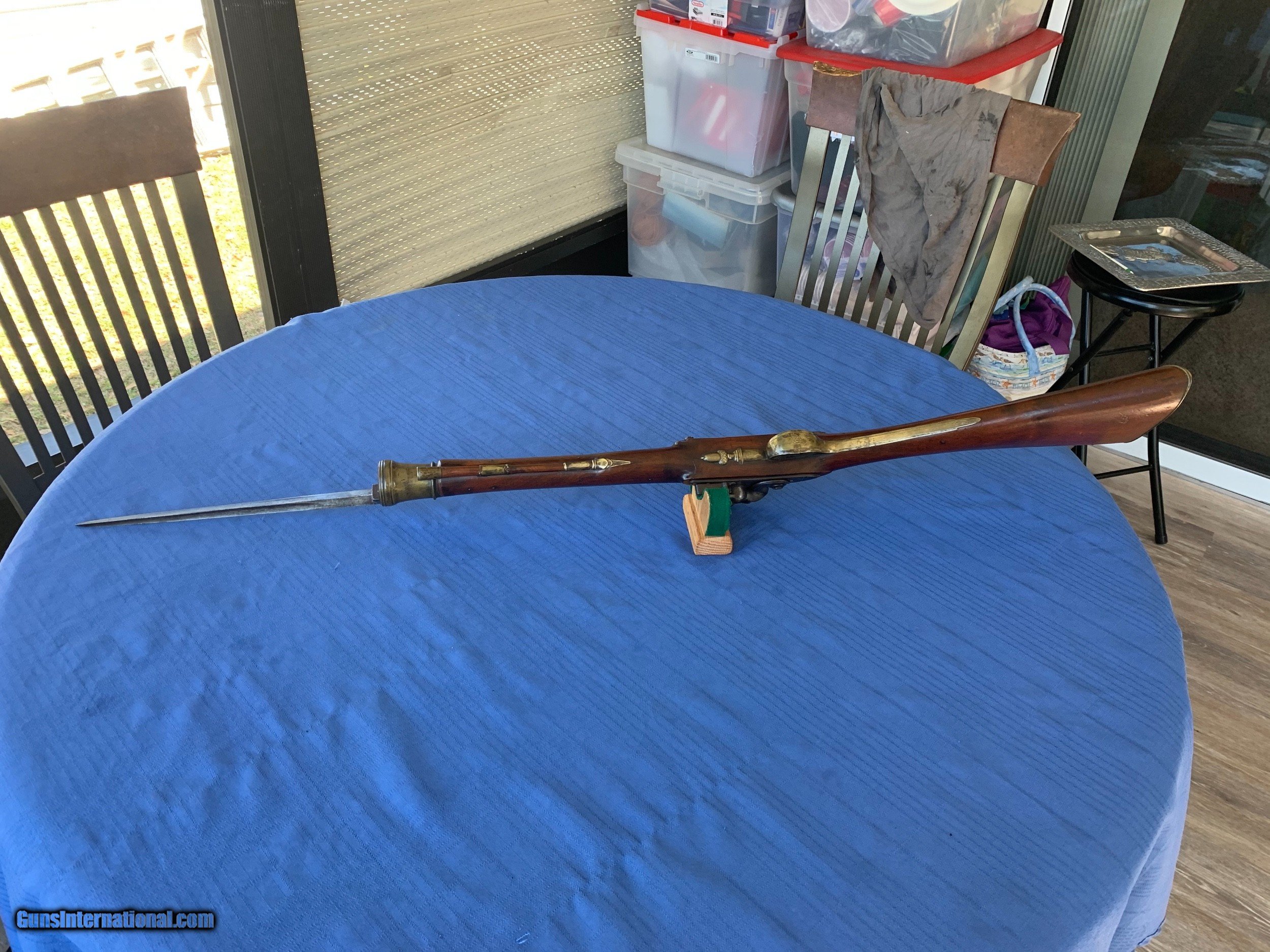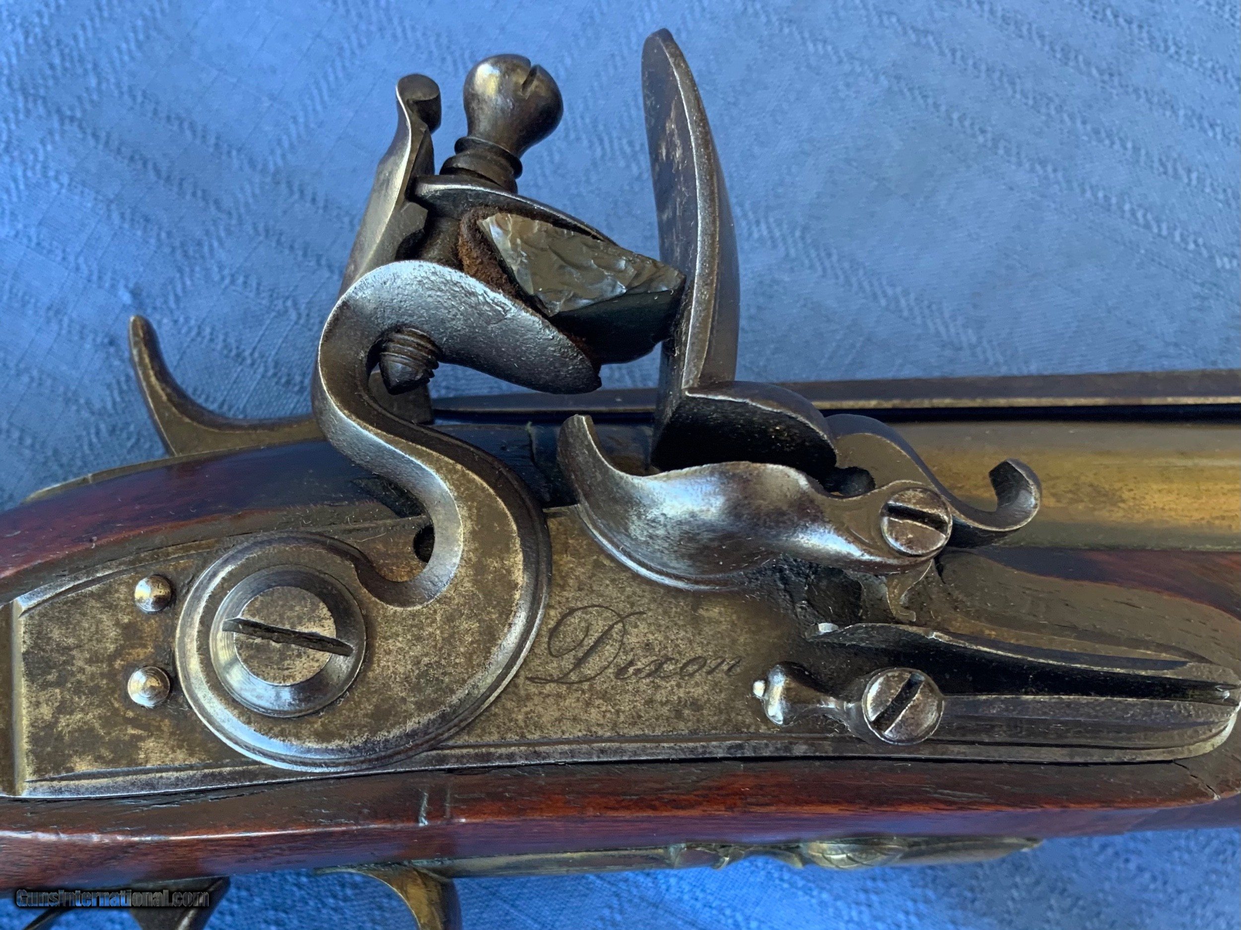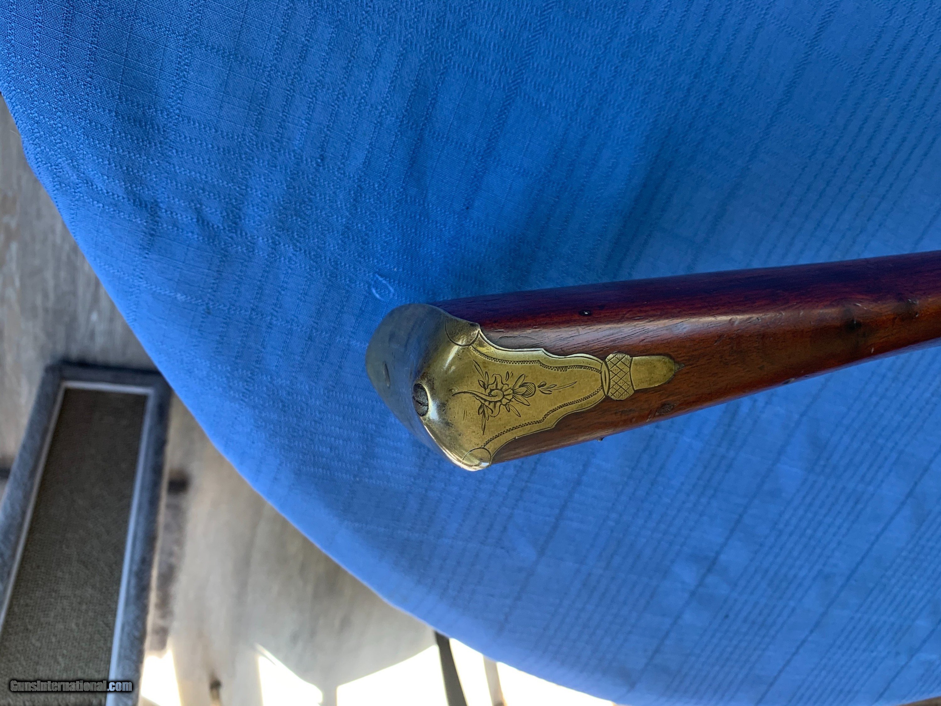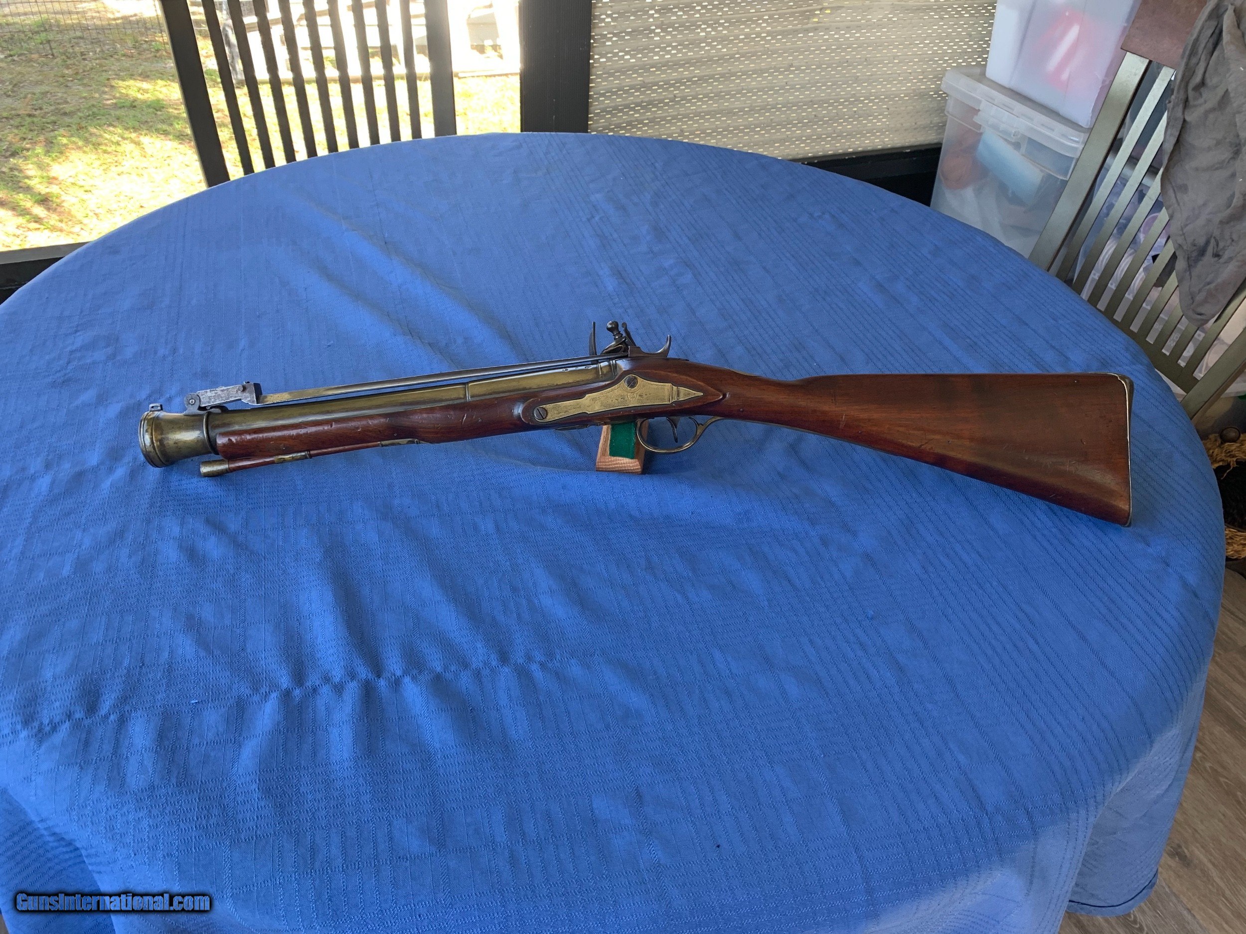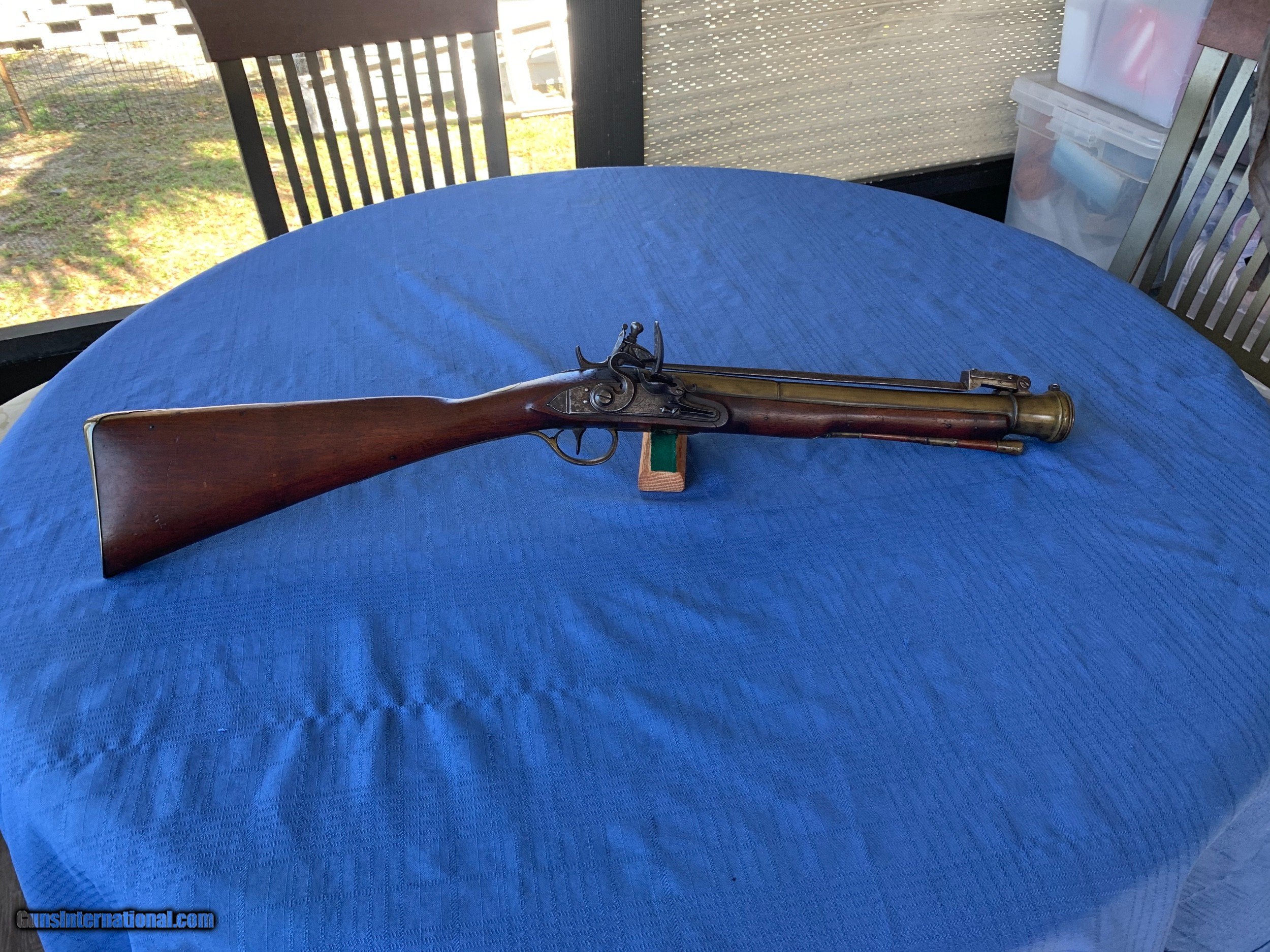 Description: Blunderbuss Flintlock rifle with large blade . Gun is Apx. 36" overall. Stunning Example of a1700's Blunderbuss with blade . Lock is marked Dixon . Barrel is proofed and marked Leicester . Barrel is Brass . Blade is steel. Walnut Burl wood stocks are in Excellent Plus Condition . Blade is in working order and locks into place . Gun is fully engraved. Engraving is crisp . Bore and mechanics are Excellent Plus Condition. Flint lock is in excellent working order . Gun is 100 percent correct and original ! Awsome Example of a rare 1700's Blunderbuss! Please review my photos and email me with any questions ? 3 day inspection as allways. Thank you for looking Little Jo SOLD Antique: Yes |