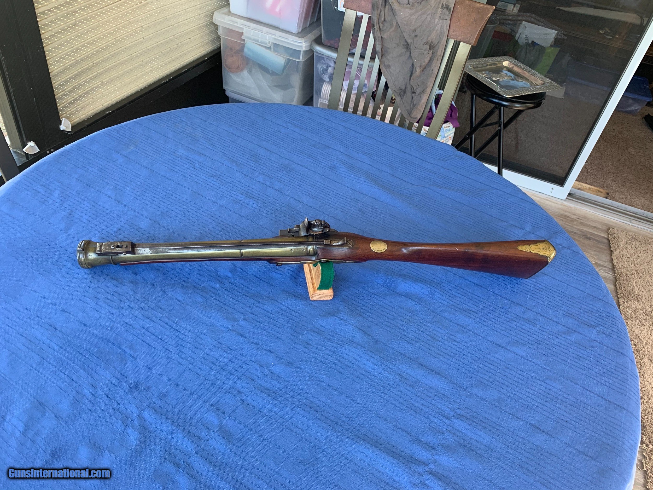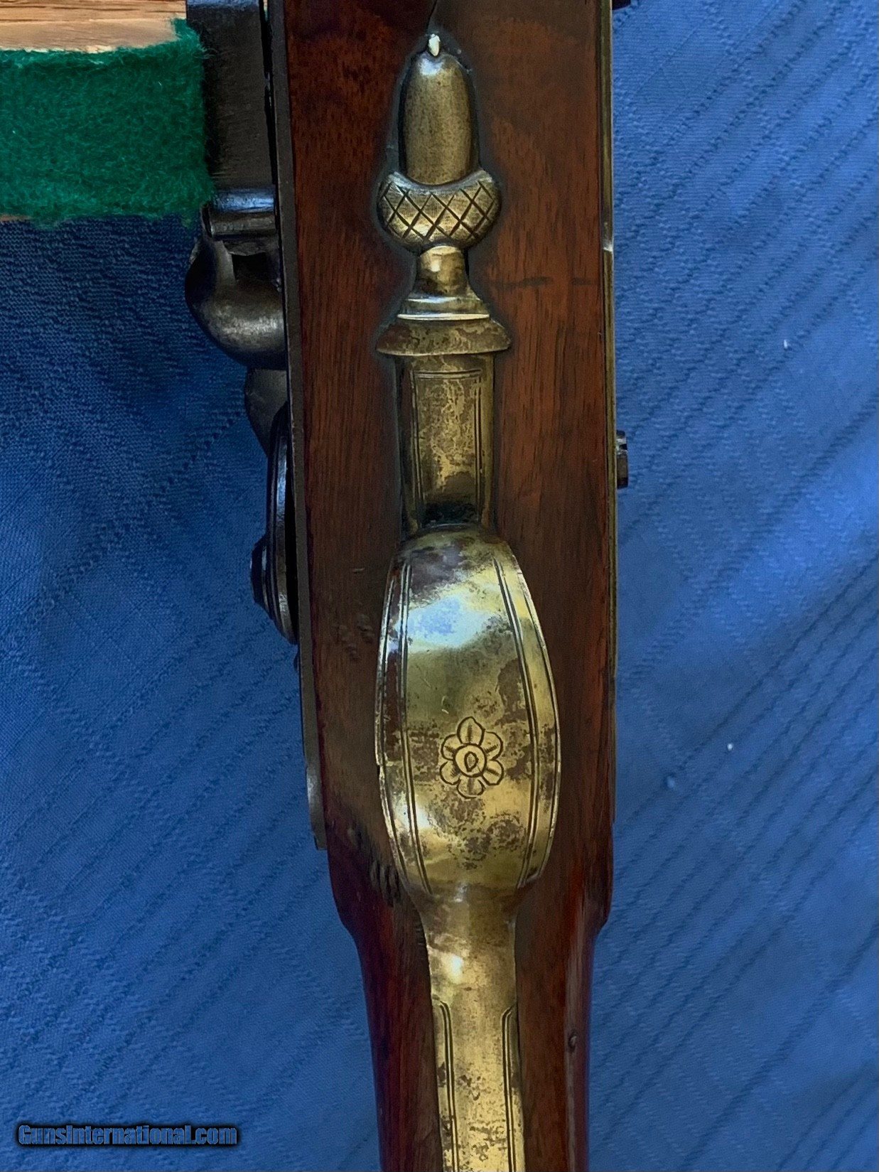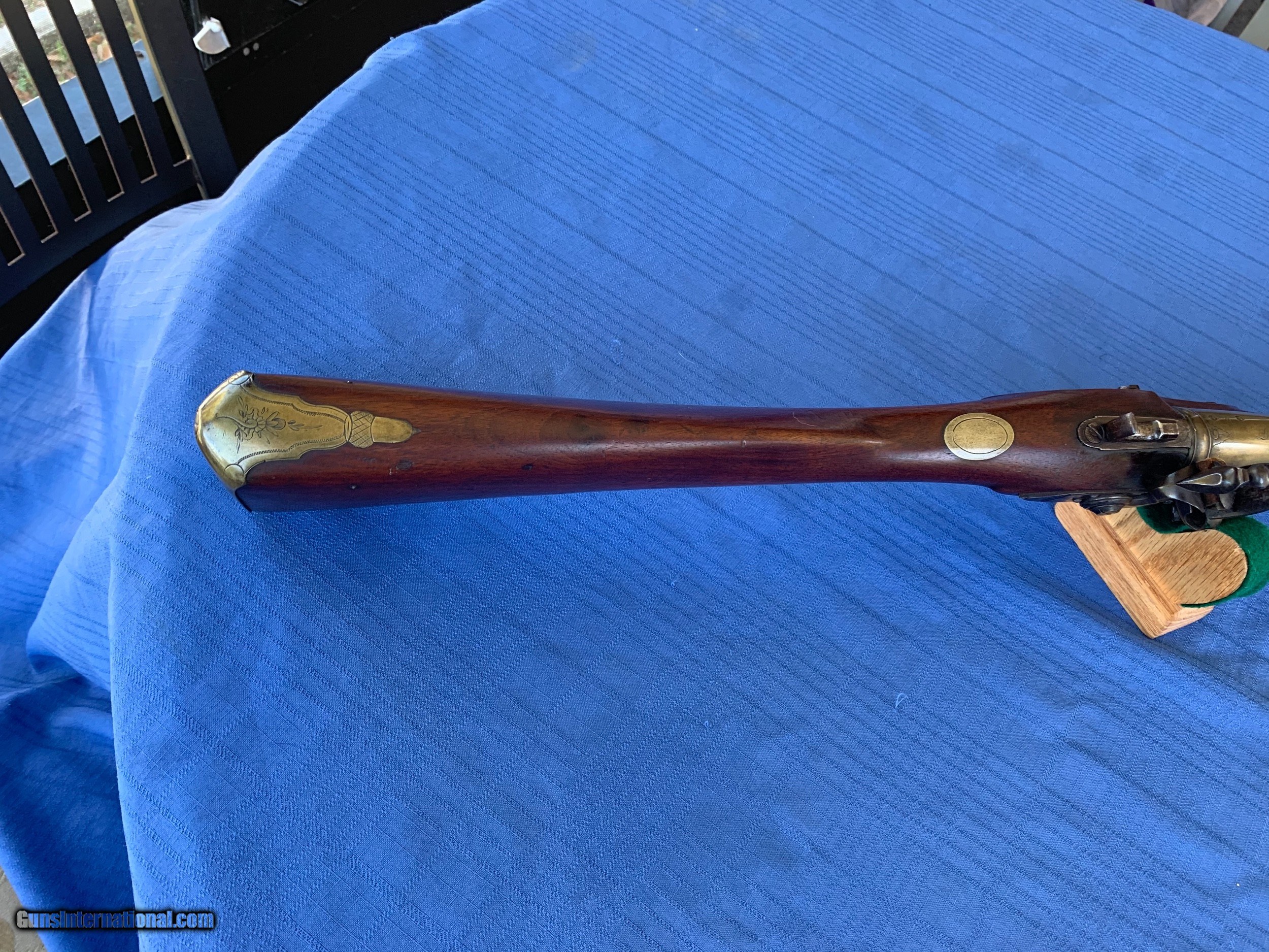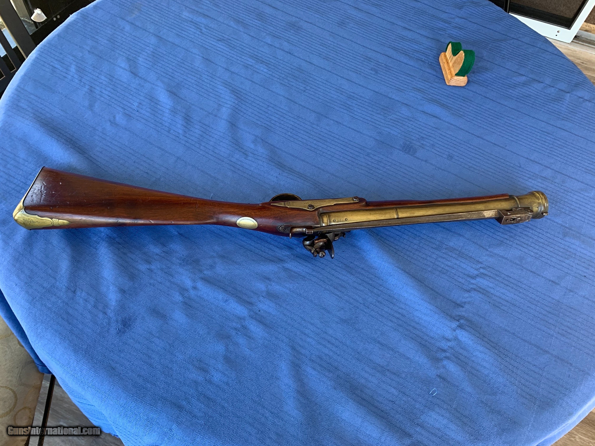 Description: Blunderbuss Flintlock rifle with large blade . Gun is Apx. 36" overall. Stunning Example of a1700's Blunderbuss with blade . Lock is marked Dixon . Barrel is proofed and marked Leicester . Barrel is Brass . Blade is steel. Walnut Burl wood stocks are in Excellent Plus Condition . Blade is in working order and locks into place . Gun is fully engraved. Engraving is crisp . Bore and mechanics are Excellent Plus Condition. Flint lock is in excellent working order . Gun is 100 percent correct and original ! Awsome Example of a rare 1700's Blunderbuss! Please review my photos and email me with any questions ? 3 day inspection as allways. Thank you for looking Little Jo SOLD Antique: Yes |
