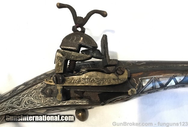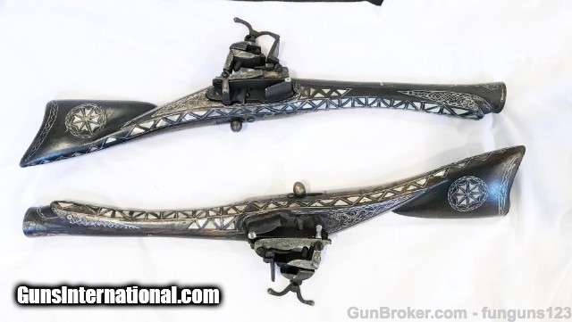 Description: BLUNDERBUSS MATCHING PAIR (VERY RARE) DUELING PISTOLS: I have never seen a pair like this anywhere. These Two Knee Guns are a Matched Pair in working condition. Ornate Mother of Pearl inlays with Silver etched into barrels. Each is only 18 1/2 inches in Length. Museum Quality: See pictures for best description: SOLD |