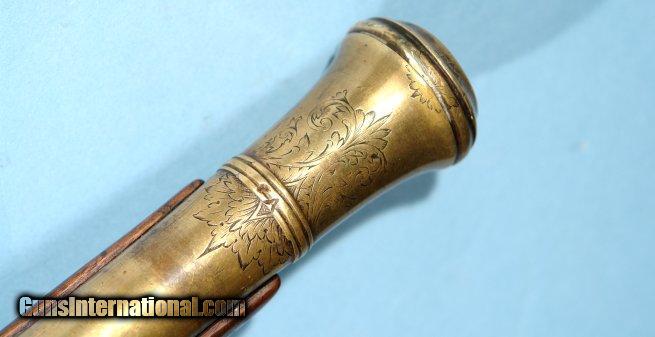 Description: FINE BRITISH GEORGE III FLINTLOCK BRASS BARREL BLUNDERBUSS BY S. NOCK OF LONDON. 29” overall with 14” part octagon, part round brass barrel with engraved breech and 1” cannon muzzle. Engraved on the top flat “S. NOCK LONDON” for Samuel Nock. Plain convex lock and hammer of Brown Bess style popular in the late 1700’s. Brass mounts with original floral engraving. Trigger guard with nicely formed “Acorn” finial.. Walnut stock with checkered wrist. Original rosewood ramrod with horn tip. Fine overall with crisp engraving and maker signature on barrel. Lock with dark patina and stock with the original finish. Perfect working order. Very nice, high quality example by one of London’s well known makers. SOLD Antique: Yes |