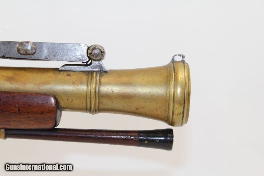 Description: Late-18th Century IRISH Flintlock BLUNDERBUSS By Farrell McDermot of Dublin, Ireland! Here we present an antique Irish Flintlock Blunderbuss by Farrell McDermot, made circa the late-18th Century at 1 Abbey Street in Dublin, Ireland. This short, handy and devastating weapon was intended for close quarters combat. It features a short overall length of about 29 inches accomplished by having a 14 inch barrel and 13 inch length of pull. The bore is a gaping 1-1/4 inches at the bell. These were employed most notably from horseback or at sea, for use by the likes of postal workers for boarding ships or repelling boarders. One can also imagine keeping this in the house just as many keep shotguns for that purpose today. In addition to a single blast of shot, this one features a deadly snap bayonet that folds down along the top of the barrel and is retained under spring tension so that when the retainer is slid rearward, the bayonet launches smartly into a locked position, ready for use. This piece is made of brass, one of the original “gun metals”, with the lock and mechanical parts being of iron. The lock is maker marked “McDERMOT”. The top flat of the barrel is marked “DUBLIN”, along with the much later addition of Dublin Constabulary registration markings. The overall condition is fine. The brass bears a mild patina. The markings are clear. The stock is in fine shape. The bore is smooth and dark with age. The action is excellent. This is a superb defensive or offensive firearm from late-18th Century Dublin! Own the original! This is a legitimate antique and not a reproduction. Barrel is 14 inches. Caliber: 1-1/8 inches at the Bell Overall condition as seen in photos. Very Fast. Very Safe. FREE SHIPPING WORLDWIDE. Delivered directly to your door by express mail! Guaranteed AUTHENTIC & Includes CERTIFICATE OF AUTHENTICITY. ancestryguns $7350 #8517 SOLD Antique: Yes |
