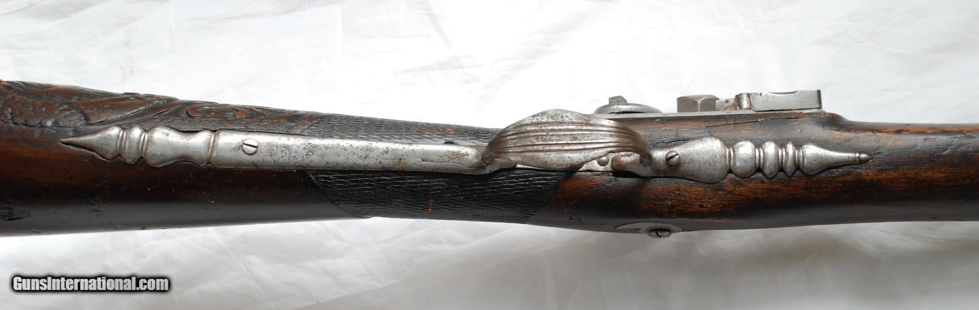 Description: This massive flintlock blunderbuss measures about 36" overall and a bore that measures over 2" in diameter at the muzzle. Stock is carved, steel mounts and hammer are nicely chiseled. Action works. No license needed except NJ and NYC residents. SOLD Antique: Yes |