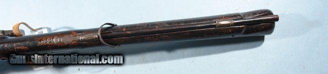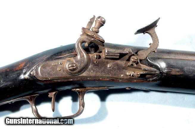 Description: RARE NORTHERN ITALIAN MILITARY SNAPHAUNCE BLUNDERBUSS CA. MID 1700’S. Large size Blunderbuss measuring 38” overall . Round 23 ½” blued iron sighted barrel with 1 ½” bore diameter at the muzzle. Iron mounts and plain dark stained wood stock. Highly articulated lock with all the original parts. Stock with the original dark lacquer stain. Metal with dark grey original attic patina. Very good stock with old glued repair forward of the lock using the original piece. Lock in working order. Even has the original wood ramrod and sling swivel. SOLD Antique: Yes |