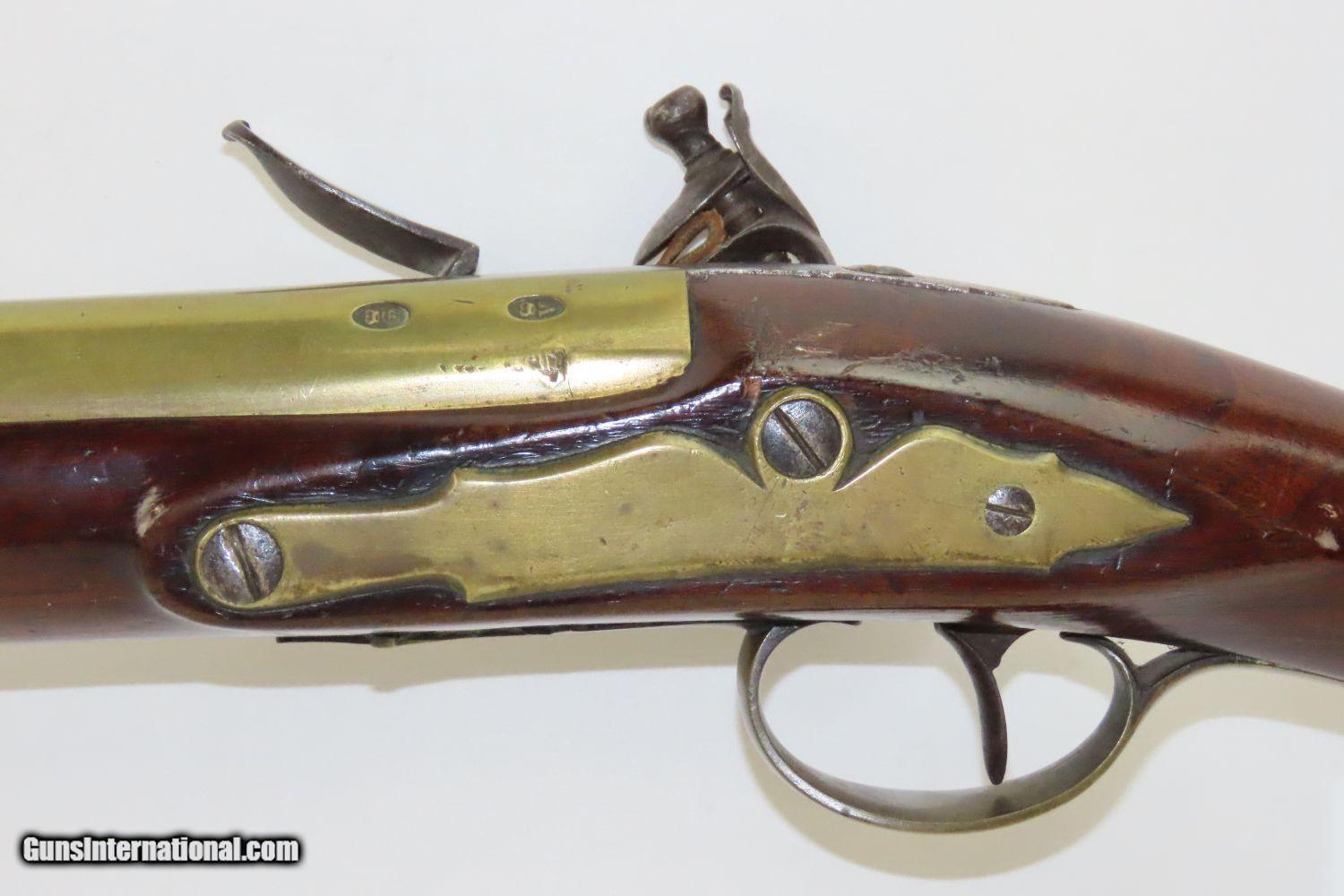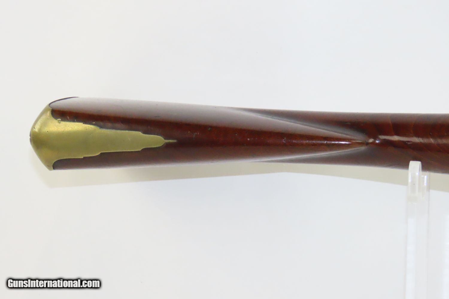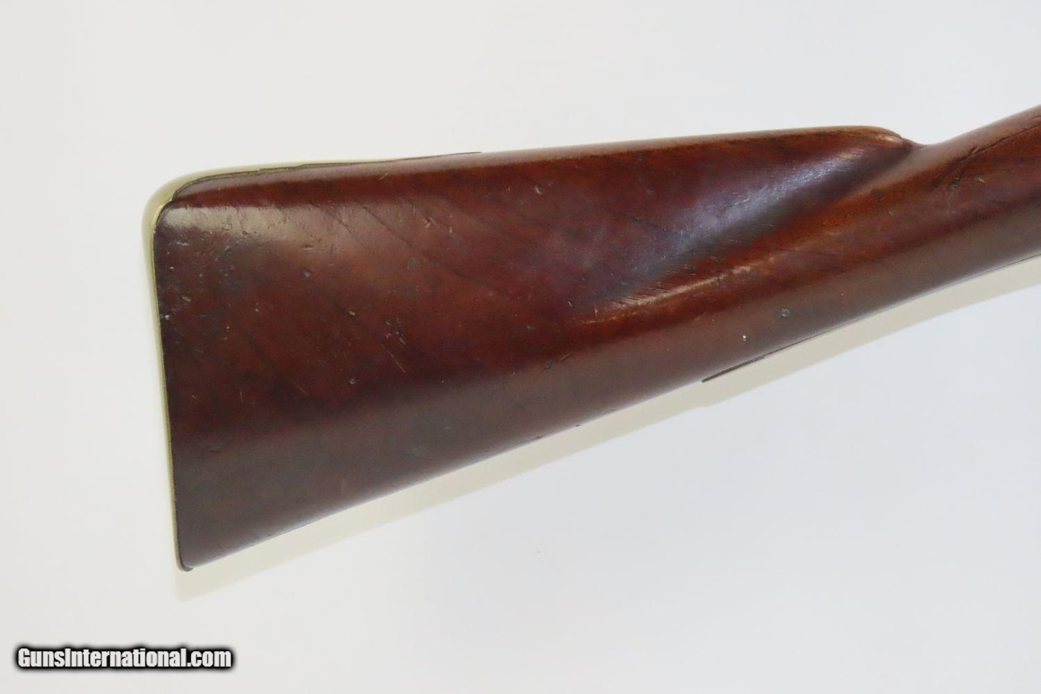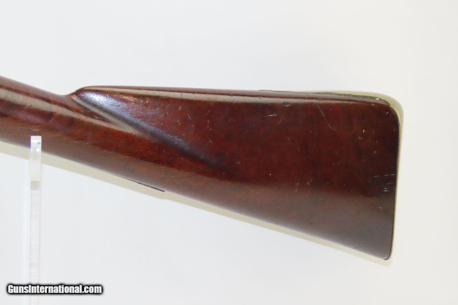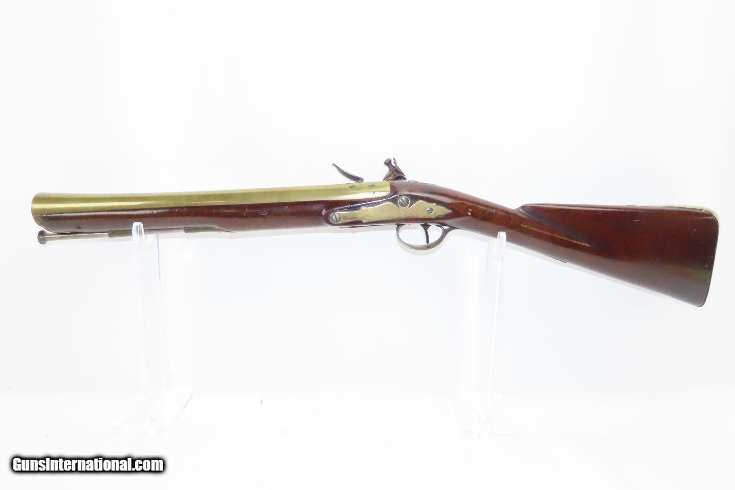 Description: REVOLUTIONARY WAR Era ROBERT WOGDON Made British FLINTLOCK BLUNDERBUSS DESIREABLE 240+ Year Old BRASS BARRELED Close Range Weapon! Here we present an antique Robert Wogdon marked English Brass Barreled Blunderbuss, made circa 1780 in London, England. Robert Wogdon was active circa 1760-1803 and is perhaps best remembered for having made the pistols used in the infamous duel between Aaron Burr and Alexander Hamilton that resulted in the death of the latter. This one features a 15 ¼-inch brass barrel marked “London” on top. The left side bears 1740 style proof marks. The trigger guard, side plate, and butt plate are likewise made of brass. The iron lock is signed “Wogdon”. This piece is of a more formal military style and would have been used in that capacity. The muzzle diameter swells to nearly 2 ¼ inches at the bell. This is a substantial piece of hardware! The overall condition is very good. The action is excellent. The bore is in good shape: smooth with some verdigris. The stock has a short crack along the grain on the left side of the muzzle. This is a wonderful example of a British blunderbuss from the period of the American Revolution! Own the original! This is a legitimate antique and not a reproduction. Barrel is 15-1/4 inches. Overall condition as seen in photos. Very Fast. Very Safe. FREE SHIPPING WORLDWIDE. Delivered directly to your door by express mail! Guaranteed AUTHENTIC & Includes CERTIFICATE OF AUTHENTICITY. ancestryguns $7195 #200921 SOLD Antique: Yes |