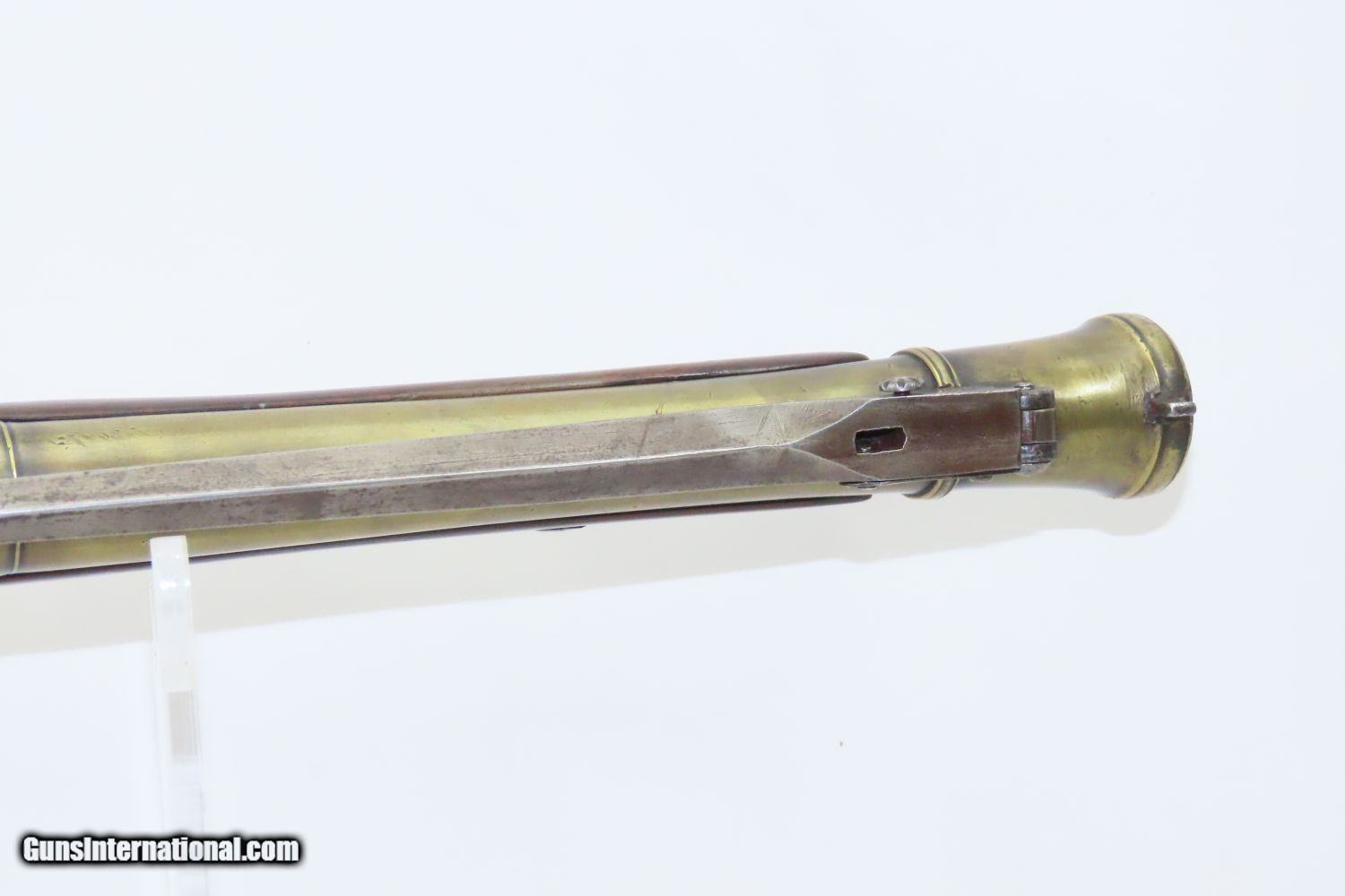Description: SNAP BAYONET 1810s Antique BRASS BARRELED British Flintlock BLUNDERBUSS 200+ Year Old Close Range Weapon! Here we present an antique British Brass Barrel Flintlock Blunderbuss with a Snap Bayonet, made circa the early 1800s in London, England. The blunderbuss is a firearm with a short, large caliber barrel. They are flared at the muzzle, frequently throughout the entire bore, and used with shot and other projectiles. The blunderbuss is commonly considered to be an early predecessor of the modern day shotgun, with similar military and defensive use. It was effective only at short range, lacking accuracy at long range. A blunderbuss in handgun form was called a Dragon, and it is from this that the term “Dragoon” evolved. The flintlock blunderbuss was the original coach gun, being a short, handy and devastating weapon at close range. It was used in many capacities, not the least of which were for Naval boarding or defending vessels, stagecoach and messenger companies, home defense and more. The flintlock blunderbuss was the original coach gun, being a short, handy and devastating weapon at close range. It was capable of firing up to 20 buckshot in front of 120 grains of black powder, according to Spencer Tucker in Almanac of American Military History, Volume 1. The overall condition is good. The brass parts remain smooth, while the iron lock and barrel tang are a bit pitted. Birmingham proofs on the barrel along with the letter “R”. The stock has been repaired throughout, especially around the wrist, then refinished. The action remains strong and still gives a spark. The bore is smooth and in good condition. A very neat piece of firearms history from early-19th Century England! Own the original! This is a legitimate antique and not a reproduction. Barrel is 14-1/4 inches Overall condition as seen in photos. Very Fast. Very Safe. FREE SHIPPING WORLDWIDE. Delivered directly to your door by express mail! Guaranteed AUTHENTIC & Includes CERTIFICATE OF AUTHENTICITY. ancestryguns $4475 #210404 SOLD Antique: Yes |
