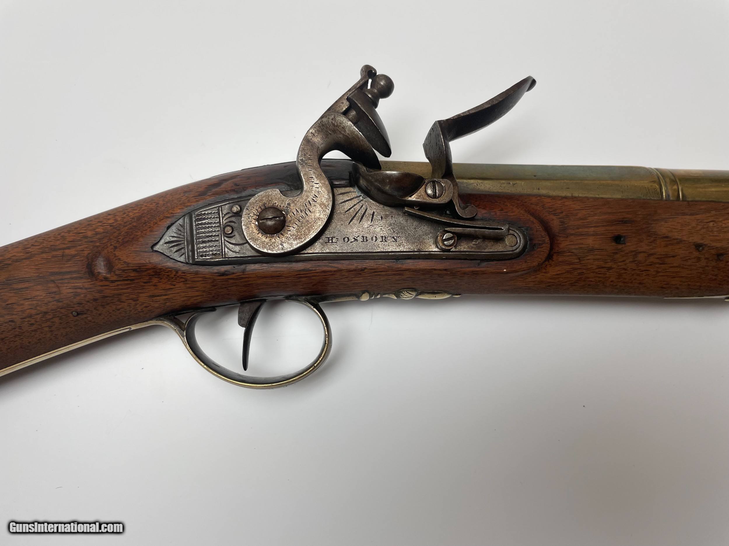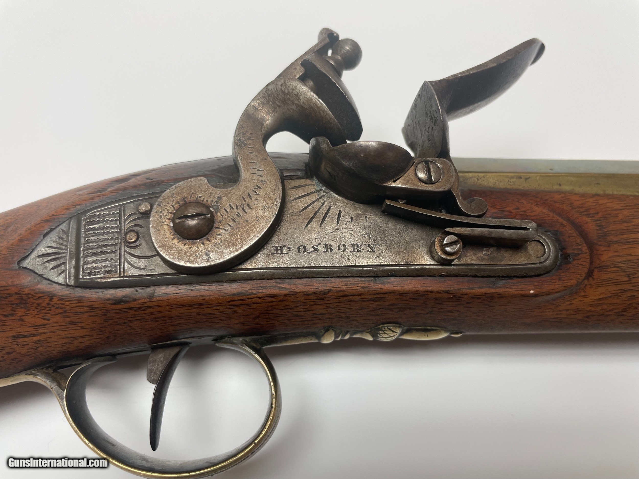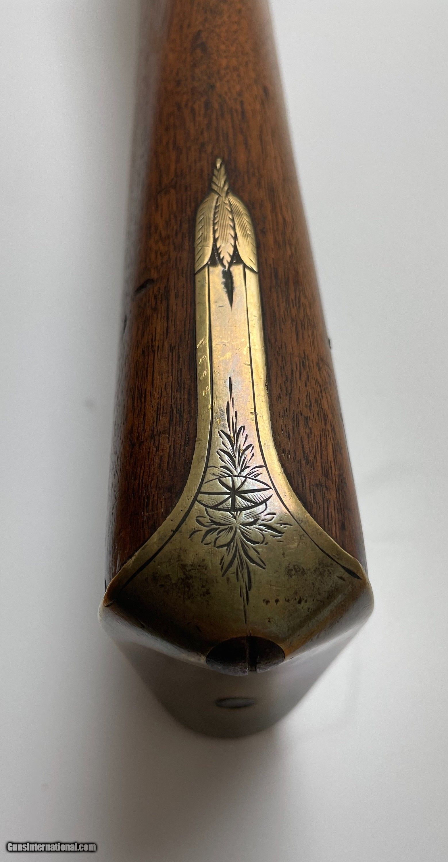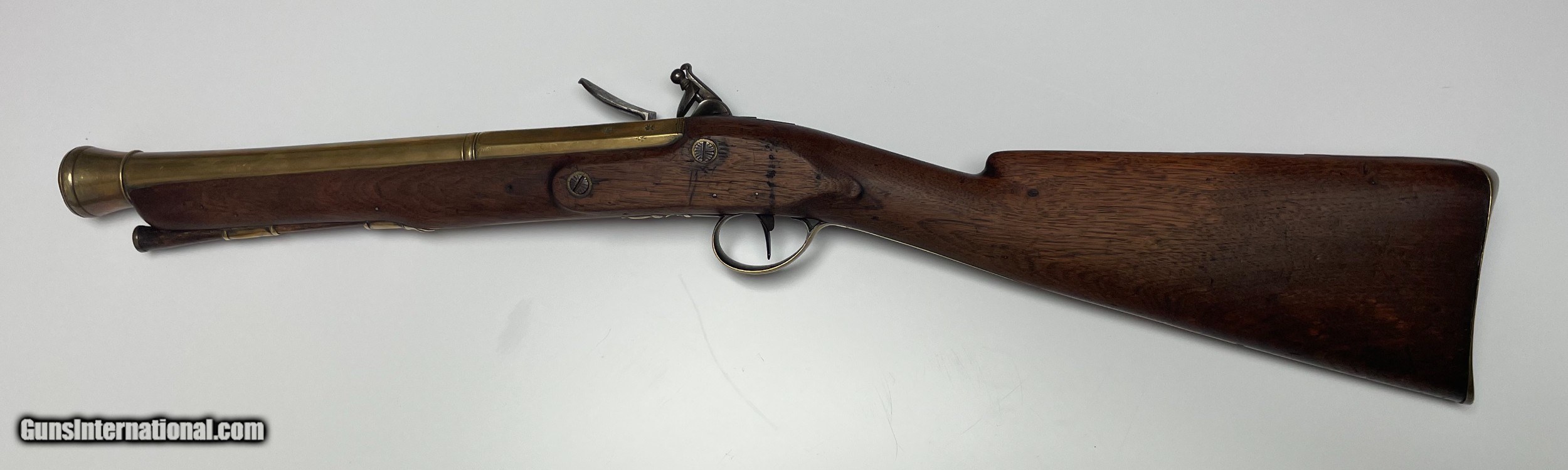 Description: I inherited this gun. Unfortunately I am in no way an expert in antique guns. I just know the person it came from was an avid antique gun collector and this was his most cherished piece and is very desirable. I also received a couple other guns (a cemetery gun and a pepperbox pistol) that I will be listing soon too I think. If I have anything wrong here please let me know, or if you have any other additional information on this gun I would love to hear it and add it here. Late eighteenth, early nineteenth-century brass barrelled blunderbuss, a type that was carried by British troops during the American Revolution. The brass barrel bears the stamping “London”, and has two proof stamps. The lockplate is marked “H Osborn”(Henry Osborn) The gun is in unbelievable shape for being over 200 years old! Very minimal wear. The mechanism operates crisply as it should. Beautiful detailed engraving throughout the gun. I have not tried to clean or polish anything. The original patina is excellent! Everything appears to be original right down to all the engraved fasteners. The cannon style brass barrel is round, 14” long and the bore of the muzzle is 1.25” in diameter. Measuring the bore is not easy due to the tapered barrel but using some clay and a caliper it appears to be 70 caliber. Total overall length of 29.5” This would have been an extremely expensive gun in its time and would have most likely only been owned by a high ranking officer or a wealthy person. From my research I believe I priced it for a quick sale. USA and Canada shipping included. The gun is available for local viewing in Victoria BC. Henry Osborn was an eminent gun and sword manufacturer of Bordesley Birmingham. He passed away in 1827. Few weapons inspire imagination about the sounds of a Revolutionary War battlefield like a blunderbuss. The name blunderbuss comes from the Dutch word donderbus, which translates to “thunder box”—an accurate description of the surprisingly explosive effect this gun created. A precursor to the shotgun, the flintlock blunderbuss was often issued to cavalry or naval troops for use in close-quarter combat. Also know as the one of the first picks for coach drivers protecting their haul. It could clear threats in a large area with just one shot. With a short, large-caliber barrel just 14 inches and a flared muzzle, the blunderbuss was best for use at short range, to scatter shot or other damaging projectiles. SOLD |