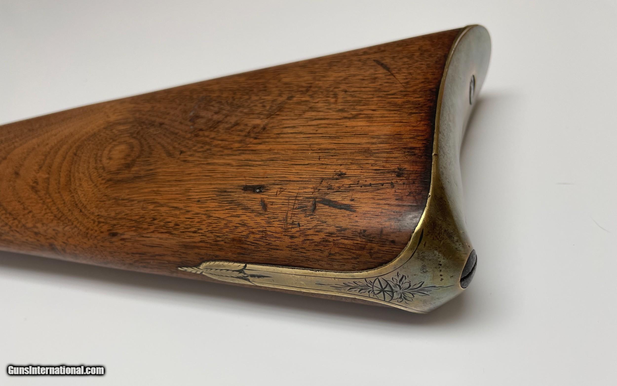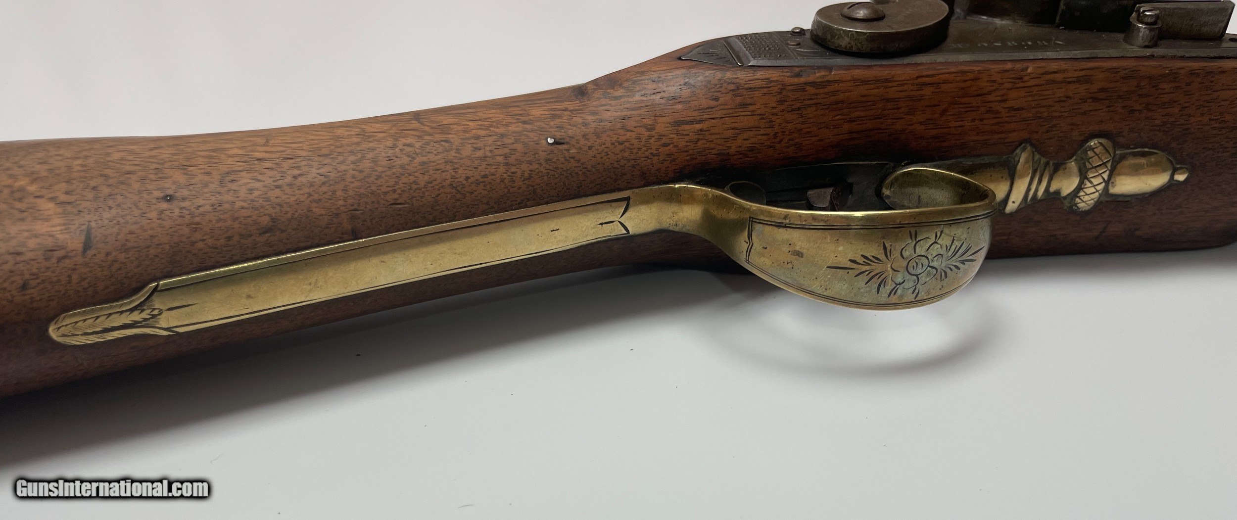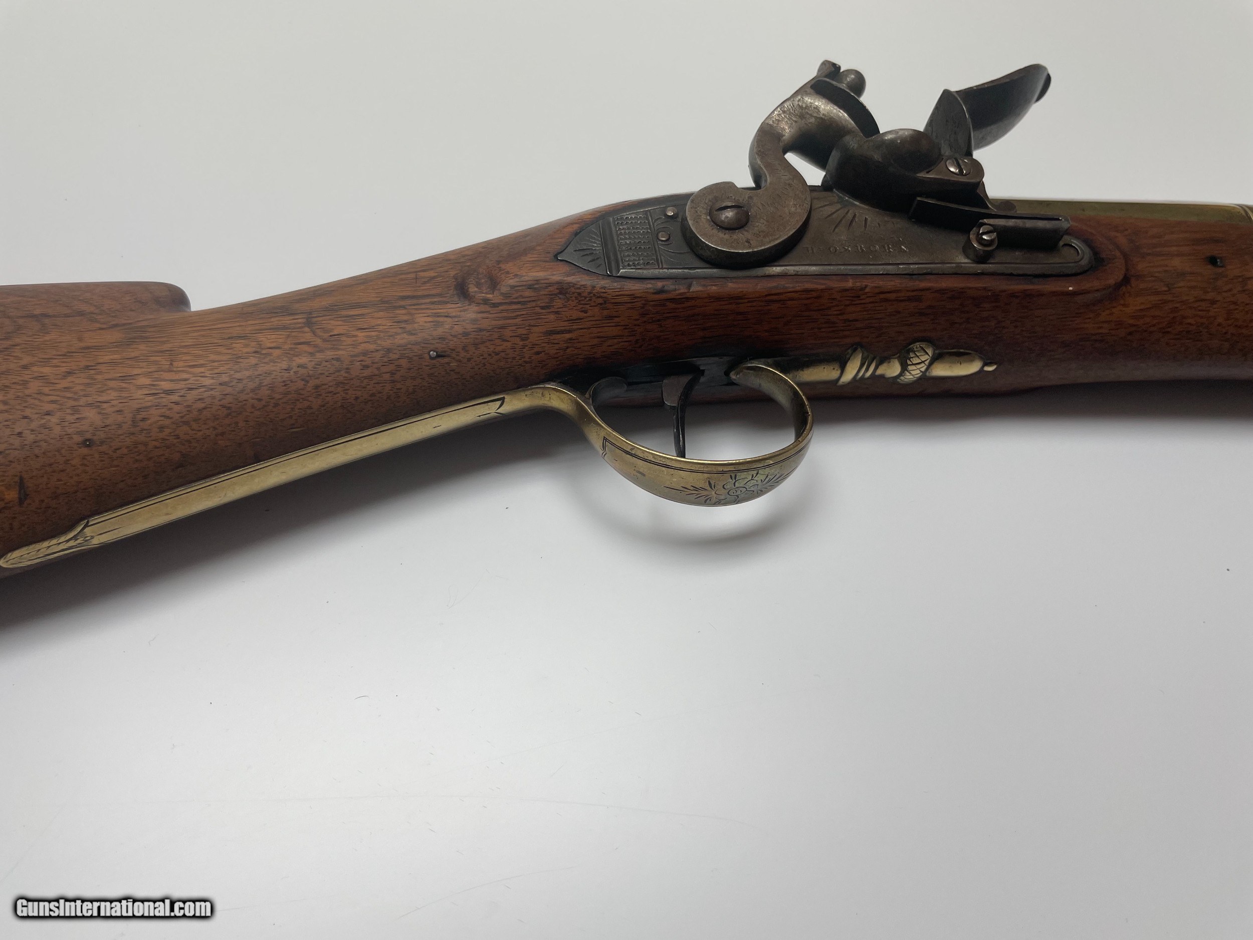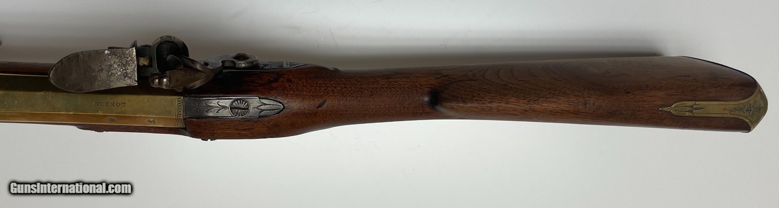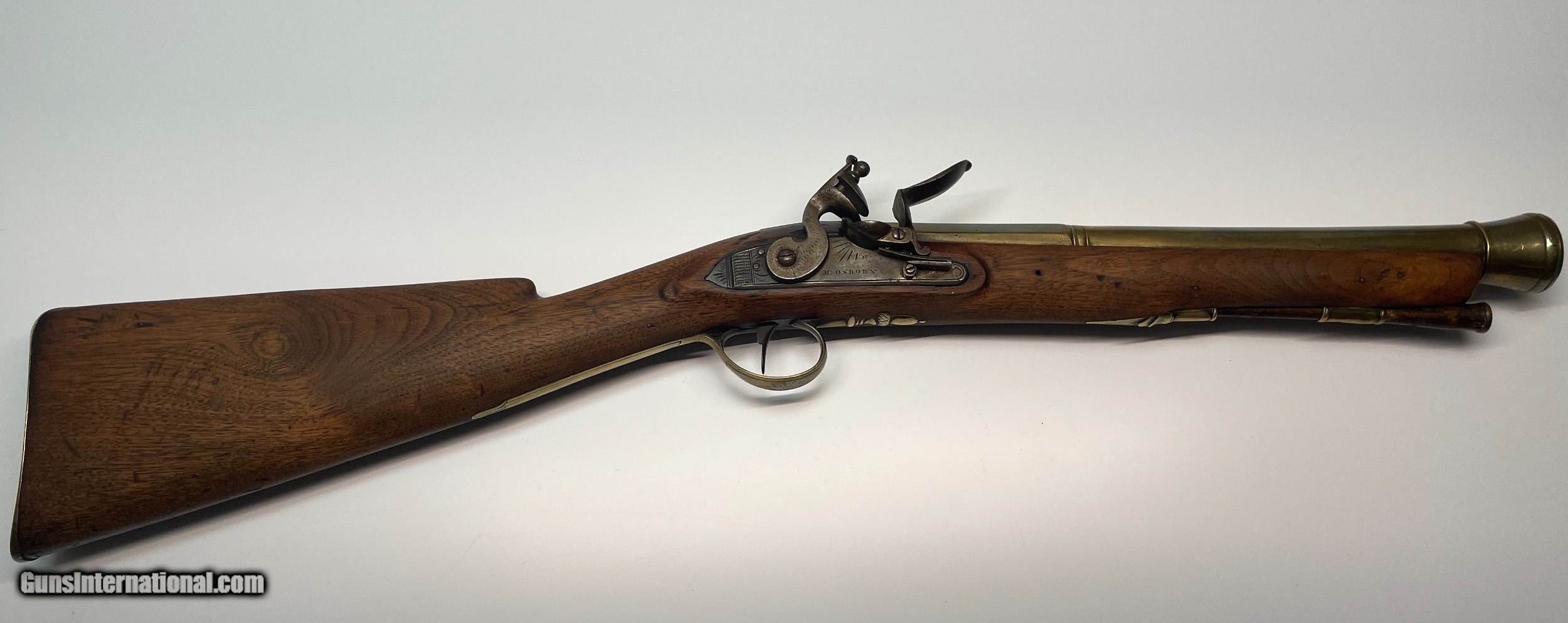 Description: I inherited this gun. Unfortunately I am in no way an expert in antique guns. I just know the person it came from was an avid antique gun collector and this was his most cherished piece and is very desirable. I also received a couple other guns (a cemetery gun and a pepperbox pistol) that I will be listing soon too I think. If I have anything wrong here please let me know, or if you have any other additional information on this gun I would love to hear it and add it here. Late eighteenth, early nineteenth-century brass barrelled blunderbuss, a type that was carried by British troops during the American Revolution. The brass barrel bears the stamping “London”, and has two proof stamps. The lockplate is marked “H Osborn”(Henry Osborn) The gun is in unbelievable shape for being over 200 years old! Very minimal wear. The mechanism operates crisply as it should. Beautiful detailed engraving throughout the gun. I have not tried to clean or polish anything. The original patina is excellent! Everything appears to be original right down to all the engraved fasteners. The cannon style brass barrel is round, 14” long and the bore of the muzzle is 1.25” in diameter. Measuring the bore is not easy due to the tapered barrel but using some clay and a caliper it appears to be 70 caliber. Total overall length of 29.5” This would have been an extremely expensive gun in its time and would have most likely only been owned by a high ranking officer or a wealthy person. From my research I believe I priced it for a quick sale. USA and Canada shipping included. The gun is available for local viewing in Victoria BC. Henry Osborn was an eminent gun and sword manufacturer of Bordesley Birmingham. He passed away in 1827. Few weapons inspire imagination about the sounds of a Revolutionary War battlefield like a blunderbuss. The name blunderbuss comes from the Dutch word donderbus, which translates to “thunder box”—an accurate description of the surprisingly explosive effect this gun created. A precursor to the shotgun, the flintlock blunderbuss was often issued to cavalry or naval troops for use in close-quarter combat. Also know as the one of the first picks for coach drivers protecting their haul. It could clear threats in a large area with just one shot. With a short, large-caliber barrel just 14 inches and a flared muzzle, the blunderbuss was best for use at short range, to scatter shot or other damaging projectiles. SOLD |