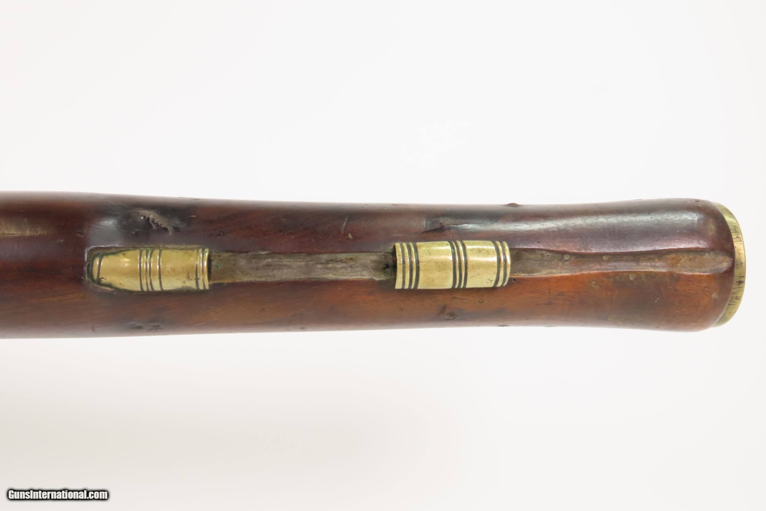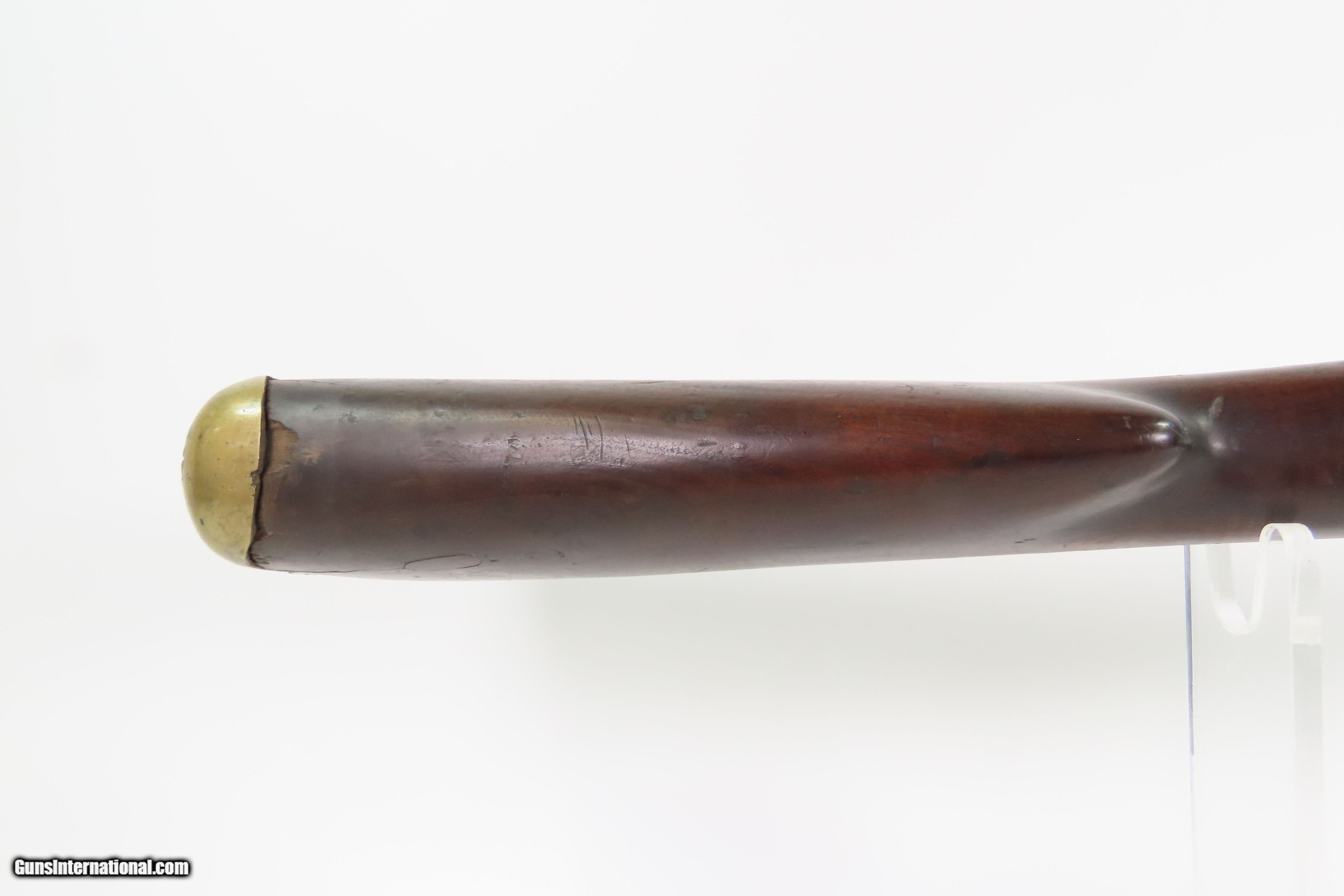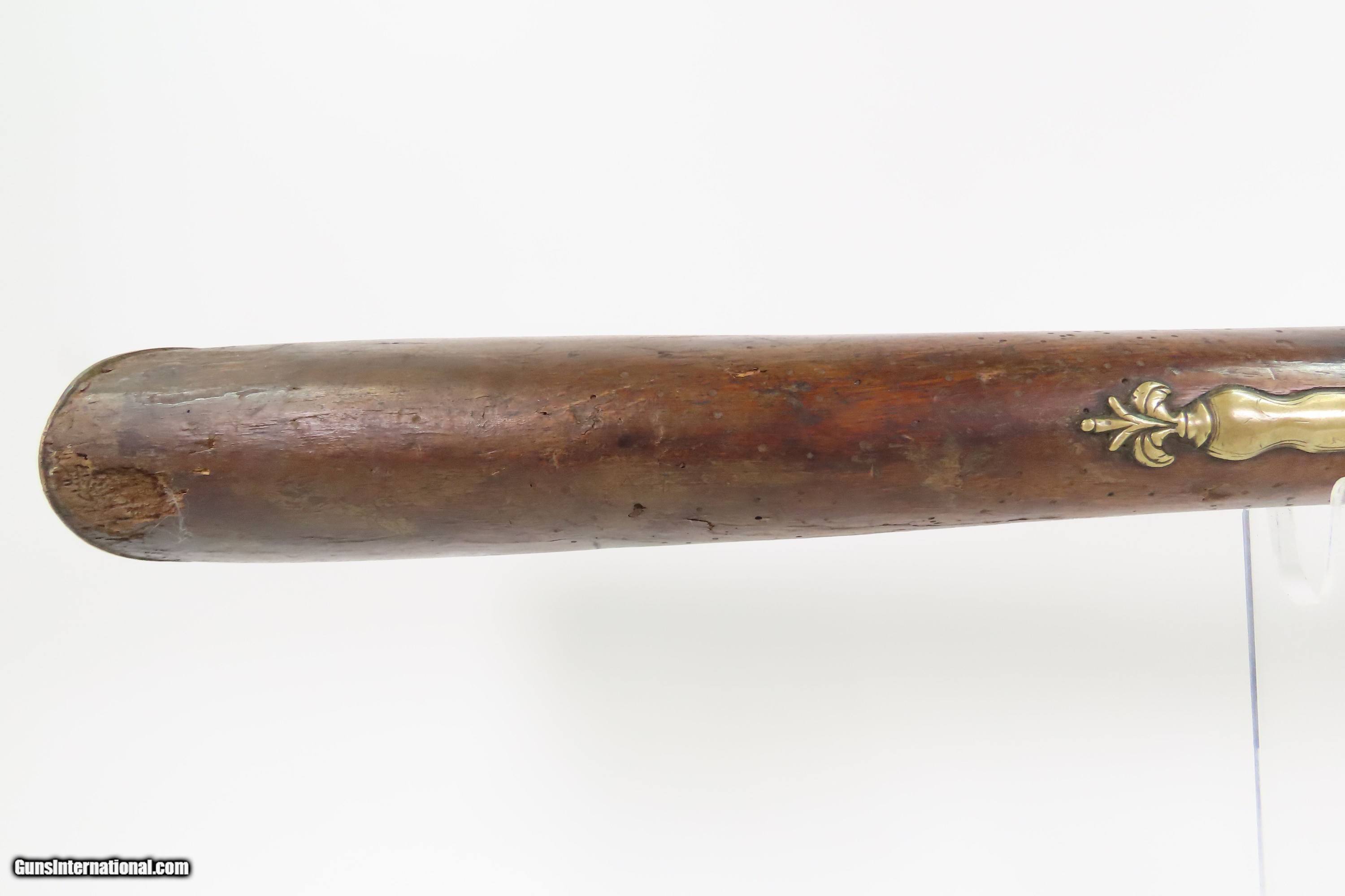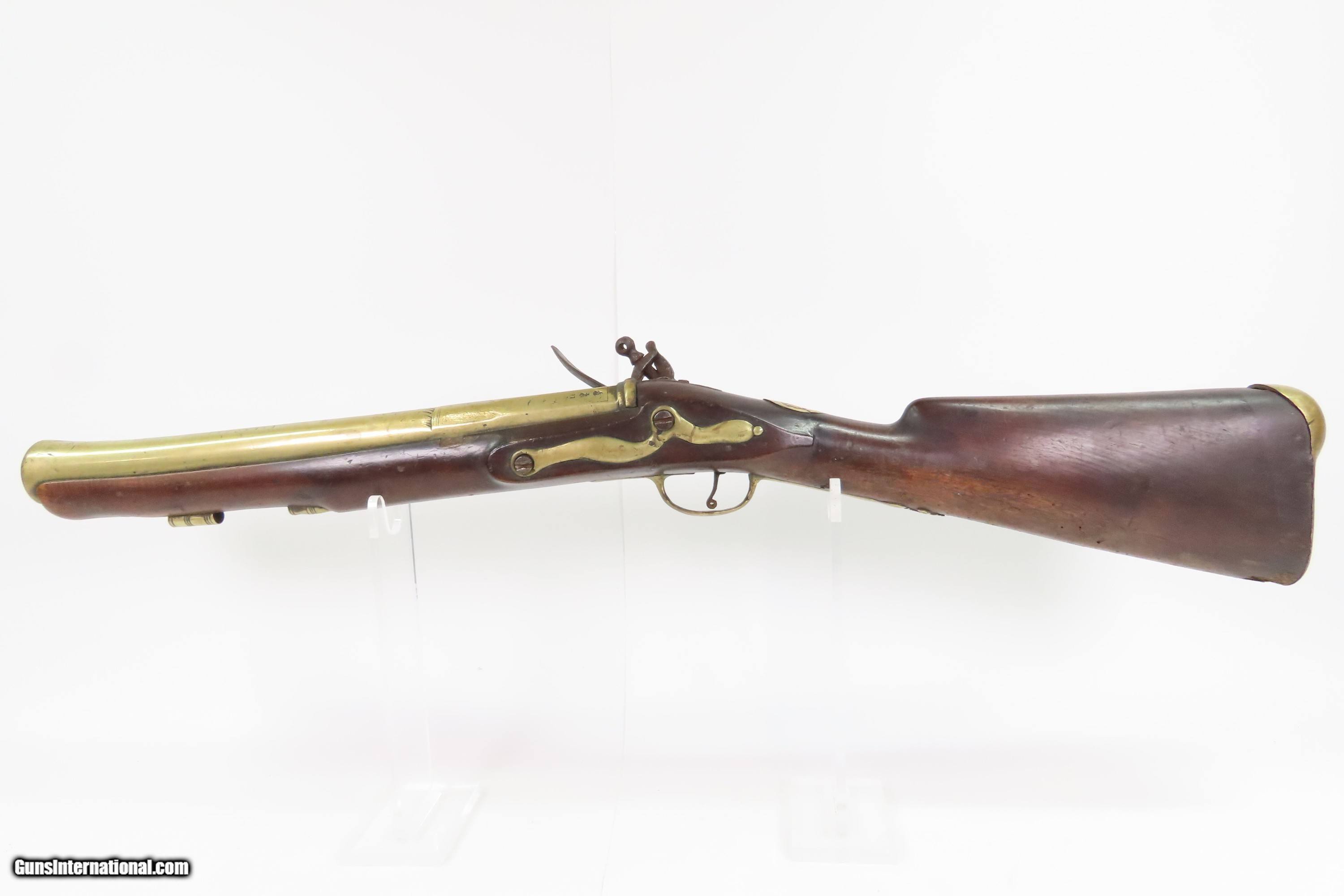 Description: WAR of 1812 Era Antique BRASS BARRELED London Proofed FLINTLOCK BLUNDERBUSS 200+ Year Old WAR of 1812 Close Range Weapon! Here Ancestry Guns presents an antique British Flintlock Blunderbuss, made circa 1790 to 1813 in London, England. The barrel shows London proof marks along with an “IB” maker's mark. The blunderbuss is a firearm with a short, large caliber barrel. They are flared at the muzzle, frequently throughout the entire bore, and used with shot and other projectiles. The blunderbuss is commonly considered to be an early predecessor of the modern day shotgun, with similar military and defensive use. It was effective only at short range, lacking accuracy at long range. A blunderbuss in handgun form was called a Dragon, and it is from this that the term “Dragoon” evolved. The flintlock blunderbuss was the original coach gun, being a short, handy and devastating weapon at close range. It was used in many capacities, not the least of which were for Naval boarding or defending vessels, stagecoach and messenger companies, home defense and more. The flintlock blunderbuss was the original coach gun, being a short, handy and devastating weapon at close range. It was capable of firing up to 20 buckshot in front of 120 grains of black powder, according to Spencer Tucker in “Almanac of American Military History, Volume 1”. This particular example is highly likely to have been used in the War of 1812 on the side that didn’t win! The overall condition is good. The action fully functions. Dark bore, good for its age. A few thin cracks are present on the buttstock around the plate. A sliver is missing from the tip of the right forend and the left side of the buttstock toe. Markings are legible. The ramrod is absent. A blunderbuss such as this is what most people imagine a pirate crew using to commandeer an unsuspecting ship! Own the original! This is a legitimate antique and not a reproduction. Barrel is 15-1/2 inches. Caliber: Bore measures approximately 1” and flares to 1-1/2 inch. Overall condition as seen in photos. Very Fast. Very Safe. FREE SHIPPING WORLDWIDE. Delivered directly to your door by express mail! Guaranteed AUTHENTIC & Includes CERTIFICATE OF AUTHENTICITY. $6000 #259379 Antique: Yes Price: $6,000.00 Buy Now Pay with