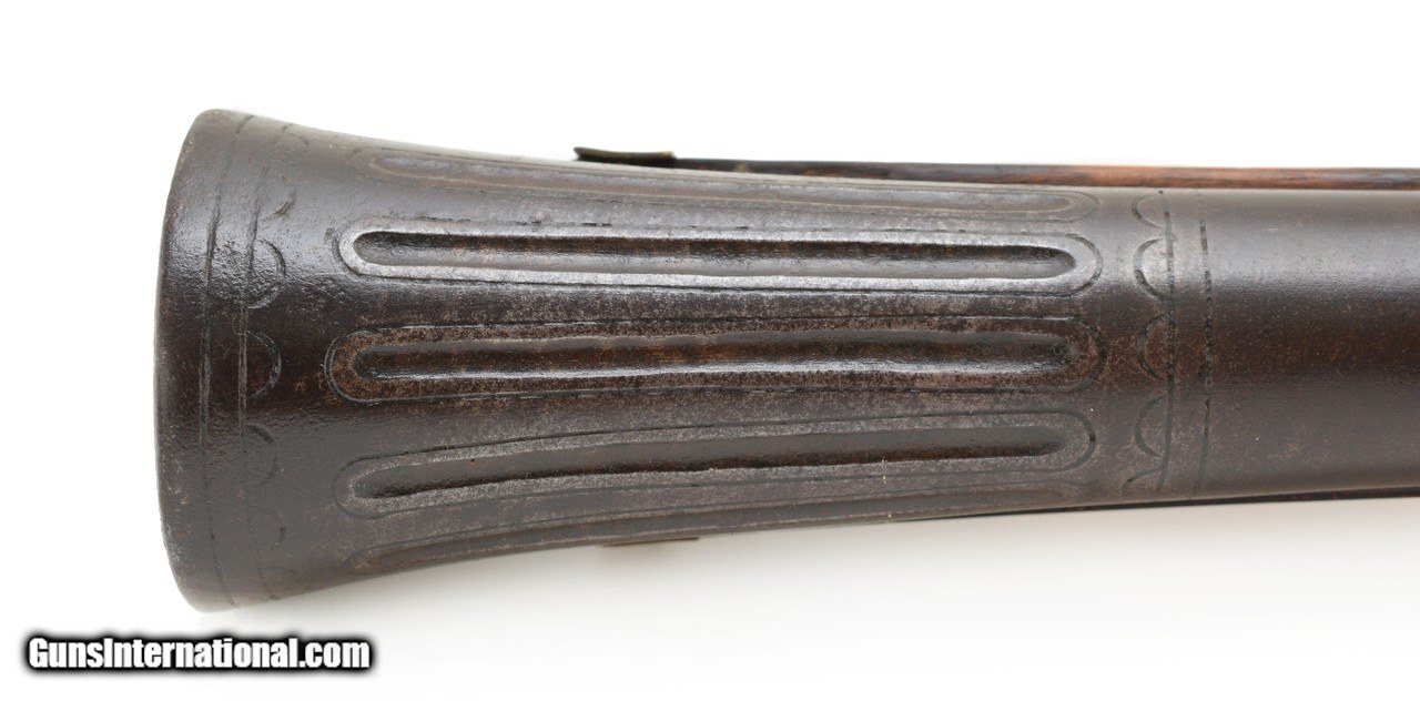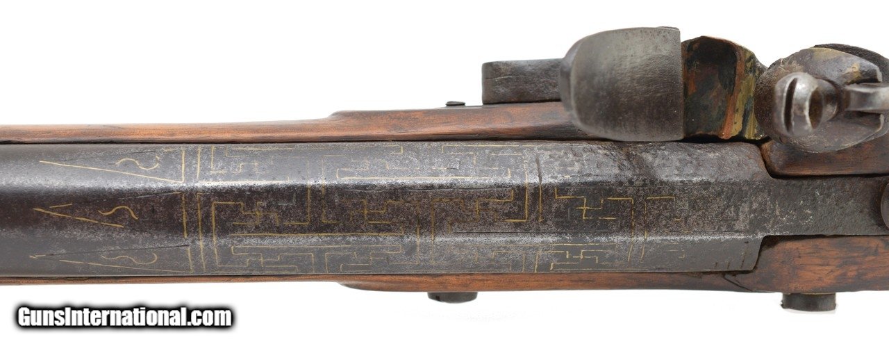 Description: "Chinese Flintlock Blunderbuss. This is a rare example of a Chinese Flintlock. This is a military style flintlock using a British Brown Bess lock with Tower and Crown mark. Barrel has a flared muzzle with exterior flutes on the bell. Breech end shows Chinese fret work design. Barrel length 28½" overall length 43½". Action works perfectly. We had sold several Blunderbuss over the years and the barrels seem to have been “saved" by previous owners remounting them on later stocks using British or European locks. Interestingly, middle eastern barrels were prized by their owner and used on later stocks and locks, as our example here. Antique: Yes Price: $4,500.00 Contact Seller |