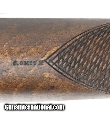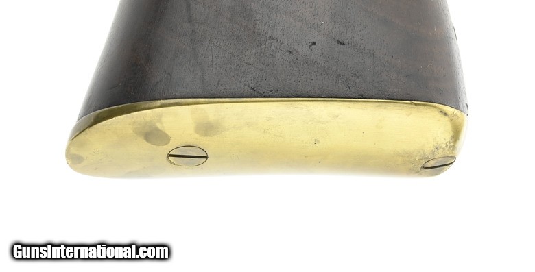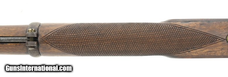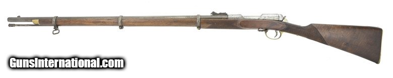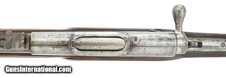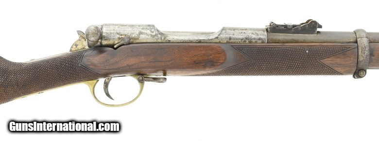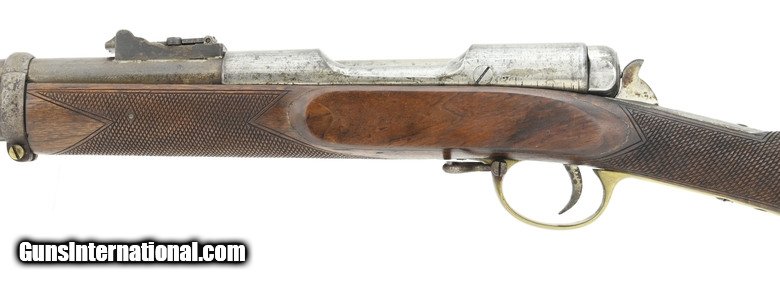 Description: " Scarce Brown bolt action rifle. Made by Brown Manufacturing Company, Newburyport, MA, circa 1869-73. Estimated production is 1,000 to 2,000. While the great majority were 58 caliber rimfire, this Brown rifle is .58 caliber center fire. The overall length is approx. 55”. The bolt handle at the rear of the receiver is rotated up 90 degrees and pulled to the rear to expose the top loading chamber. The bolt also cocks a small hammer that is just to the rear. The 34” barrel has an excellent bore and is fastened by three Enfield style barrel bands. The top of the bolt is marked Brown Mfg. Co. Newburyport, Mass./Patented Oct. 17. 1871. All metal has a smooth gray-brown patina. The brass Enfield style trigger guard and butt plate are fine. The Enfield style stock is very good with nicely added checkering at the wrist and forearm and no chips or cracks. The lock area and left side plate area have been factory-filled with matching walnut wood. The ramrod and sling swivels are present. The action functions correctly. There is evidence that these rifles, especially in .58 centerfire, may have been used in the 1870 Fenian invasion of Canada. Here’s your chance to own a scarce early bolt action rifle in an uncommon caliber. SOLD Antique: Yes |