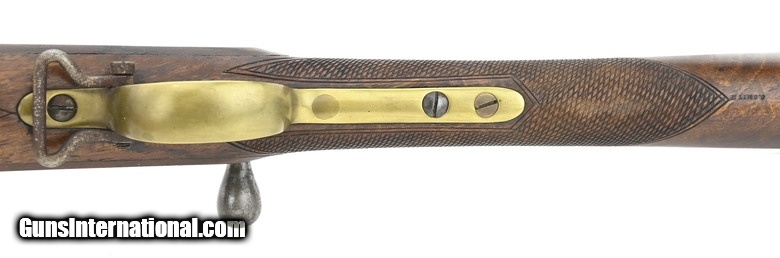 Scarce Brown bolt action rifle. Made by Brown Manufacturing Company, Newburyport, MA, circa 1869-73. Estimated production is 1,000 to 2,000. While the great majority were 58 caliber rimfire, this Brown rifle is .58 caliber center fire. The overall length is approx. 55”. The bolt handle at the rear of the receiver is rotated up 90 degrees and pulled to the rear to expose the top loading chamber. The bolt also cocks a small hammer that is just to the rear. The 34” barrel has an excellent bore and is fastened by three Enfield style barrel bands. The top of the bolt is marked Brown Mfg. Co. Newburyport, Mass./Patented Oct. 17. 1871. All metal has a smooth gray-brown patina. The brass Enfield style trigger guard and butt plate are fine. The Enfield style stock is very good with nicely added checkering at the wrist and forearm and no chips or cracks. The lock area and left side plate area have been factory-filled with matching walnut wood. The ramrod and sling swivels are present. The action functions correctly. There is evidence that these rifles, especially in .58 centerfire, may have been used in the 1870 Fenian invasion of Canada. Here’s your chance to own a scarce early bolt action rifle in an uncommon caliber.