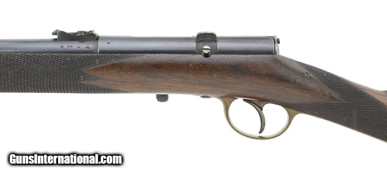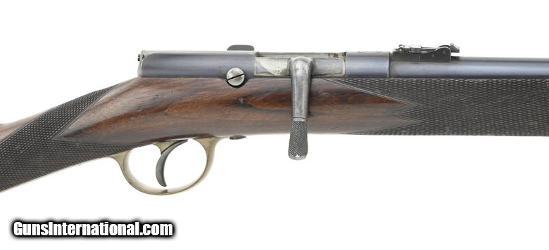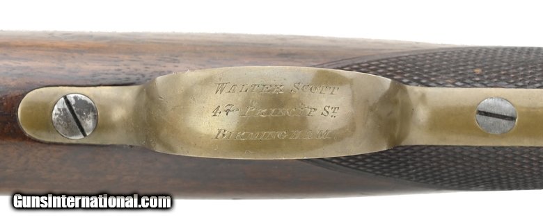 Description: " Unusual early .577 caliber centerfire bolt action rifle. This rifle is based on Carter and Edwards patent WS 507. The overall length is approximately 42.5". The 23" round barrel has an excellent bore with strong rifling. The barrel and action retain approximately 98% blue. The Enfield style bands have approx. 60% blue. The brass trigger guard, butt plate, and nose cap have a smooth even aged patina. The bolt has visible case colors. The stock is fine with checkering at the wrist and forend, a few storage dents, and no cracks or chips. The top of the breech is marked in an oval Carter & Edwards Patent with WS 507 inside the oval. This is repeated on the top rear of the bolt. The bottom of the trigger guard is engraved Walter Scott/47 Princip St/Birmingham. The cleaning rod and two sling swivels are present. The action functions correctly including an unusual sliding safety that blocks the firing pin. Walter Scott, the most likely manufacturer of this fine rifle, operated at 47a Princip St, Birmingham, in 1872 and 1873. This is a great example of an early high-quality breech-loading centerfire cartridge rifle. It may well be unique. SOLD Antique: Yes |
