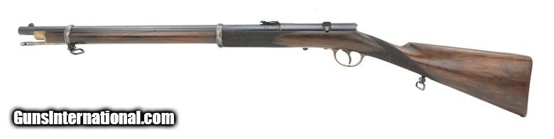 Unusual early .577 caliber centerfire bolt action rifle. This rifle is based on Carter and Edwards patent WS 507. The overall length is approximately 42.5". The 23" round barrel has an excellent bore with strong rifling. The barrel and action retain approximately 98% blue. The Enfield style bands have approx. 60% blue. The brass trigger guard, butt plate, and nose cap have a smooth even aged patina. The bolt has visible case colors. The stock is fine with checkering at the wrist and forend, a few storage dents, and no cracks or chips. The top of the breech is marked in an oval Carter & Edwards Patent with WS 507 inside the oval. This is repeated on the top rear of the bolt. The bottom of the trigger guard is engraved Walter Scott/47 Princip St/Birmingham. The cleaning rod and two sling swivels are present. The action functions correctly including an unusual sliding safety that blocks the firing pin. Walter Scott, the most likely manufacturer of this fine rifle, operated at 47a Princip St, Birmingham, in 1872 and 1873. This is a great example of an early high-quality breech-loading centerfire cartridge rifle. It may well be unique.