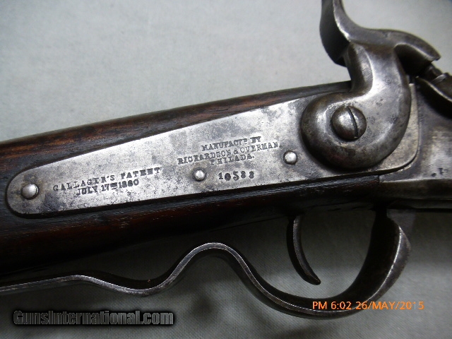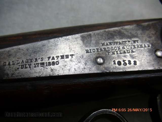 Description: 15-69 GALLAGER’S Condition: Overall very good condition, brown gun with virtually no corrosion on BBL and frame, has not been cleaned or buffed, lock is clean, and bore is shiny with most of rifling and some corrosion, works fine, nice for collector/shooter. Stock has usual dents, dings, scratches. Have you gunsmith check it out. (15-69) Sights, breech details, etc. Basic variants are: Early production Carbine: the lock plate marked: GALLAGER/PATENTED JULY 17th 1860 (serial number -7017) Standard Model: the lockplate marked: Manufact by Richardson Overman/Philadelphia/serial number, and Gallager’s Patent July 17th 1860. I take Visa/MasterCard, add 3%. Allow two weeks for all checks, whether bank, personal or certified to clear. It is also possible to wire funds to my account for instant credit for a $20.00 wire charge. 3 day- no questions asked return period for refund of price paid for gun. (Not including shipping or credit card charges.)Call or email with any questions or for more pictures. Guns are antique and should not be fired without examination by gunsmith. $50 shipping for long guns, $30 for hand guns to lower 48 states, about $50-$75 to most European countries and $70-$80 to Australia for antique handguns, carbines $75-$125. We can generally get insurance if you want through shipper but coverage is limited. Notify me if you want it. You can send 20% down- balance in 90 days for installment payment plan. No refunds on installment plans. I have shipped to Norway (long gun w/fragile stock) see feedback, England (Winchester1876, Rem. Dbl. Derr.), Northern Ireland, France, Australia and Sweden. Email if you are not U.S. for estimated shipping costs, payment methods, etc. I am always buying and trading for antique and collectible guns, Indian items, rare ammo, etc. Email what you have got for sale or trade. SOLD Antique: Yes |