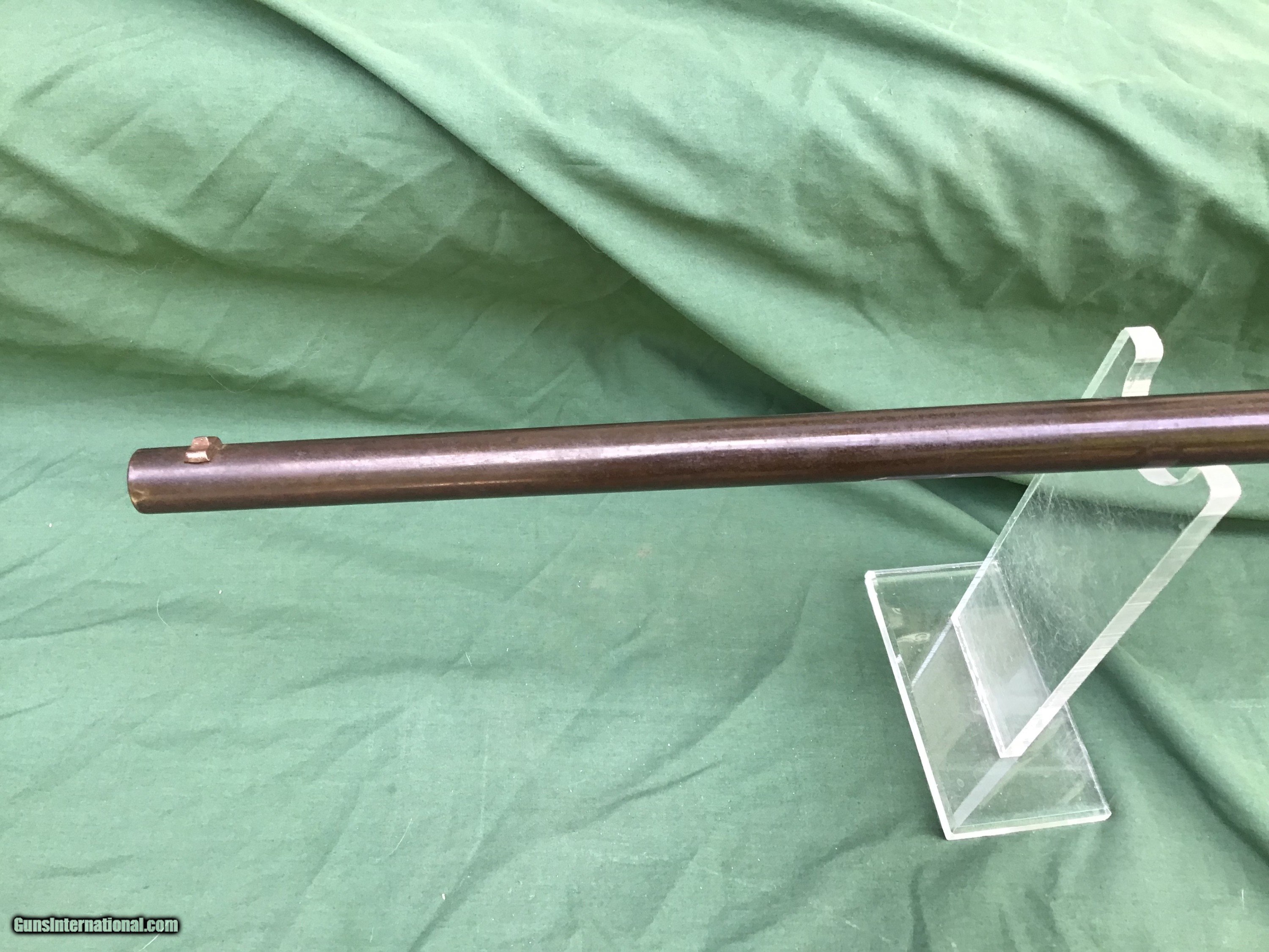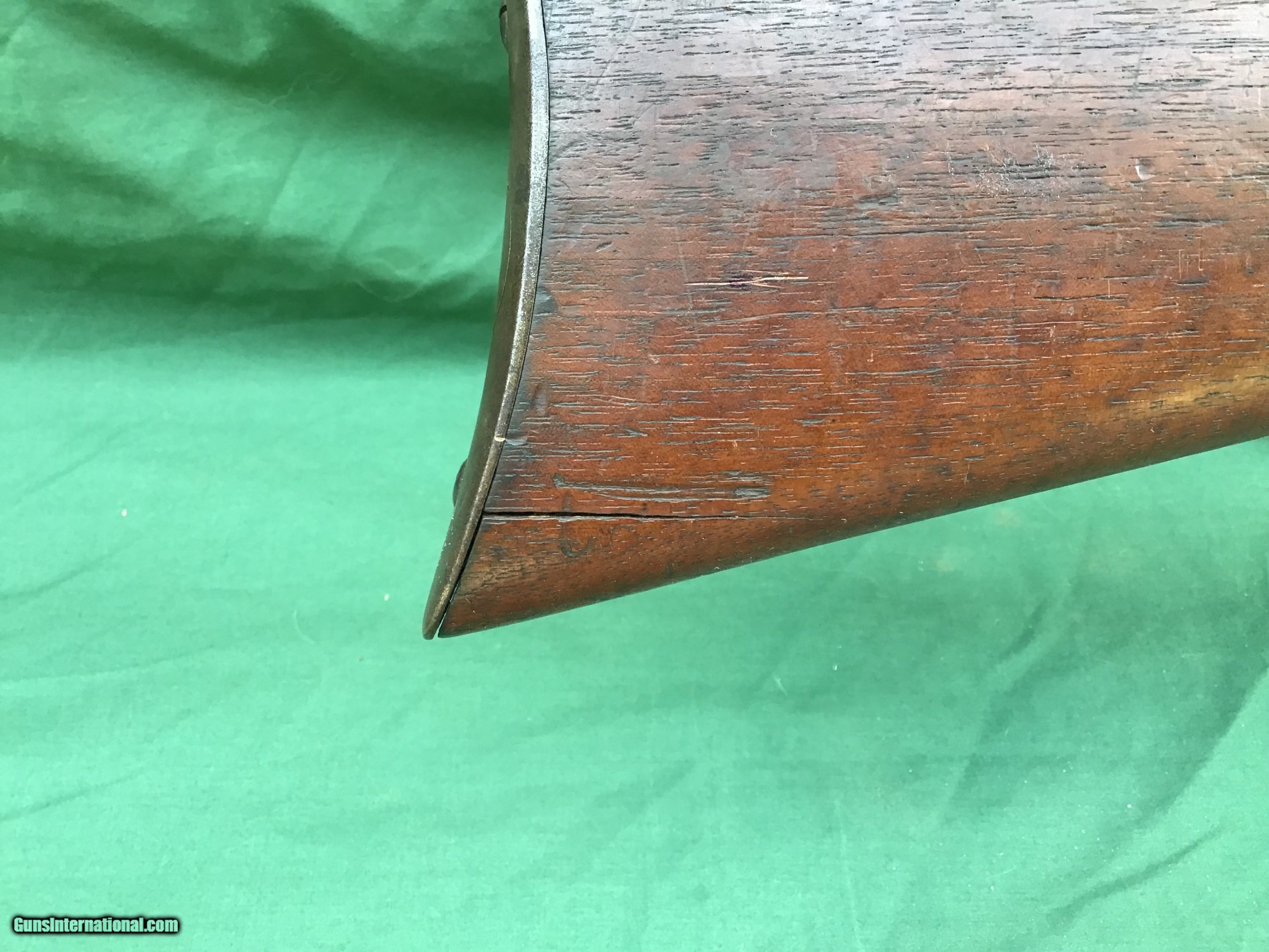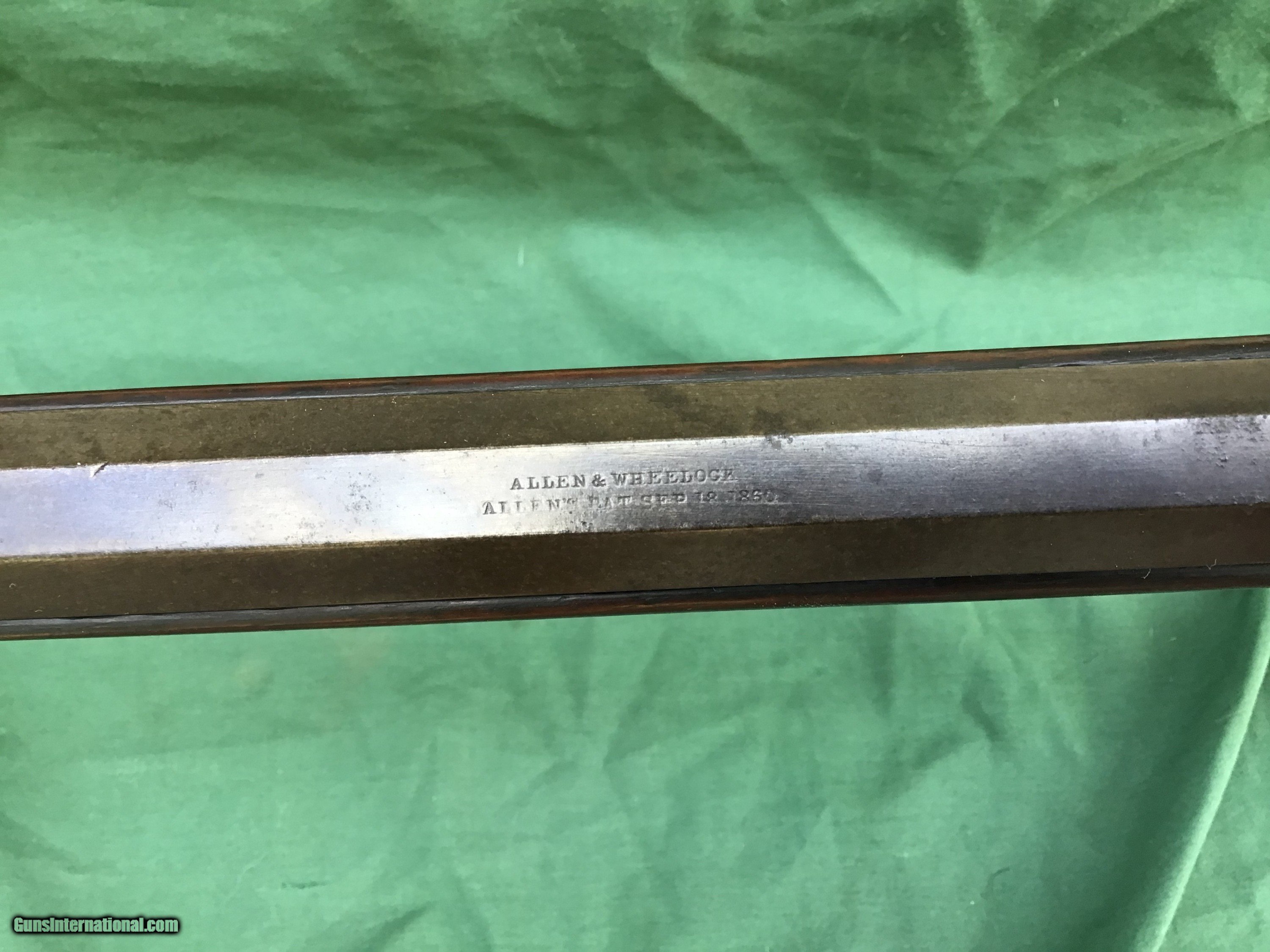 Description: This .41 caliber, drop breech, cartridge, single shot rifle has a part octagonal and part round 26" rifled barrel, marked on the top flat with “Allen & Wheelock, Allen’s Pat Sept 1860” The breech is opened by releasing a spring catch and lowering the trigger guard. The angled hammer head falls on the long firing pin which goes through the dropping breech block. This is the more desirable takedown version mark with the rare 1860 patent date. Very nice bore that I will rate a 7.5 on a scale from 1 to 10. This rifle has the low serial number 57 which is marked on lower tang and behind the sight. Action functions nicely. Rifle retains a smooth gray / brown patina. Both forend and buttstock are in good condition. Buttstock has small crack near the toe of buttplate (see pic). Buttplate has the trapdoor. This is a rarely seen rifle for sale and with the rare patent date, takedown feature, and low serial, this is a must have for the antique rifle collector. Antique and can be shipped directly to your doorsteps. Please feel free to ask questions. SOLD Antique: Yes |